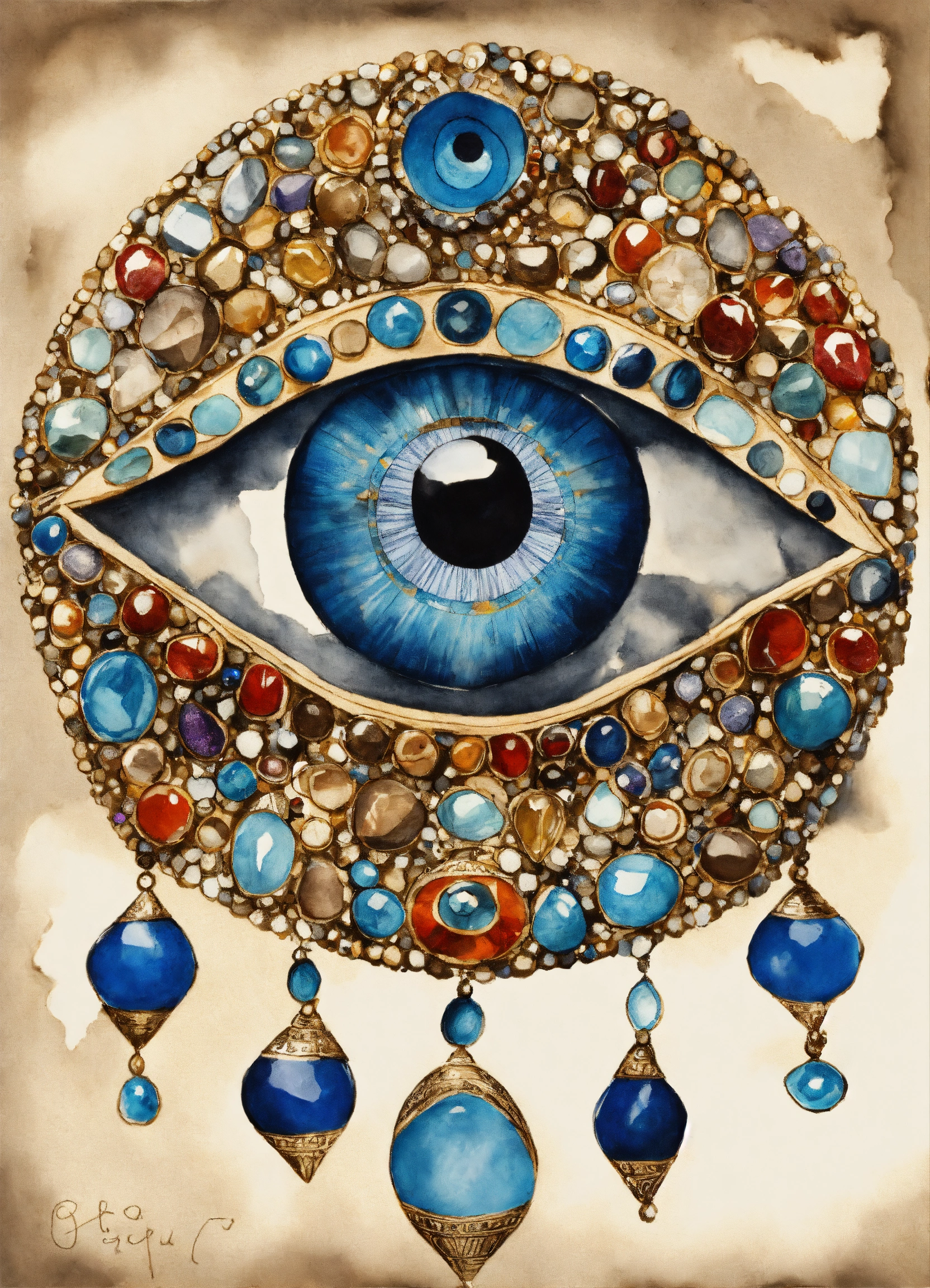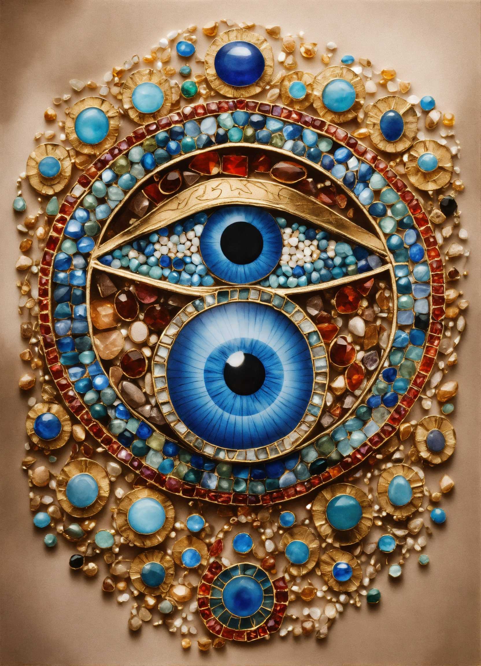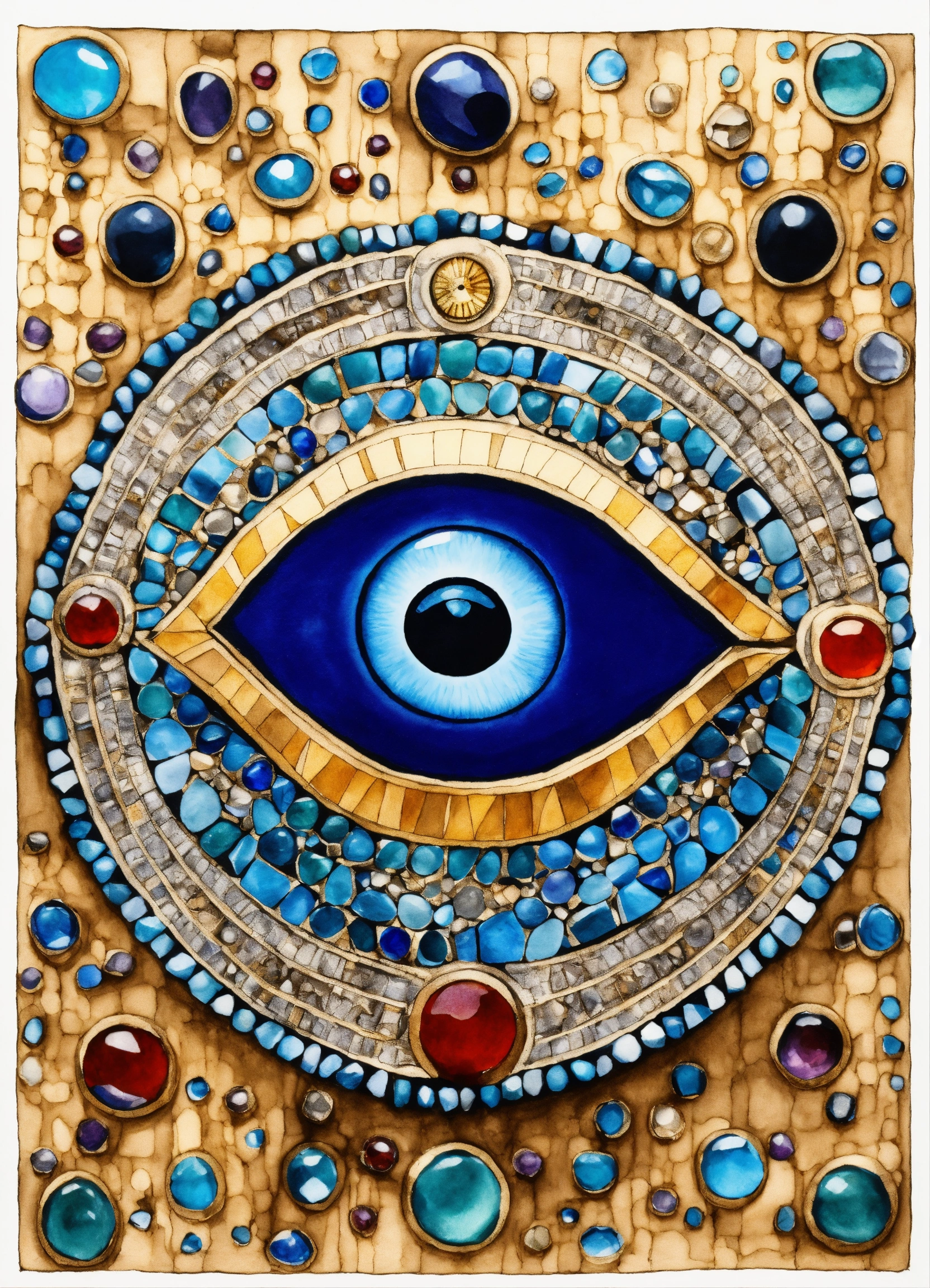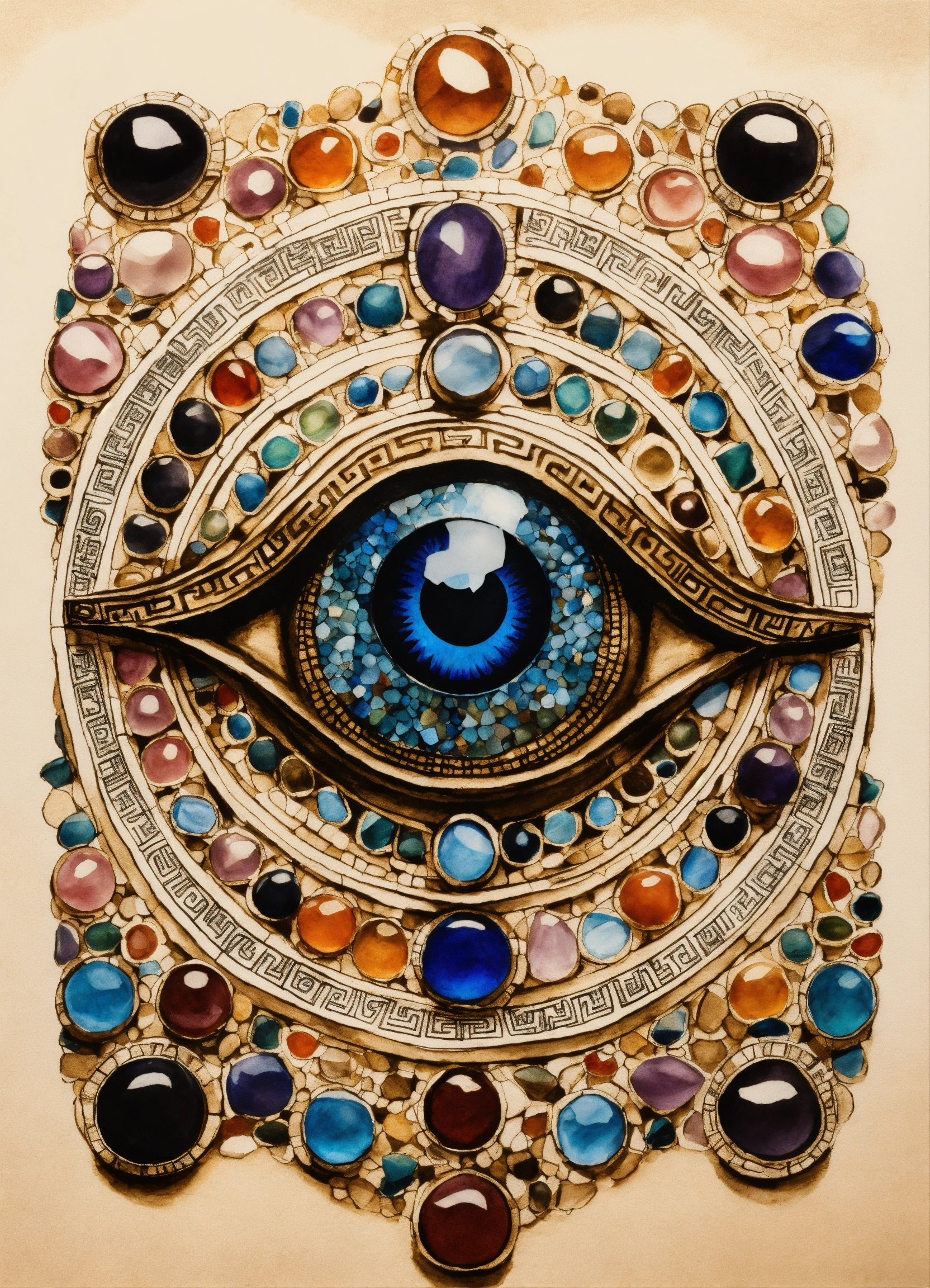Ink drawing illustrative image of an ancient greek protective evil eye image made up of precious stones with white background
