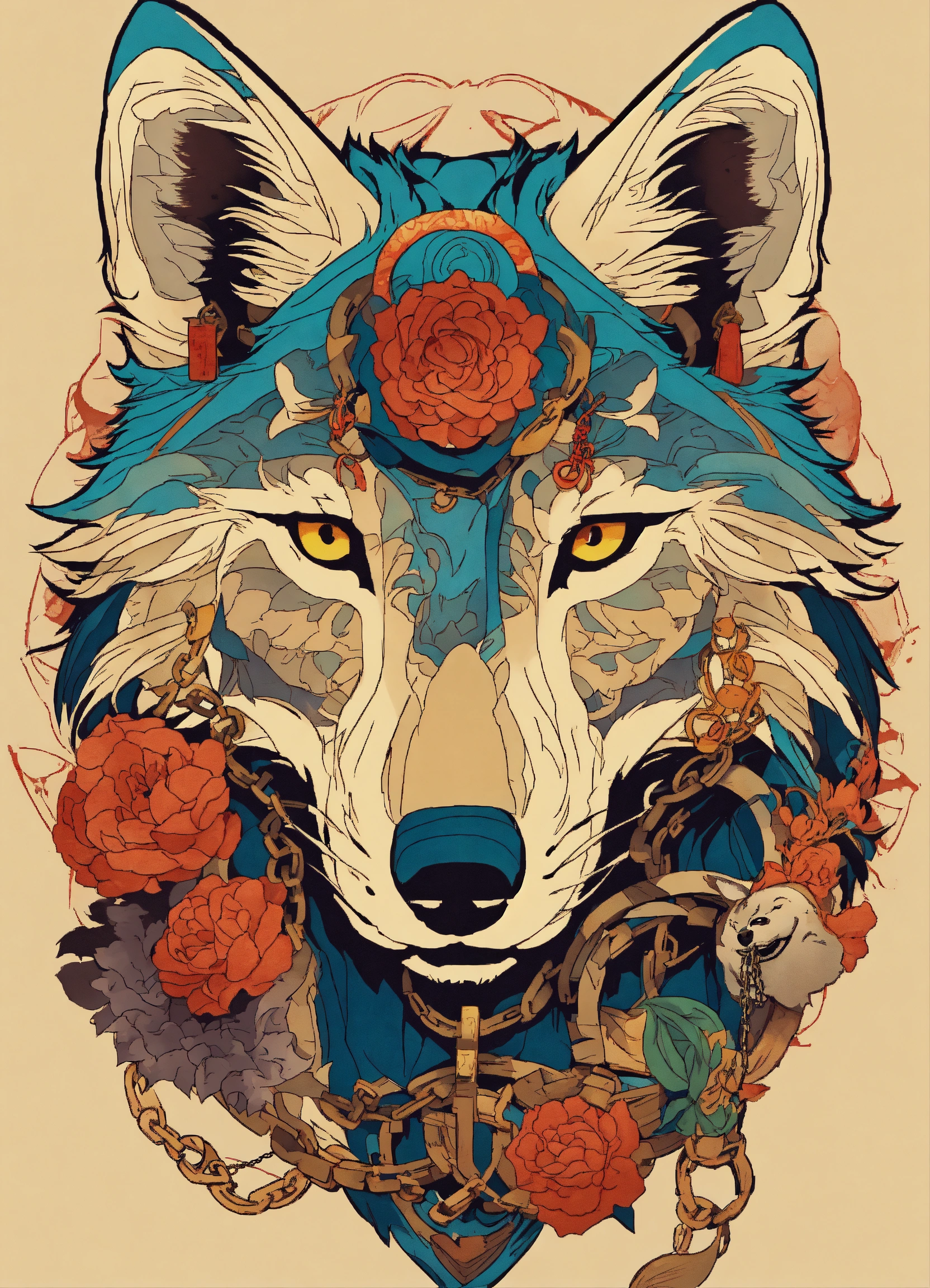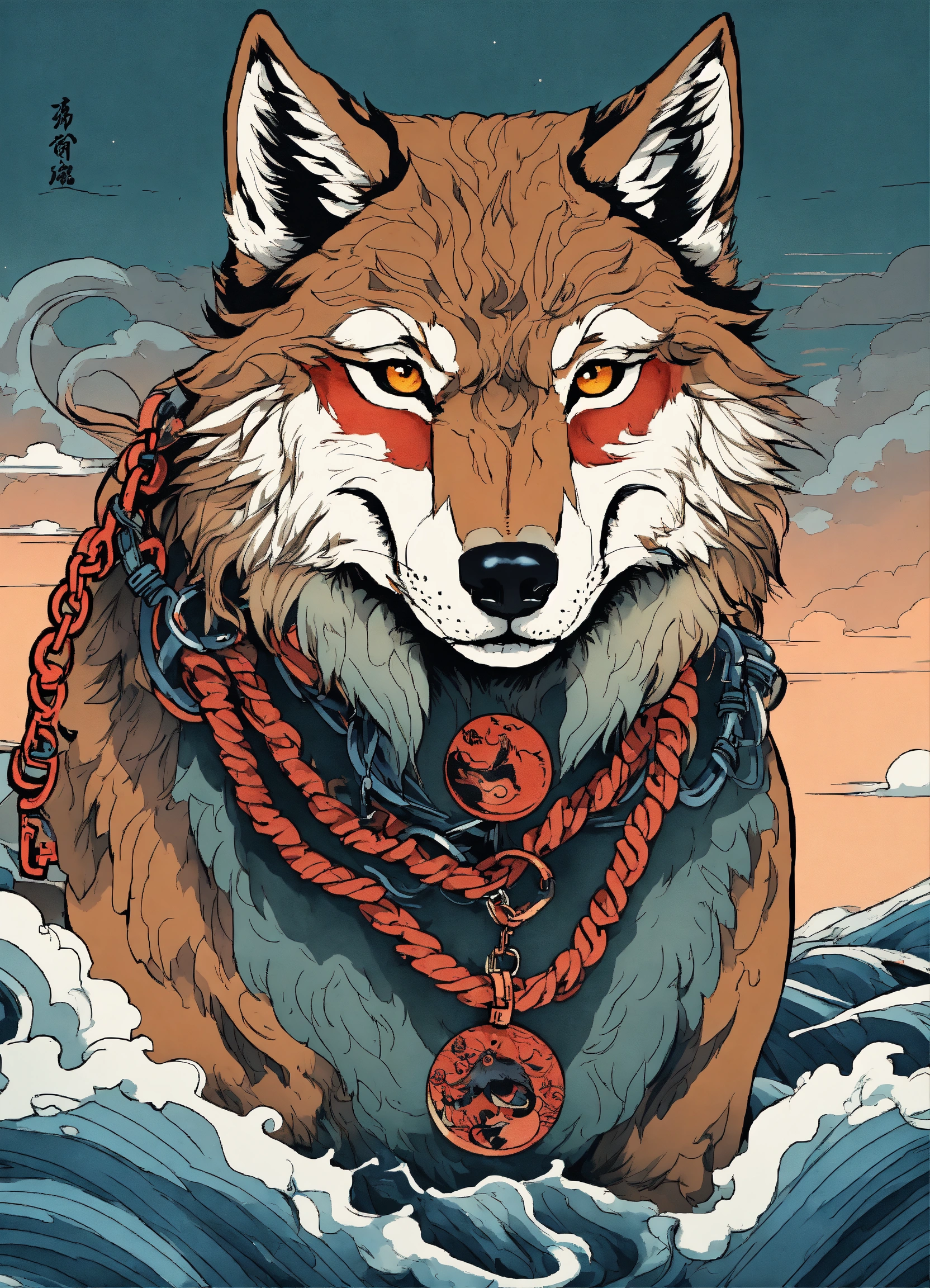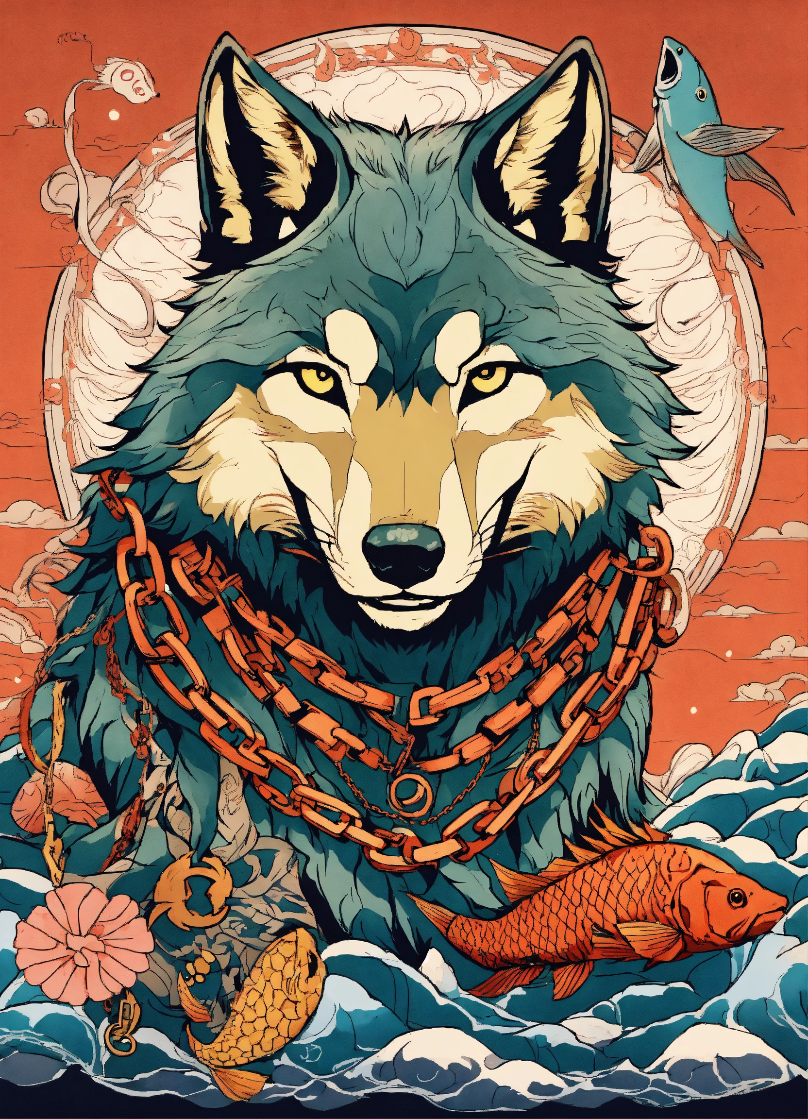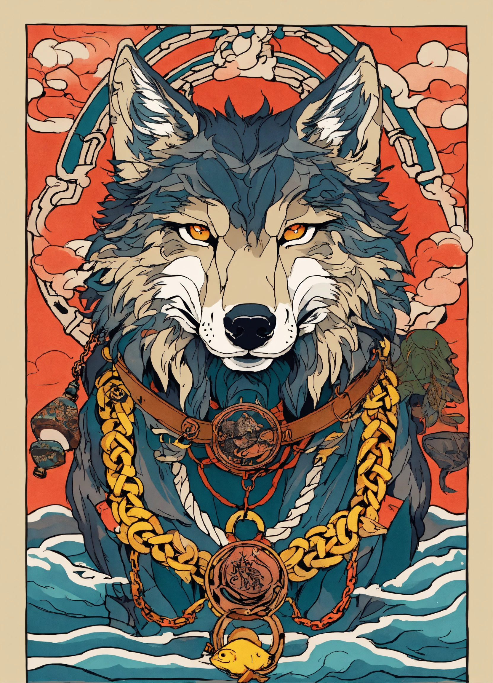 There is a wolf with a chain around its neck and a fish tattoo on it, wolf design, wolf detailed, anime manga robot!! wolf tattoo, japanese art style, colored illustration for tattoo, by kanō tan'yū, ukiyoe style, japanese illustration, by shiba kōkan, line art illustration