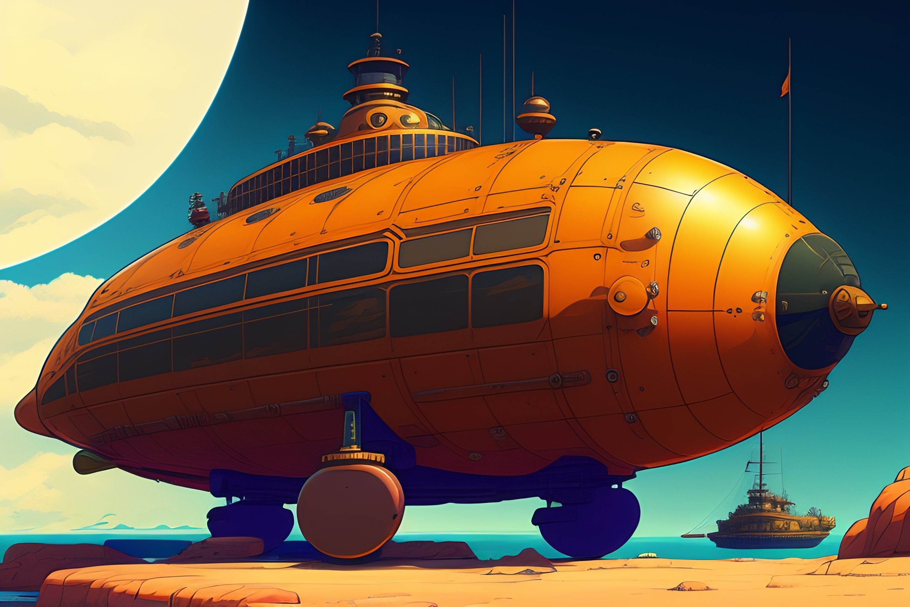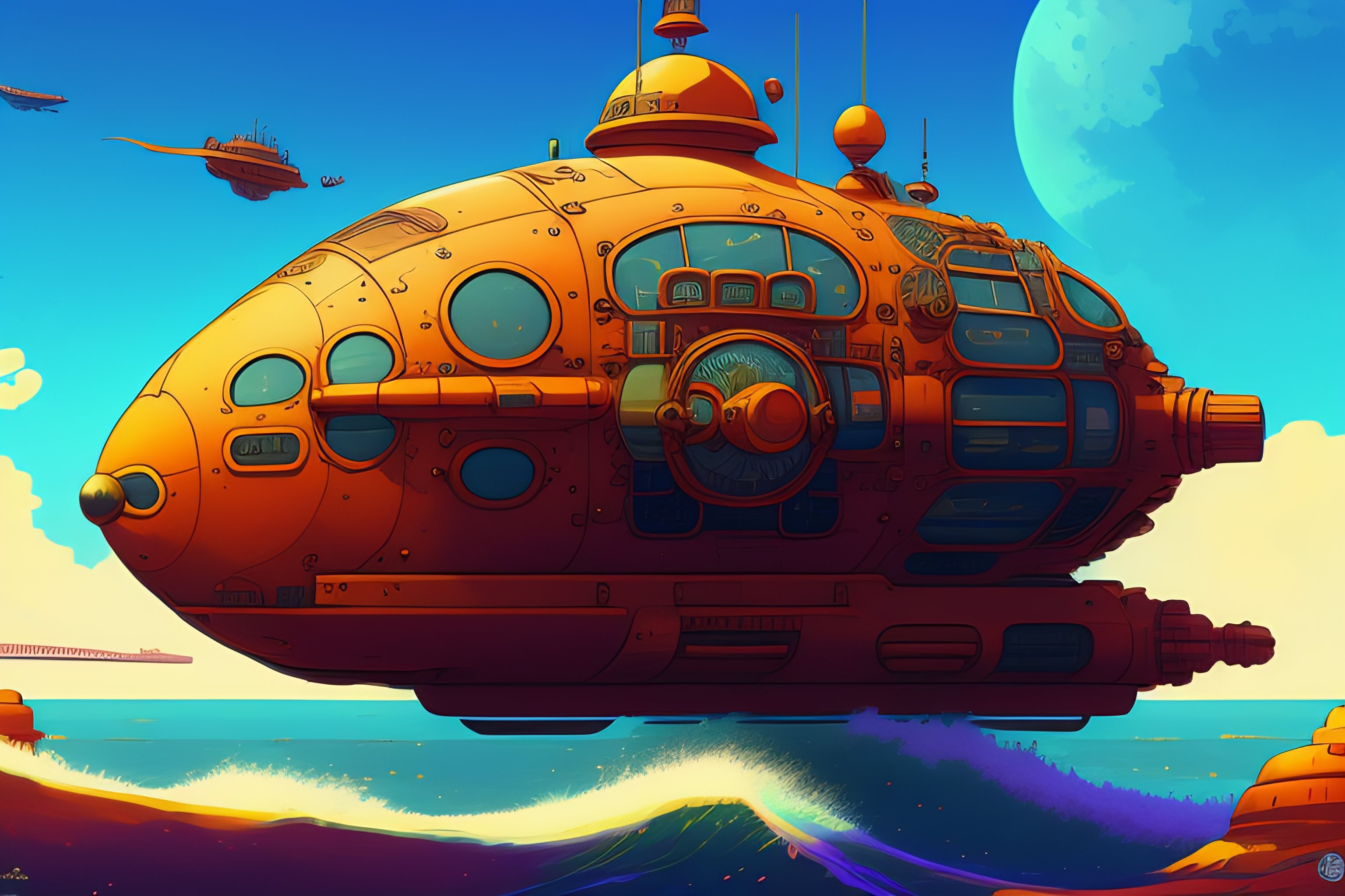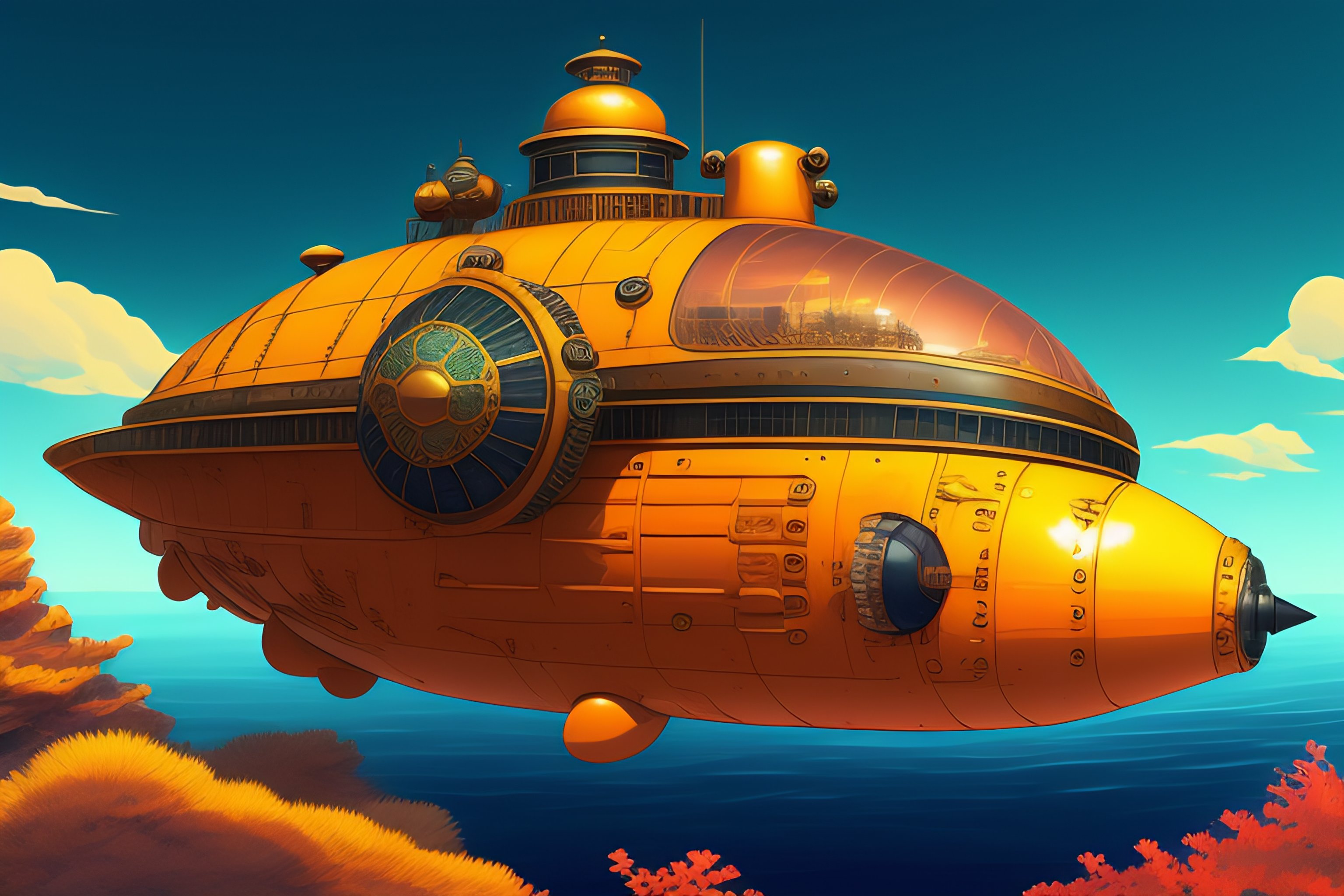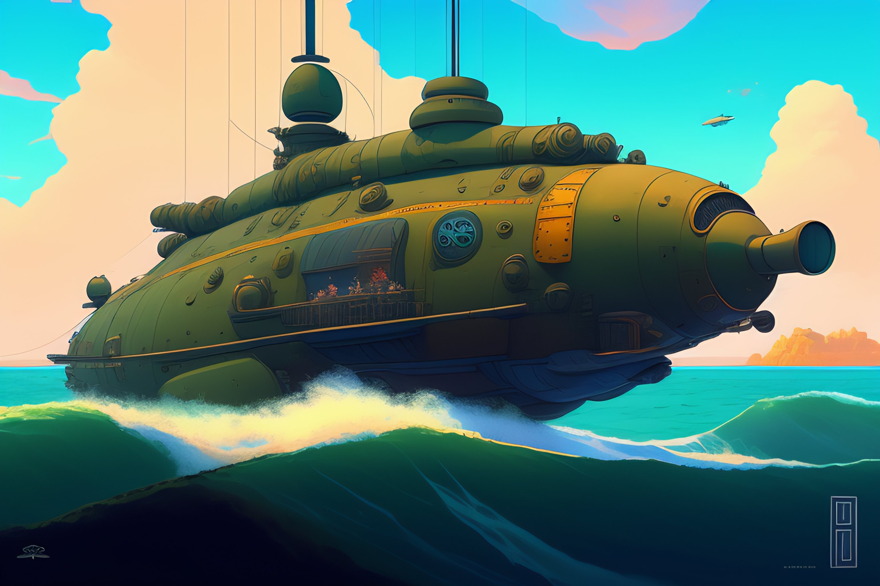 A steampunk submarine in the shape of a sea turtle, style of laurie greasley, studio ghibli, akira toriyama, james gilleard, genshin impact, trending pixiv fanbox, acrylic palette knife, 4k, vibrant colors, devinart, trending on artstation, low details