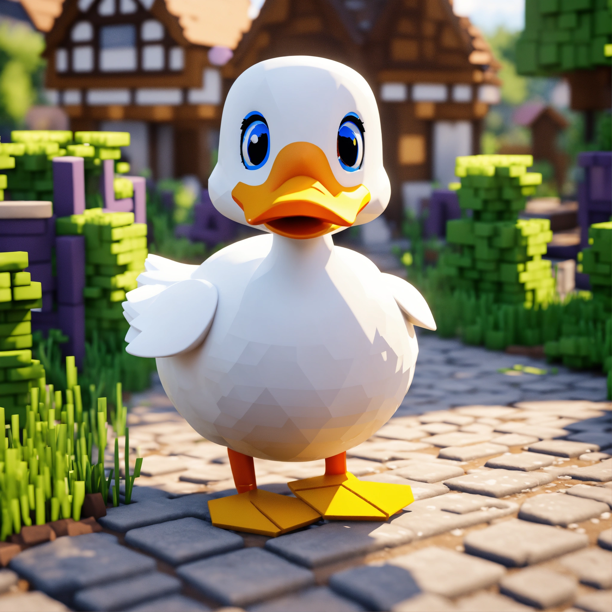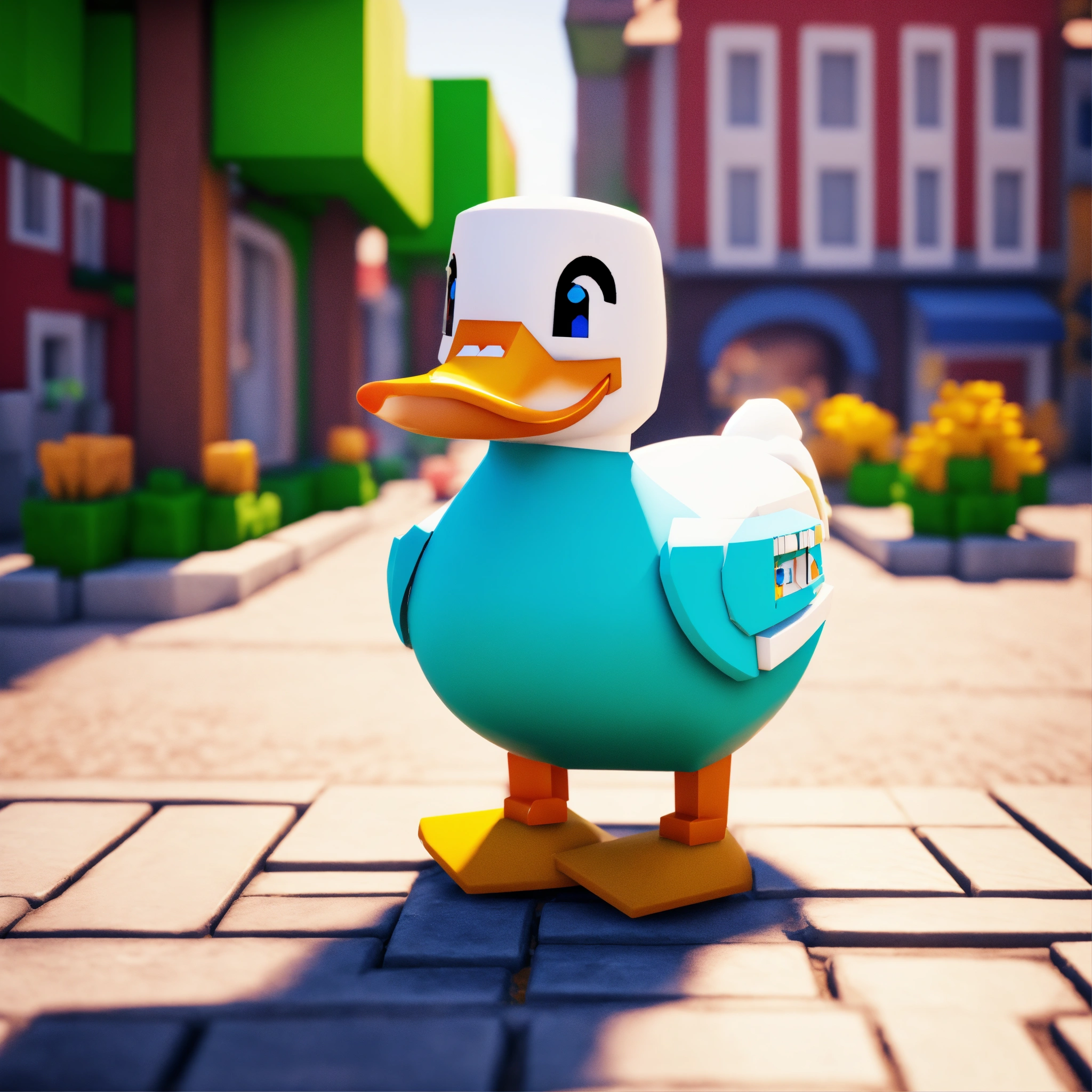 A cute mincraft duck in a town with only 90 degree shapes