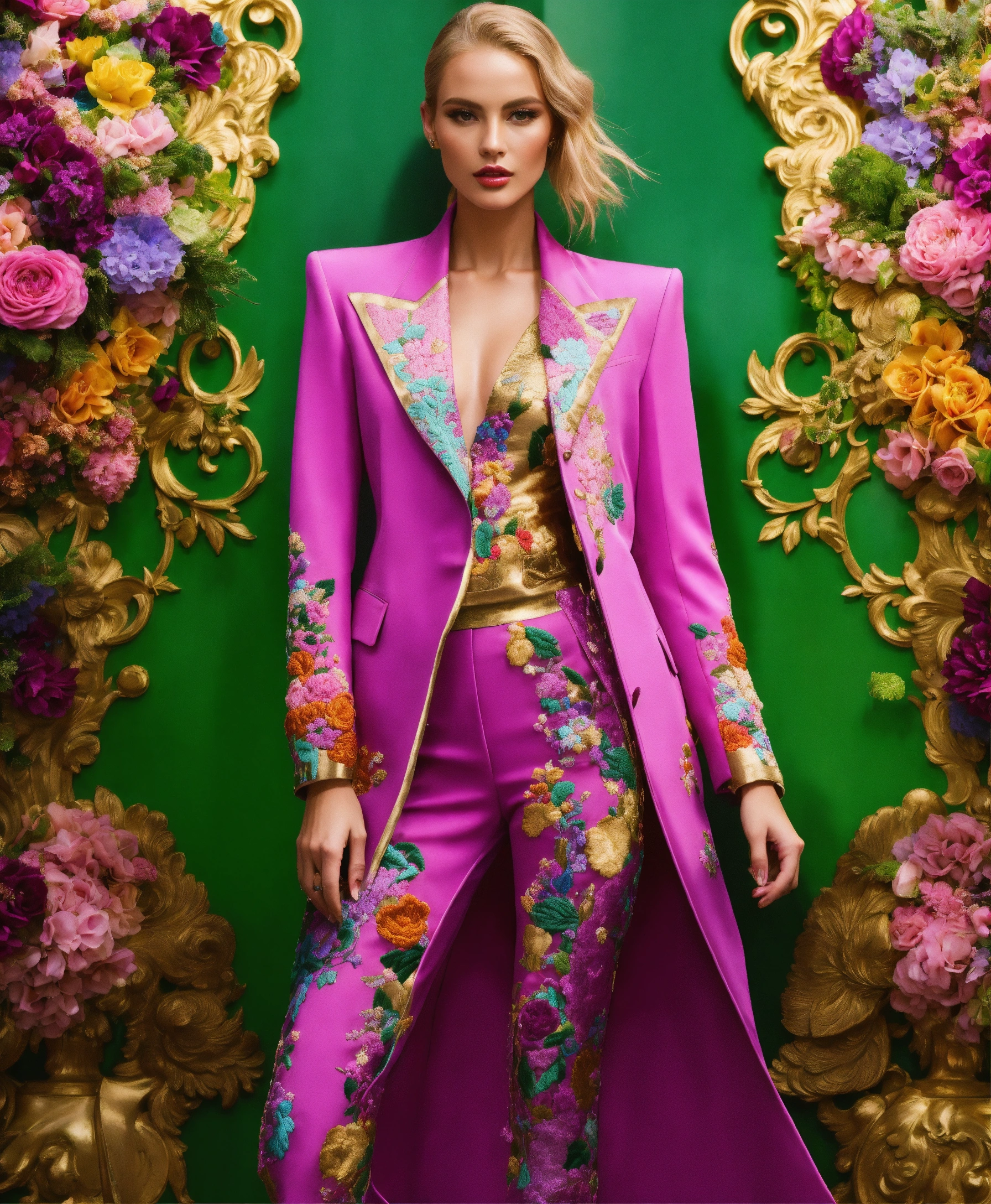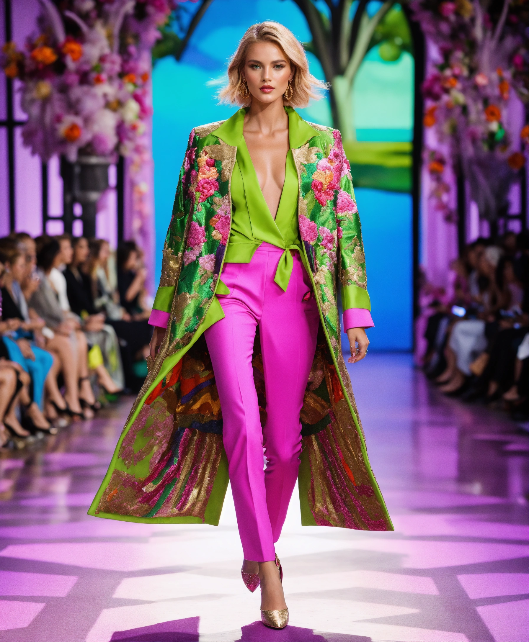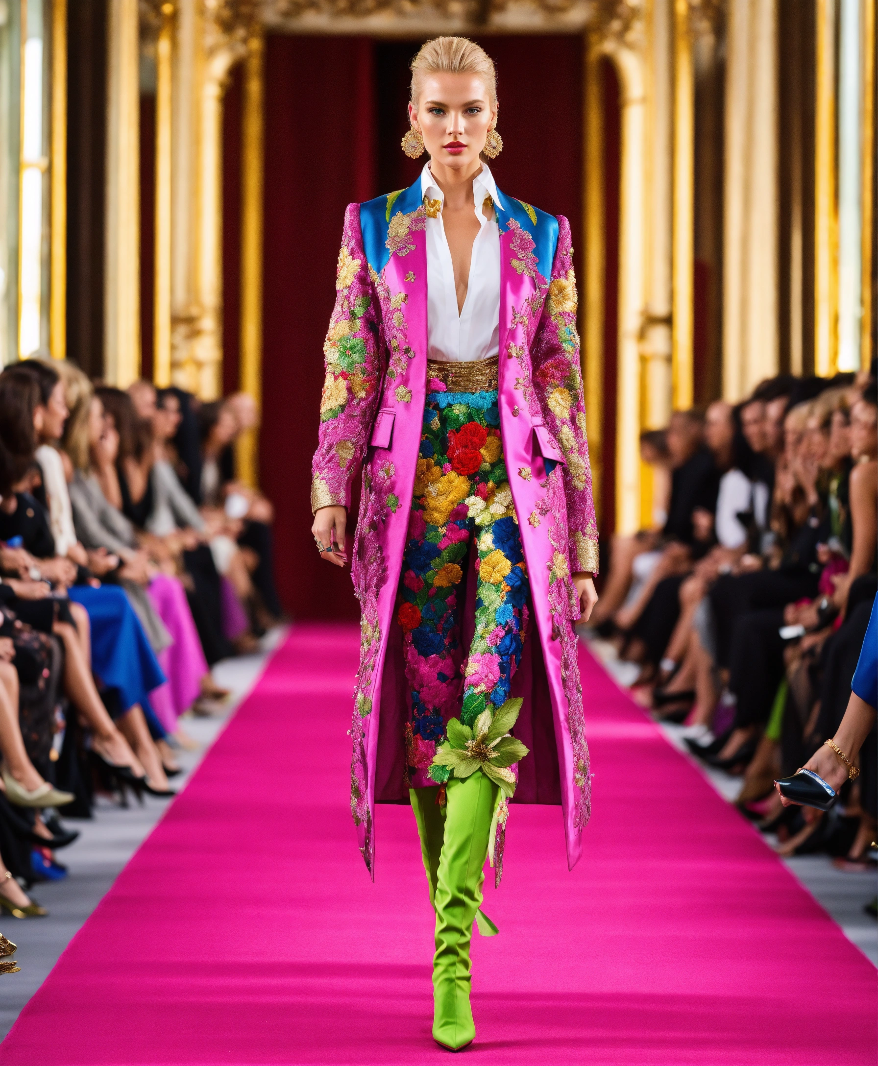 Ultra realistic full body photo of a stylish beautiful german blonde model walking the runway modeling summer cruise designer wear brave, paris versailles details cutouts and gold geometric pattern floral structured tailored jacket pink gold green lilac peridot silver magenta lime fuchsia yellow blue black gray copper mauve bronze haute couture embroidered contrasting colors vivid intricate bold vibrant glamorous ultimate elegance beautiful luxurious awesome wealthy opulent exquisite resplendent magnificent sublime 12k