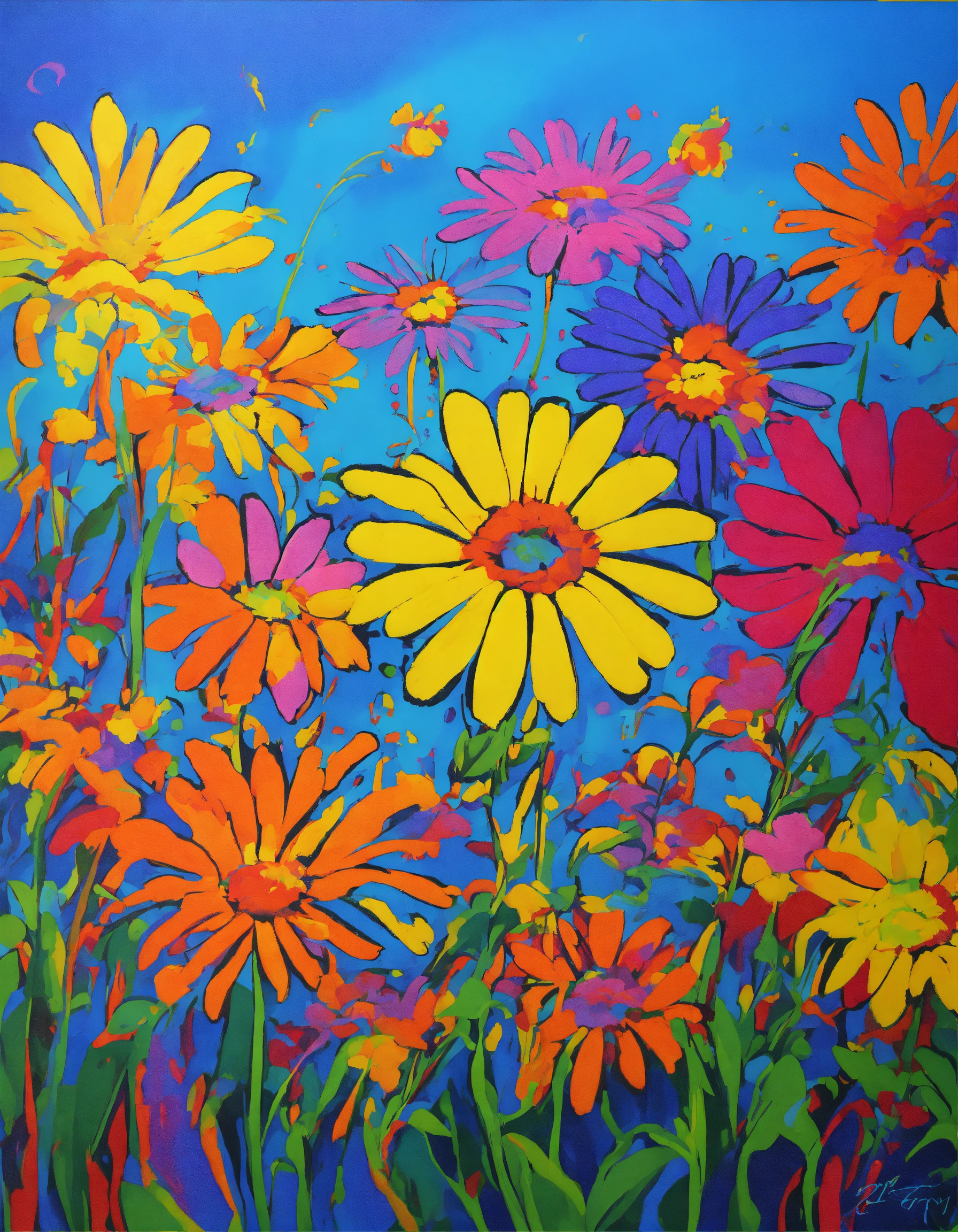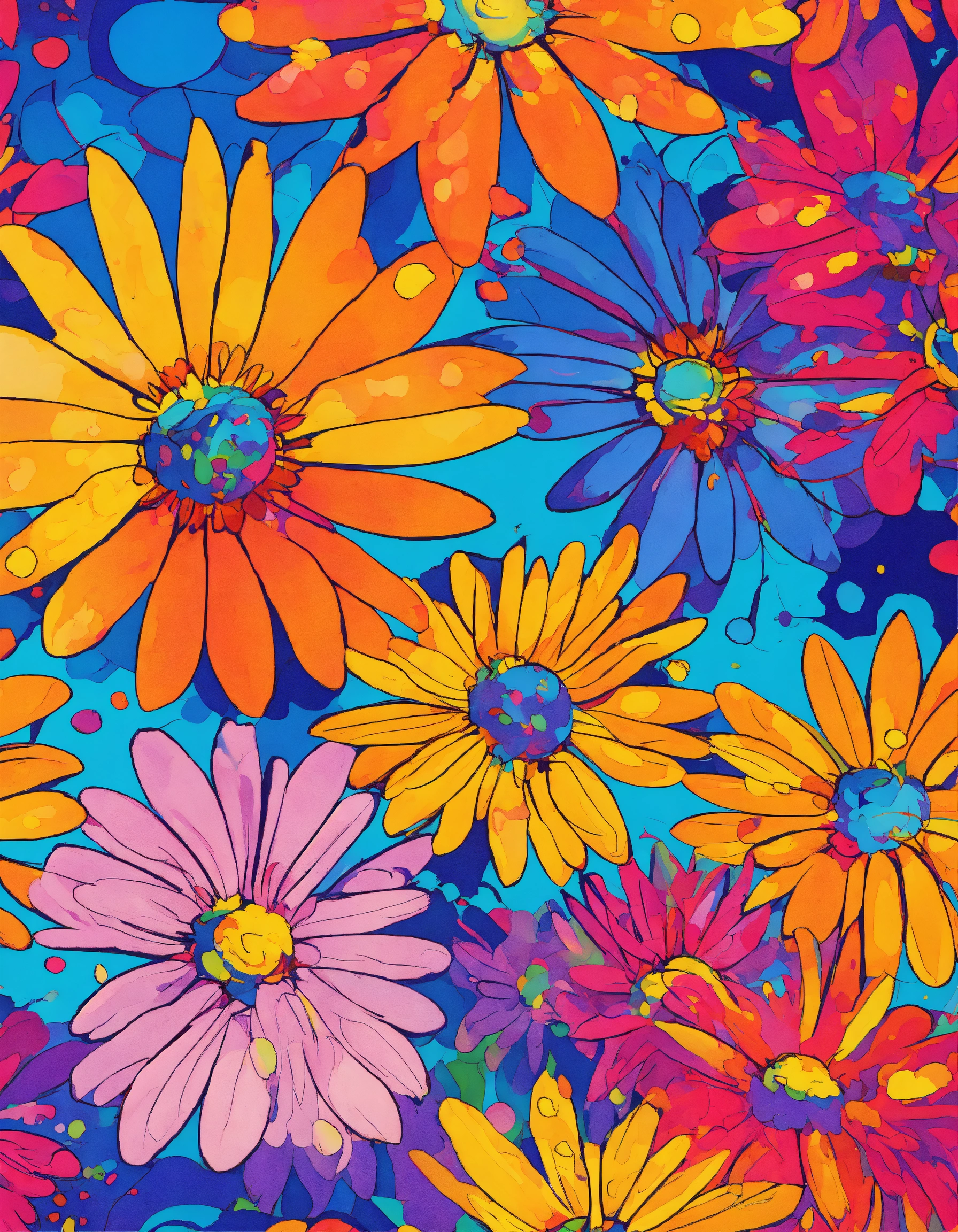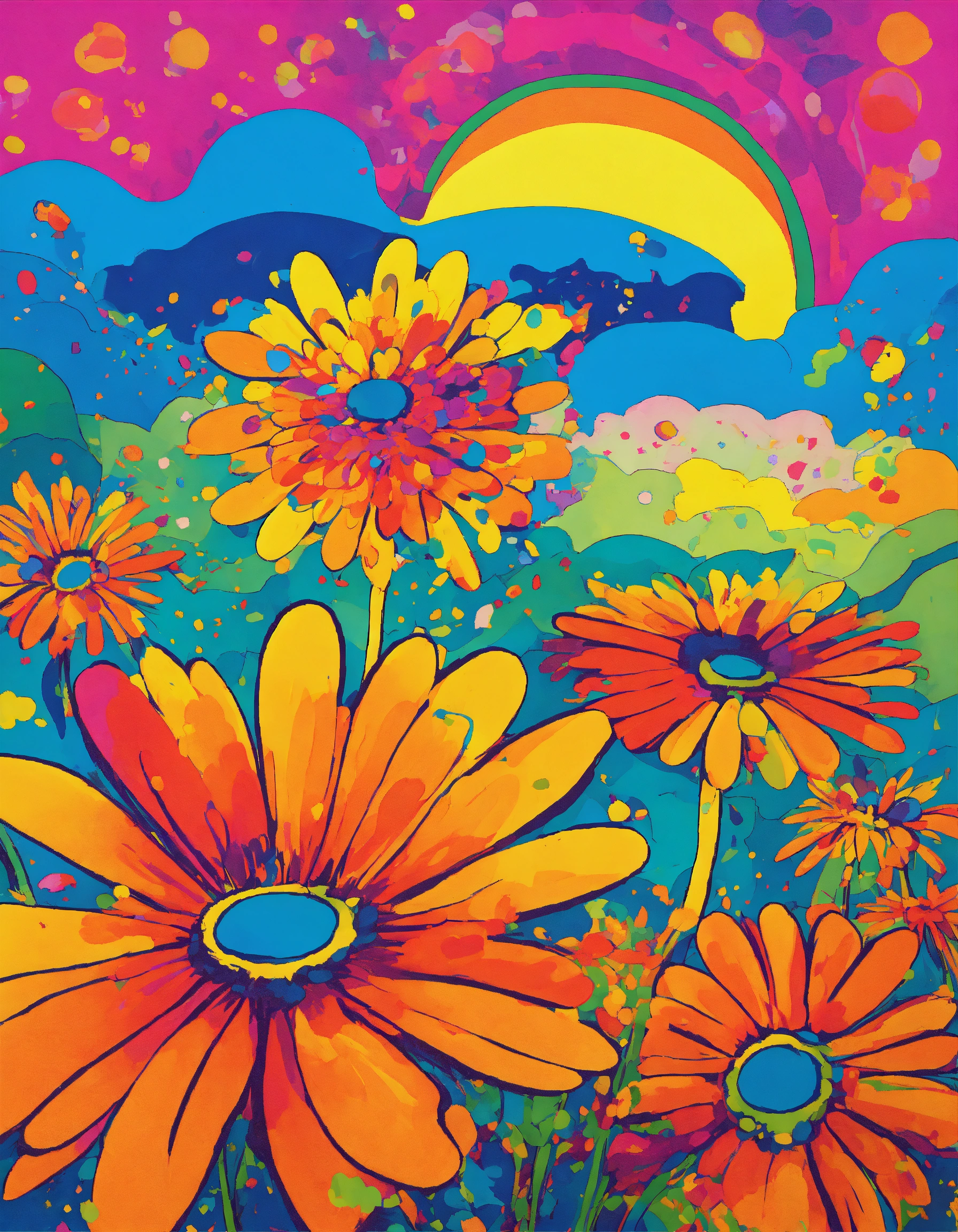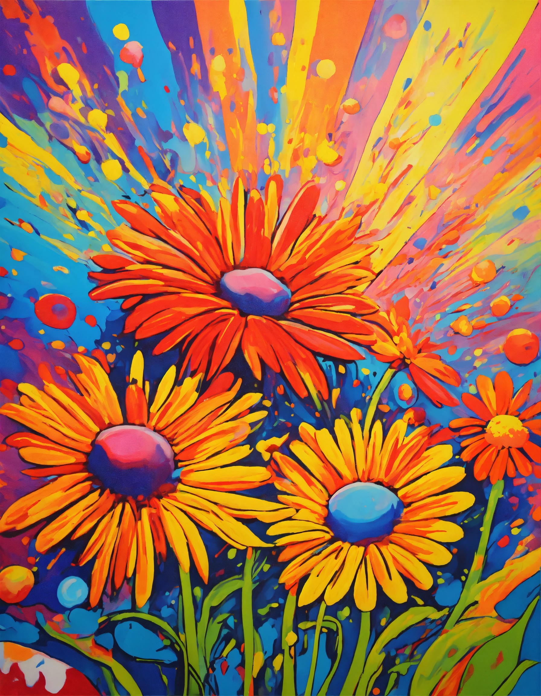Exploding psychedelic daisies in the style of peter max