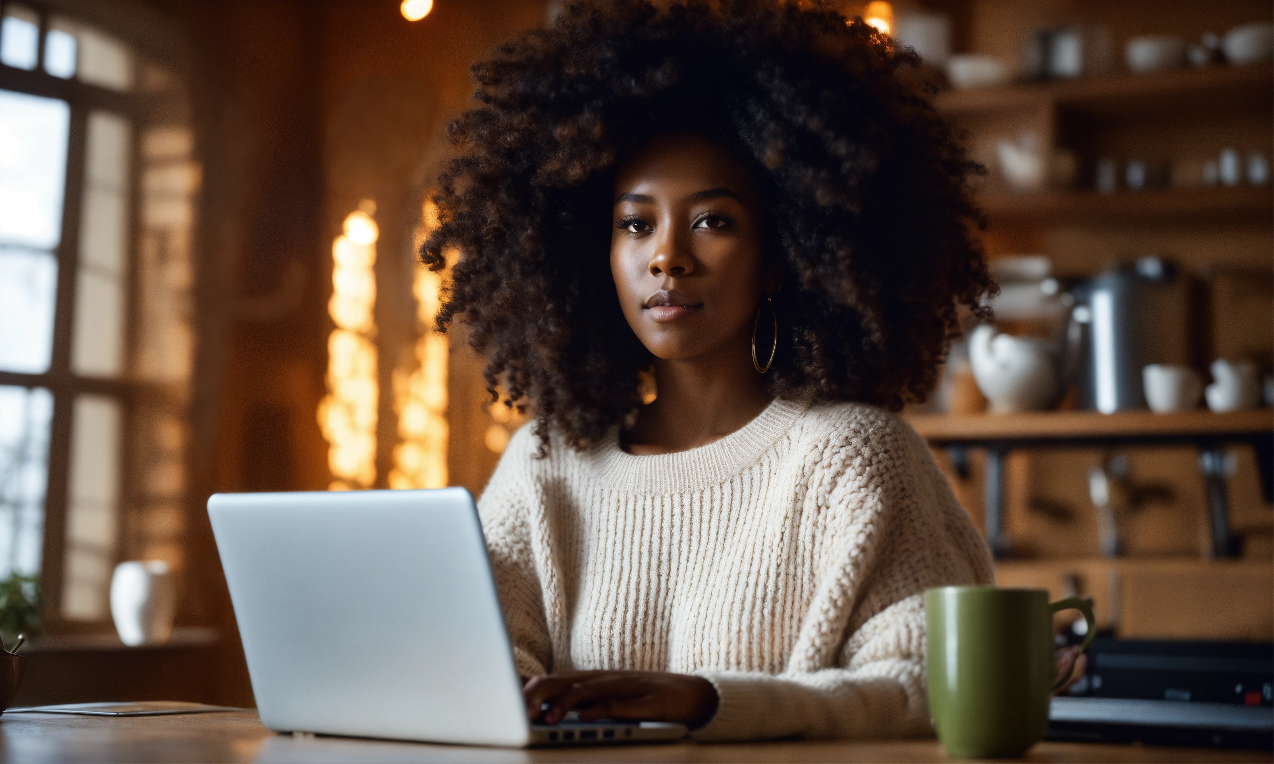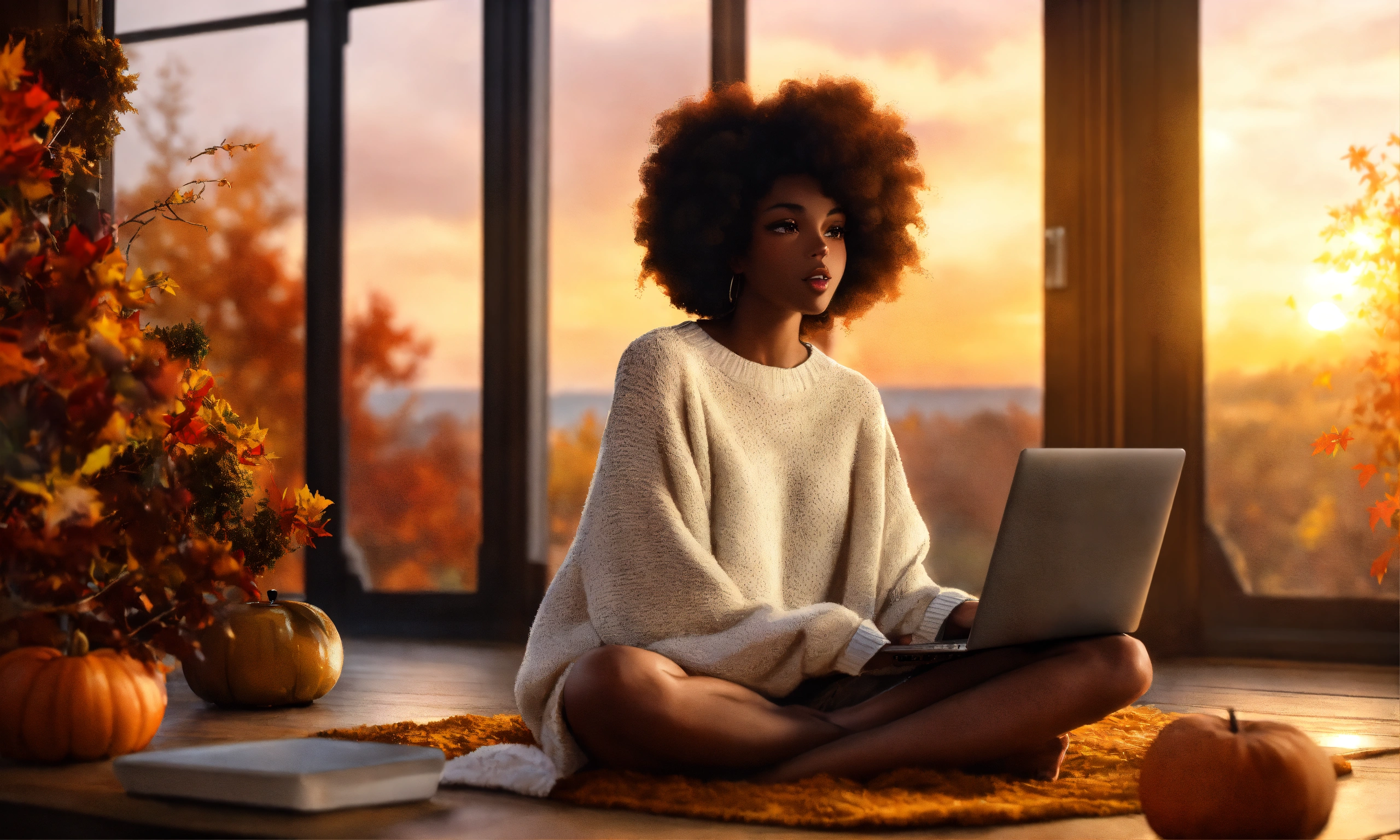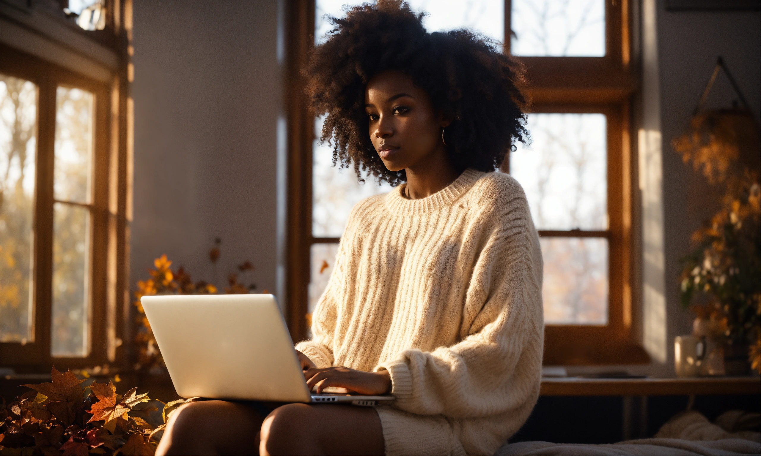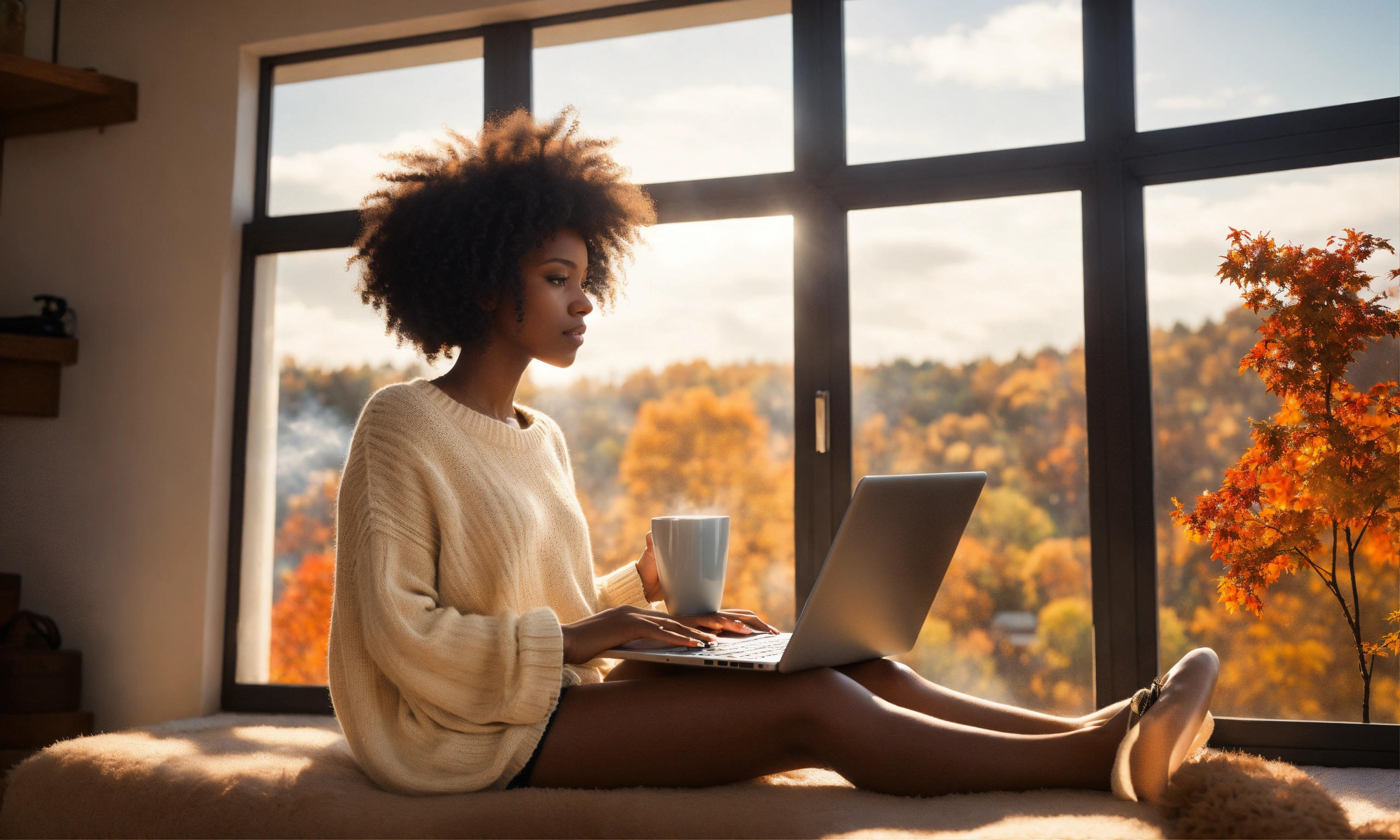 Wide-angle shot, beautiful melanated woman, dark skinned, white oversized sweater with matching knit shorts, open laptop with black screen, bright, with afro hair with loose curls. the sun, the autumn trees, massive loft window, fall, cozy feminine living room, steaming tea, fantastic beauty. curls. ultra-detailed dreamlike, photography 8k resolution image, translucent and ethereal.