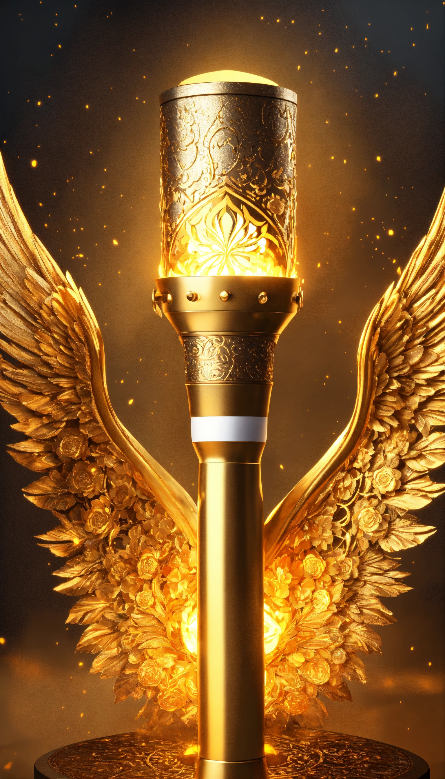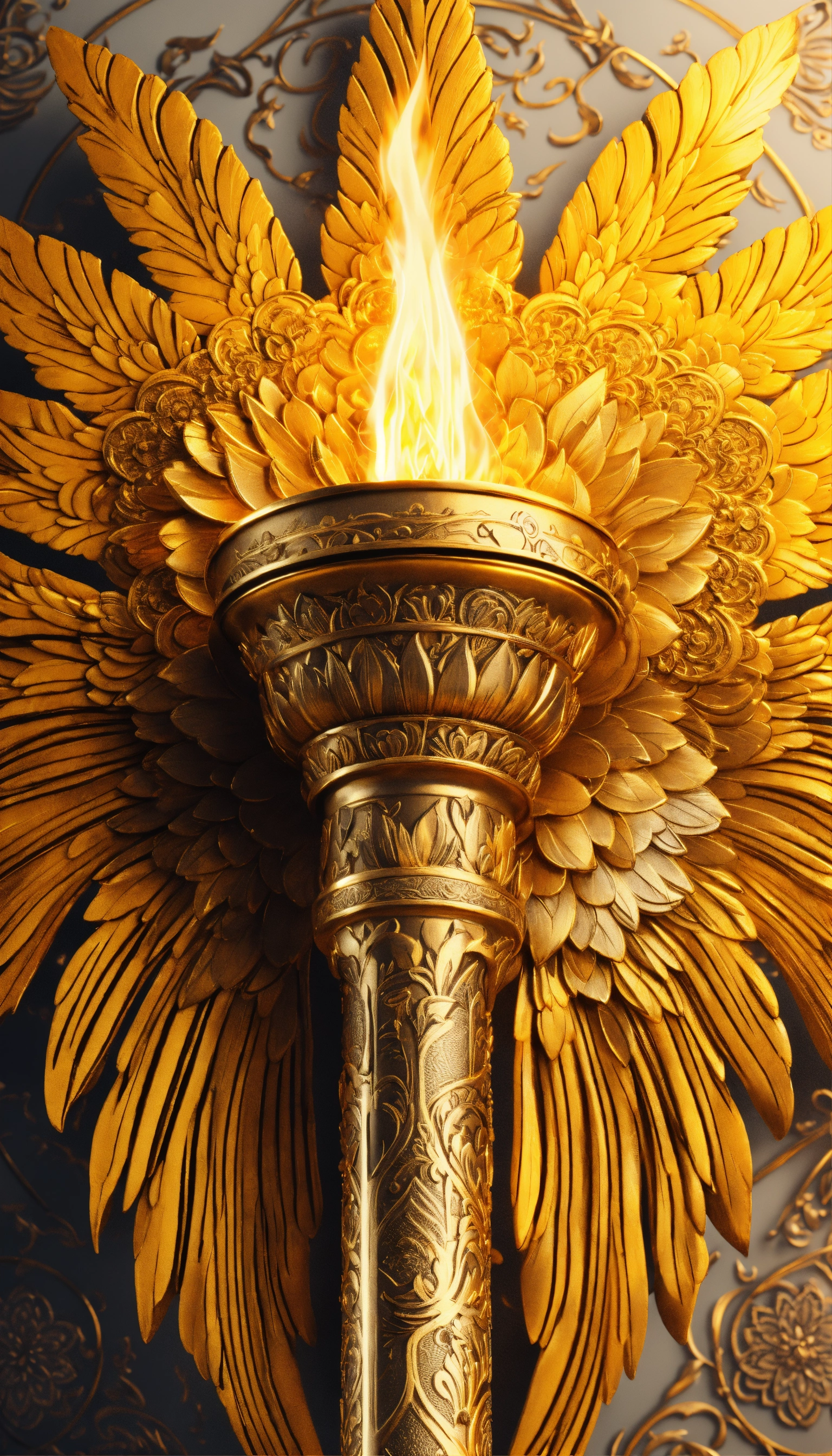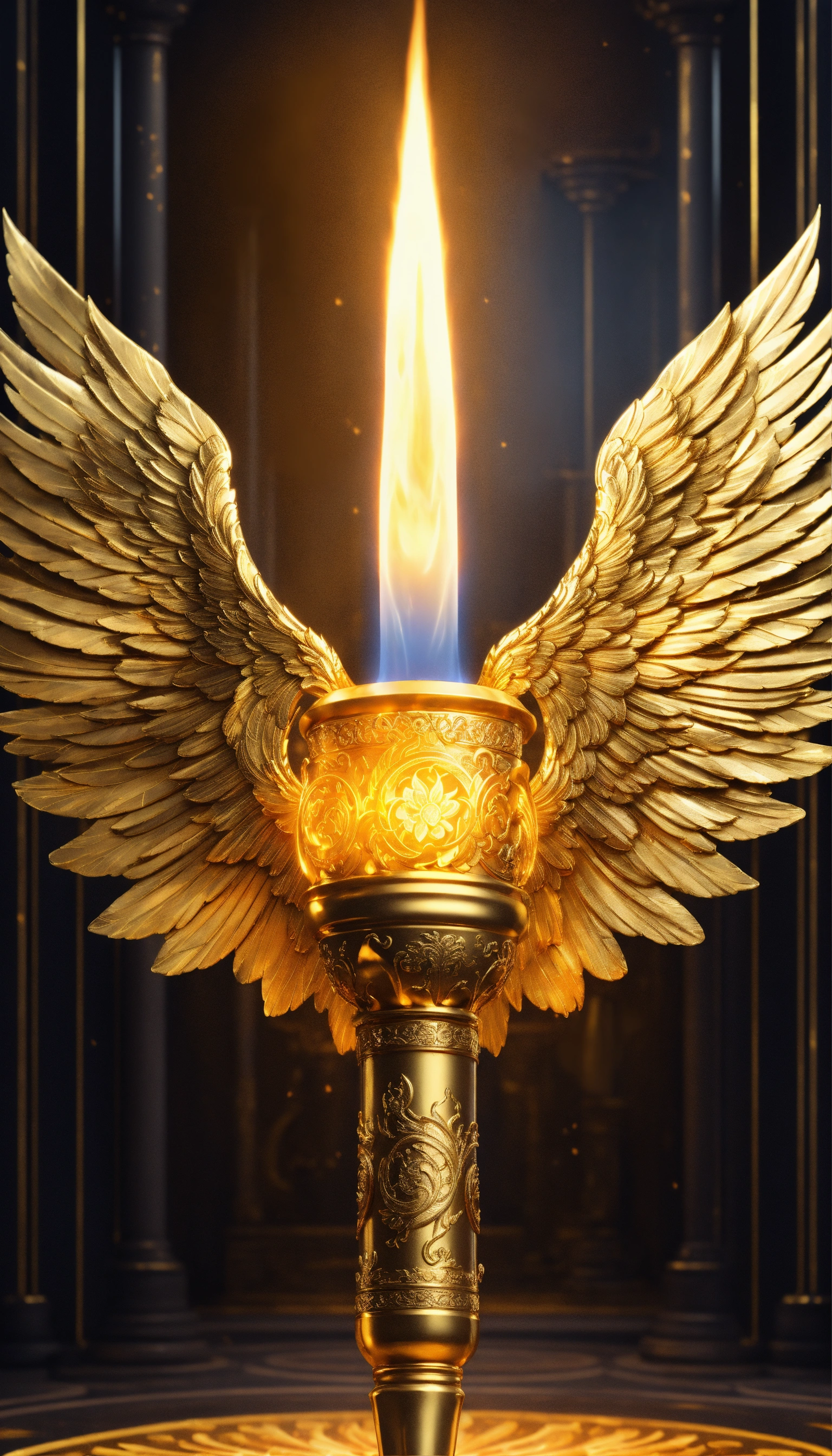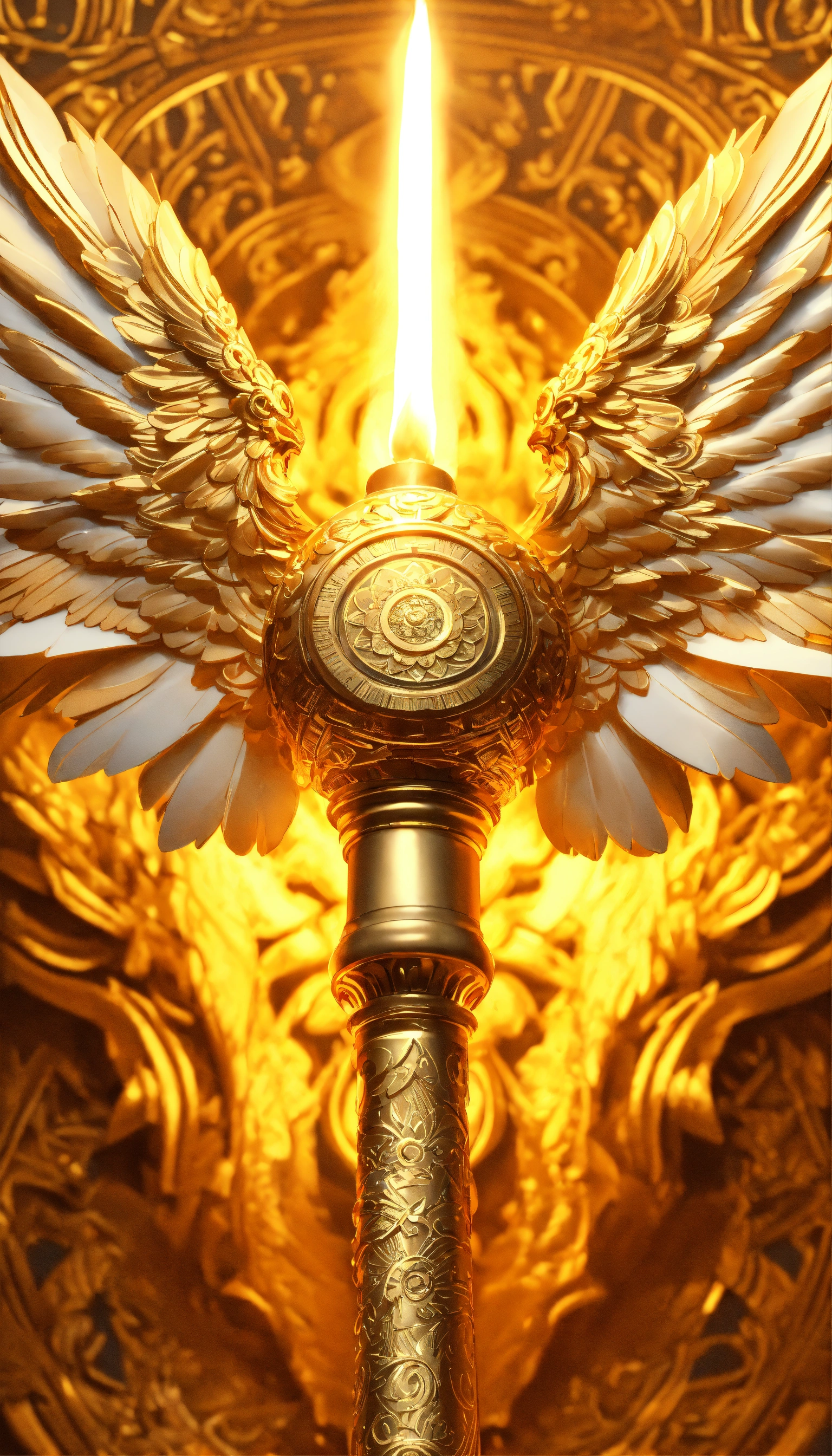 Powerful, detailed torch, digital illustration, real, 3d, golden colored torch with a yellow flame with white and golden details, on each side of the torch there are detailed and large wings, luminous golden mandala shape background, sharp focus, illustration cinematic, 8k, hyperrealistic digital painting, hd, high quality and resolution