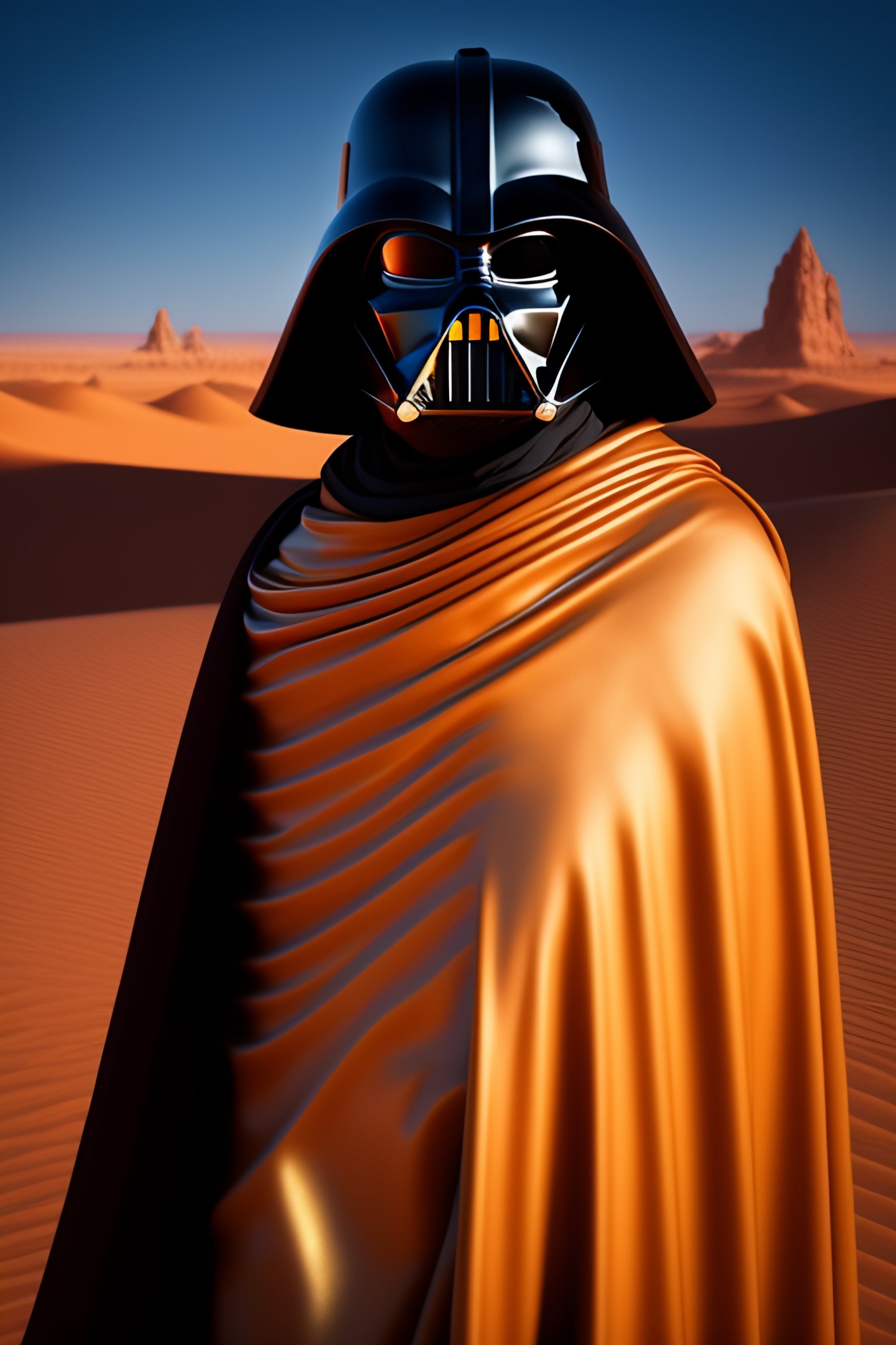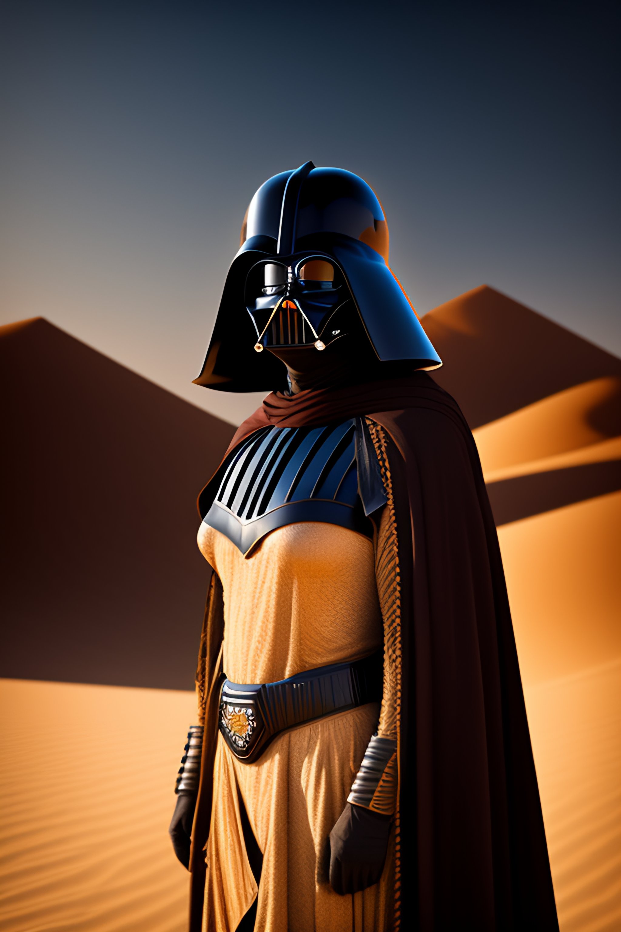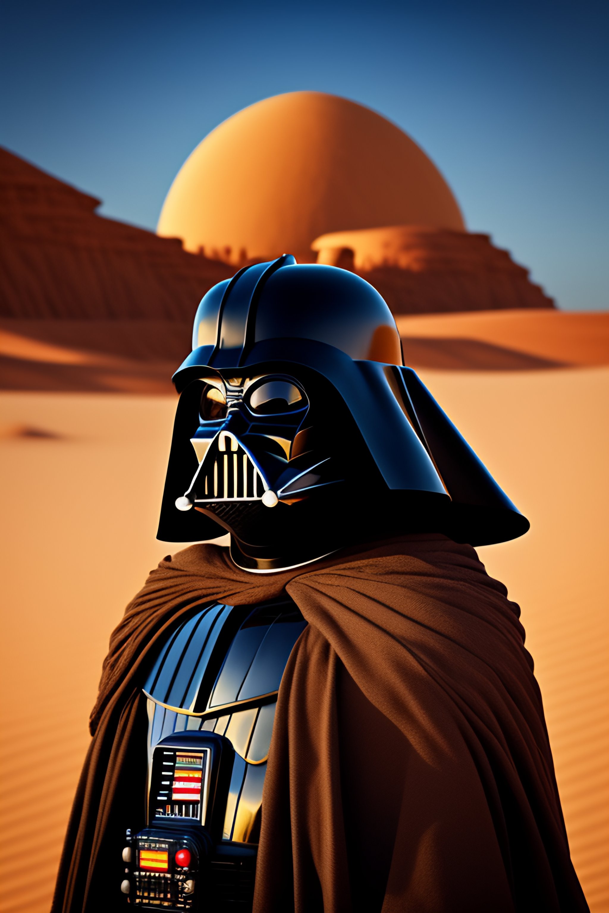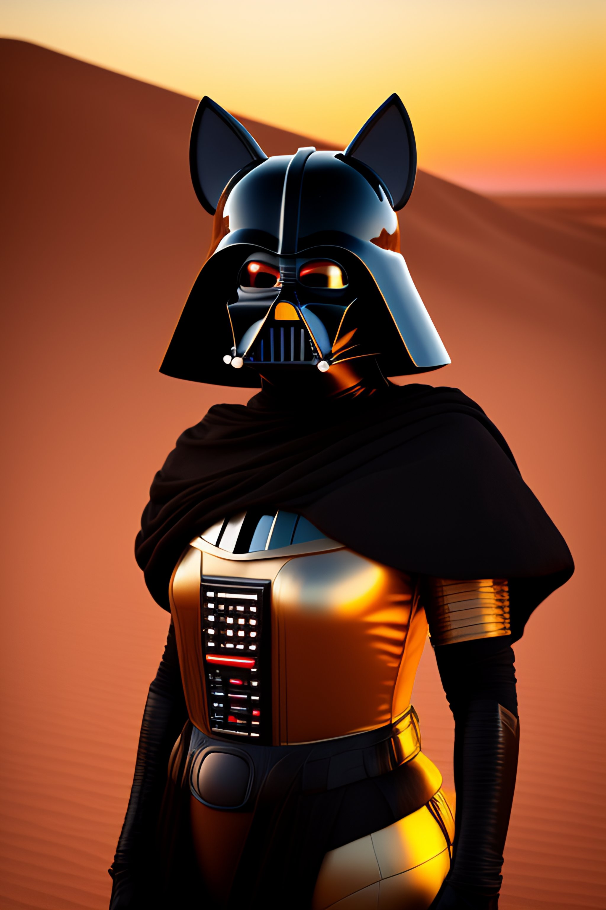 Black cat dressed as darth vader on tatooine