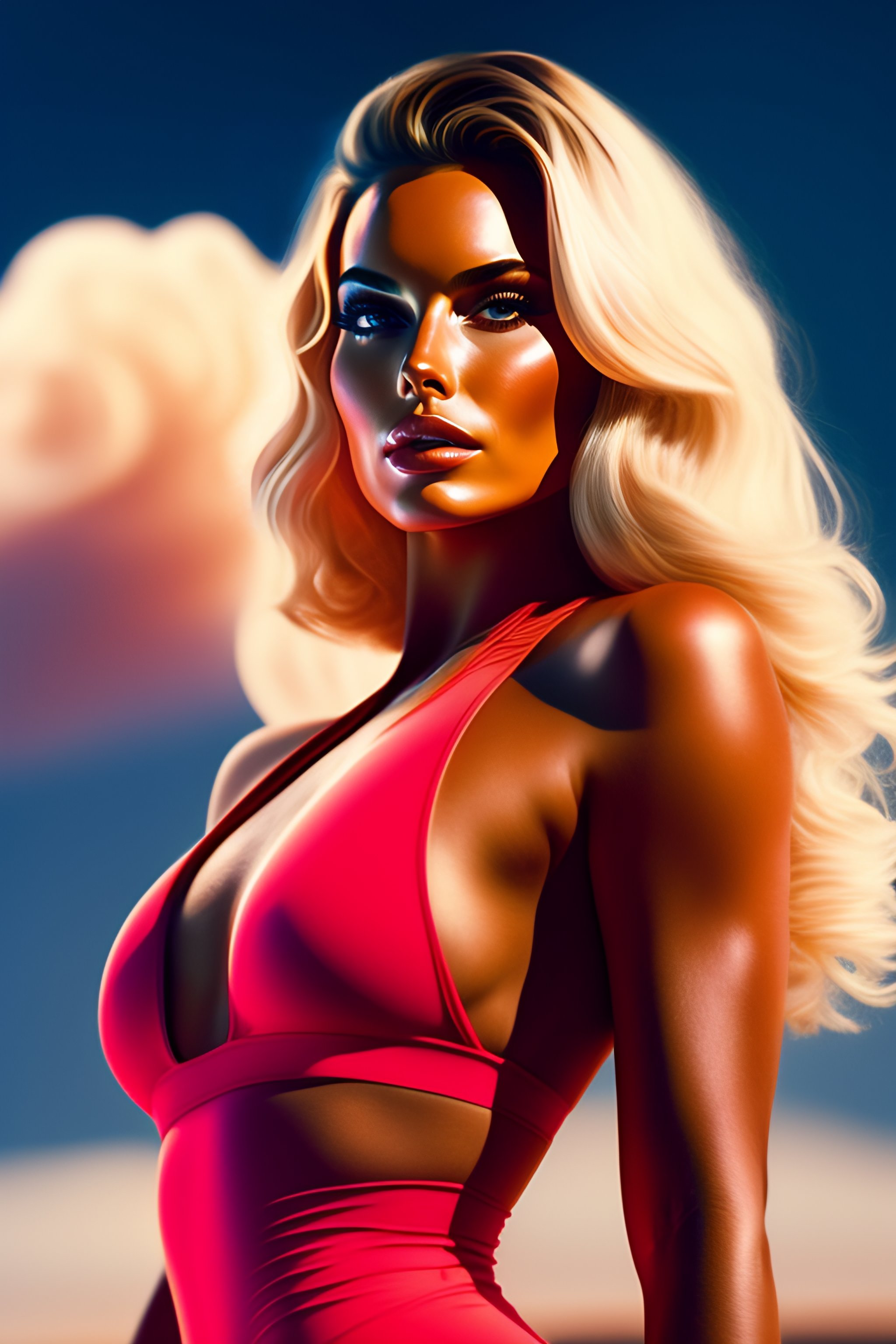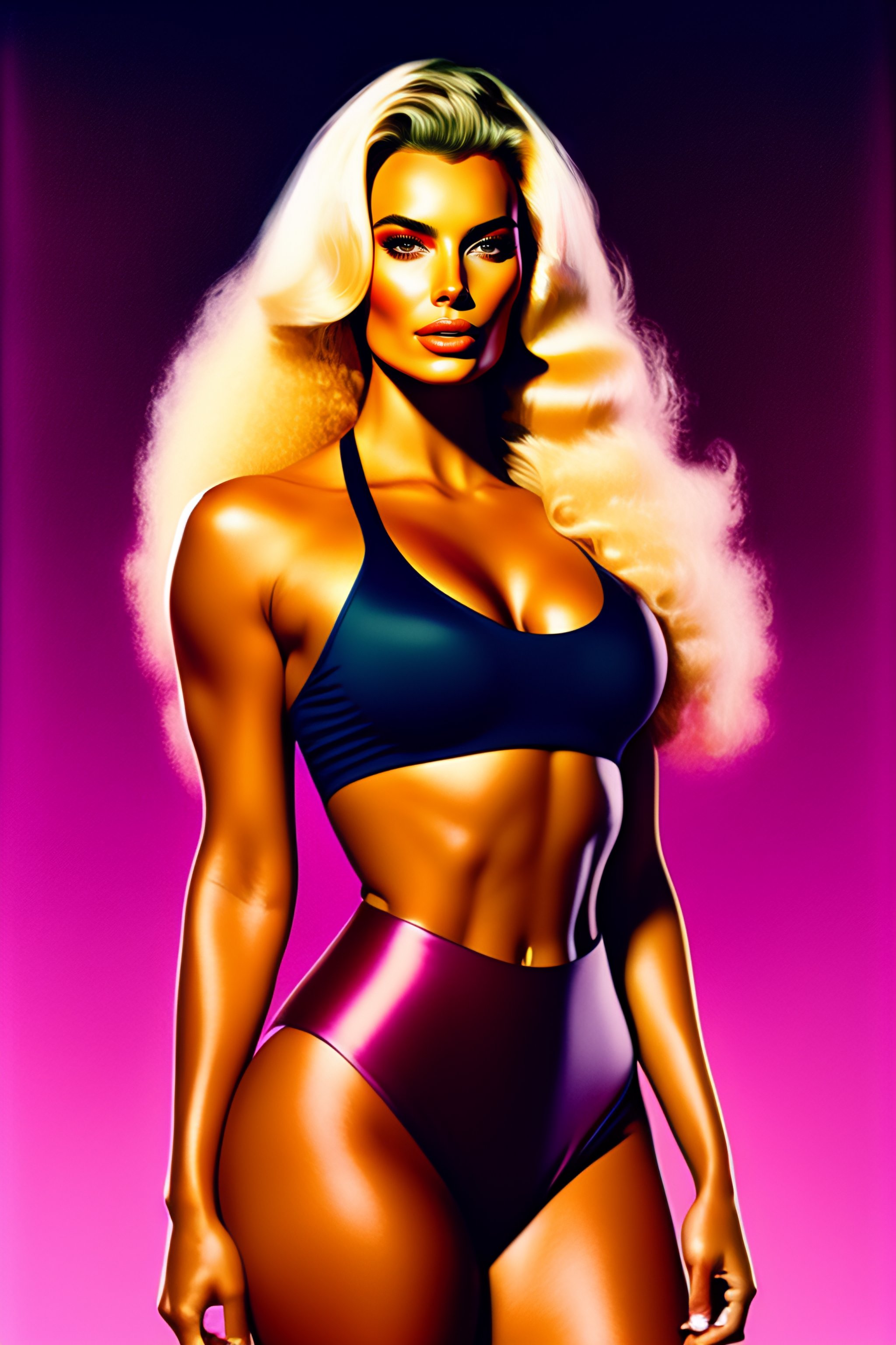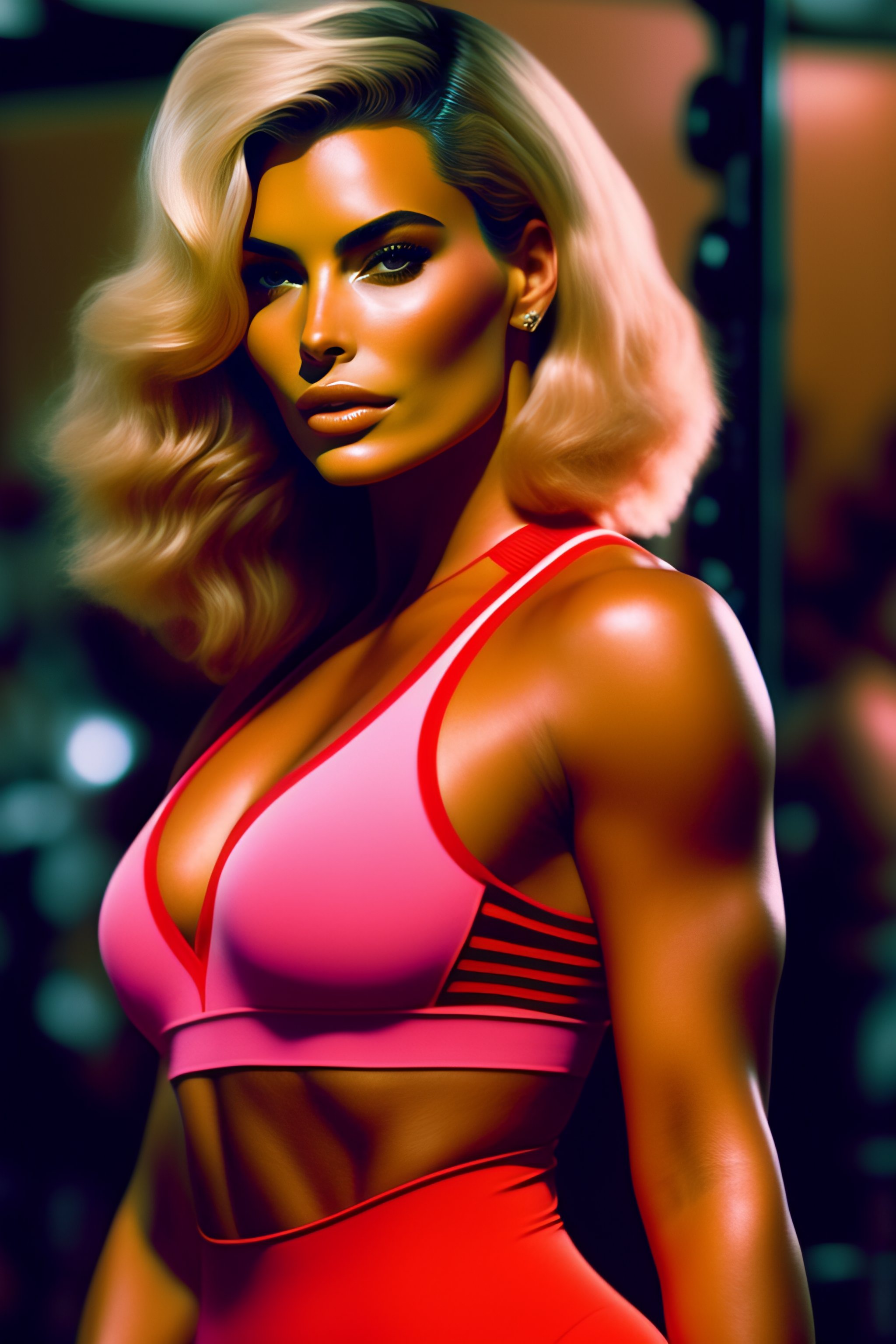 Kim kardashian perfect hourglass body, margot robbie pretty face, blond wearing tight spandex, 1980s gym, portra 400 medium format, plain background, futurstic concept art