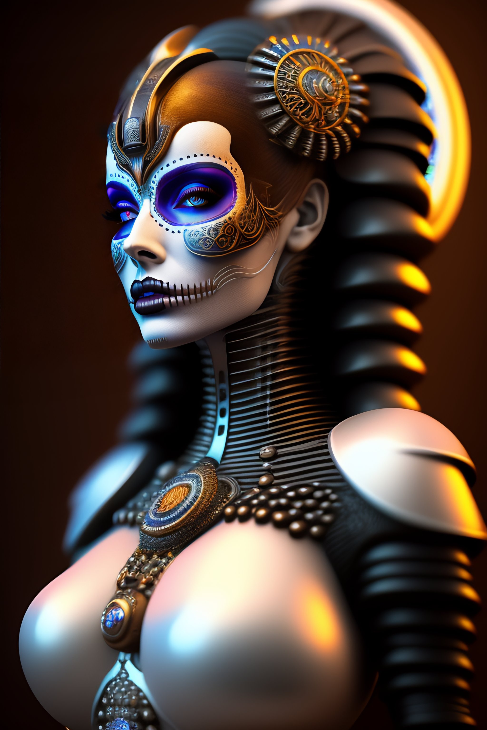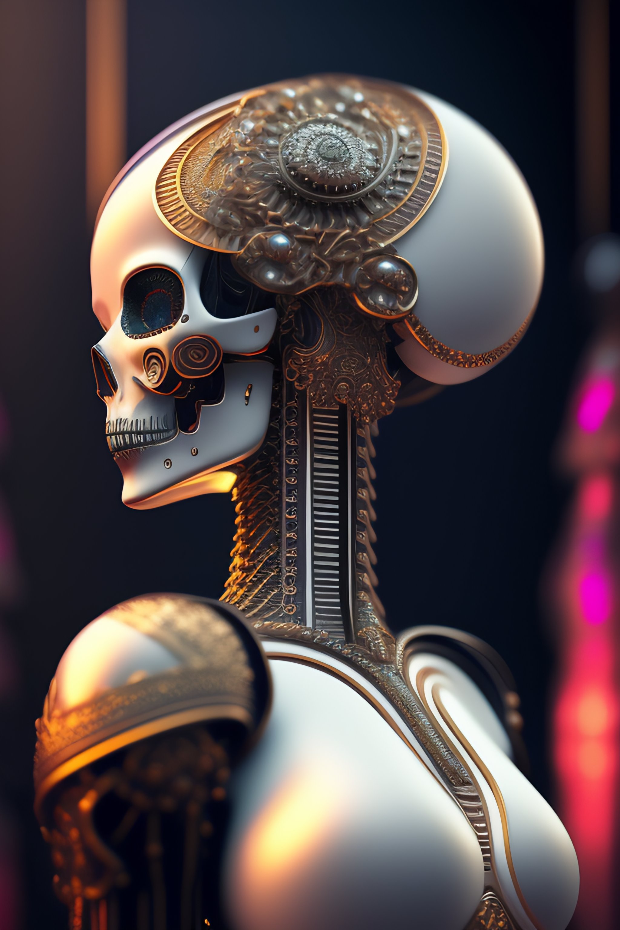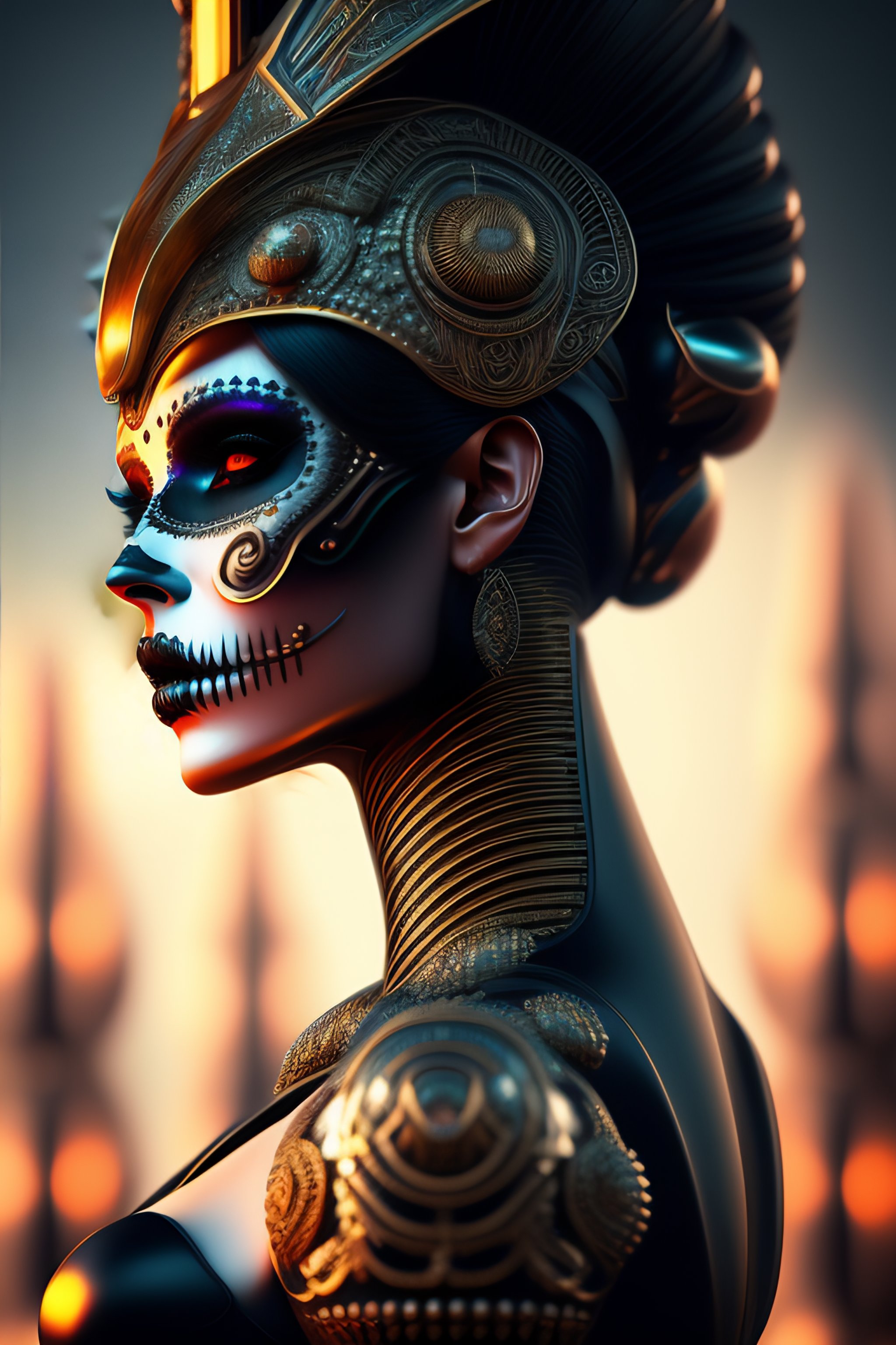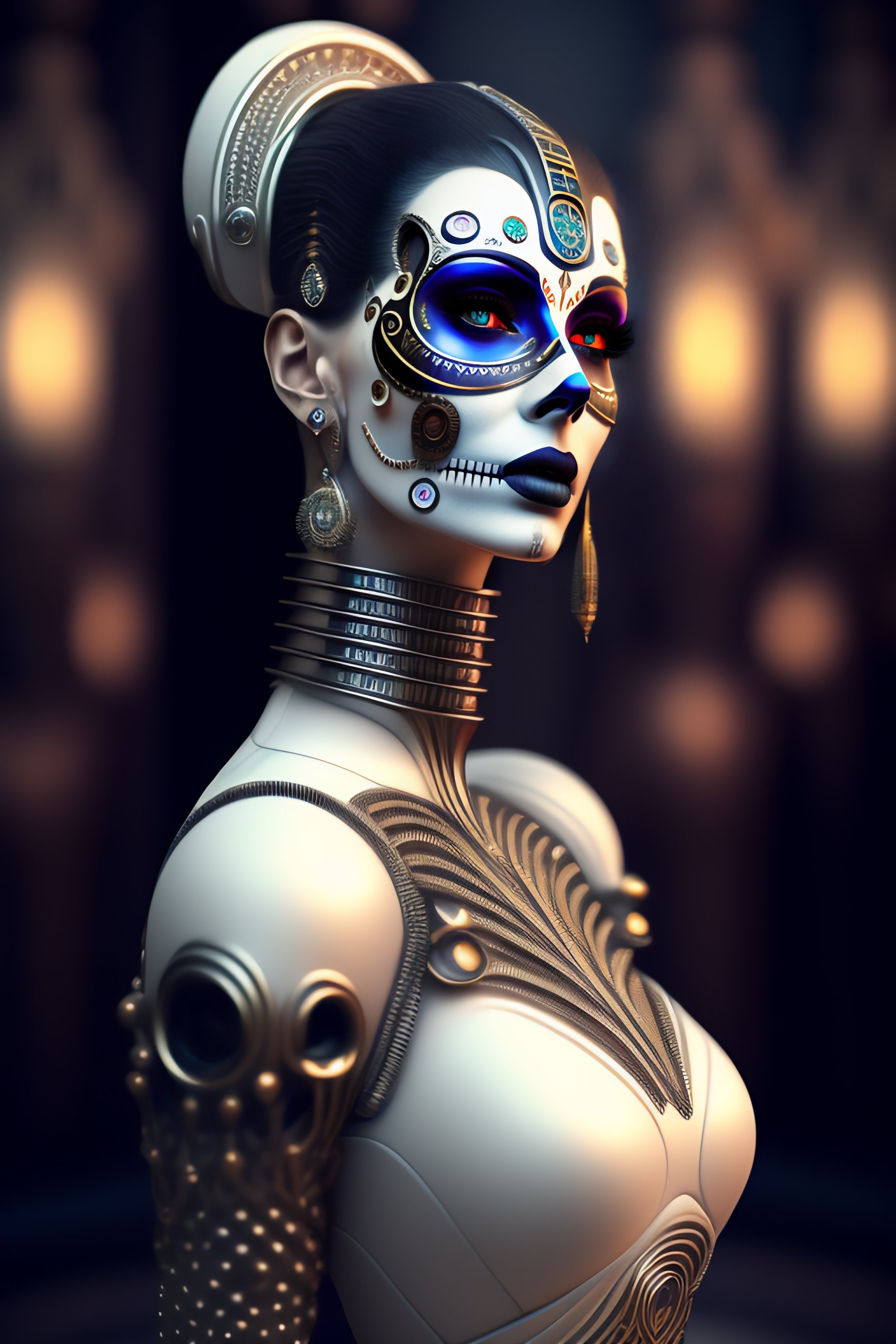 Ultra detailed side portrait of female android, beautiful attractive latina woman with white skine, (dia de los muertos), cyberpunk, face is decorated with bone art deco patterns, female android, very white skine, intrincate robot body, skull decoration, catrina, sharp focus, sci - fi, fantasy art, digital illustration. octane render, unreal engine, global illumination, intricate detailed. art by giger, 8 k
