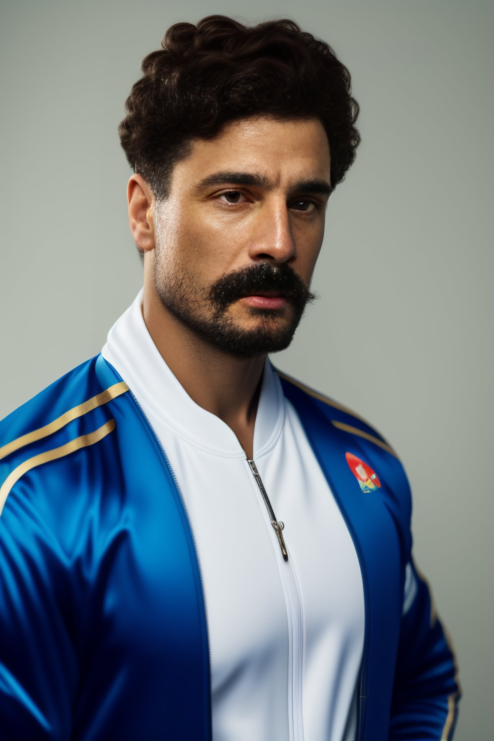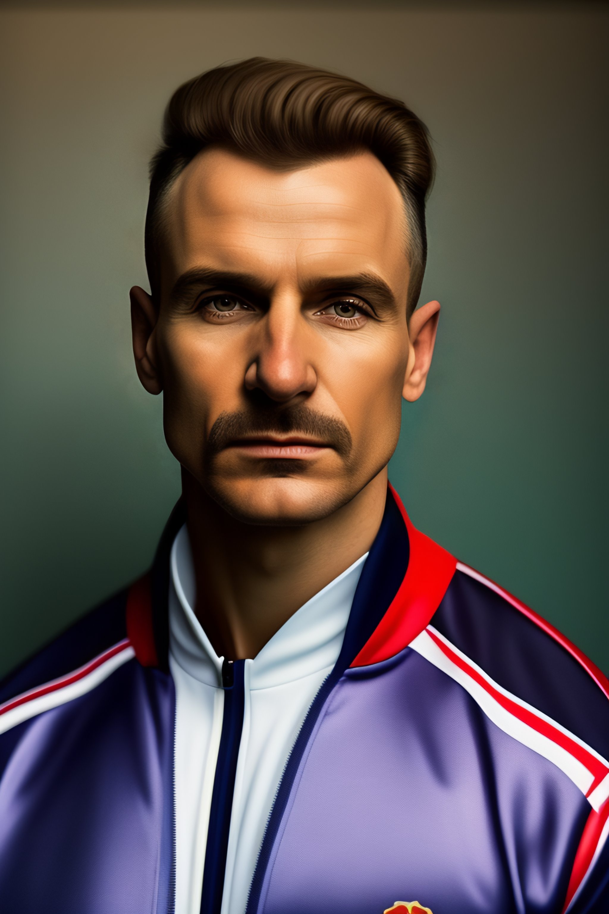 Portrait of a short stout russian criminal with a funny tracksuit