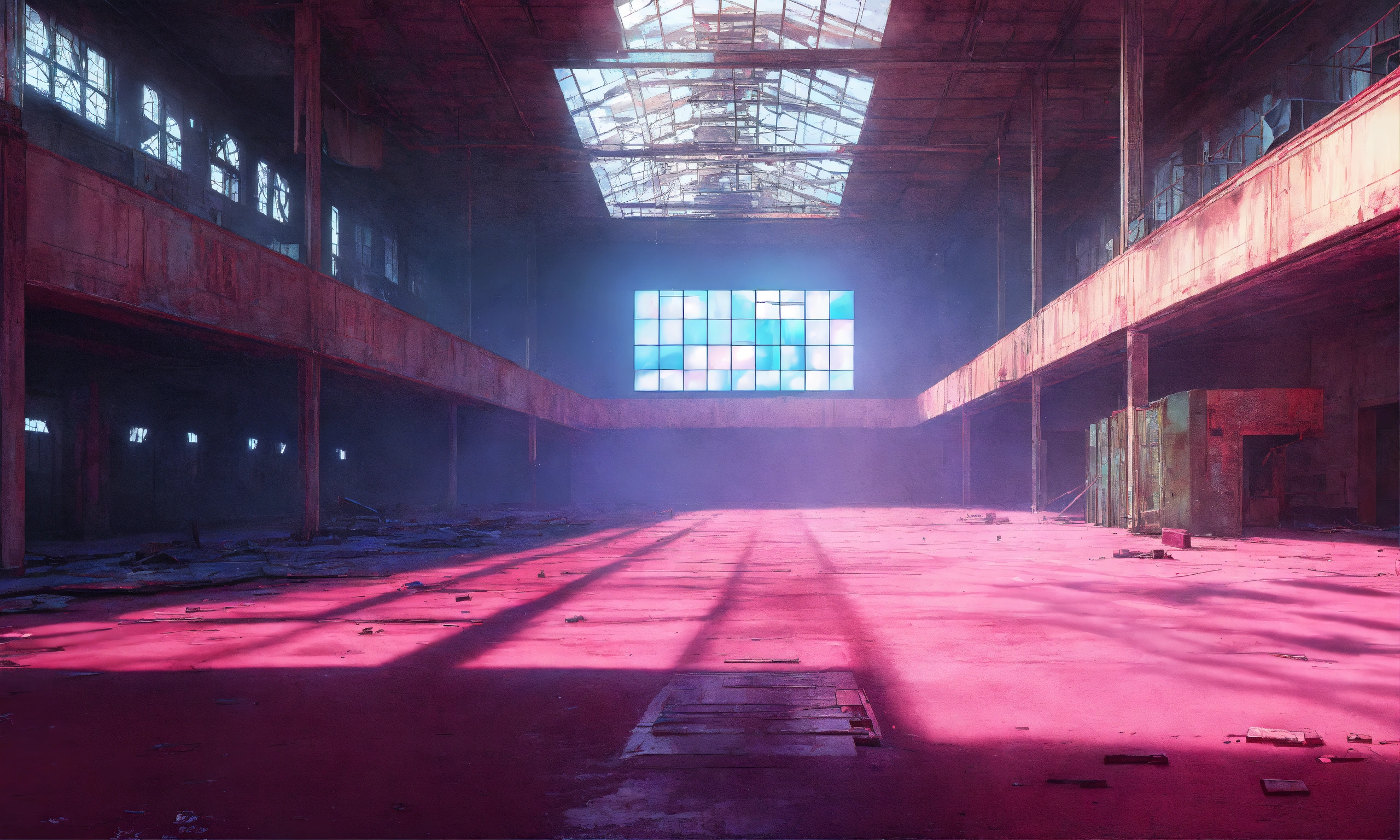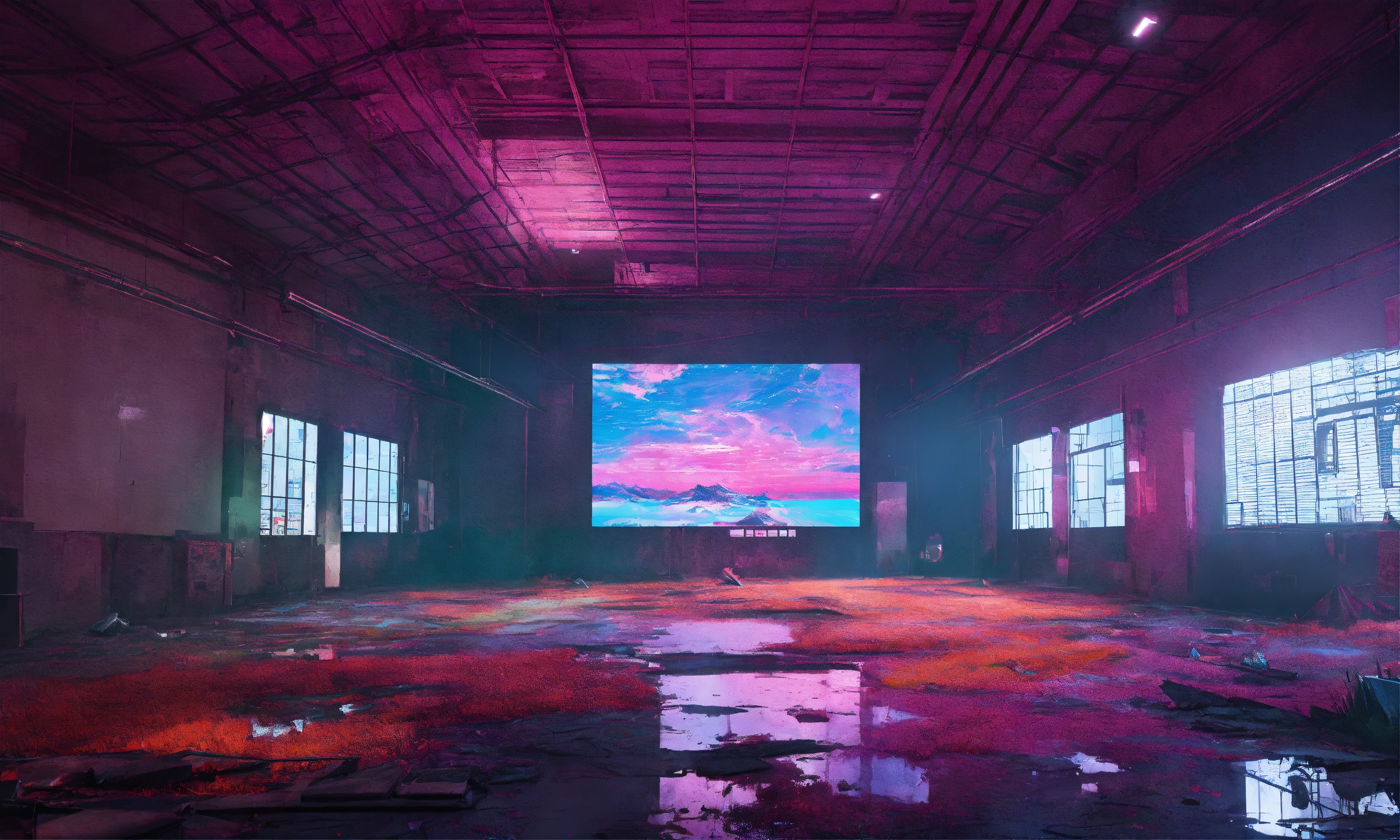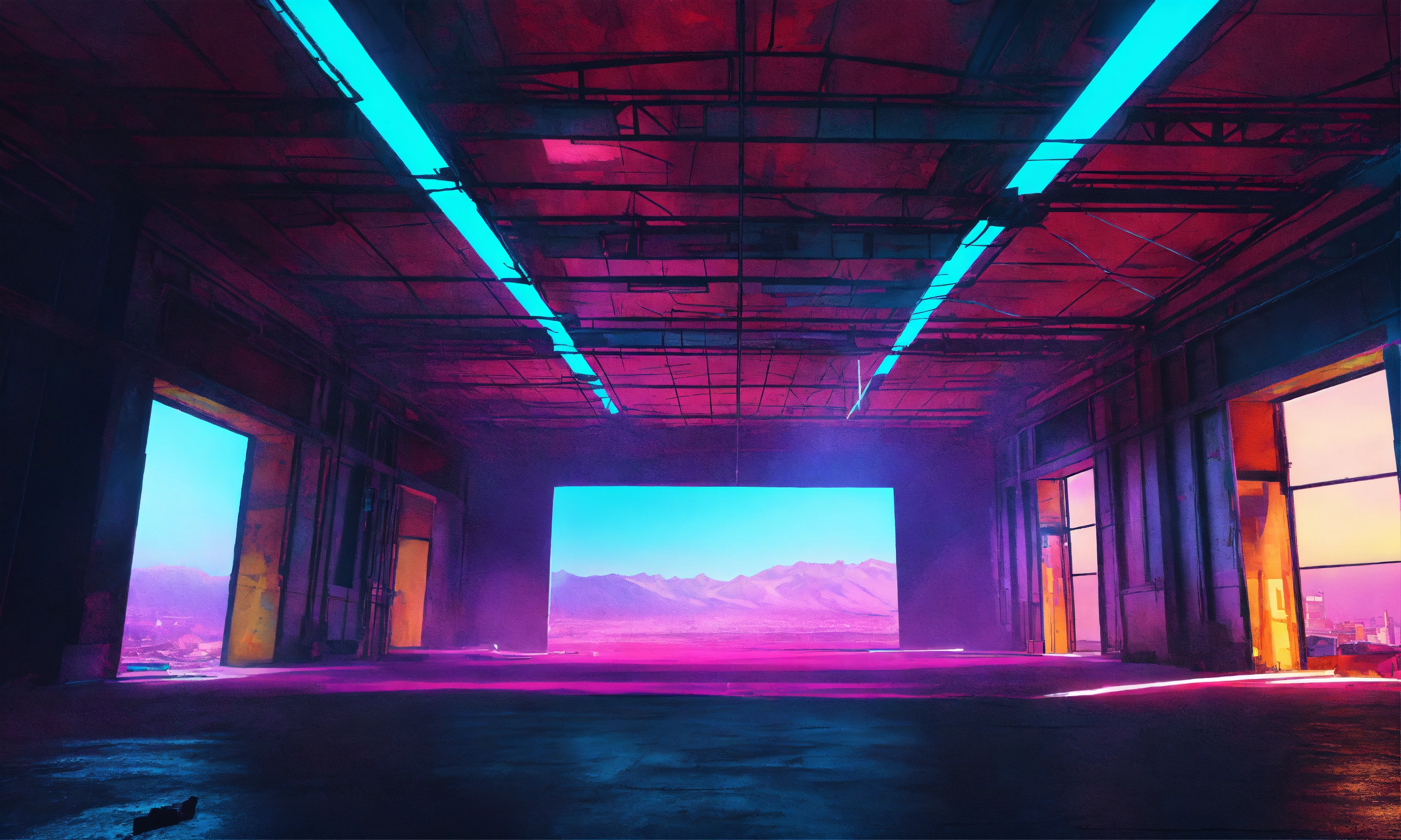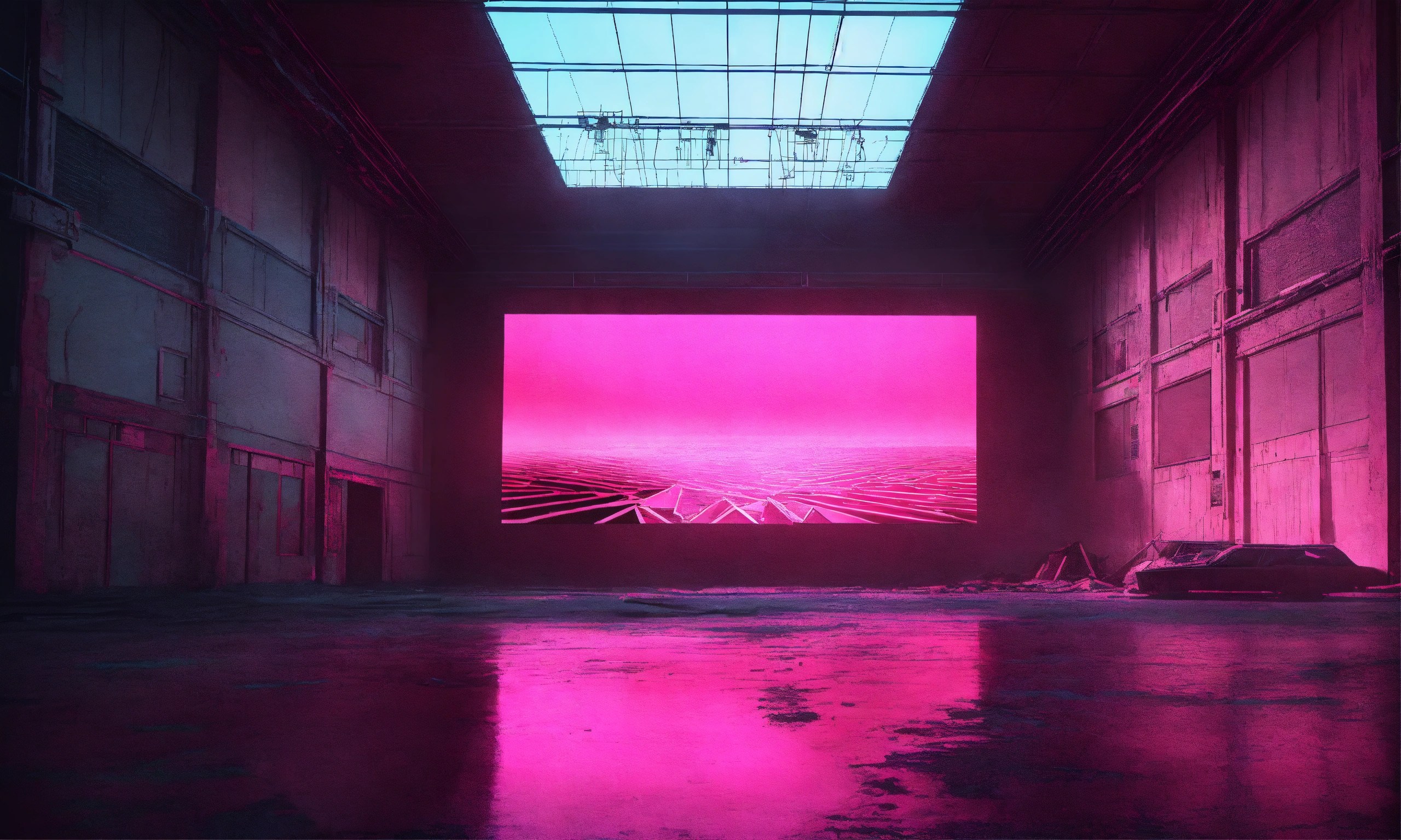 A beautiful, sharp focus, huge led display in the middle of an abandoned wear-house. the space is otherwise empty. the whole area is run down, with broken. window vents letting light in. it's dark and derelict. wide angle. vaporwave ombre rendering. outrun style. by chris moore. beeple colors. ambient occlusion. digital matte painting.