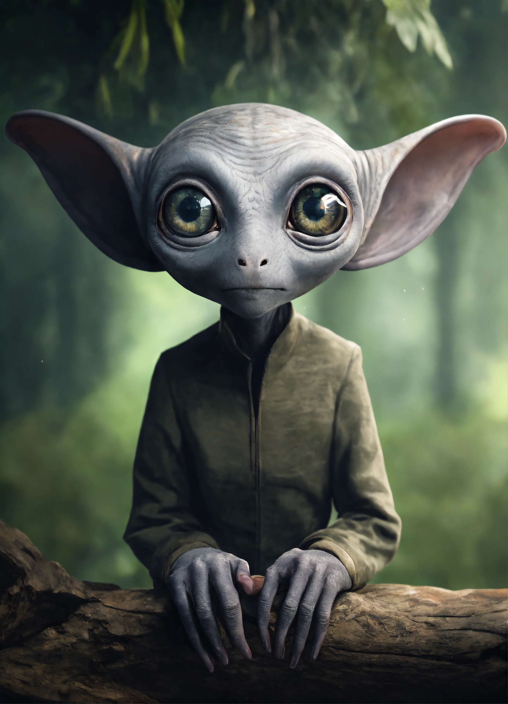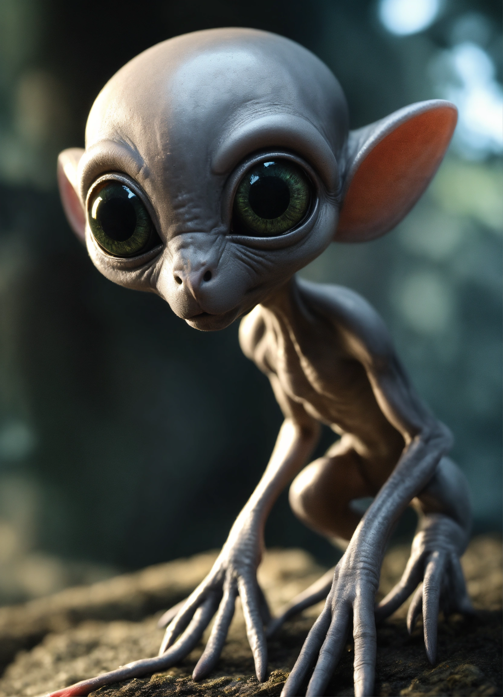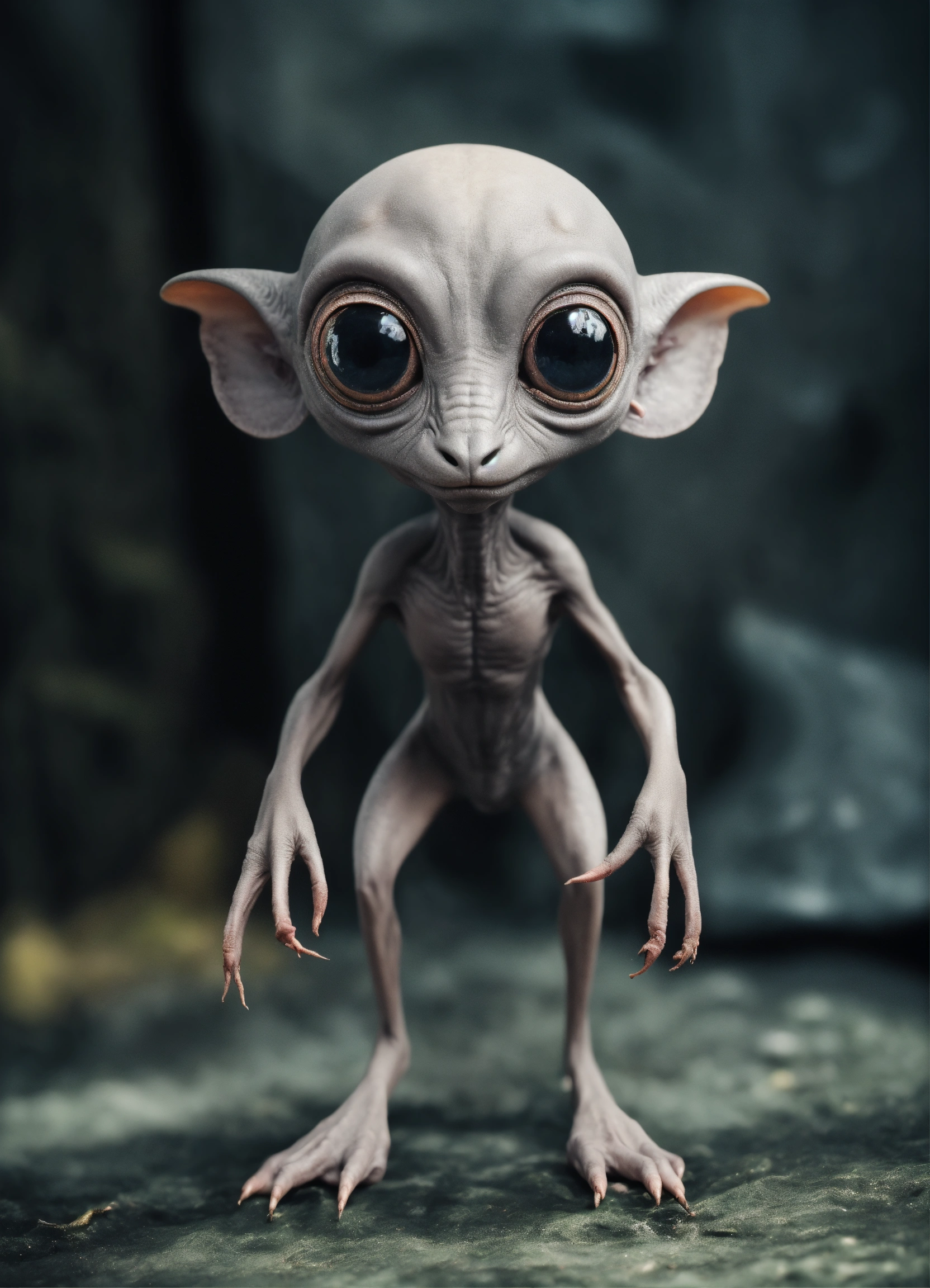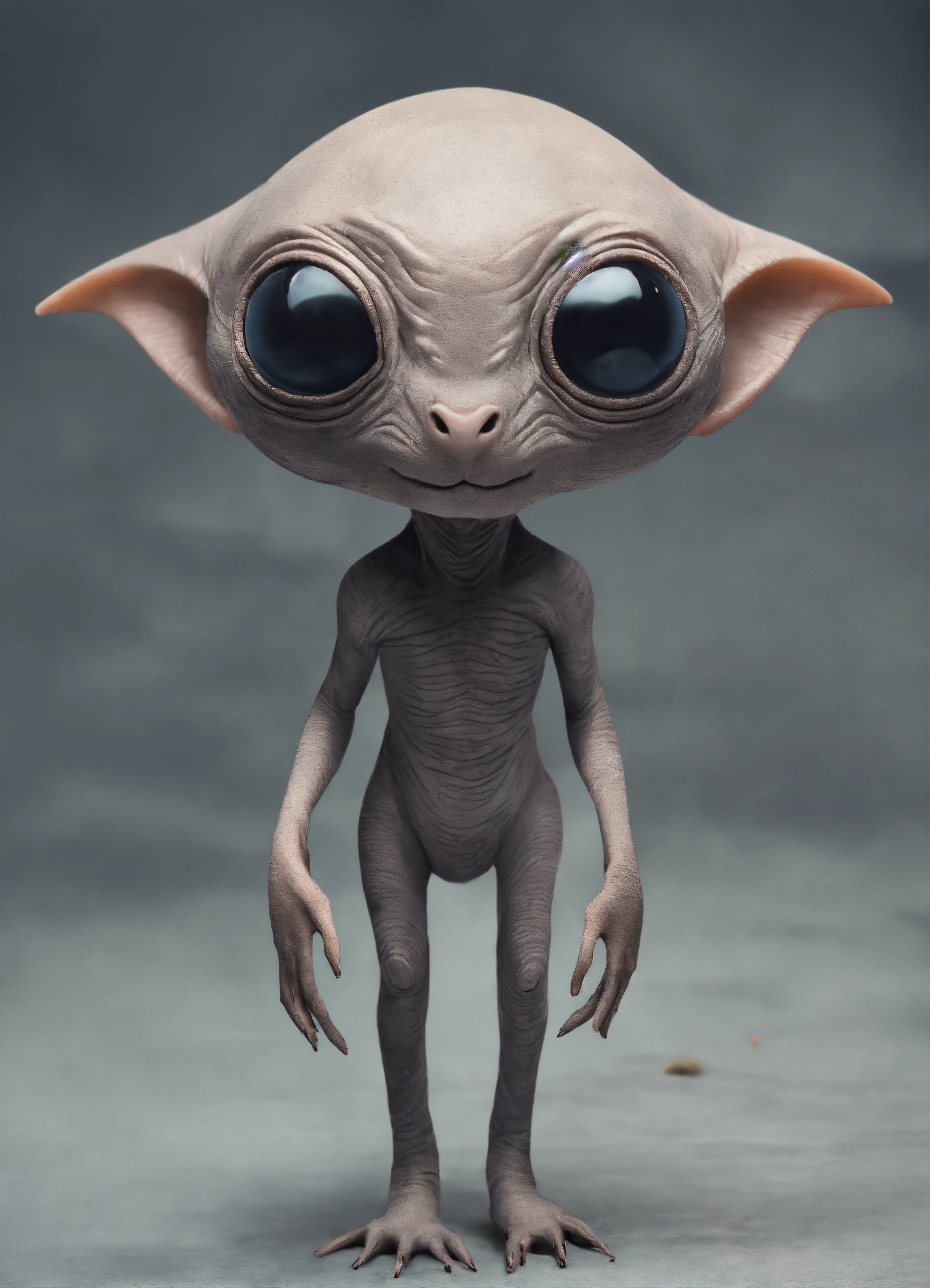 Gray alien creature with huge eyes, bald. instead of a nose there is a small gap, a mouth without lips. lop-eared. 3 fingers on each hand. full length
