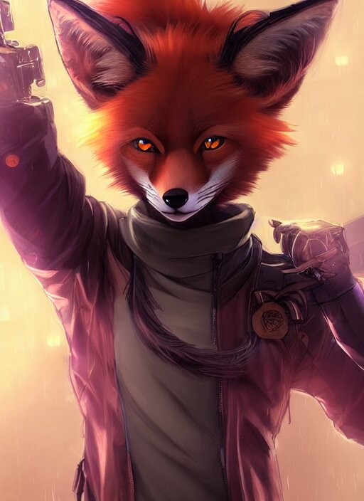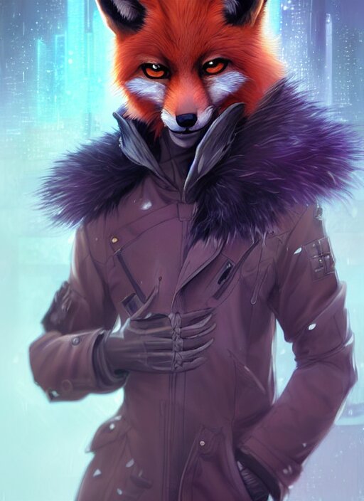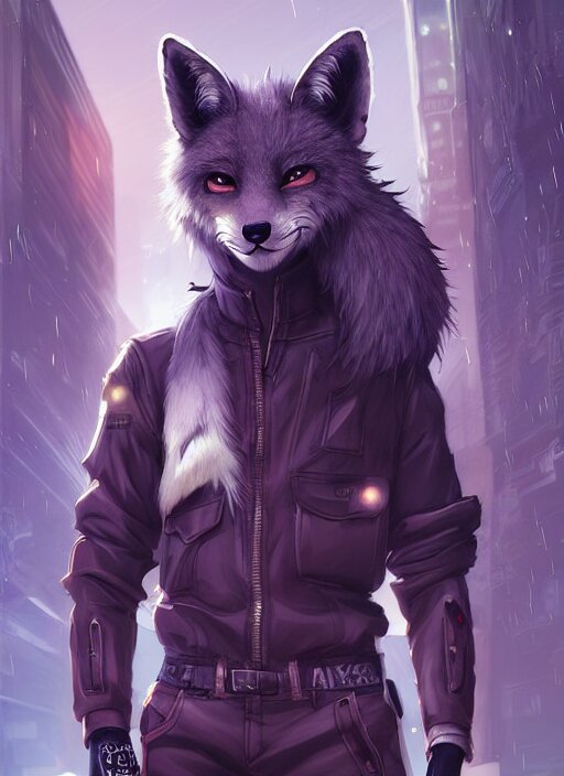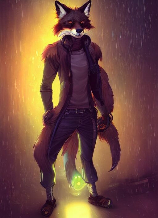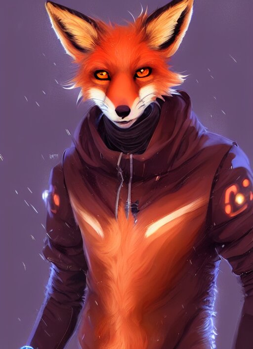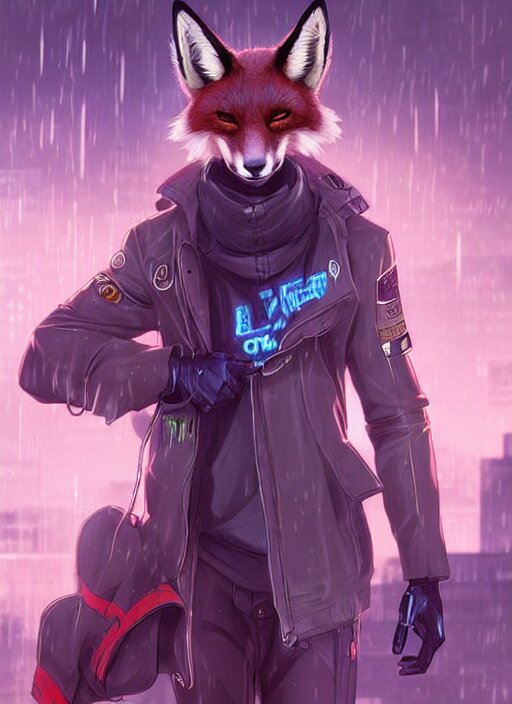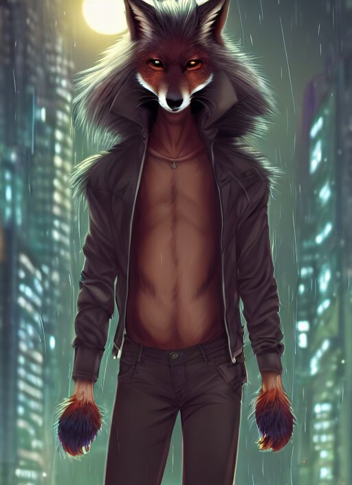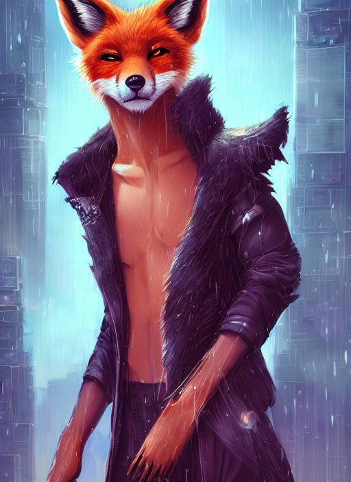 Award winning beautiful portrait commission of a male furry anthro melanated fox fursona with a tail and a cute beautiful attractive detailed furry face wearing stylish cyberpunk clothes in a cyberpunk city at night while it rains. character design by charlie bowater, ross tran, artgerm, and makoto shinkai, detailed, inked, western comic book art