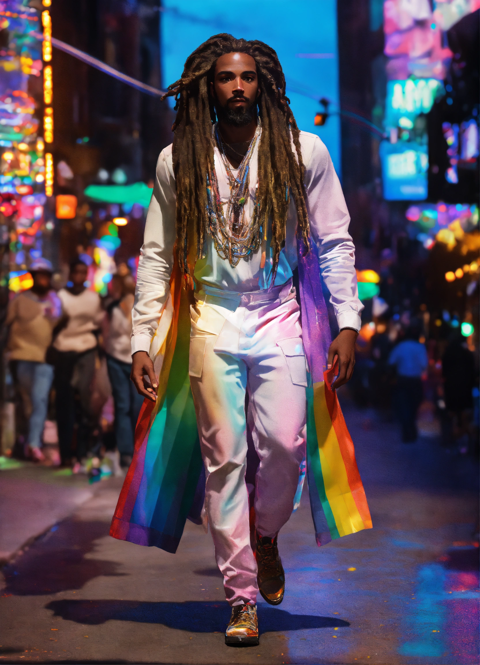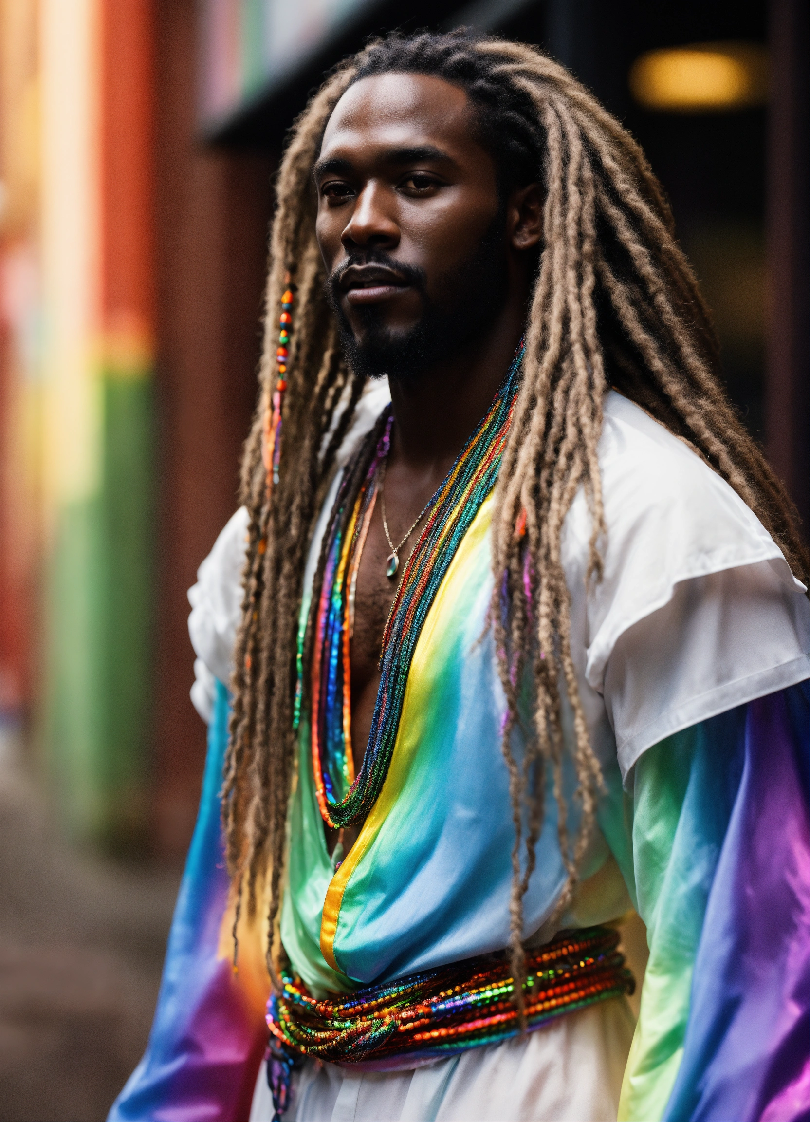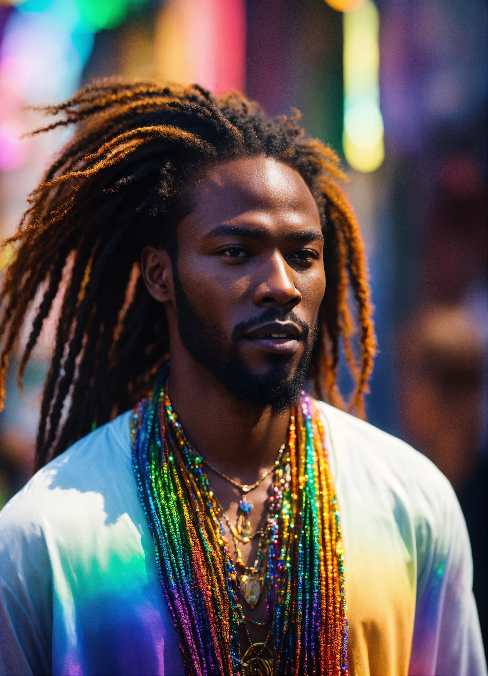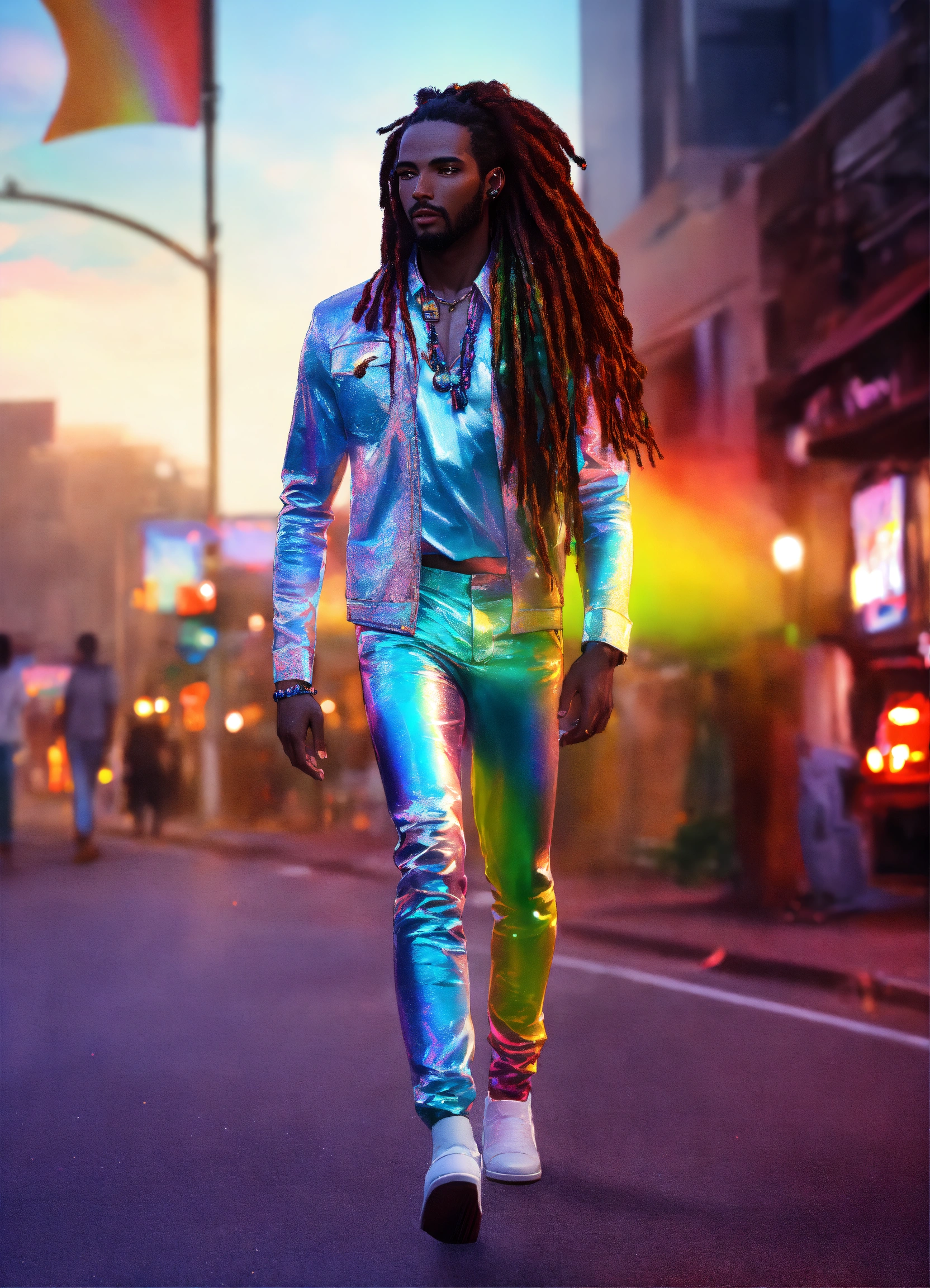 Hologram of a black man with long flowing dreadlocks, well-built, virile, 6' 5" tall, he has iridescent black skin that reflects all the colors of the rainbow, full body shot, striding up the street confidently, looking directly into camera, wearing white iridescent clothing, african style iridescent clothing that reflects all the colors of the rainbow, 3d render