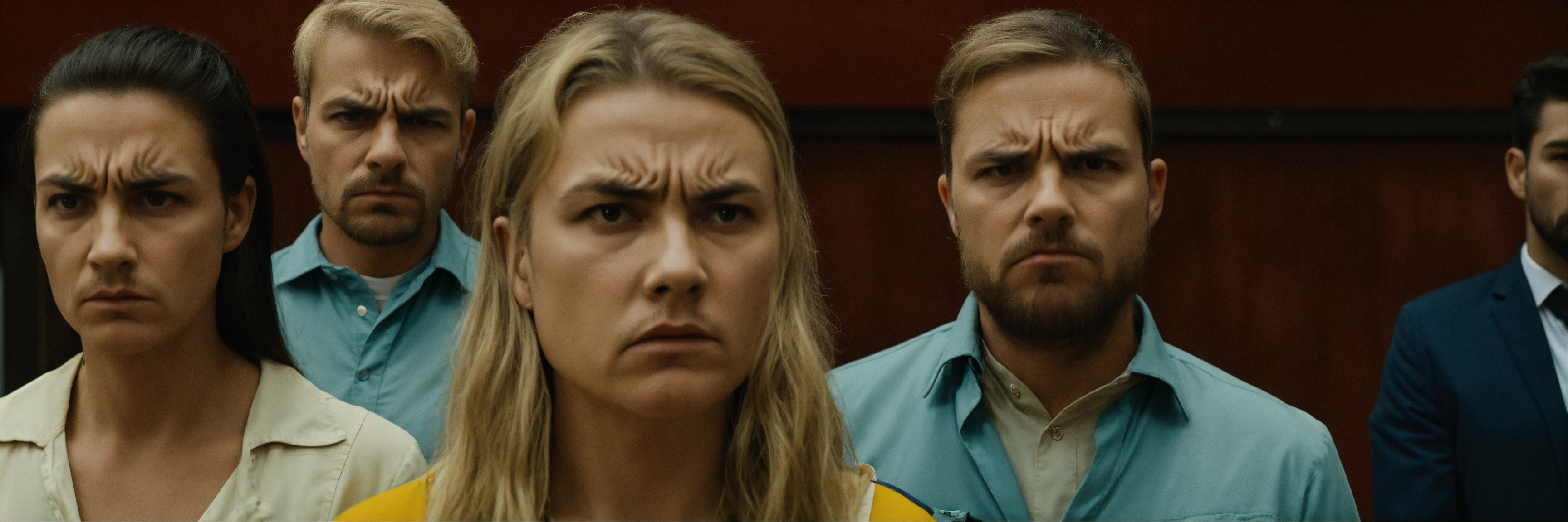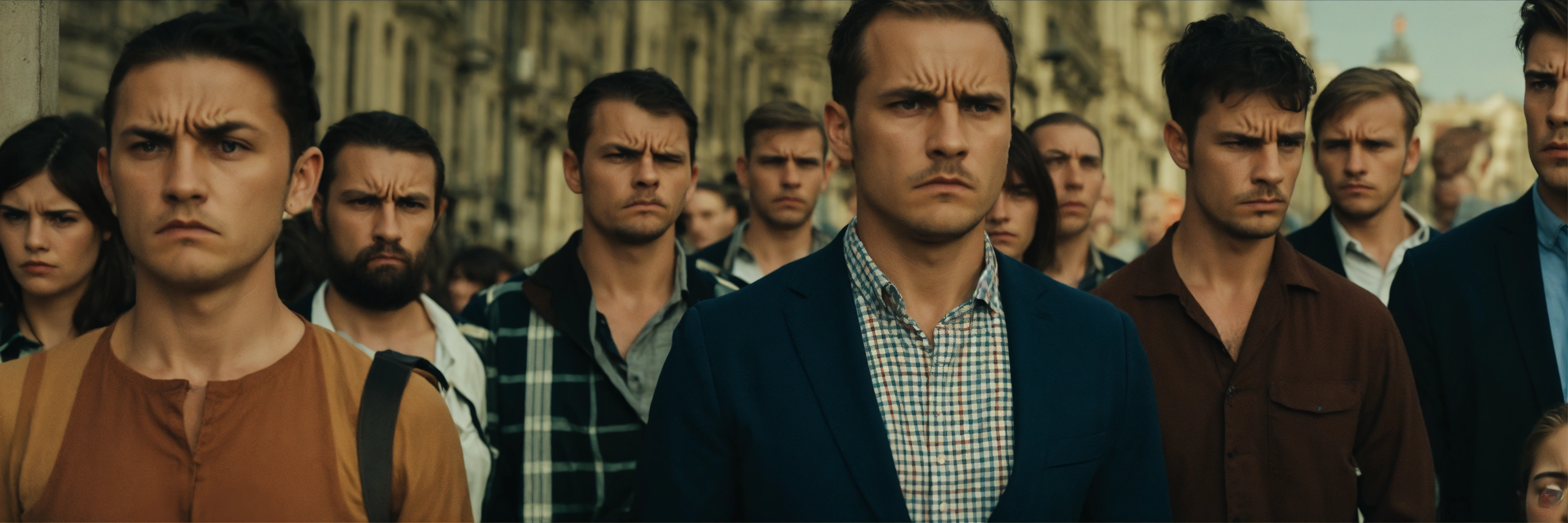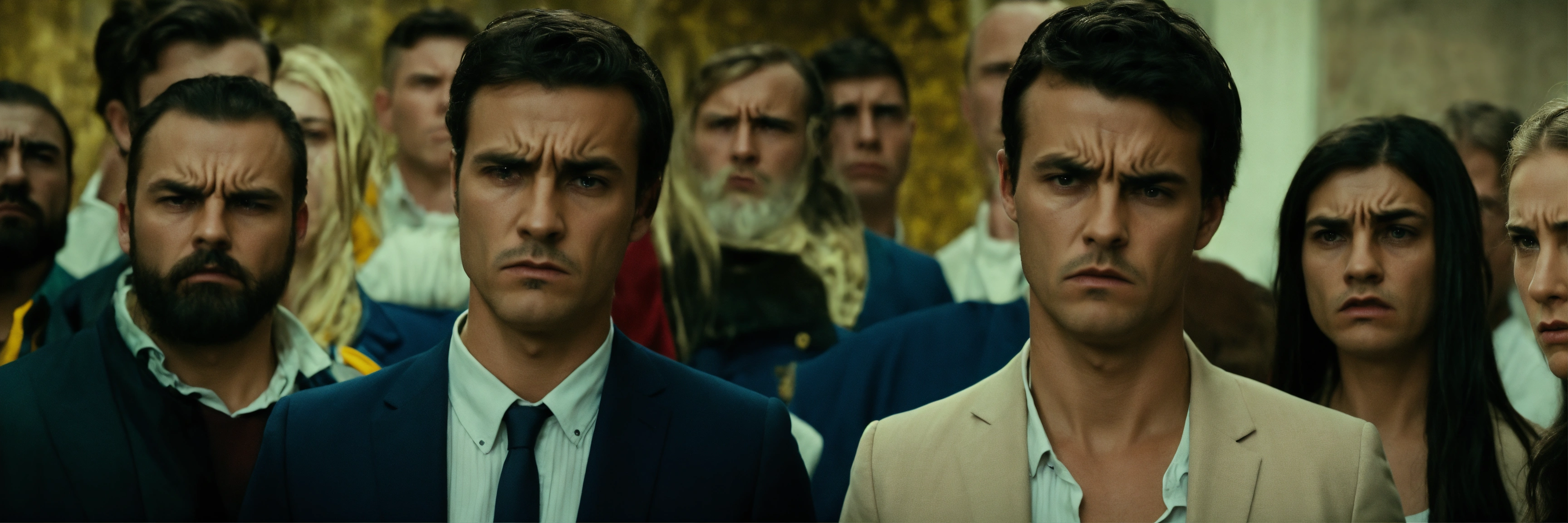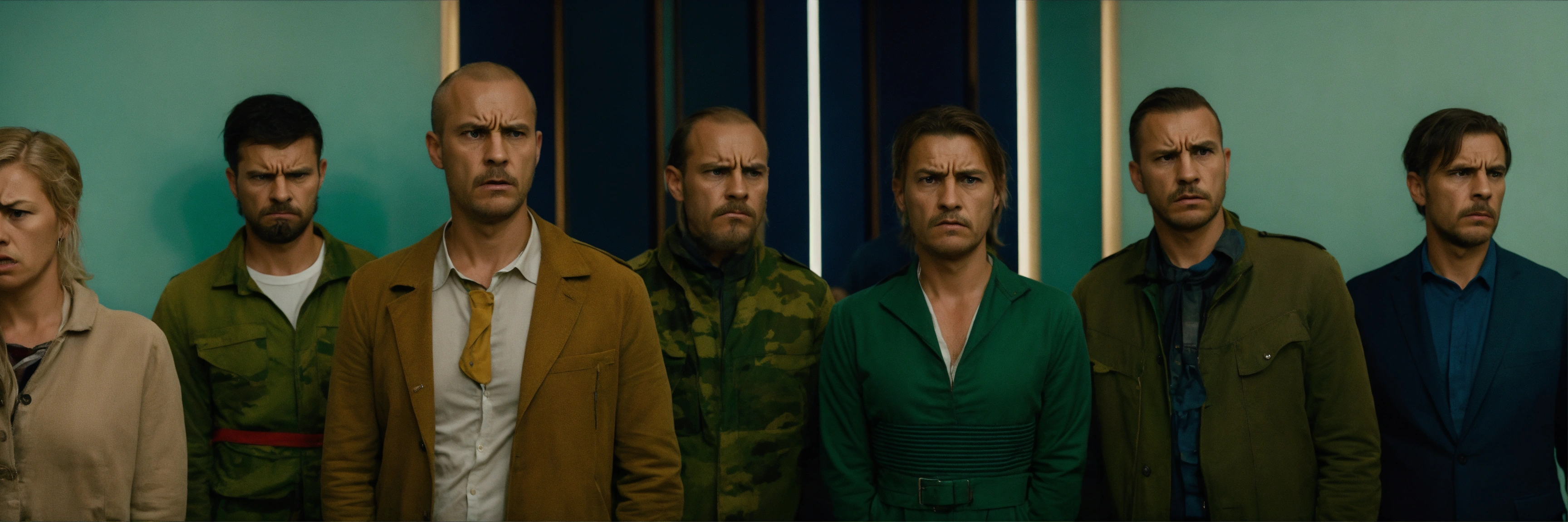 About 15 men and women of european appearance stand in a row very close to each other and look at the camera, their faces are disgruntled and angry