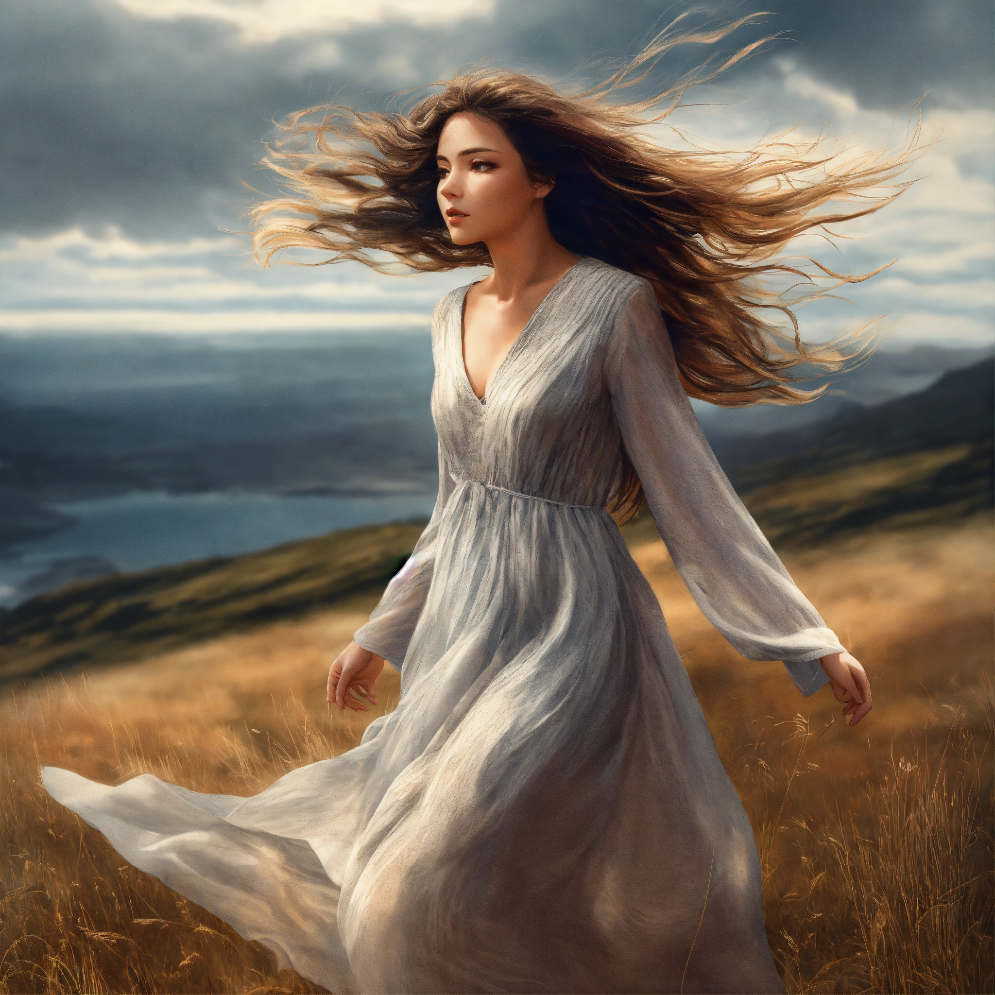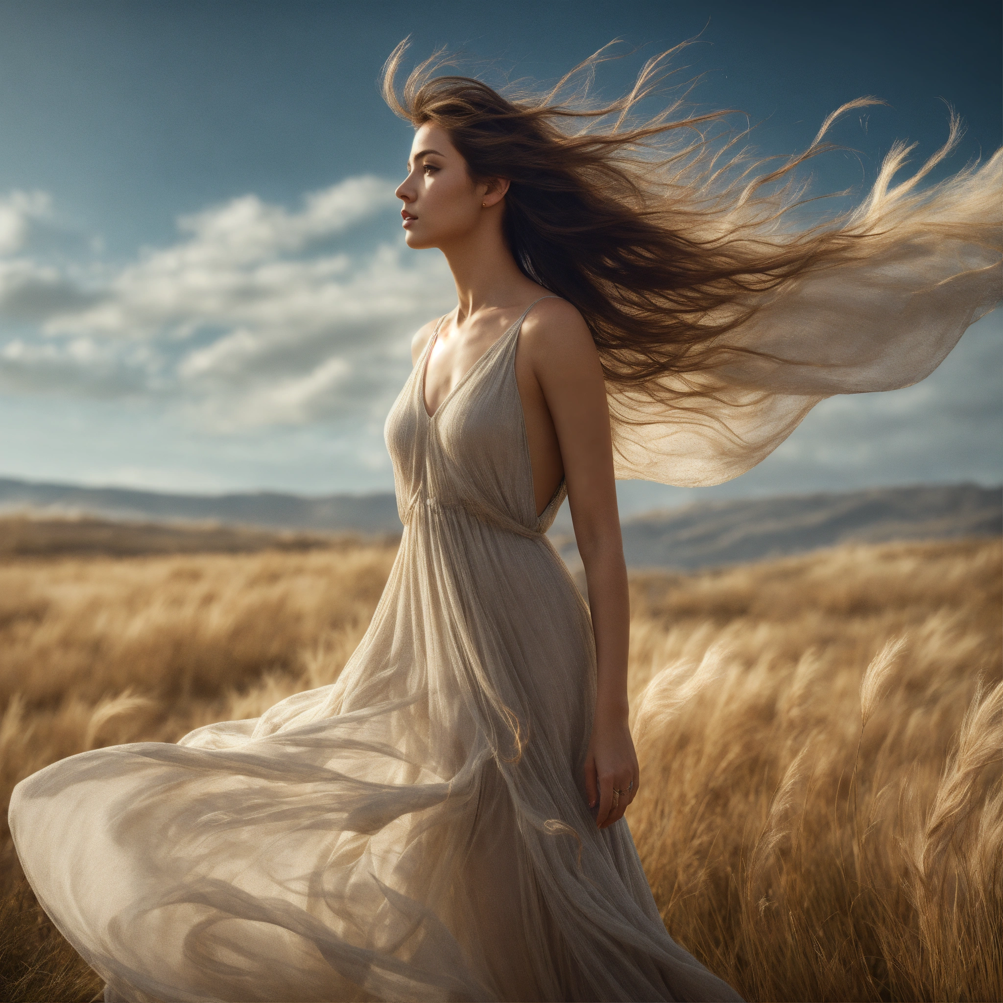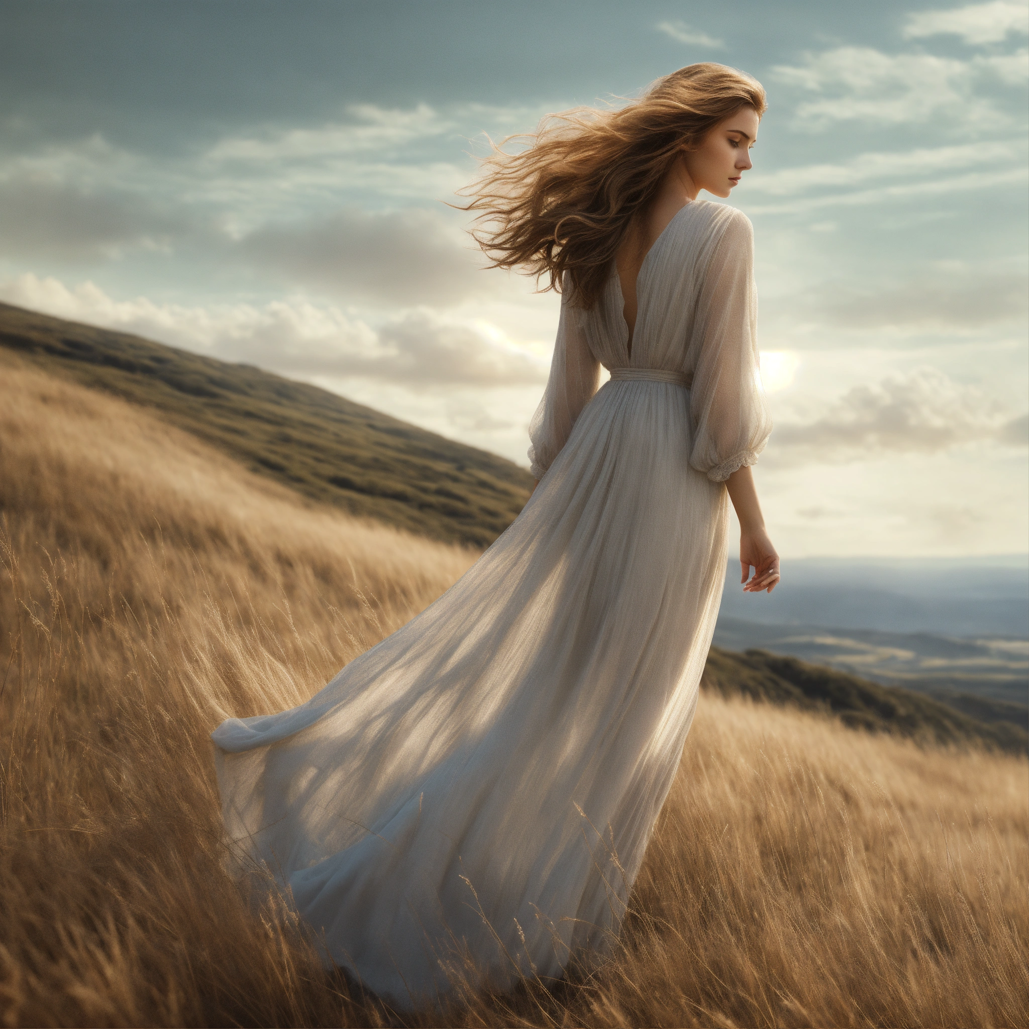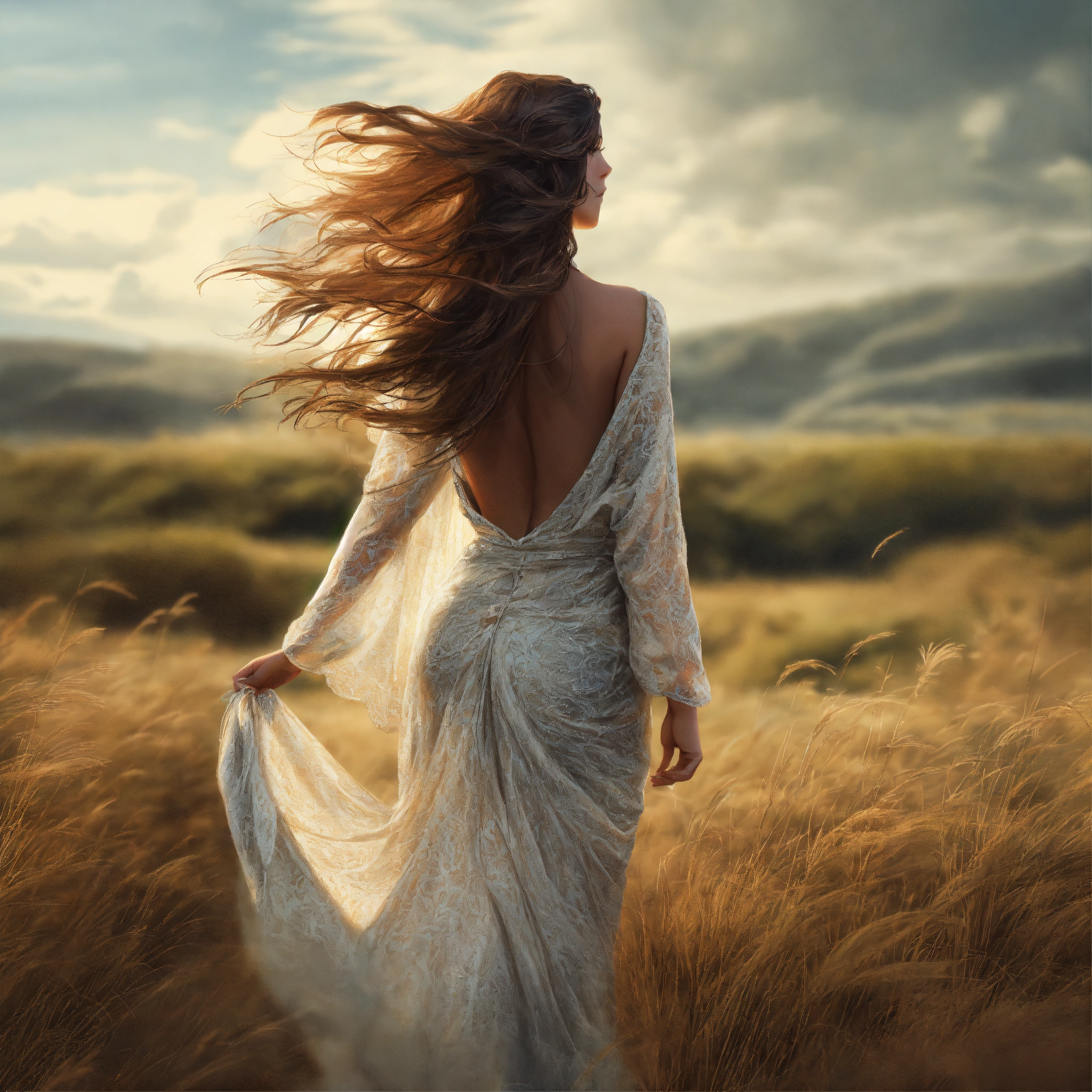 Woman face totally hidden by hair in the wind, full body, hyper realism, poetic, romantic, angelic long dress, realistic shading, realistic render, detailed textures, photorealistic, wide shot, landscape
