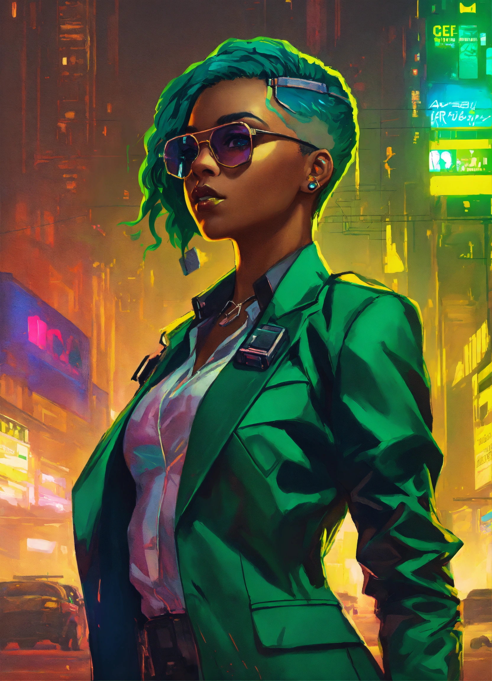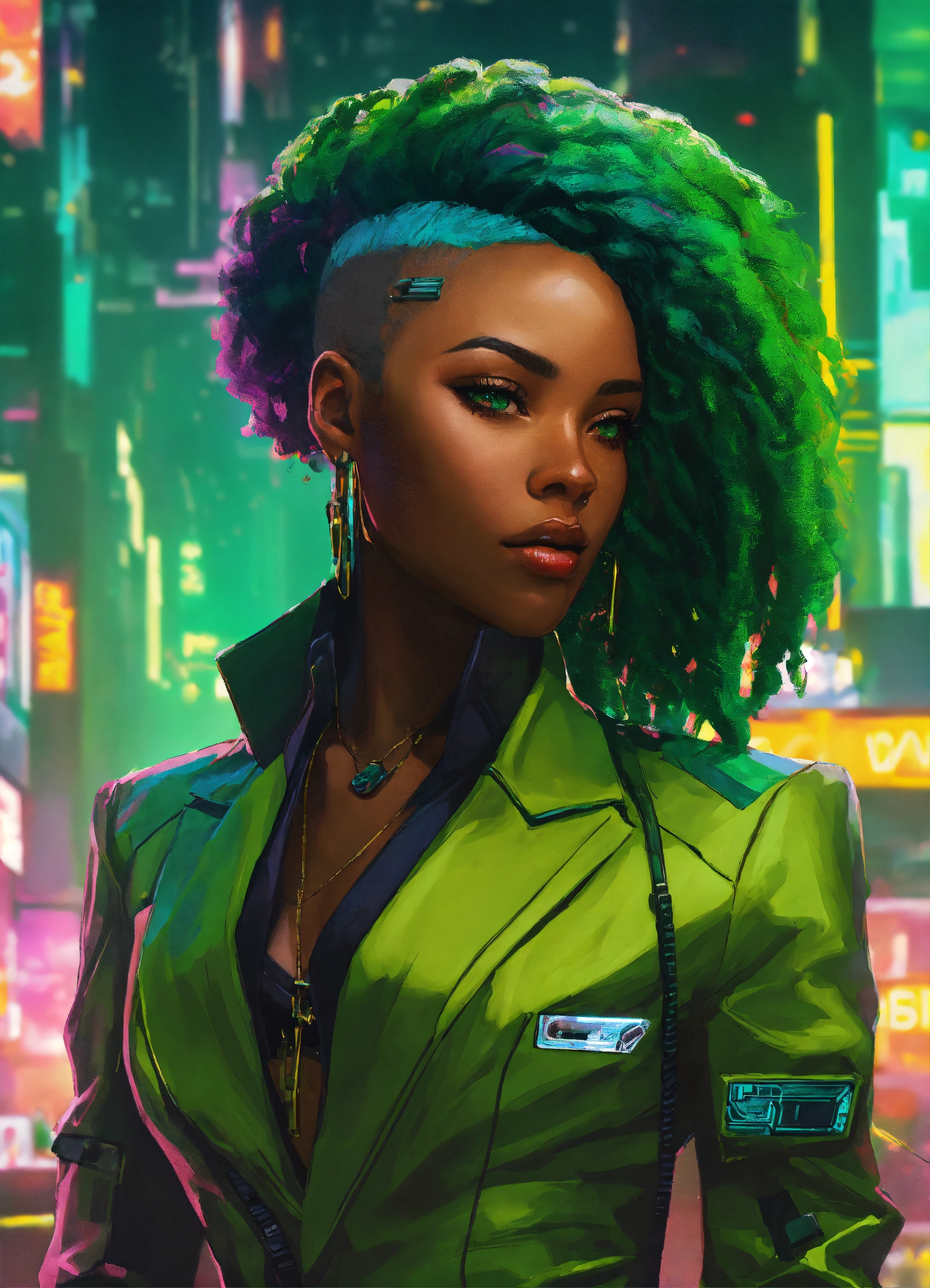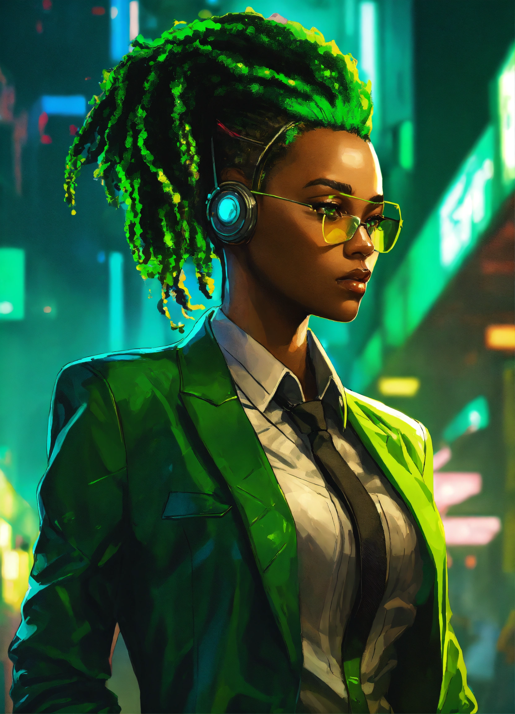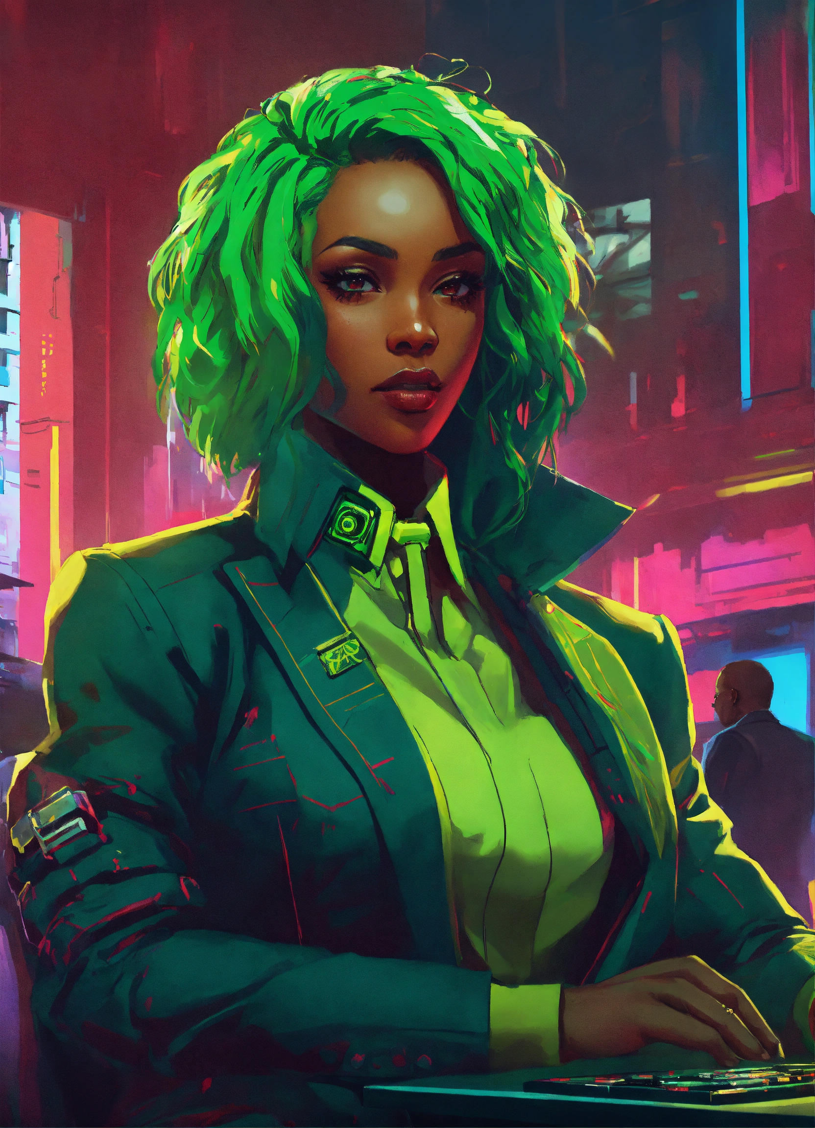 Cyberpunk african american woman in a business suit and green hair cyberpunk 2077 style art poster