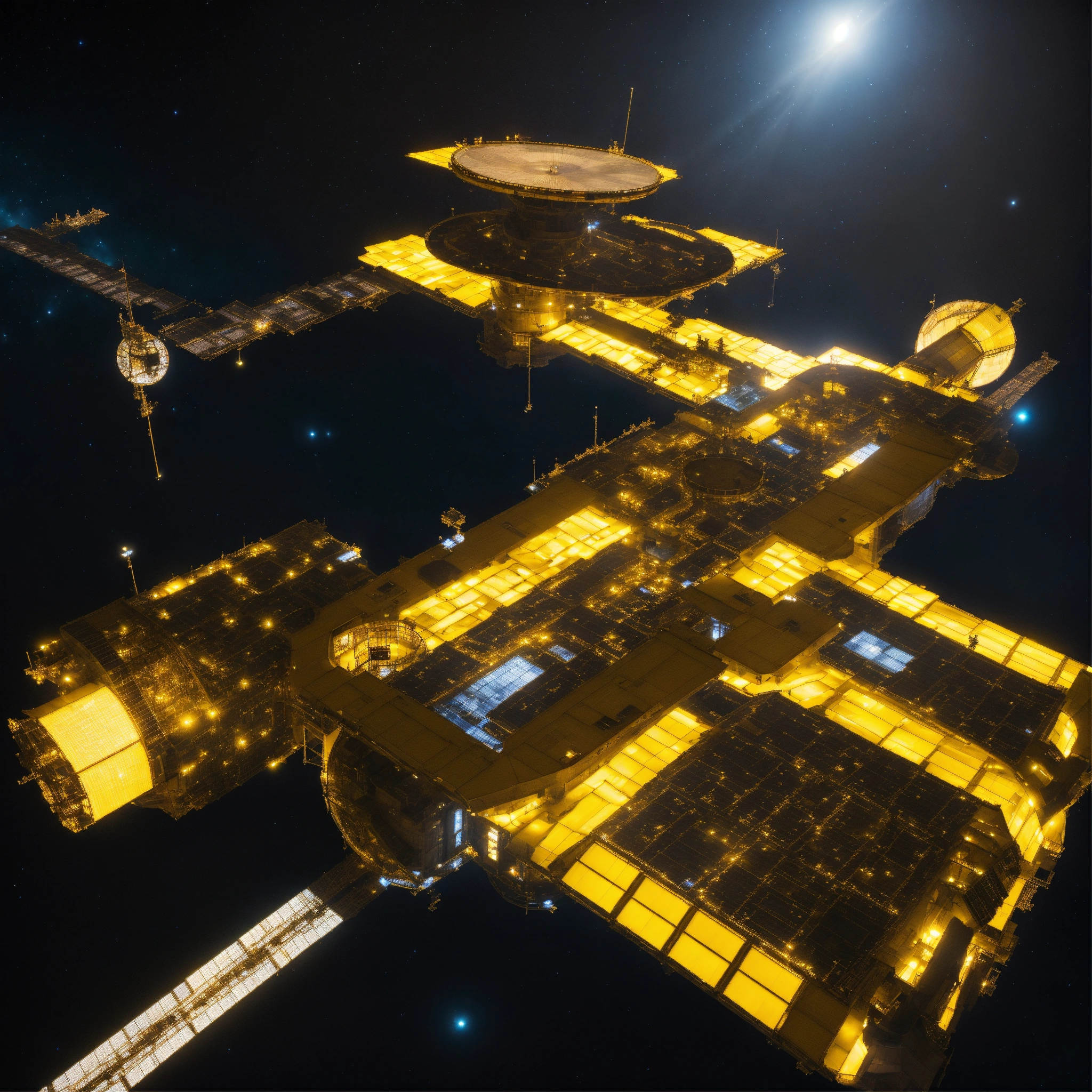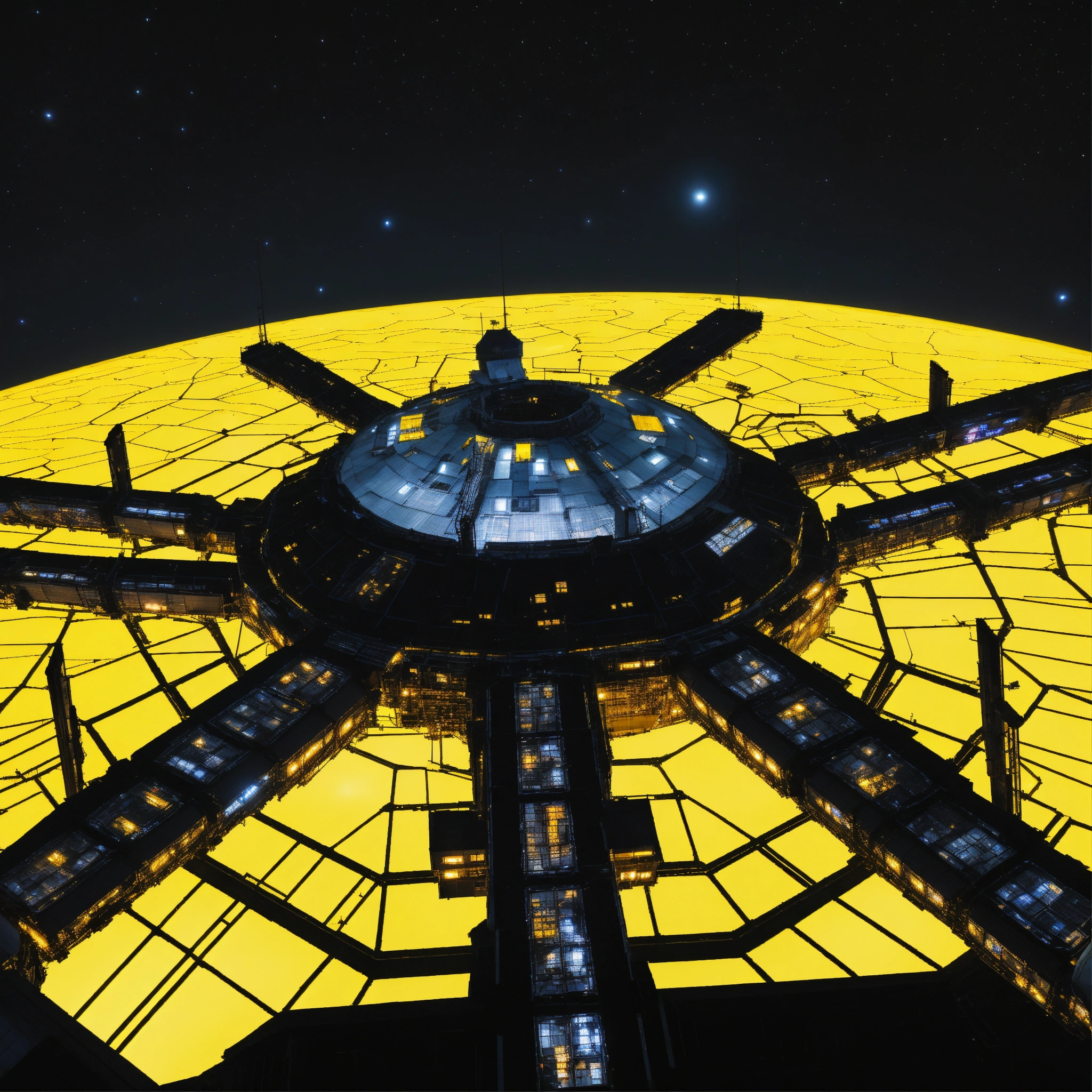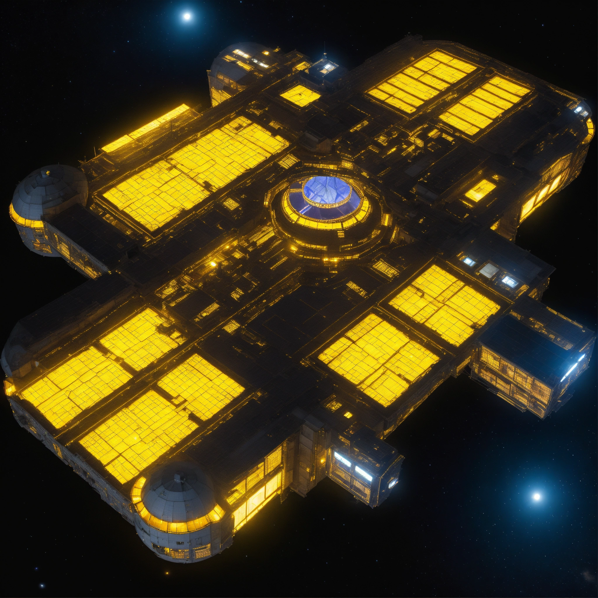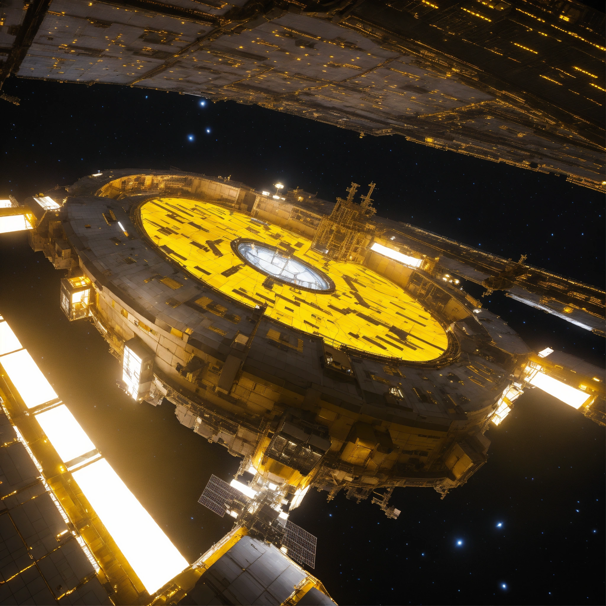 Entire giant yellow space station in dark space from top with glow and lights, many windows, background black, seen from far, let 80 pixels free from station to sides