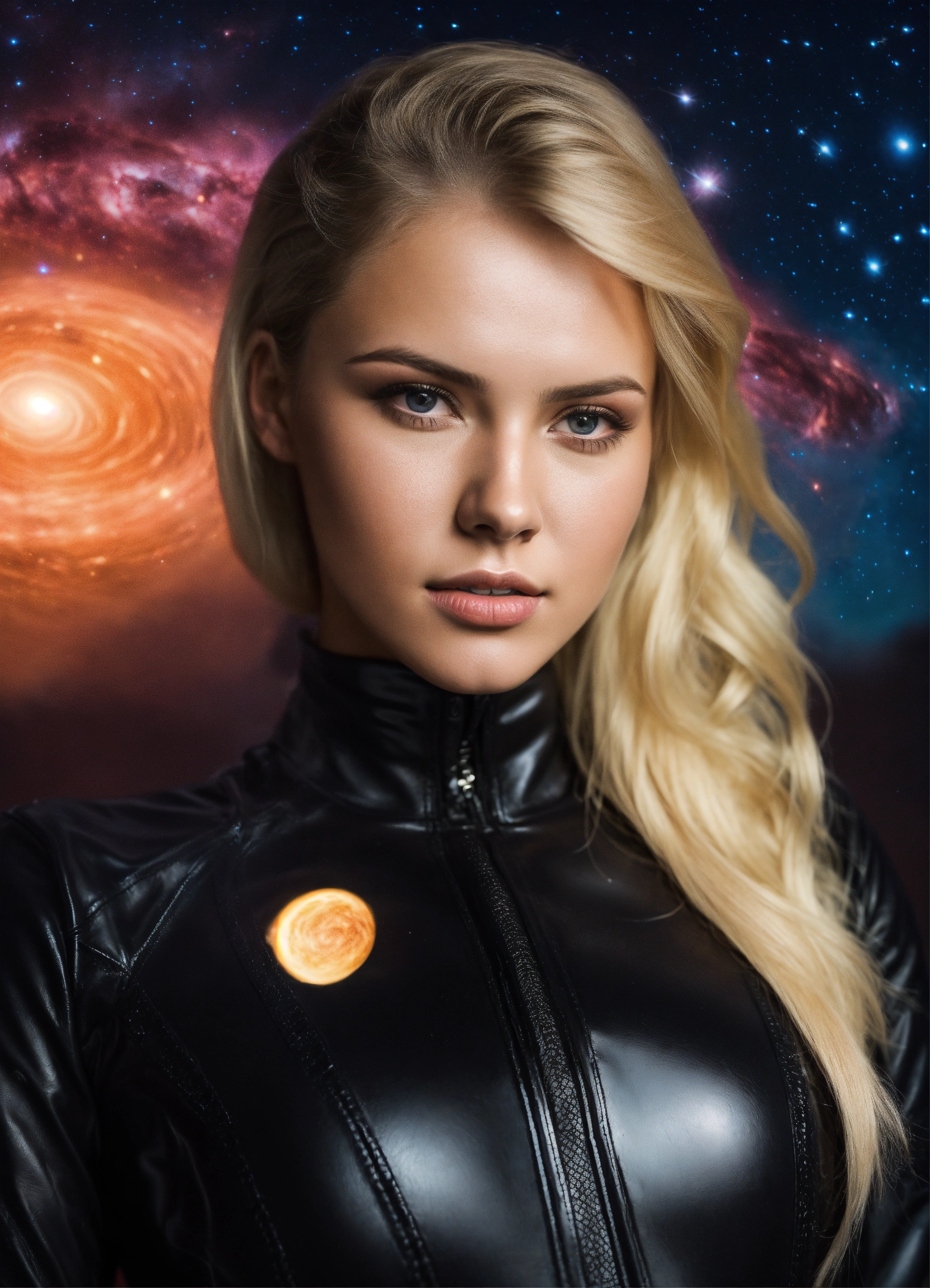 A real photo of a hot 25 year old blonde girl, she is wearing a black leather open catsuit on the front, in the sky is the galaxy visisble