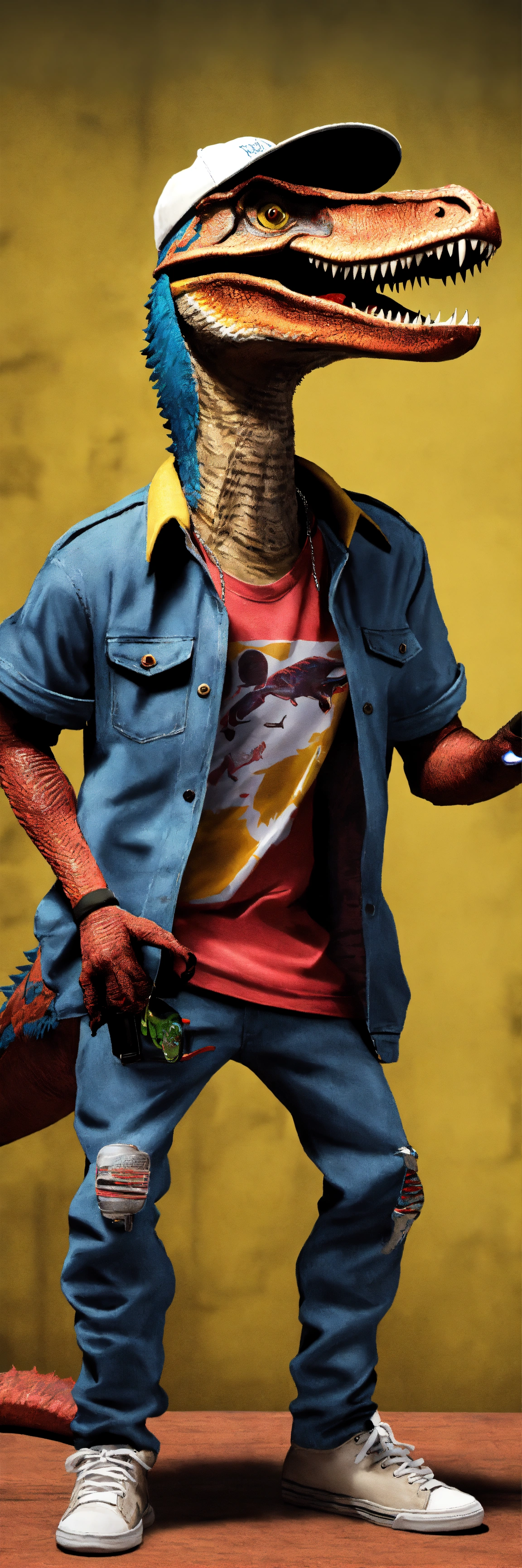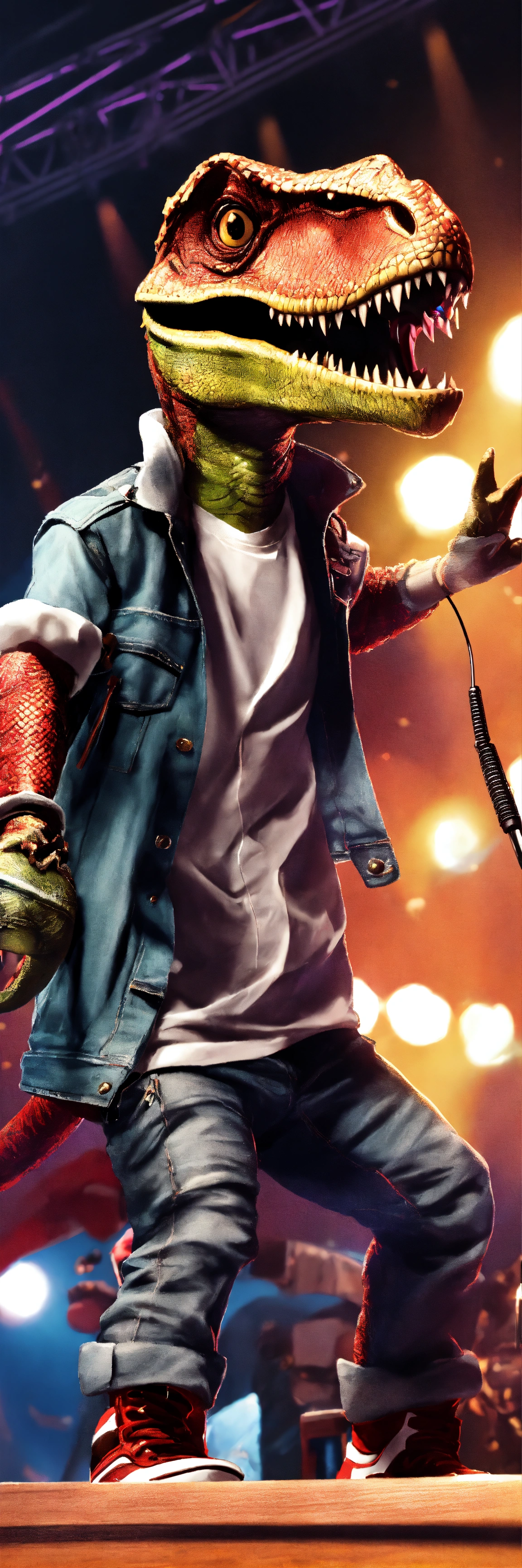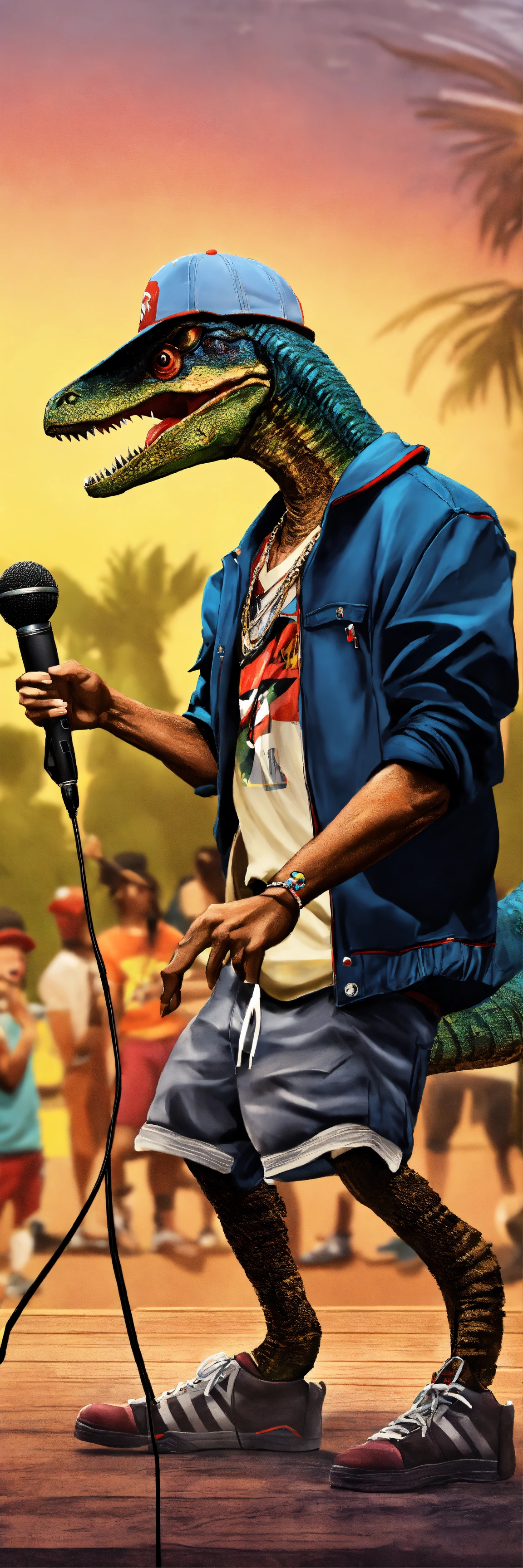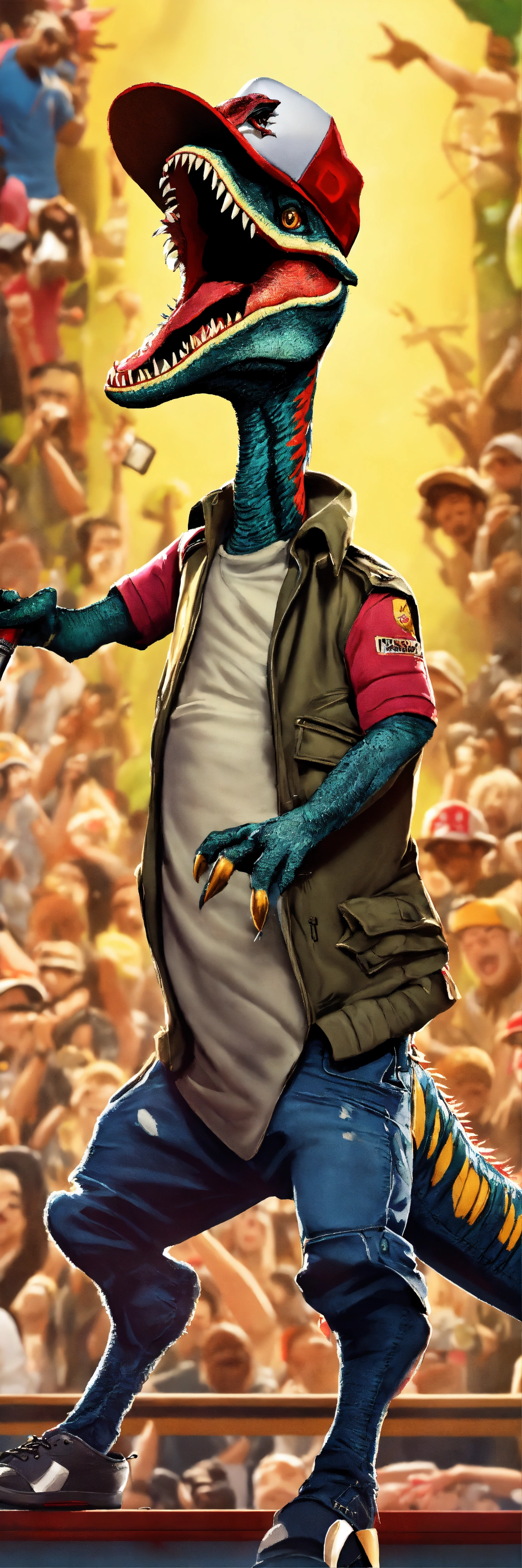 A velociraptor dinosaur is a rap star, extremely stylish in baggy jeans, expensive high tops, an oversized jersey, and a backwards cap. this dinosaur, a velociraptor, is holding a microphone, up on a stage, dropping dope rhymes as the crowd goes wild, celebrating his rapping prowess. everyone knows this velociraptor dinosaur has the freshest flow.