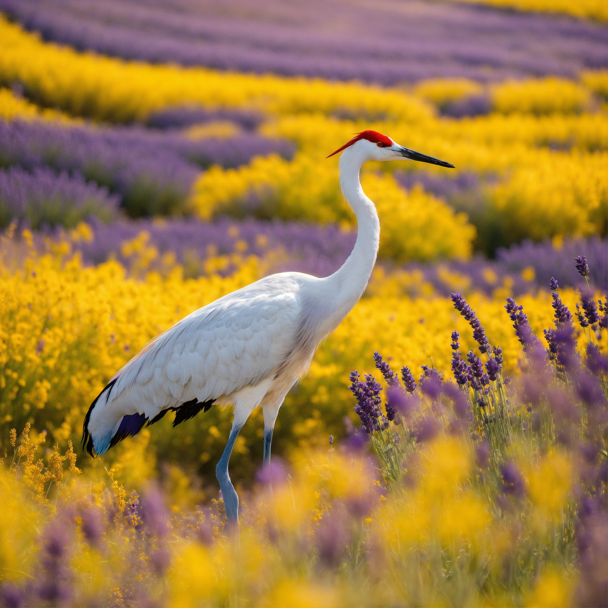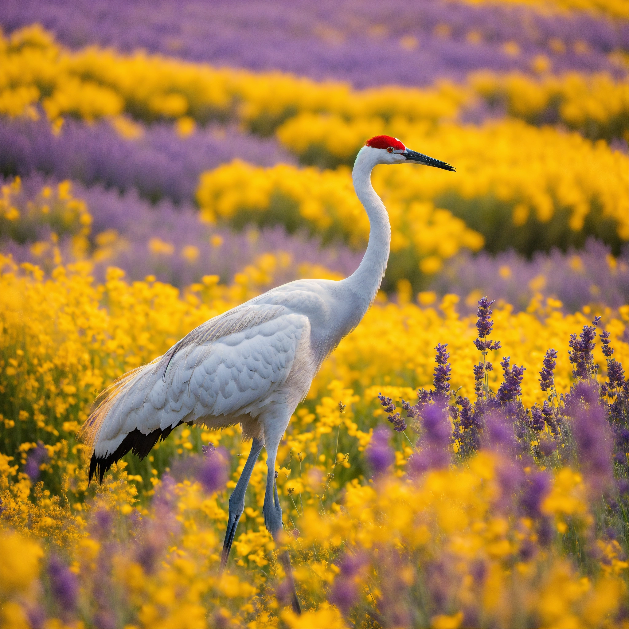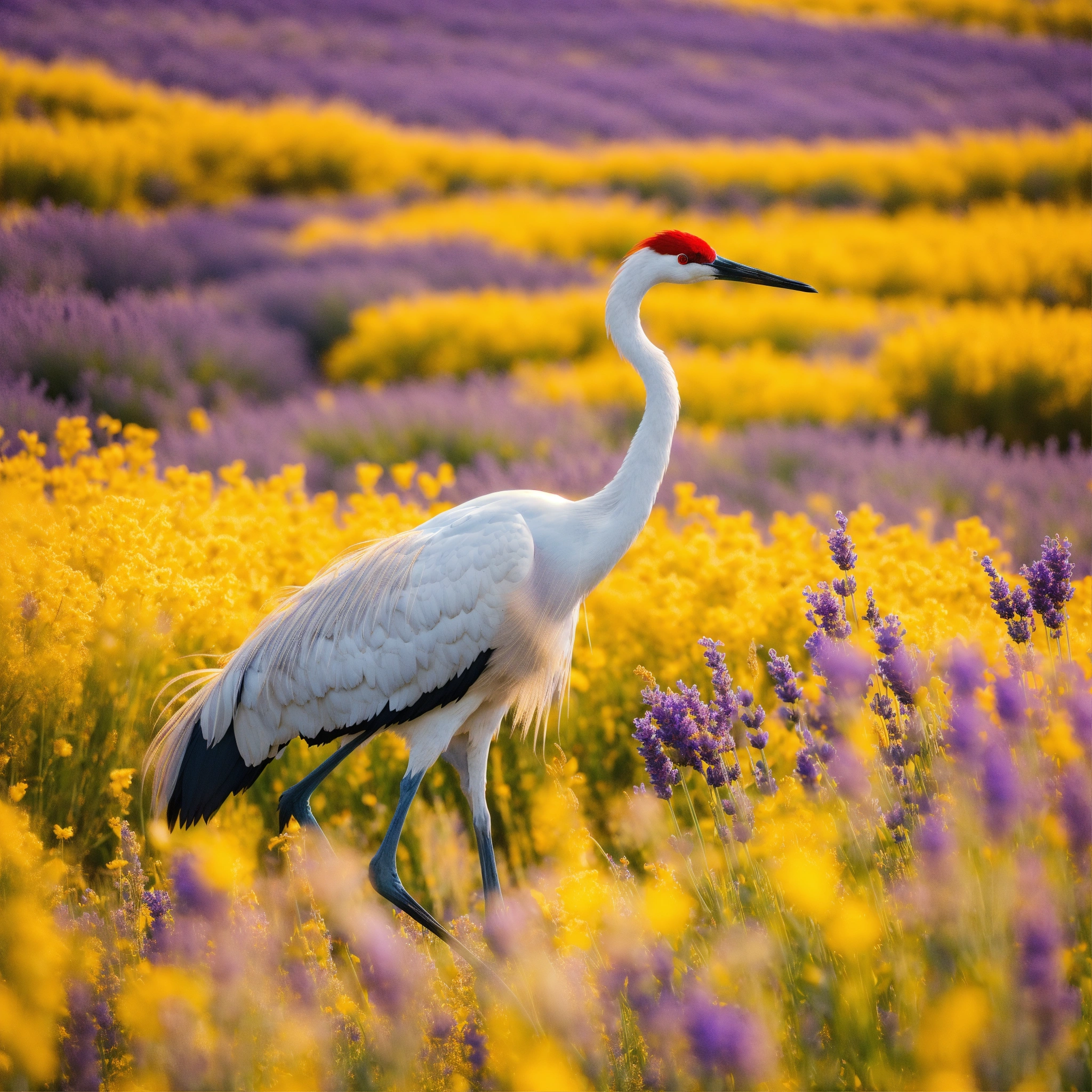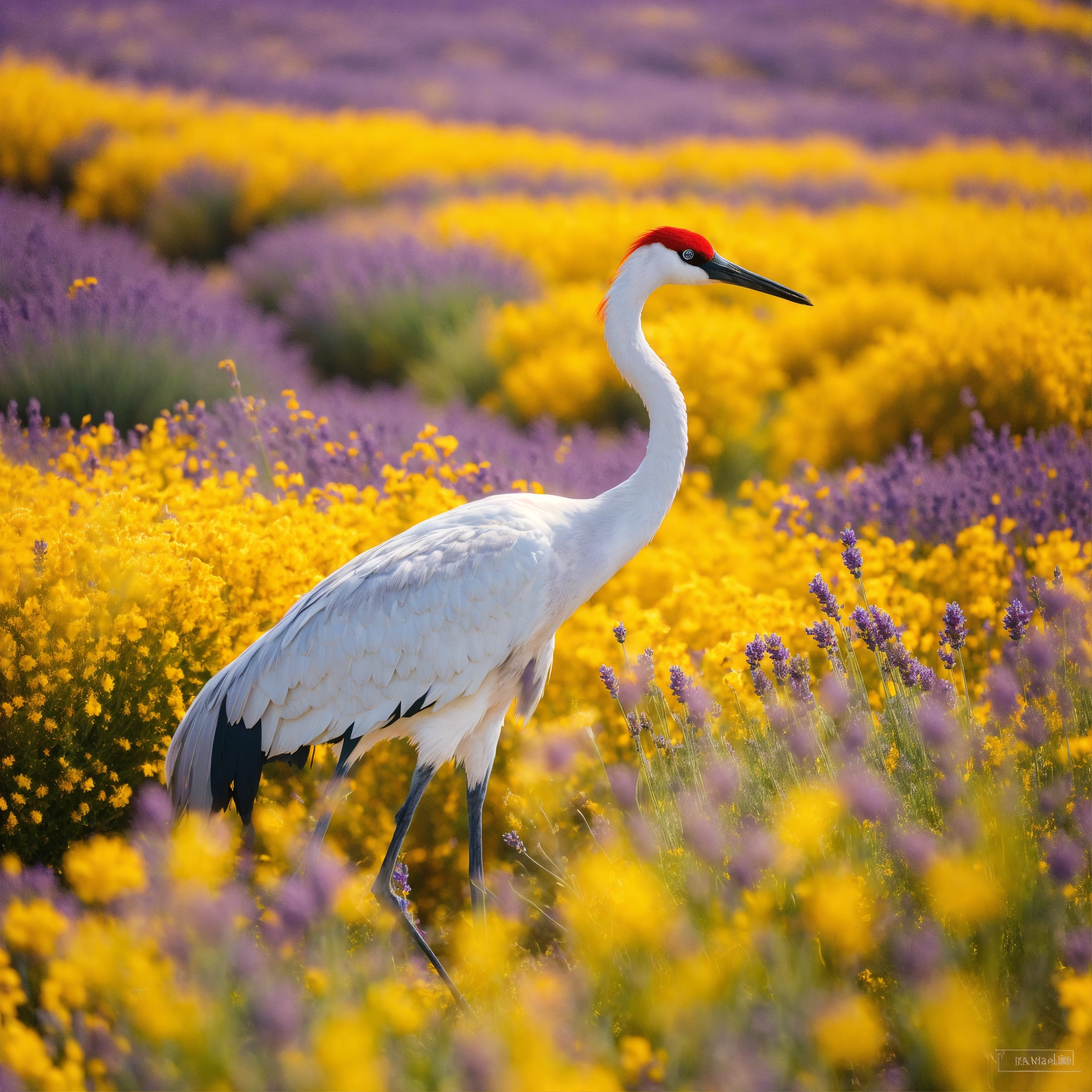 A white noble crane(red head) in the center of vast yellow-lavender field