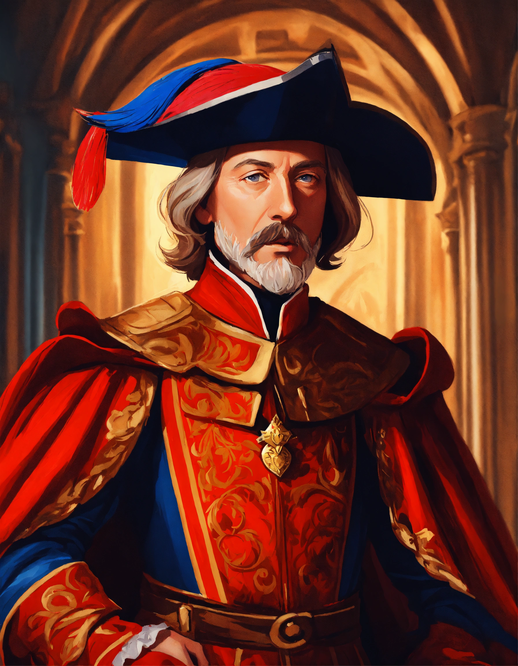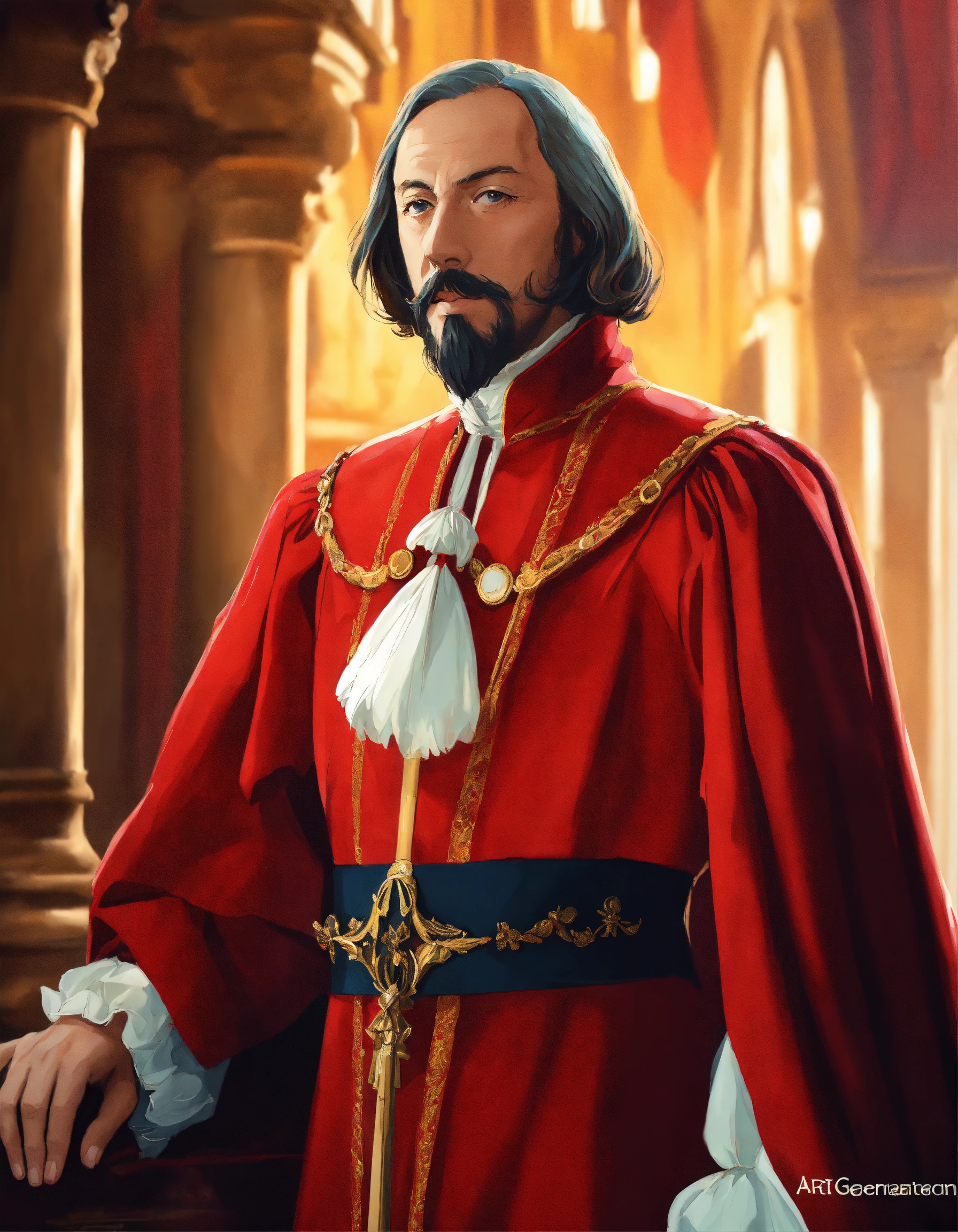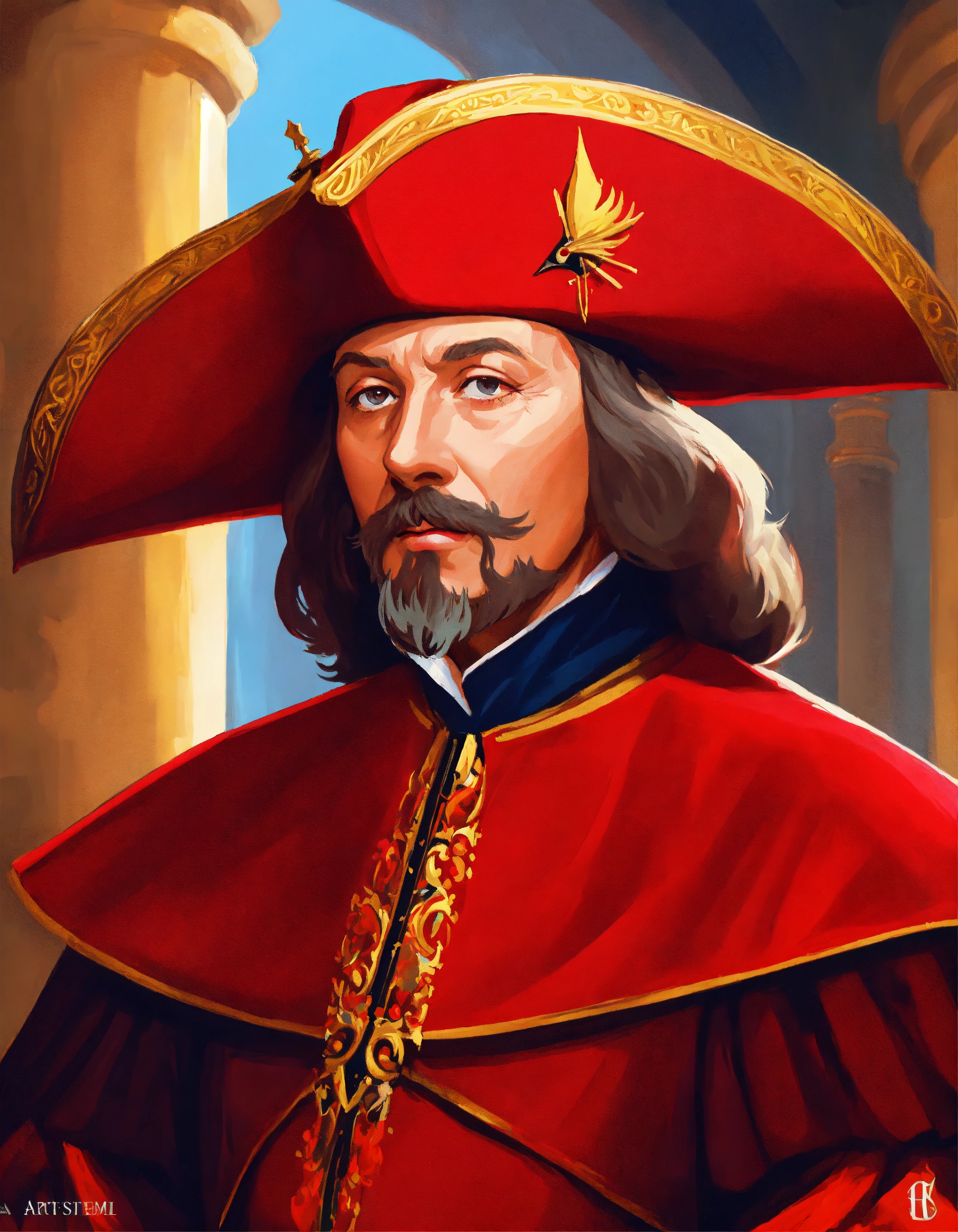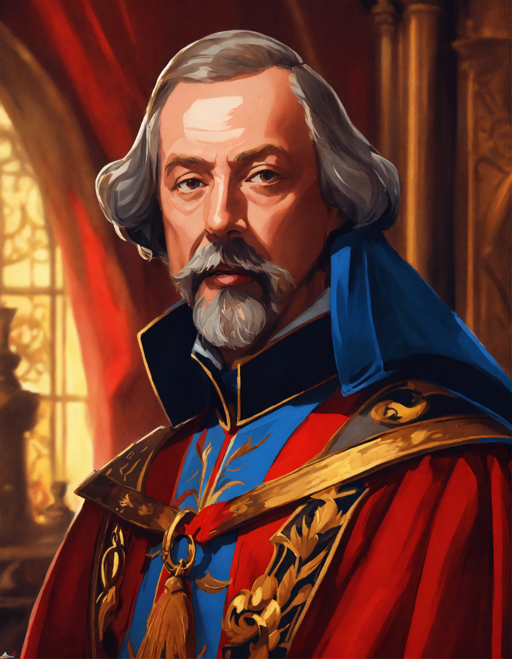 Cardinal richelieu, from the movie the three musketeers, cartoon oil paint, 2d illustration style, sharp focus, bright color, digital paint character design, trending on artstation, simple lines, art by artgem