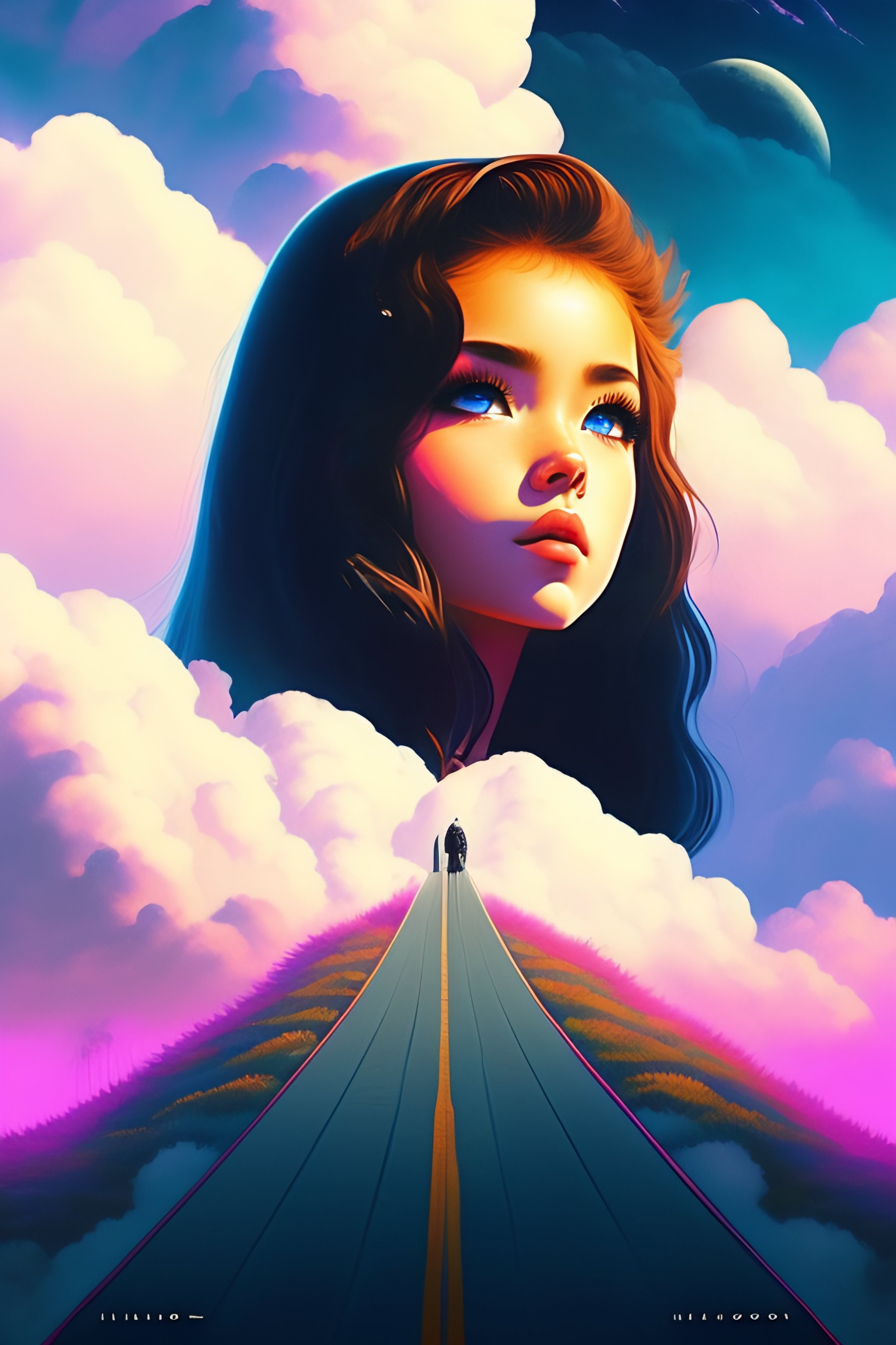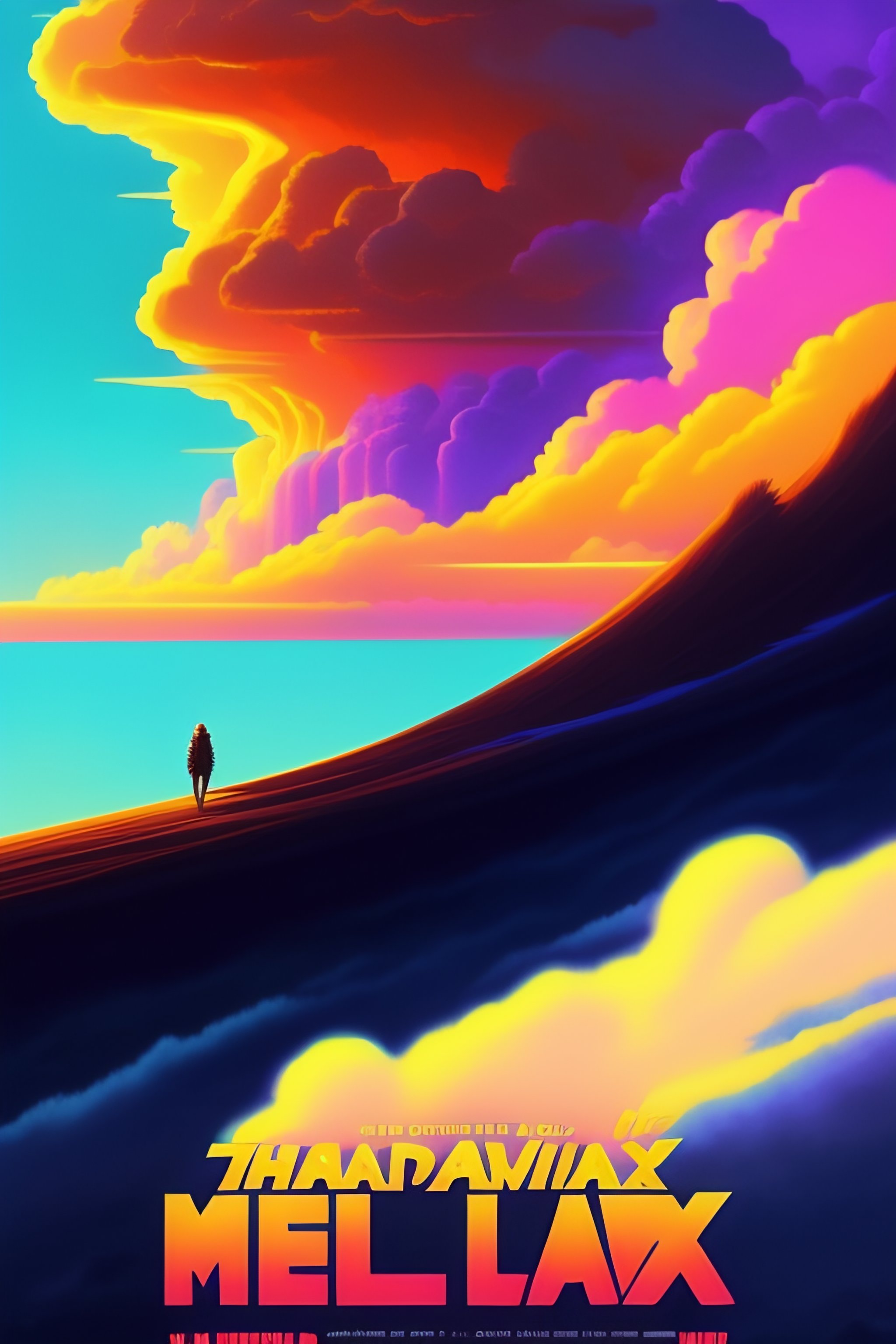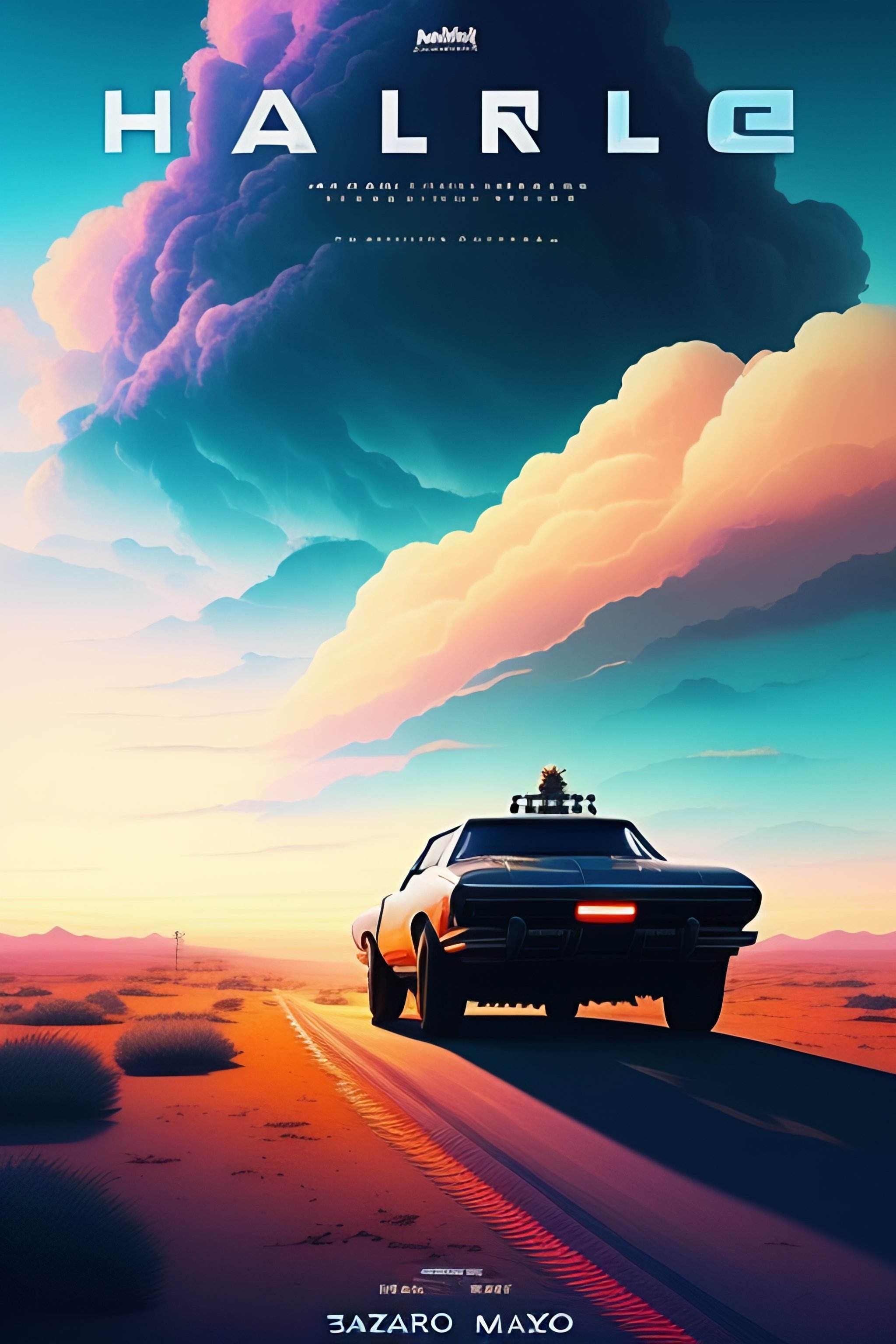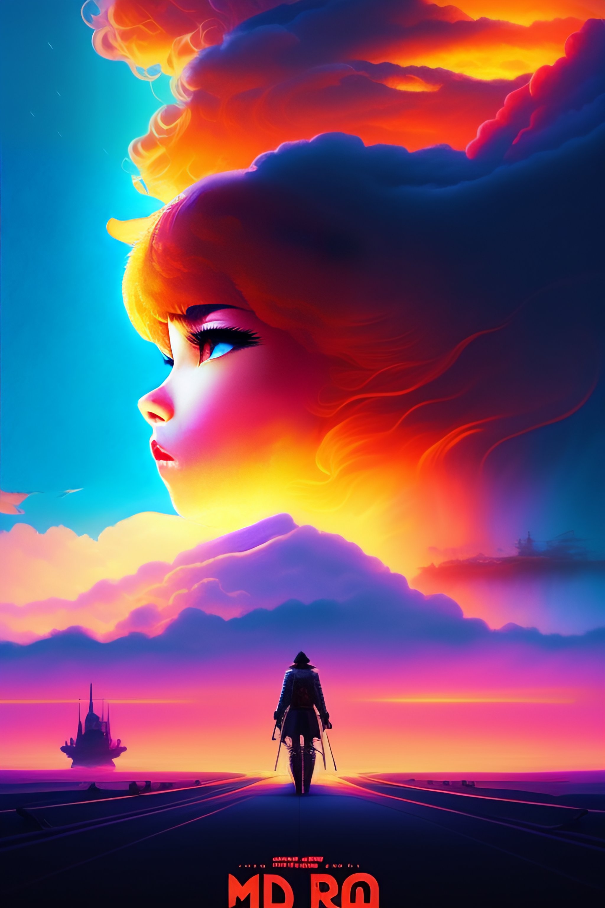 A cloud-filled movie poster of an endless path across a dark thunderous synthwave grid in the mad max hellscape universe, by studio ghibli and hayao miyazaki, rule of thirds