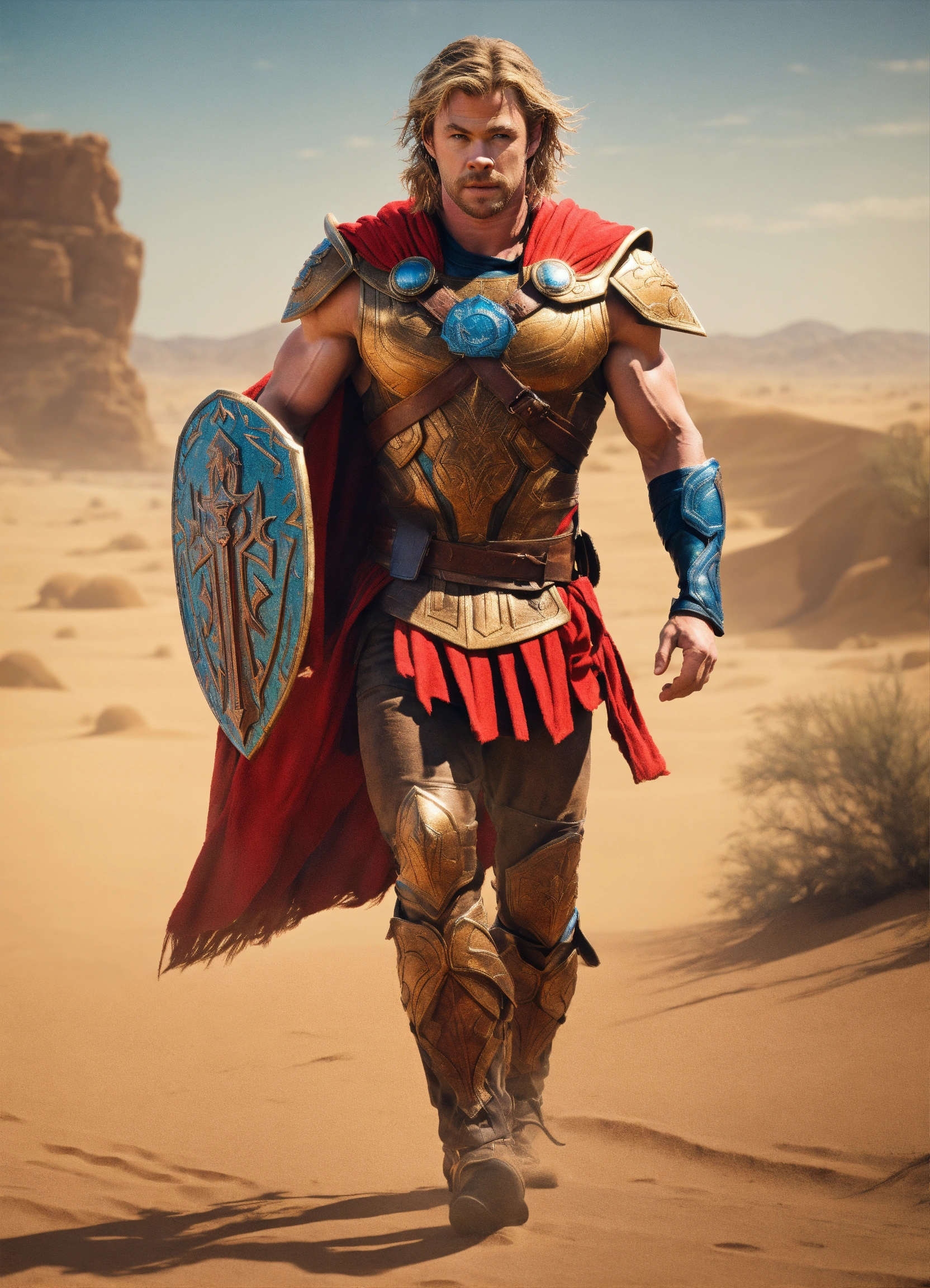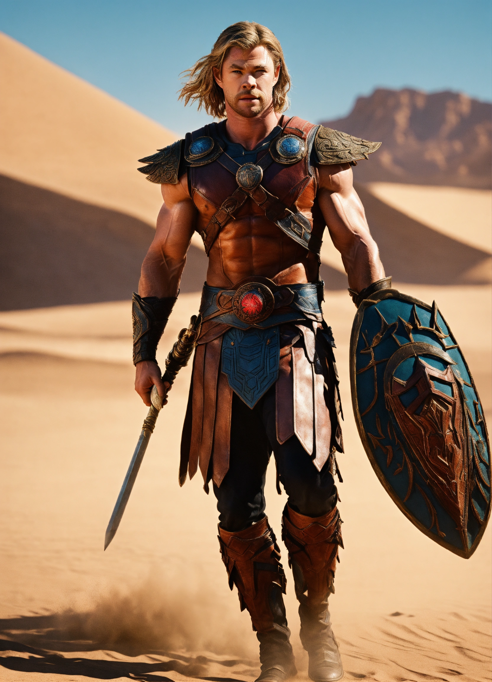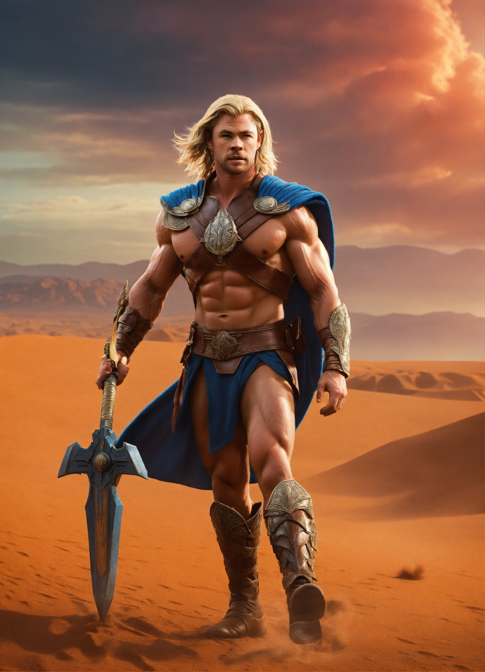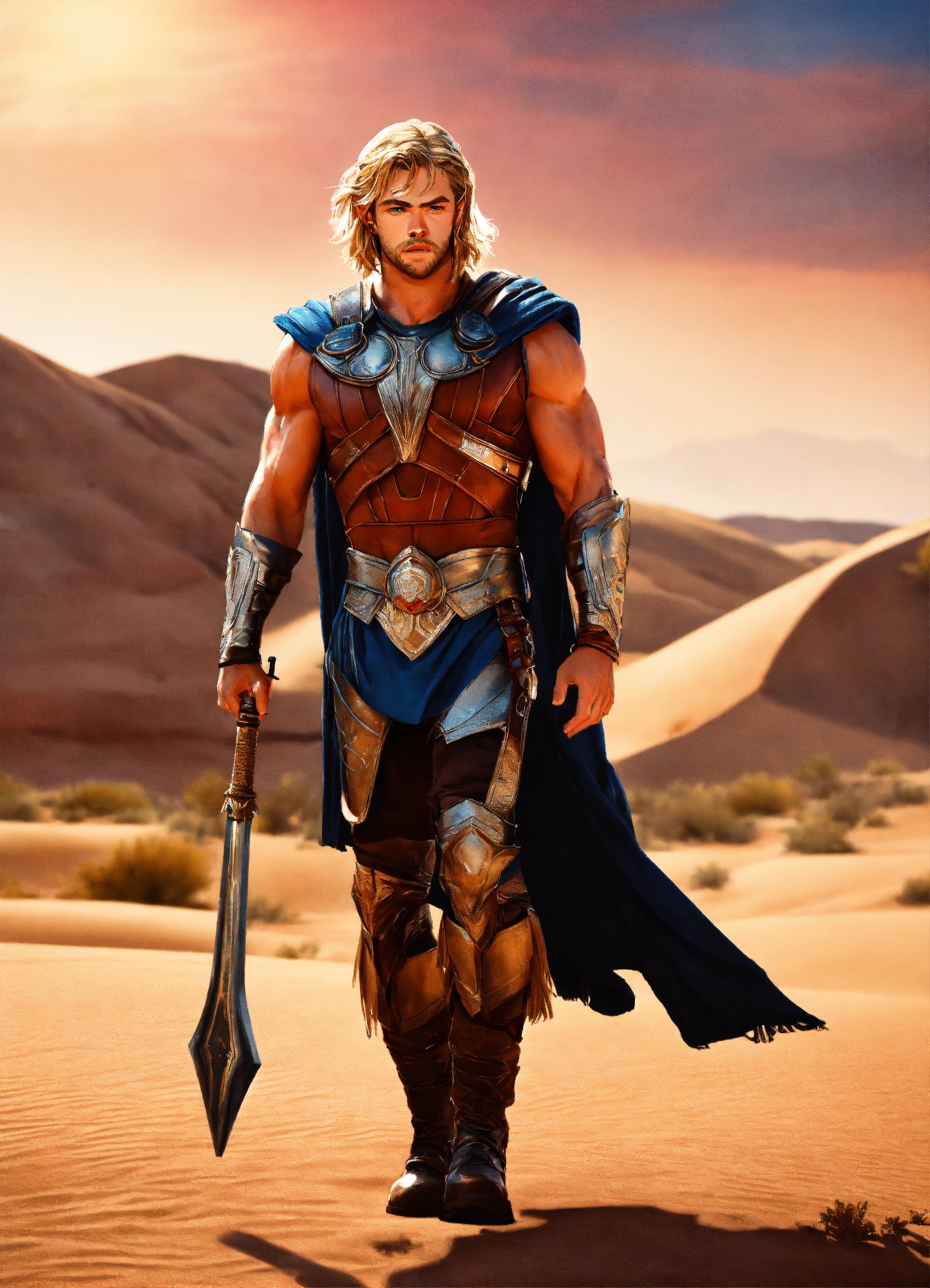 Chris hemsworth with bobbed blonde hair, dressed like he-man of masters of the universe, full body, walking in a desert, 8k resolution, photorealistic, hard light photo, hyper detailed, intricately detailed
