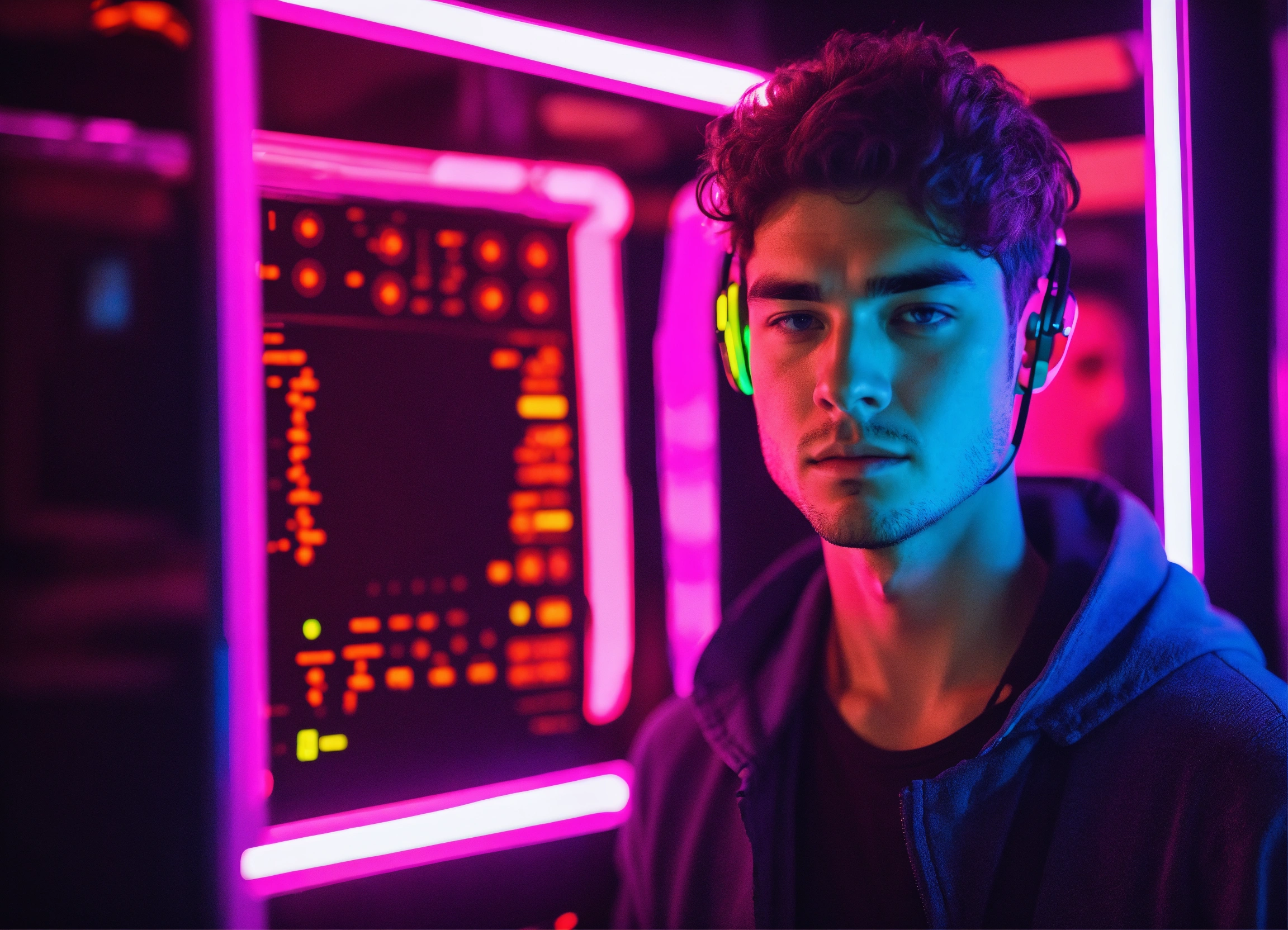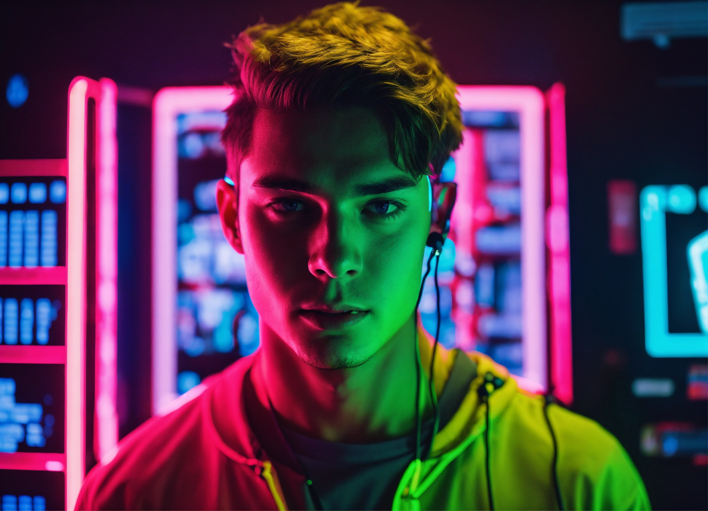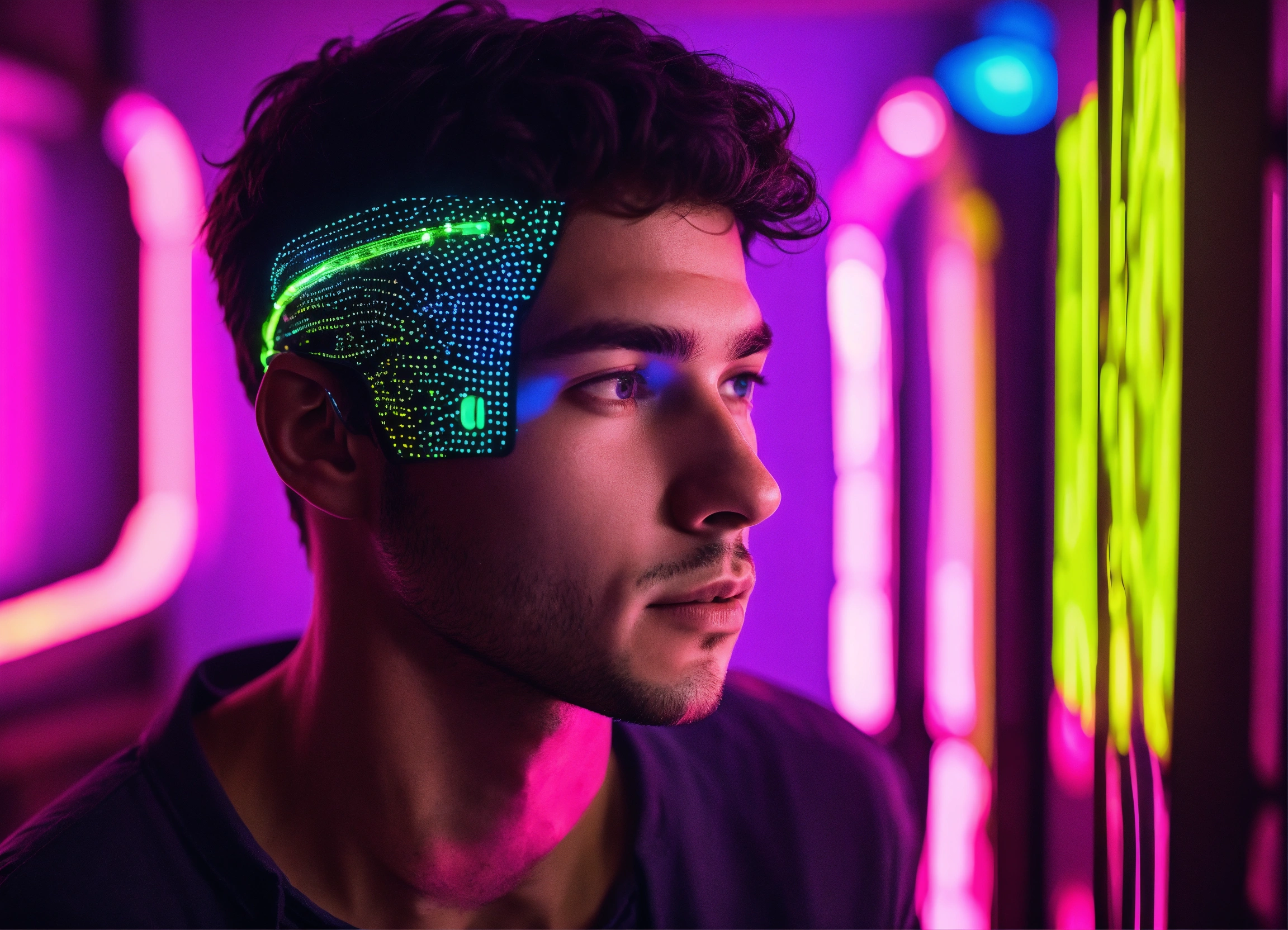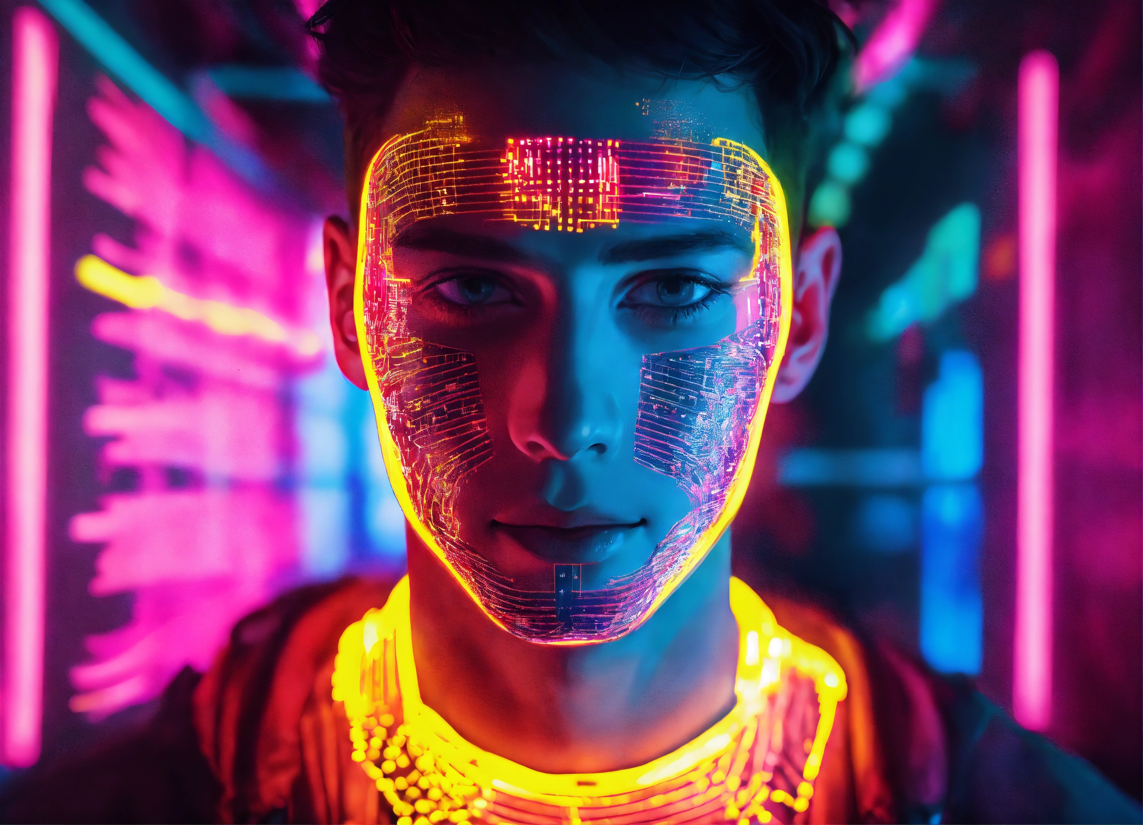 The face of a young man, being scanned by a system in a neon vibe to assess whether he is fit to perform any task