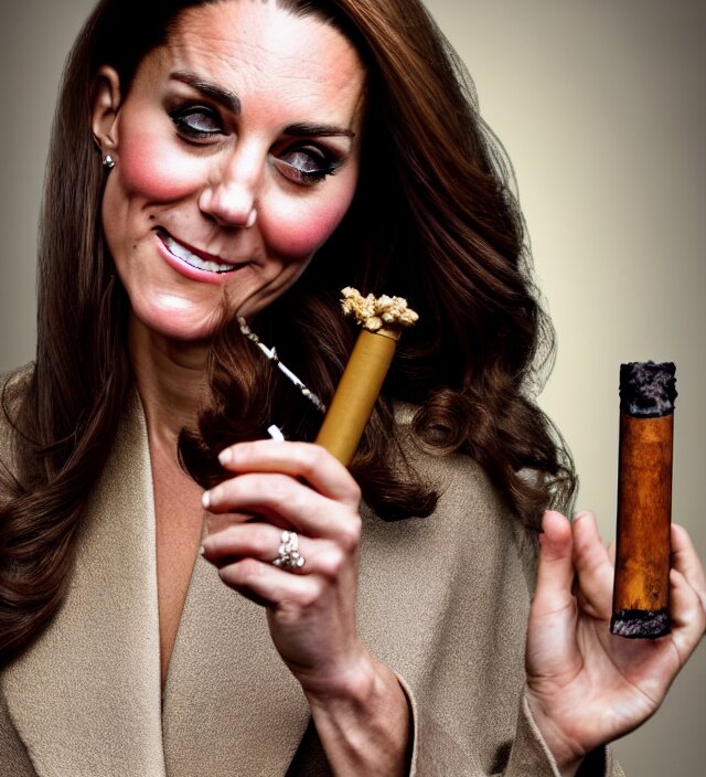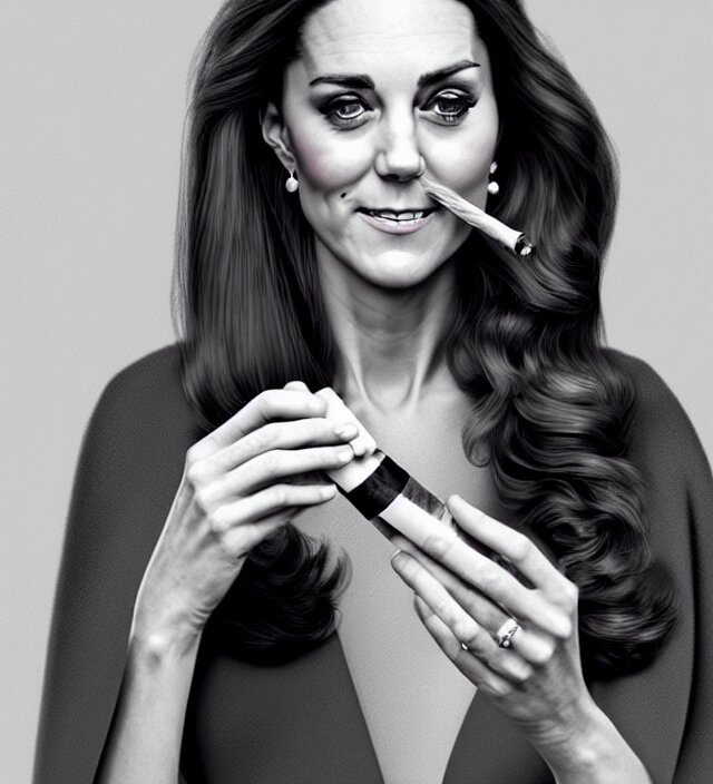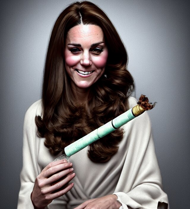 Photo of a gorgeous young kate middleton smoking a bong in the style of stefan kostic and david cronenberg, realistic, sharp focus, 8 k high definition, insanely detailed, intricate, chiaroscuro, elegant, wearing a ripped mantle and robe, face by wlop, perfect faces, symmetrical face, extremely high details, hypnotic eyes, realistic, fantasy art, solo, masterpiece, art by hermann nitsch, zdzislaw beksinski, dariusz zawadzki, giger, dragan bibin and esao andrews and gaston bussiere and alphonse mucha and art stanley lau and artgerm