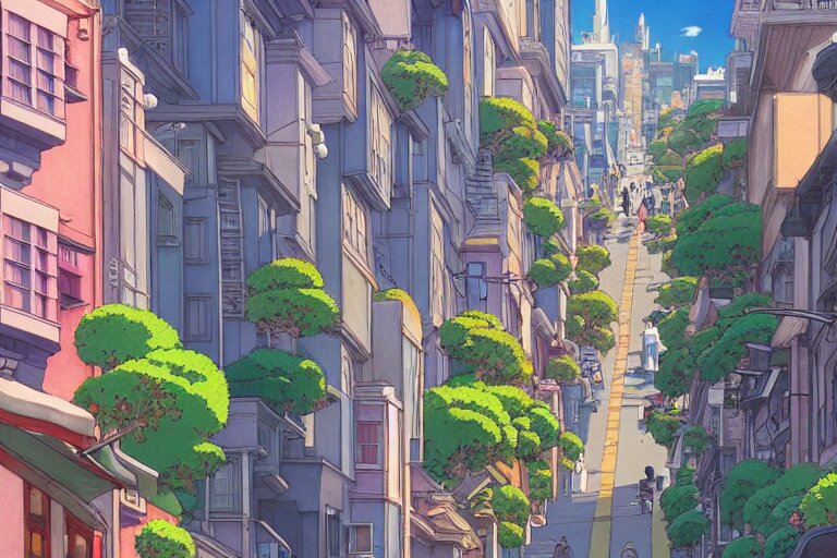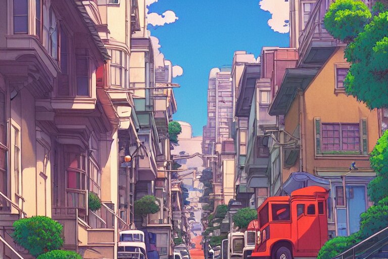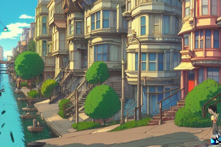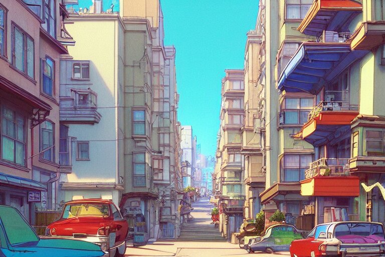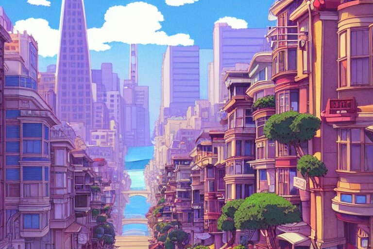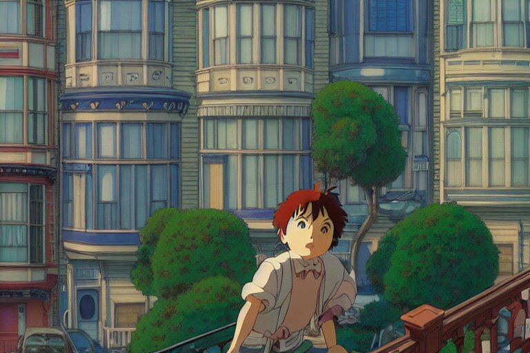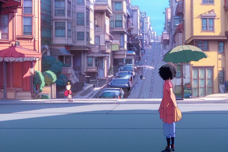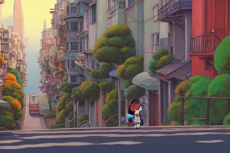 Still from studio ghibli movie'alone in san francisco'; 8 k ; very detailed, focused, colorful, antoine pierre mongin, trending on artstation ;