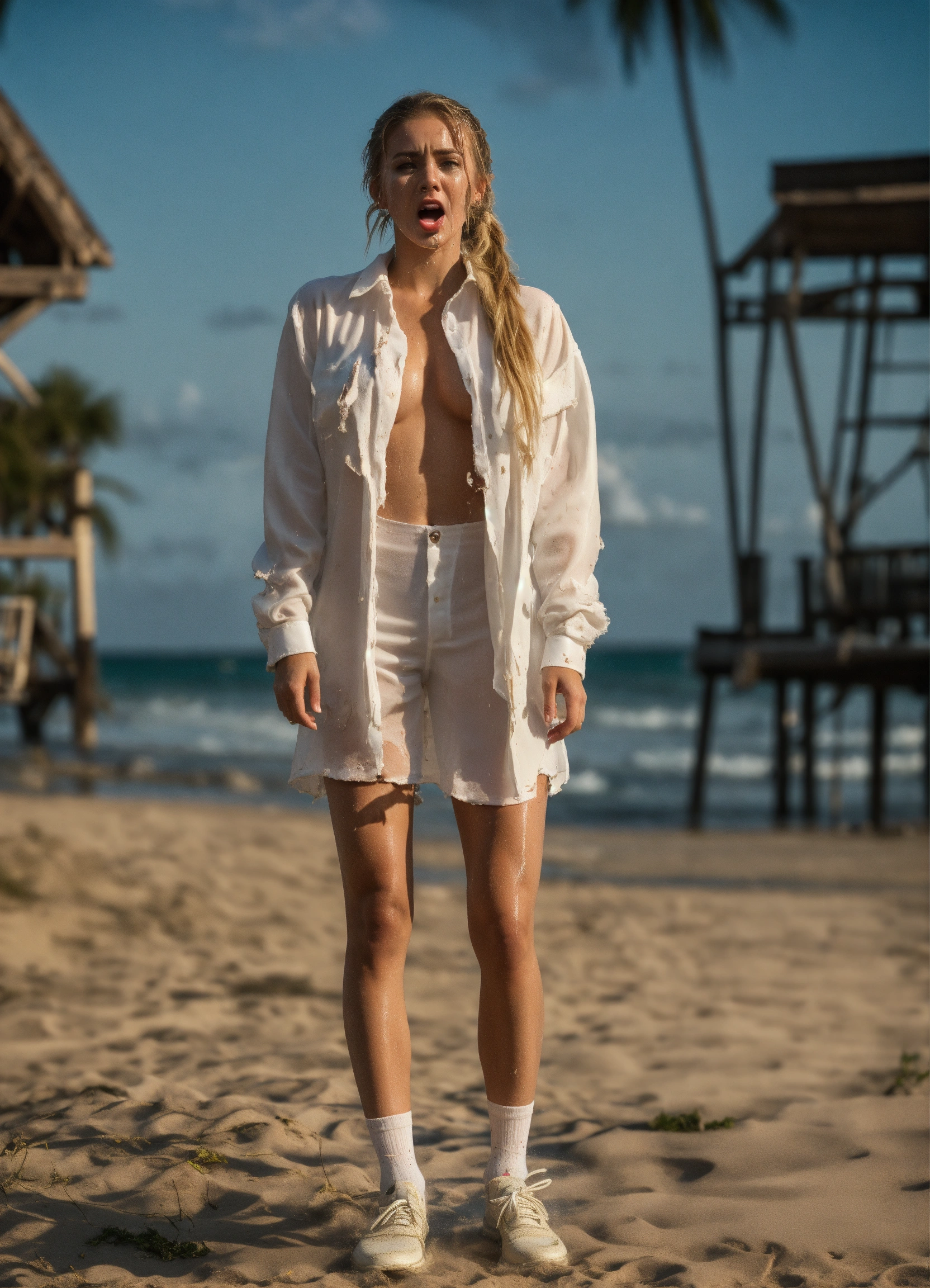Full body, standing, gag, swimwear, shiny, wet messy long hair, prepubescent, unbuttoned tattered torn dress shirt, tube socks, crying, screaming, crying, distressed, three gorgeous young, ponytail blonde hair, white woman, pale skin, fitness influencer, highly detailed, dramatic shoot, sharp focus, 4k uhd, cinematic lighting, relaxed, beach