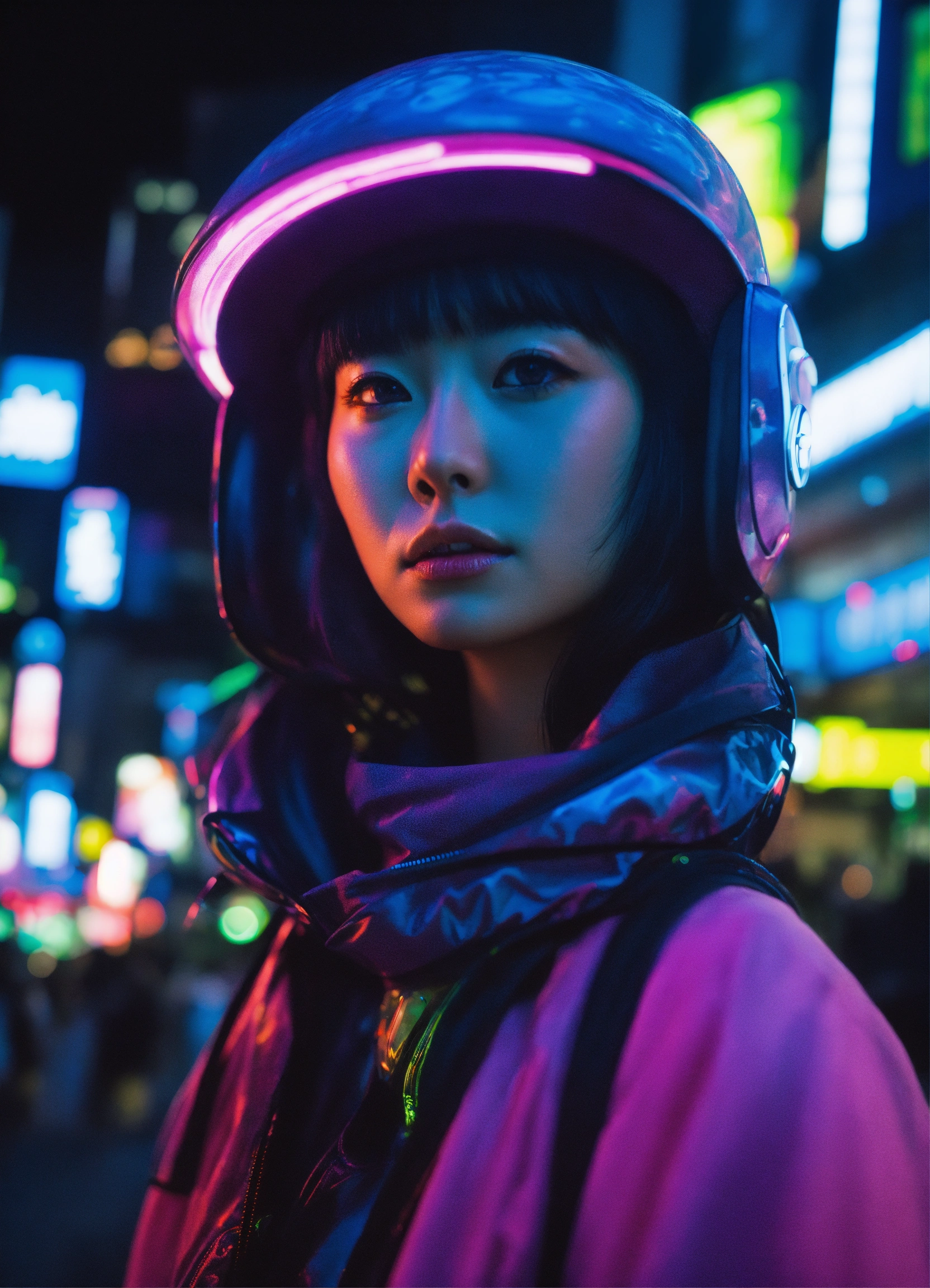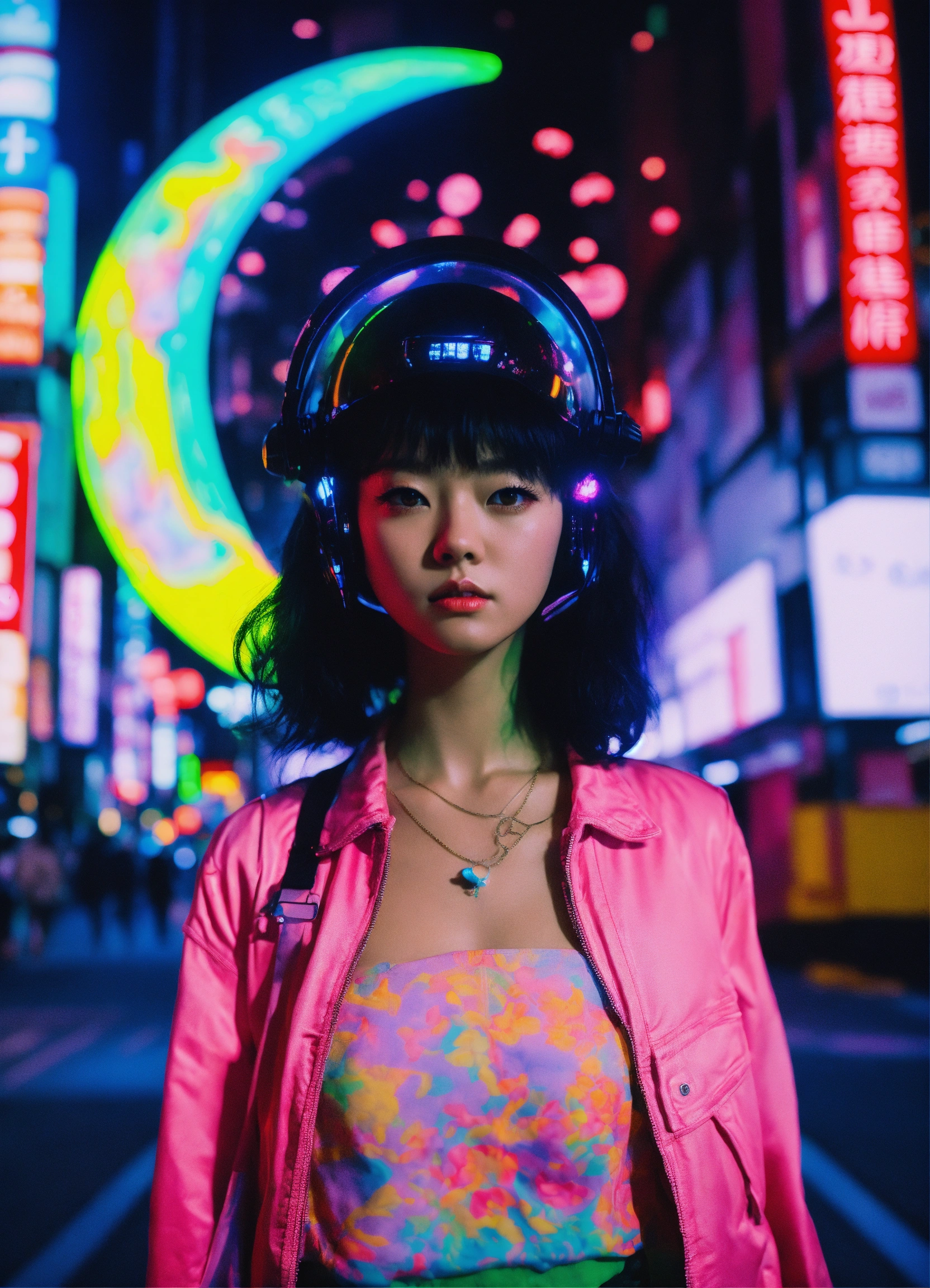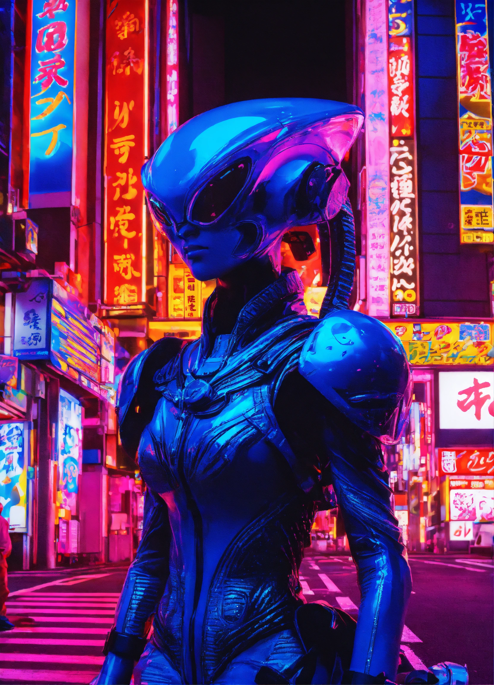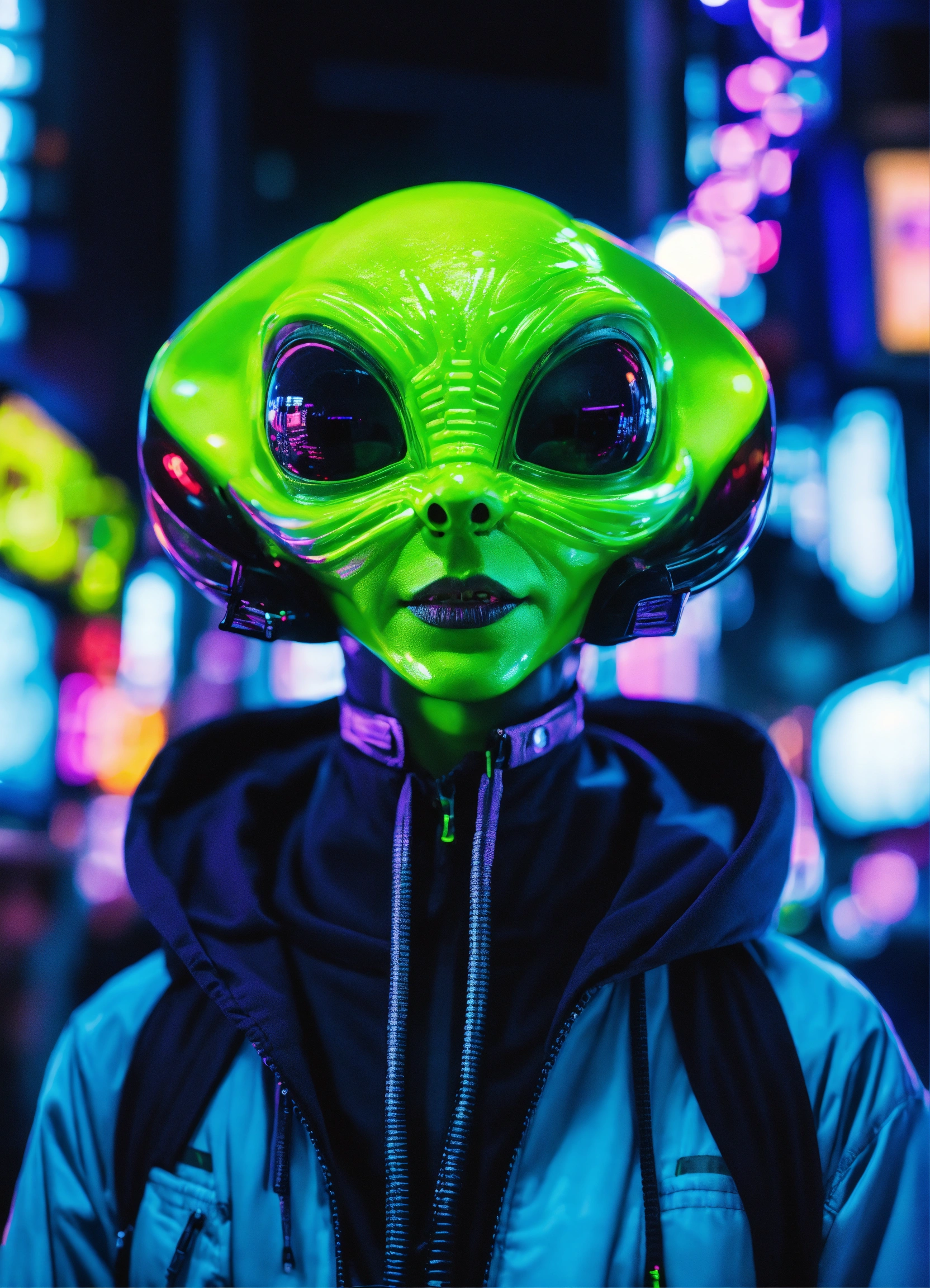 Photorealistic 3d portrait alien in dmt black light neon moon tokyo city night 35mm film, akira anime
