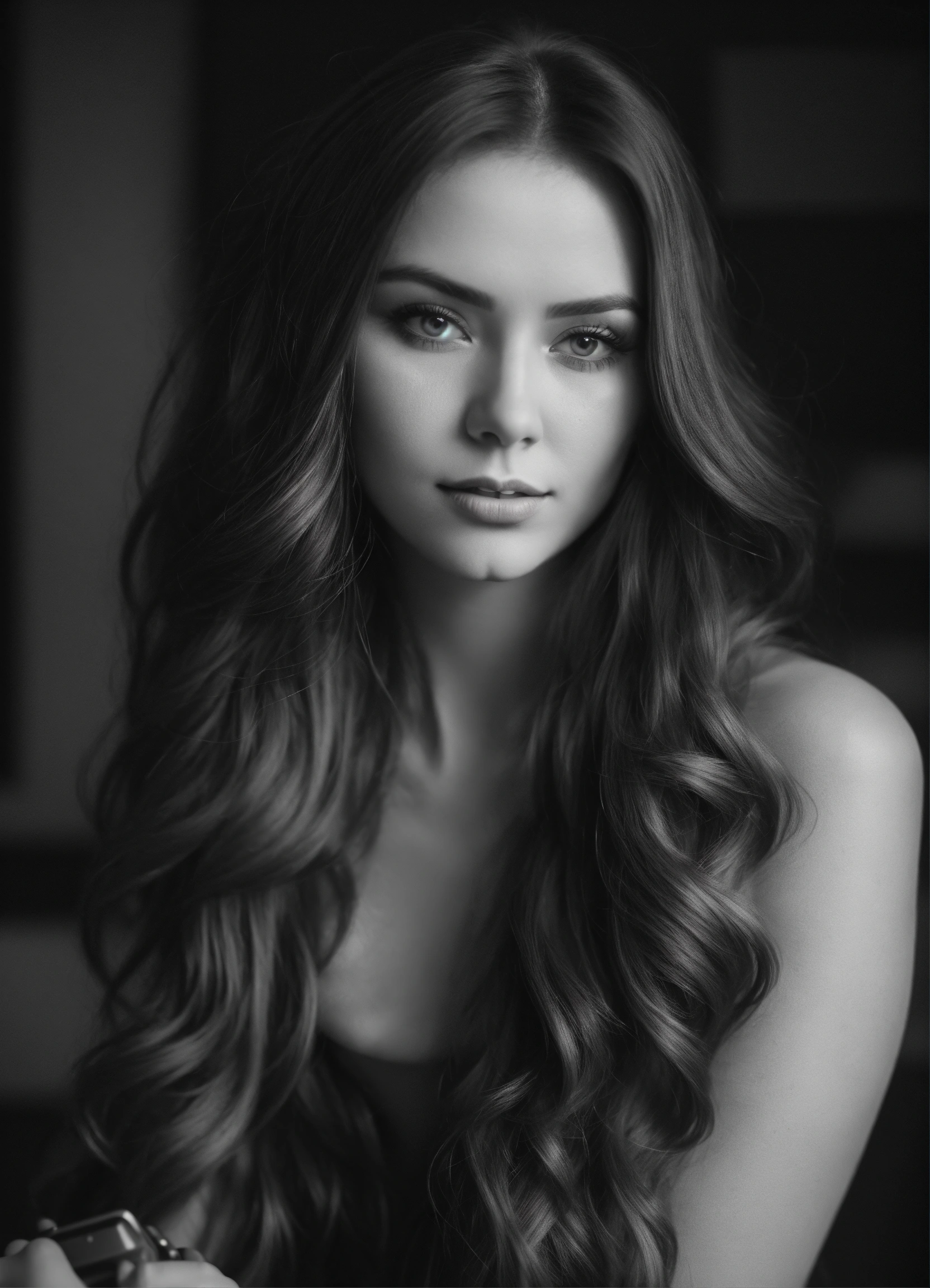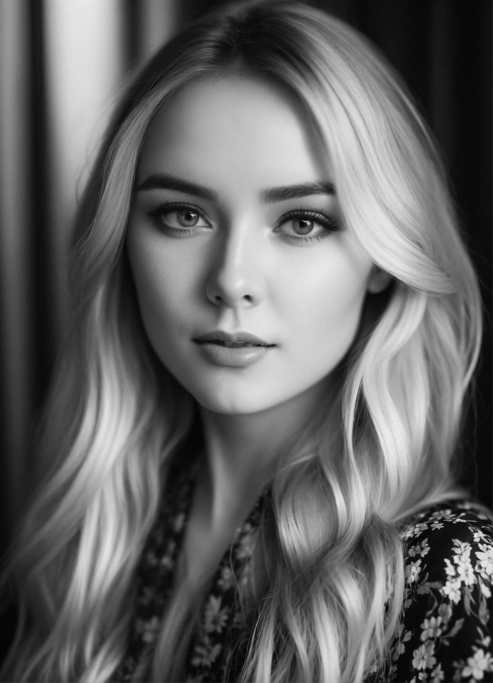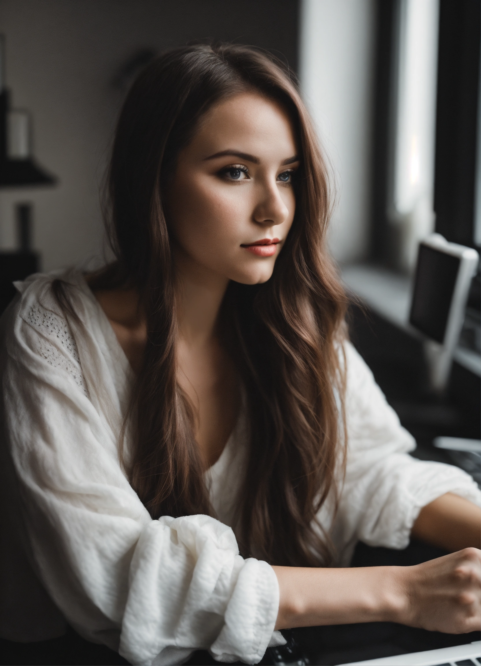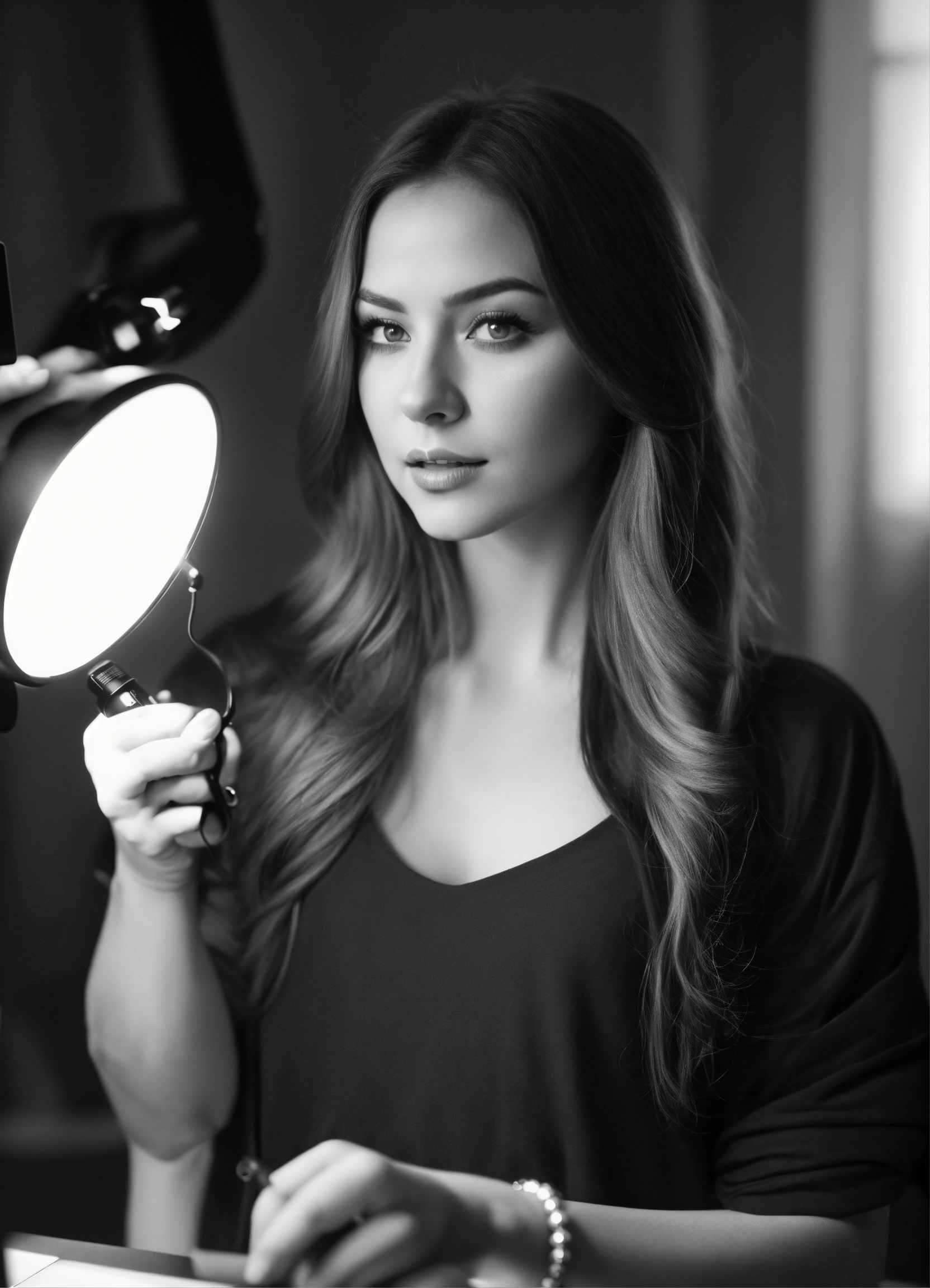Create a beautiful slavic woman who is video blogger and she is creating her youtube video black and white colors