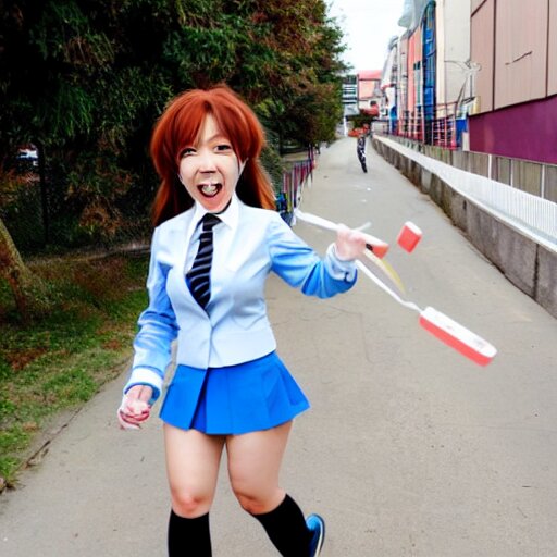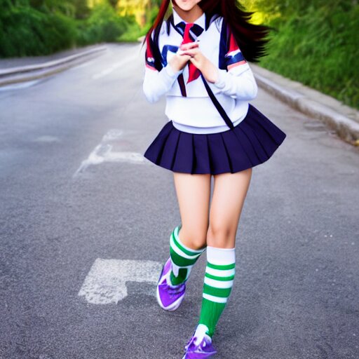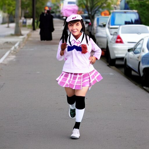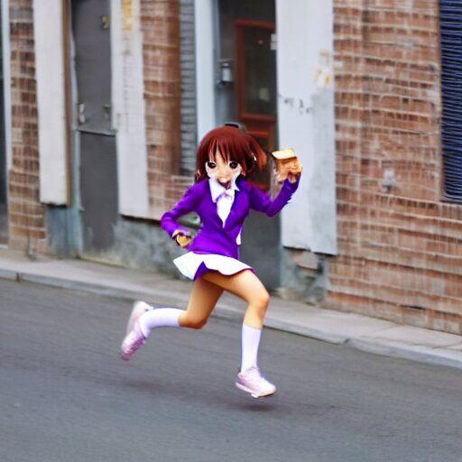 Super chibi moe anime girl running down the street wearing a school uniform with toast in her mouth