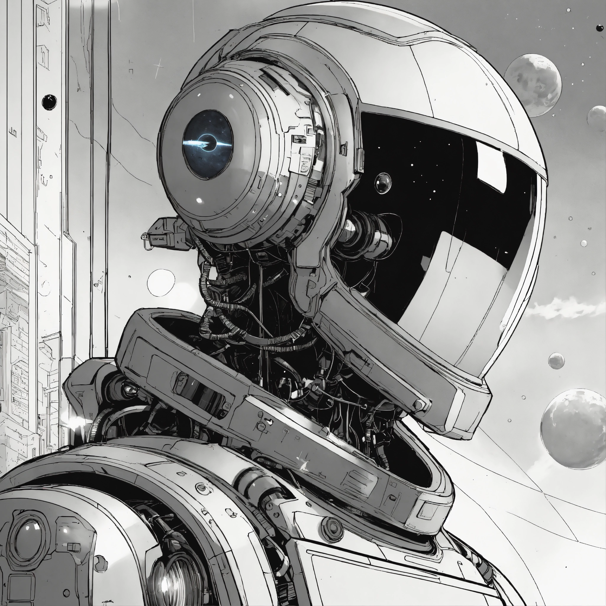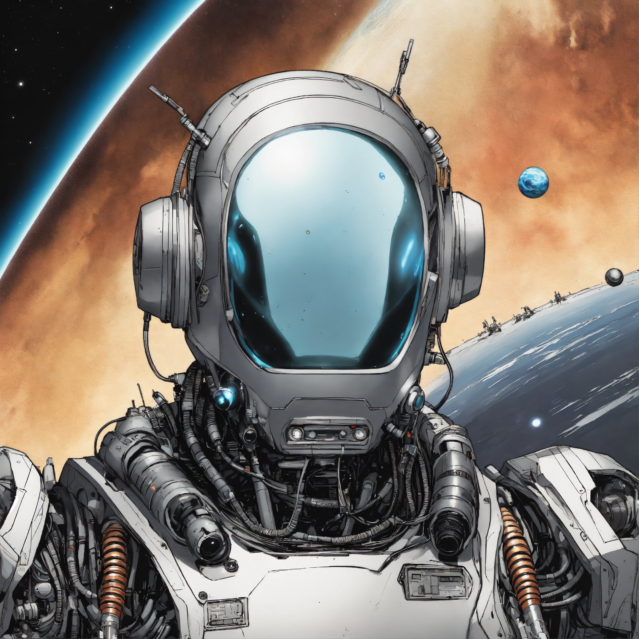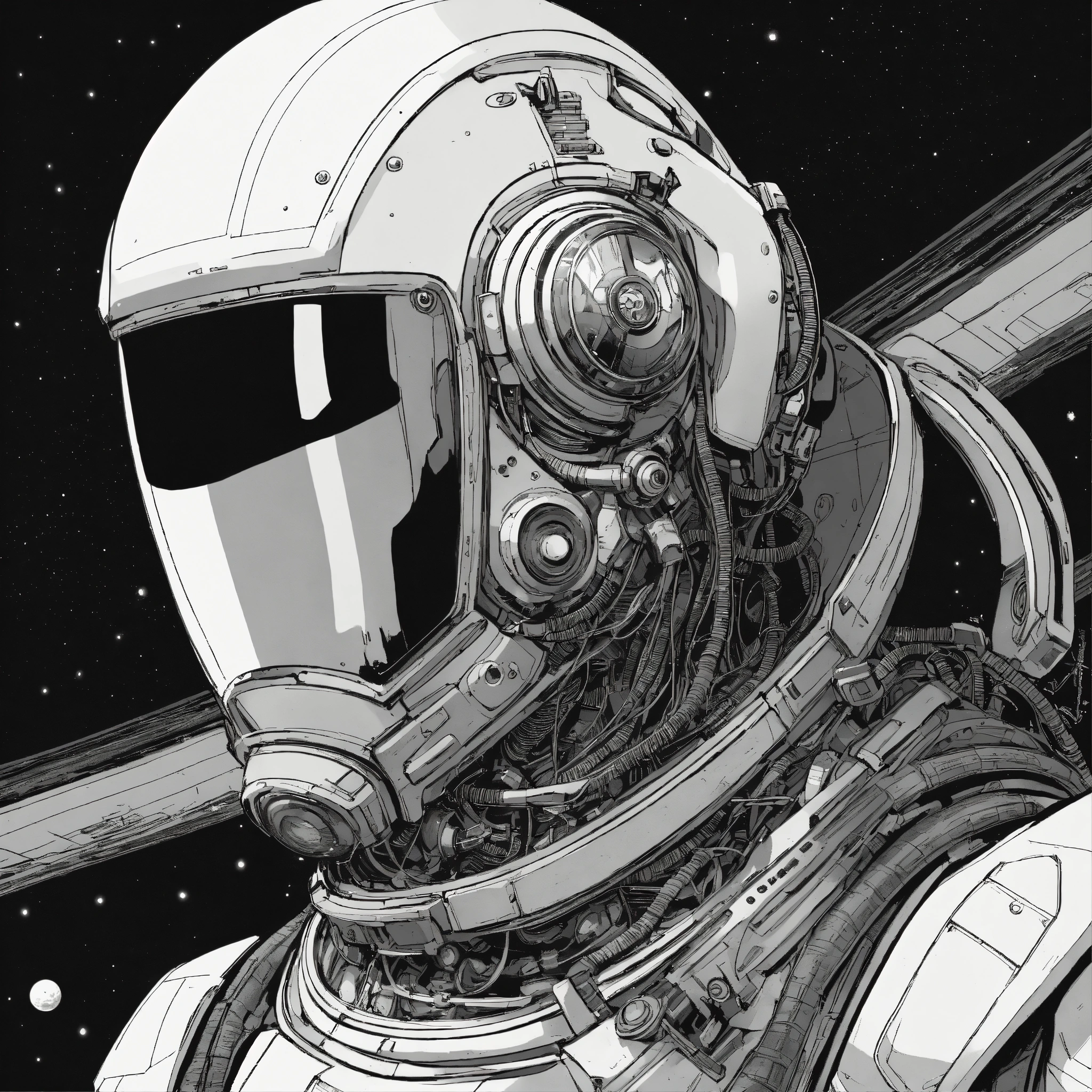 A comic book panel about robots taking over the world, detailed comic art. comic book cover art. photorealistic ink art. mnimal, close up androids face, visor reflecting planets, minimal wires coming off helmet, black & white, in space