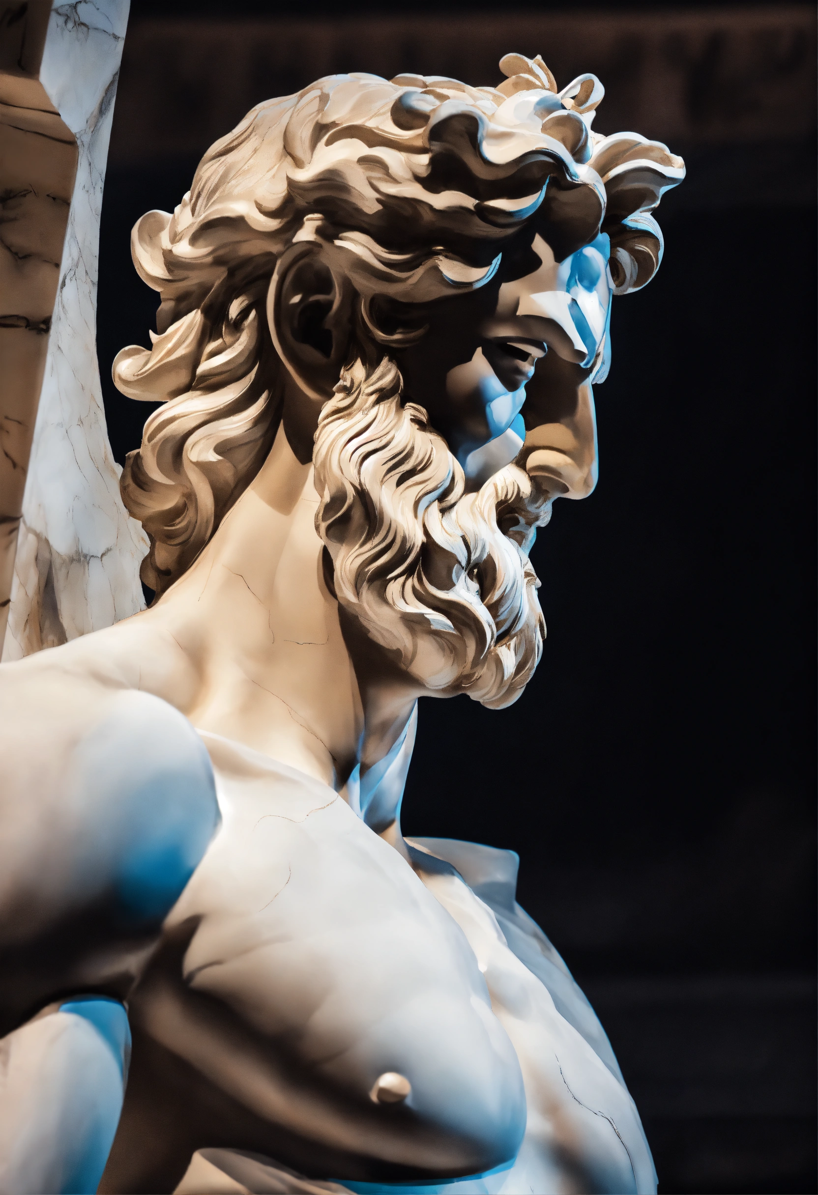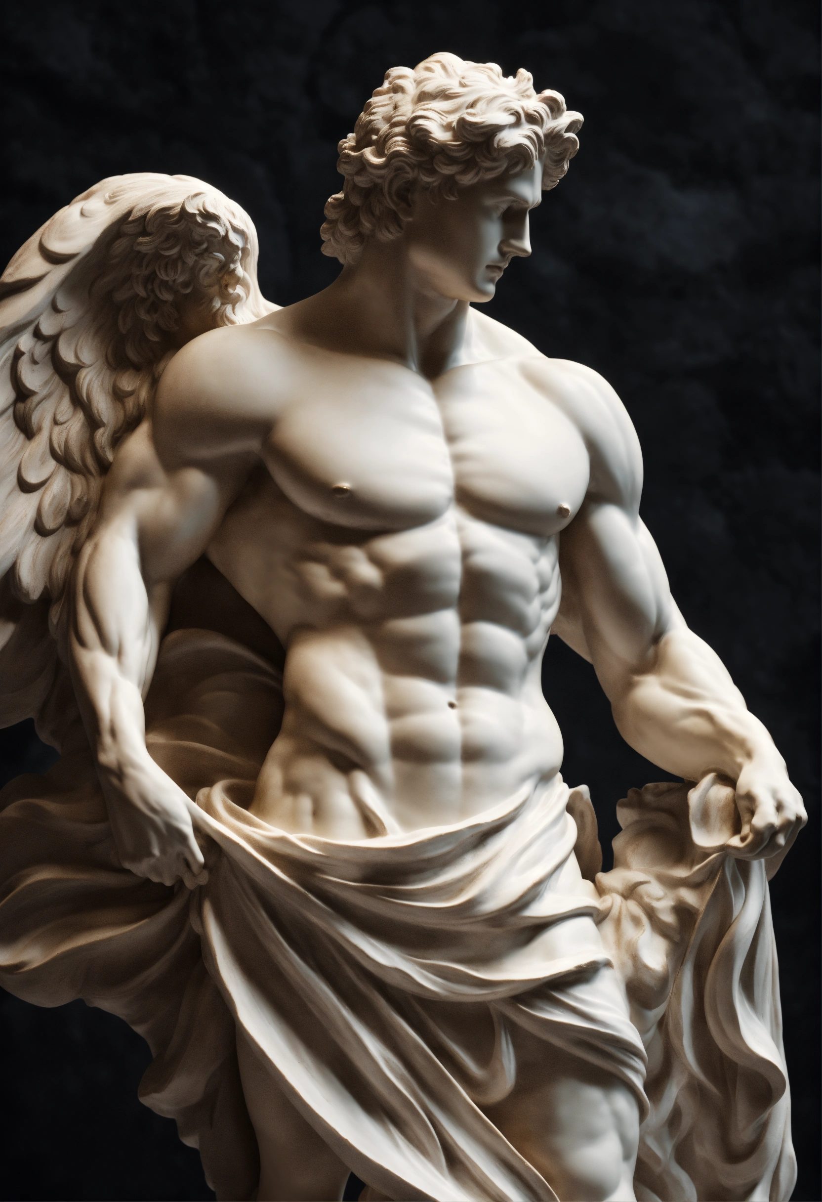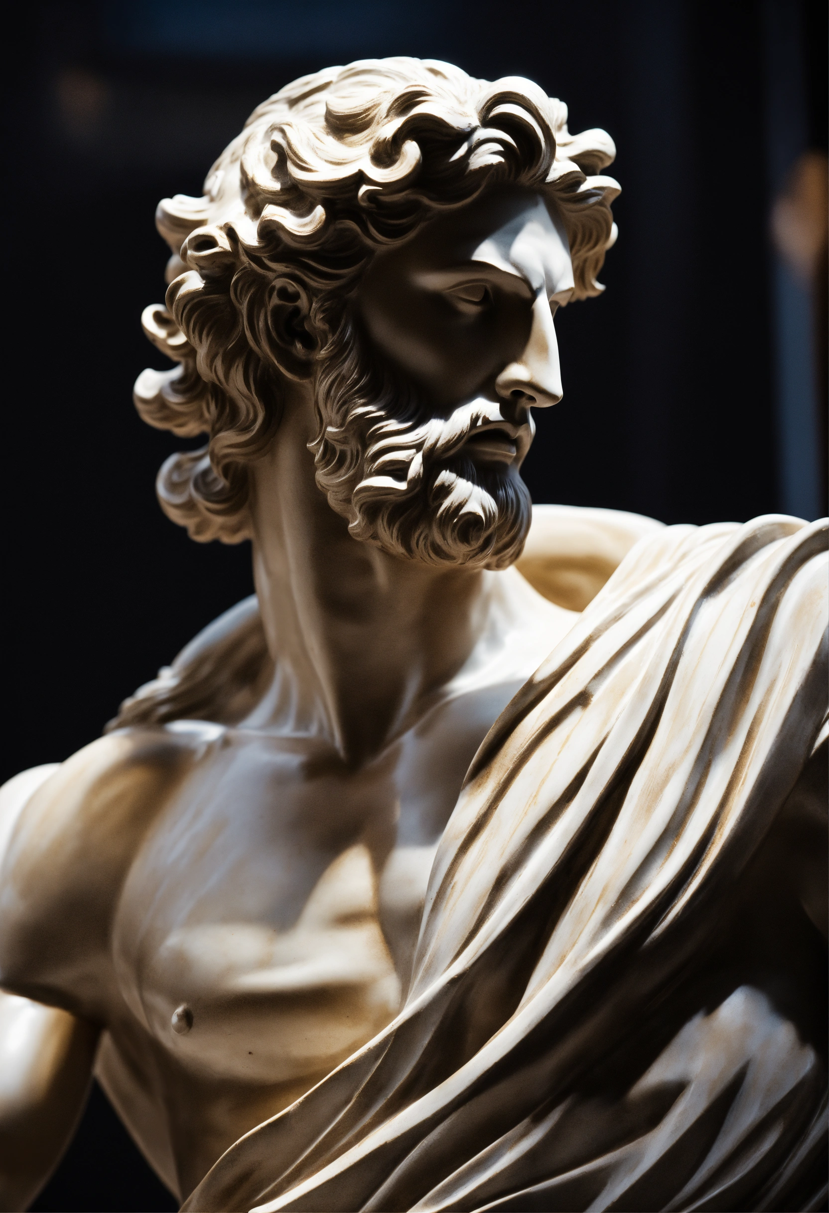A statue from a muscular greek god statue with a wavey middel parting hair out of white marbel with a black backround standing on a podest animeted style 8k