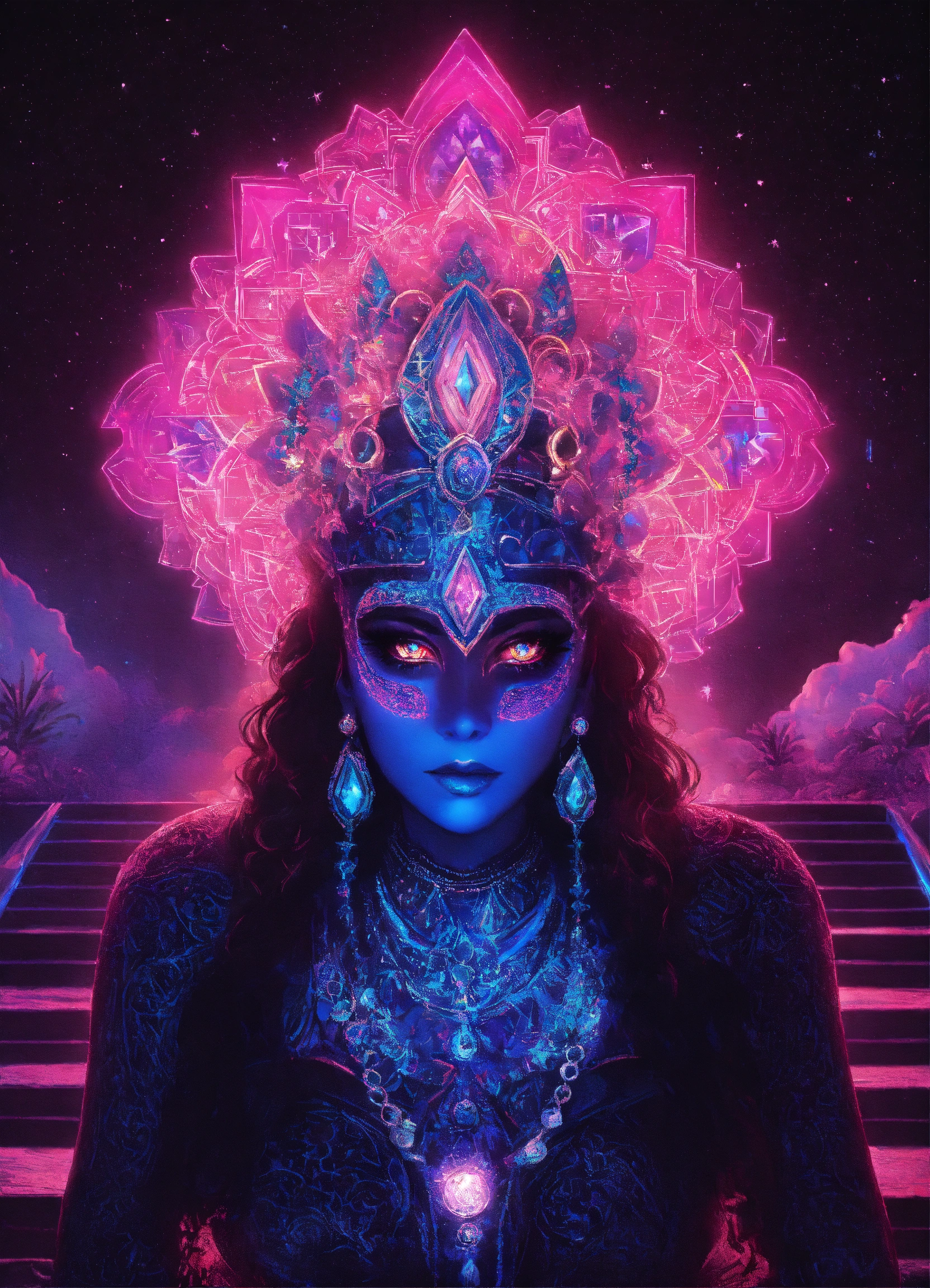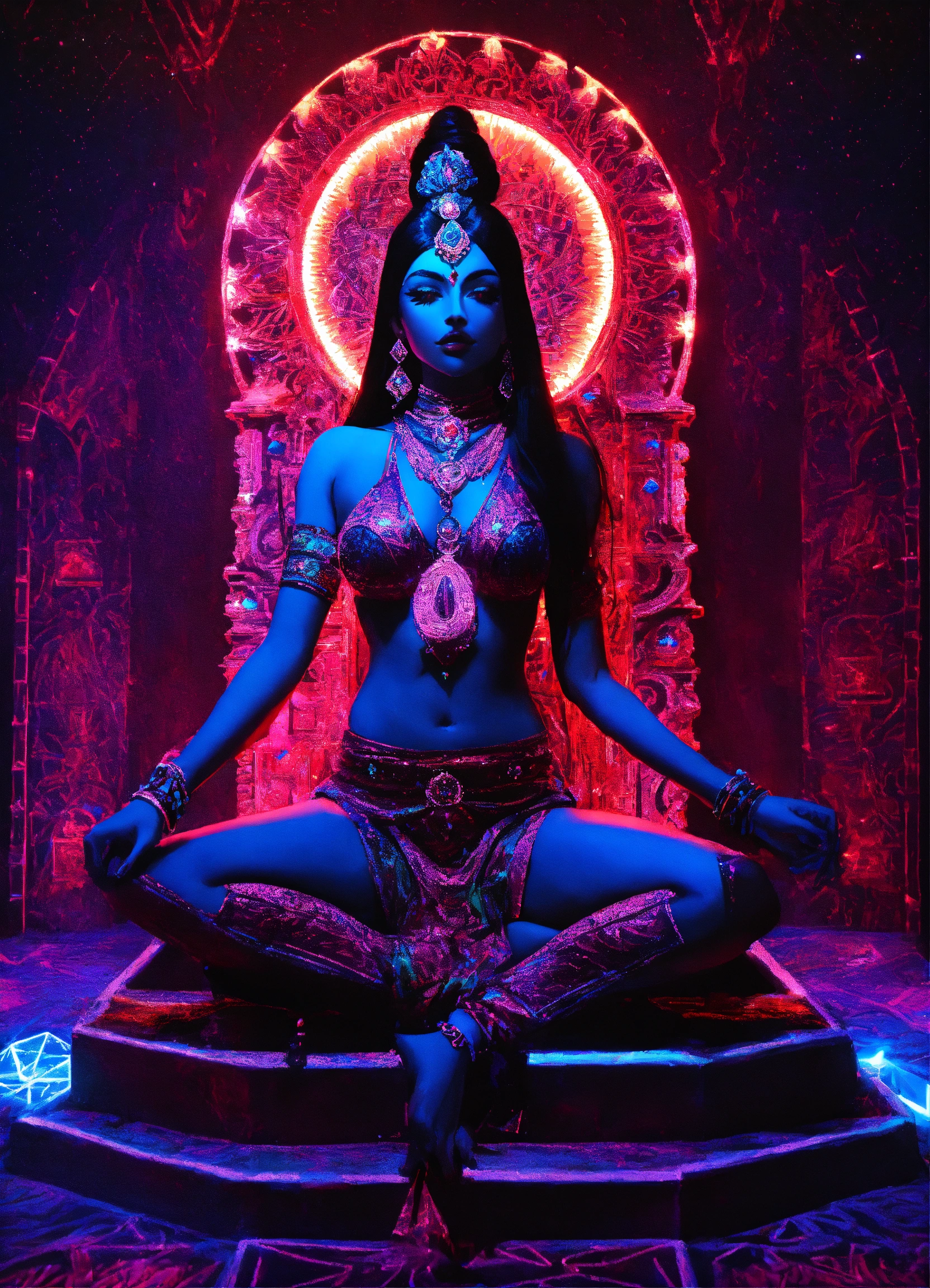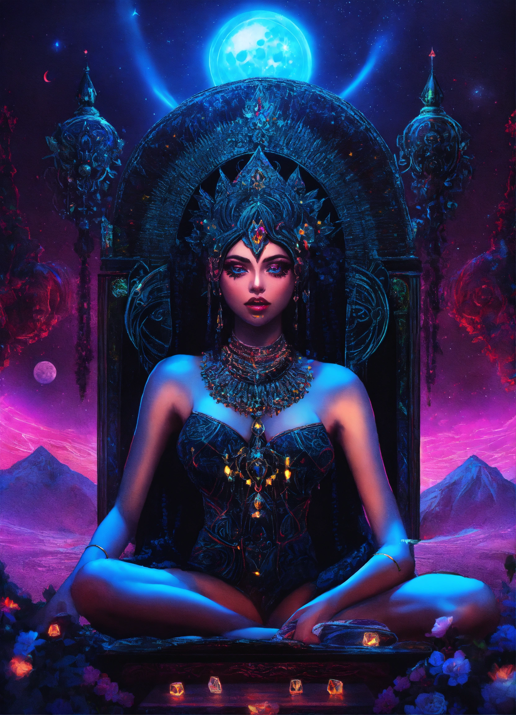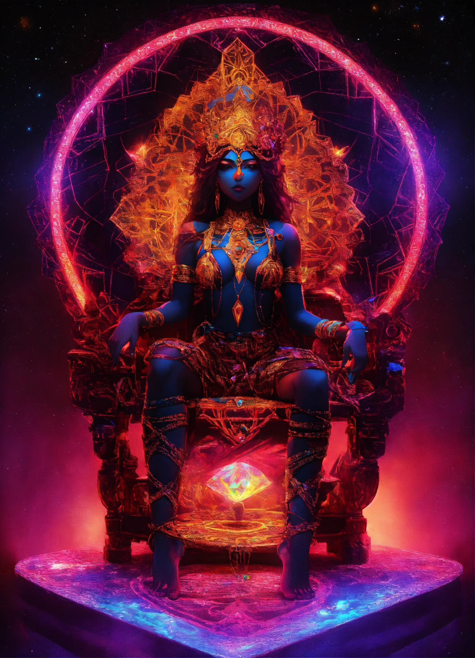 Kali made of diamonds and shimmer black neon light dmt throne under starlight and moon