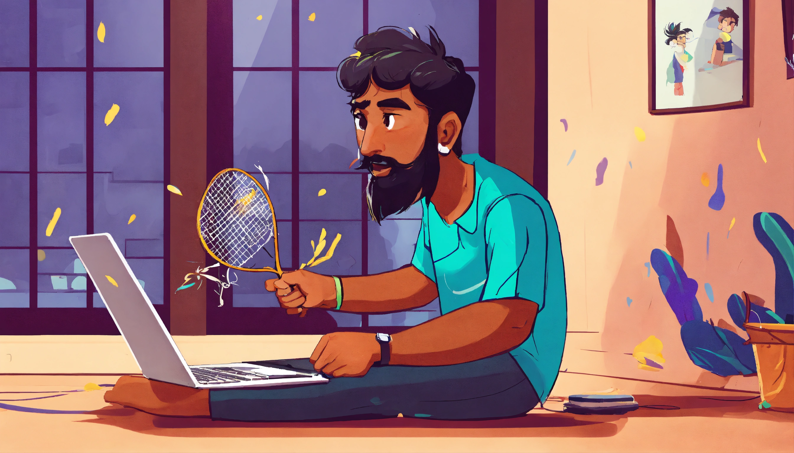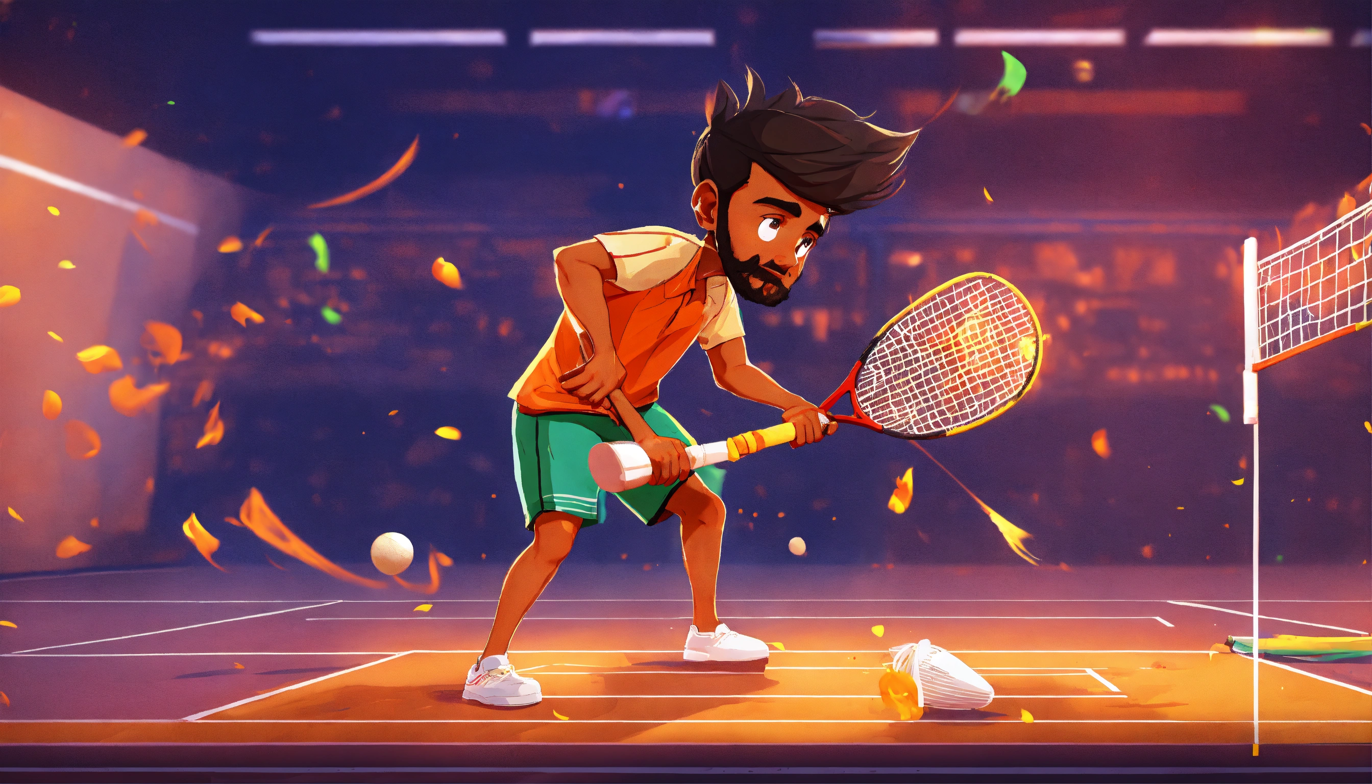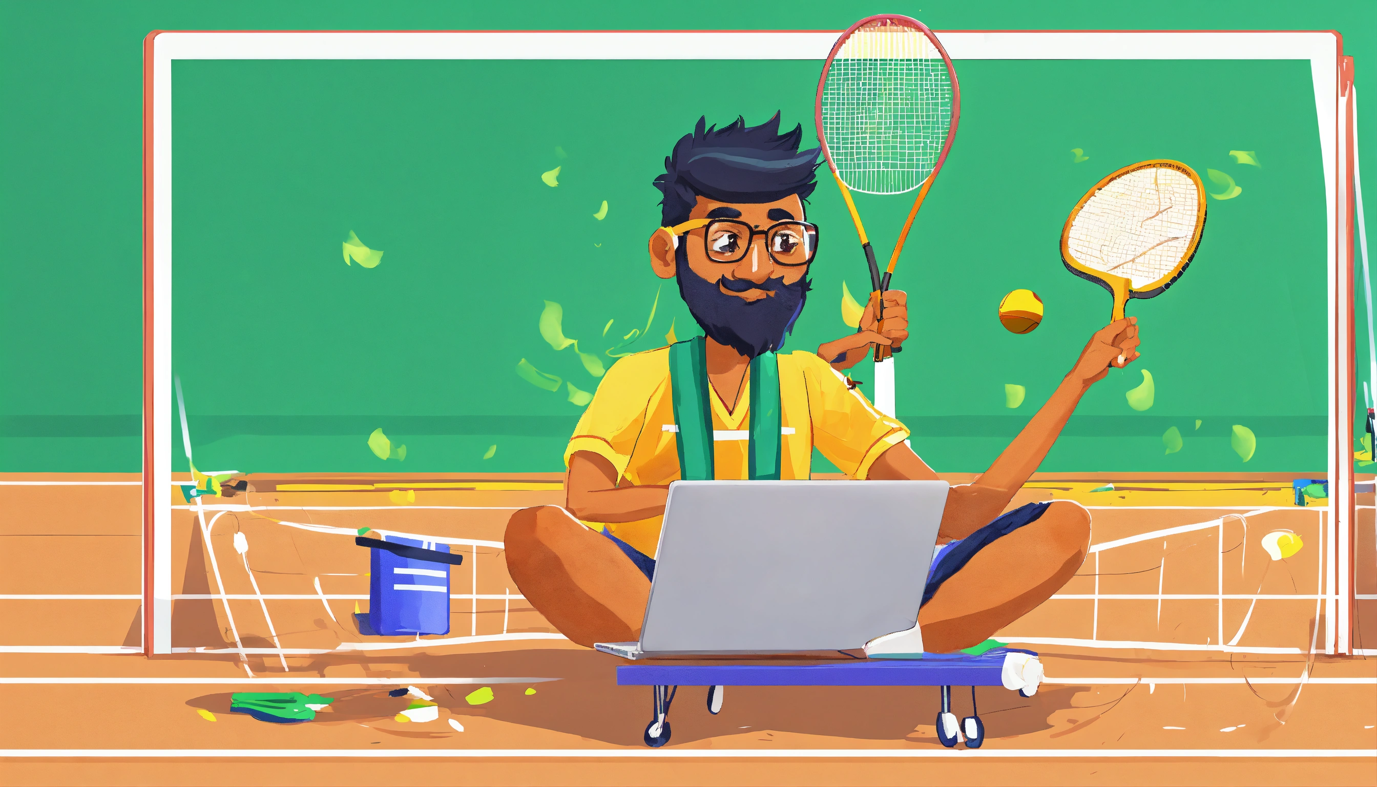 Indian man smashing badminton shuttlecock on the court while coding on a laptop in the style of a cartoon