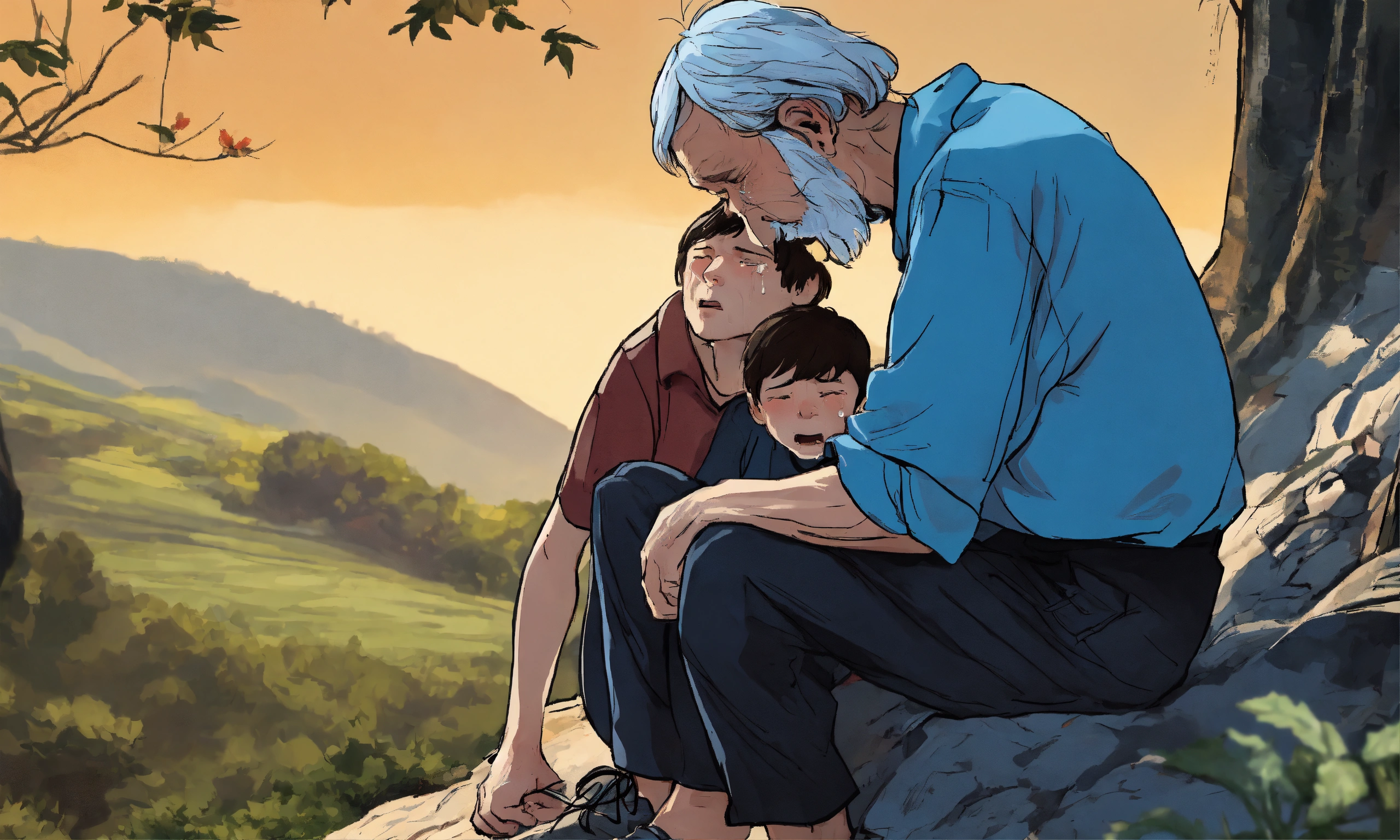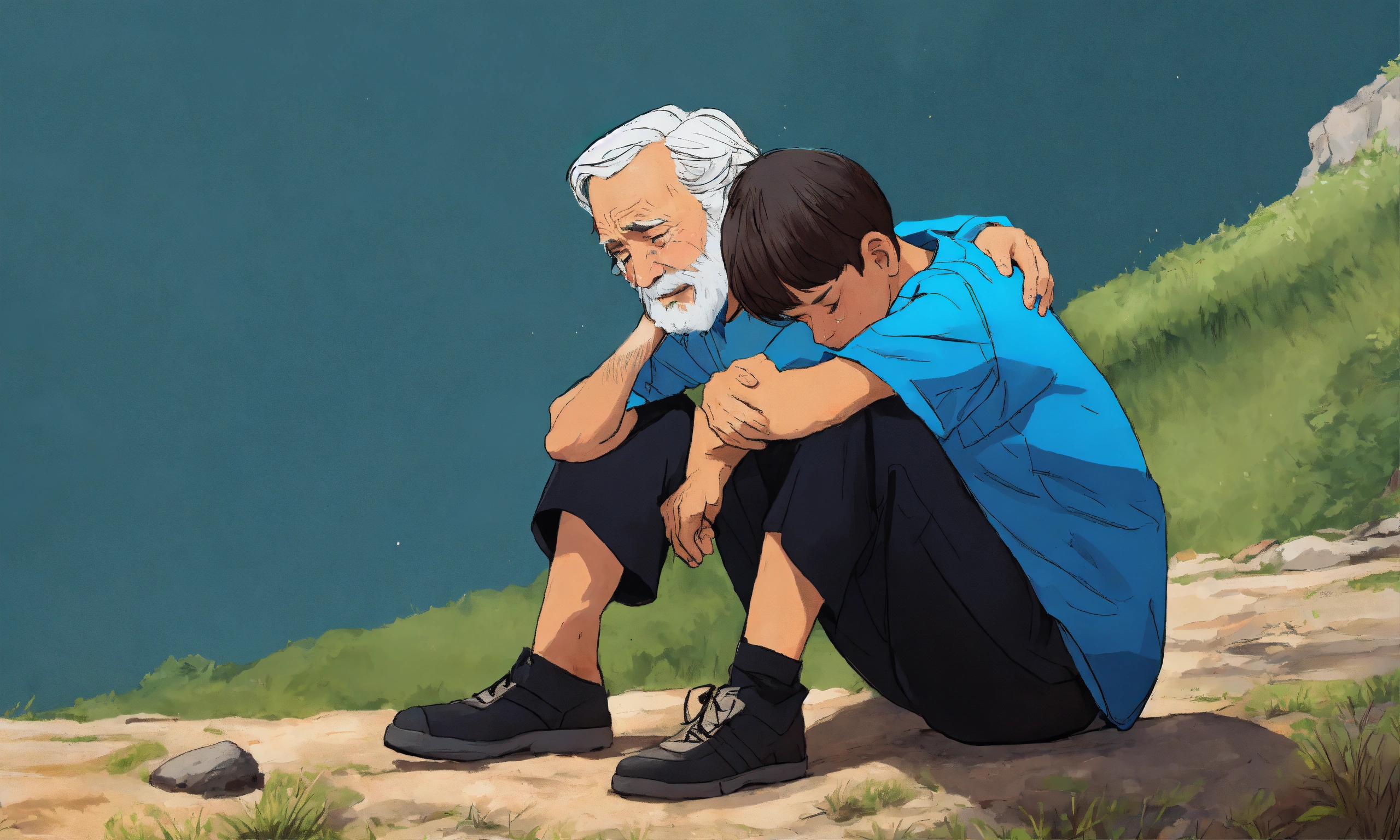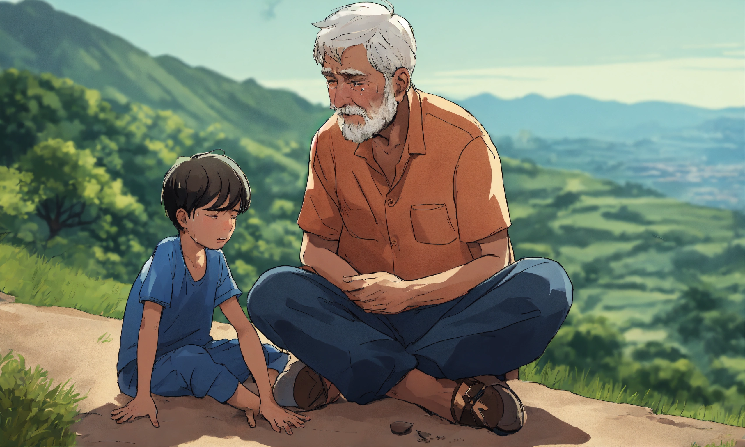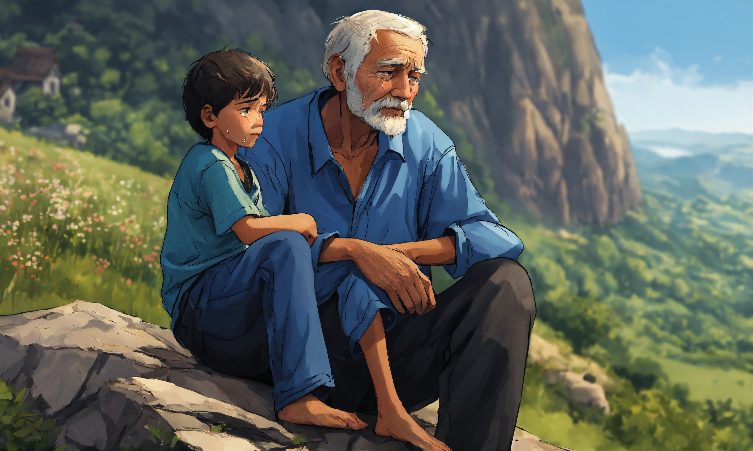 Very high detailed 2d illustration closeup of old man sitting beside, one hand in shoulder of crying boy in blue shirt and black half pant, hillside