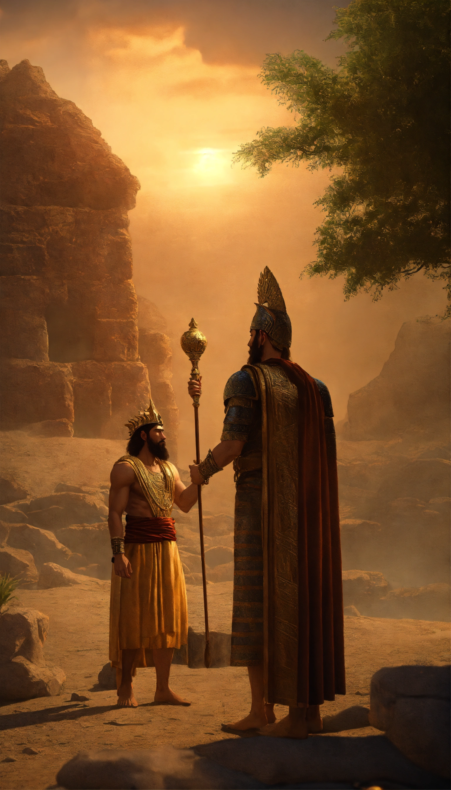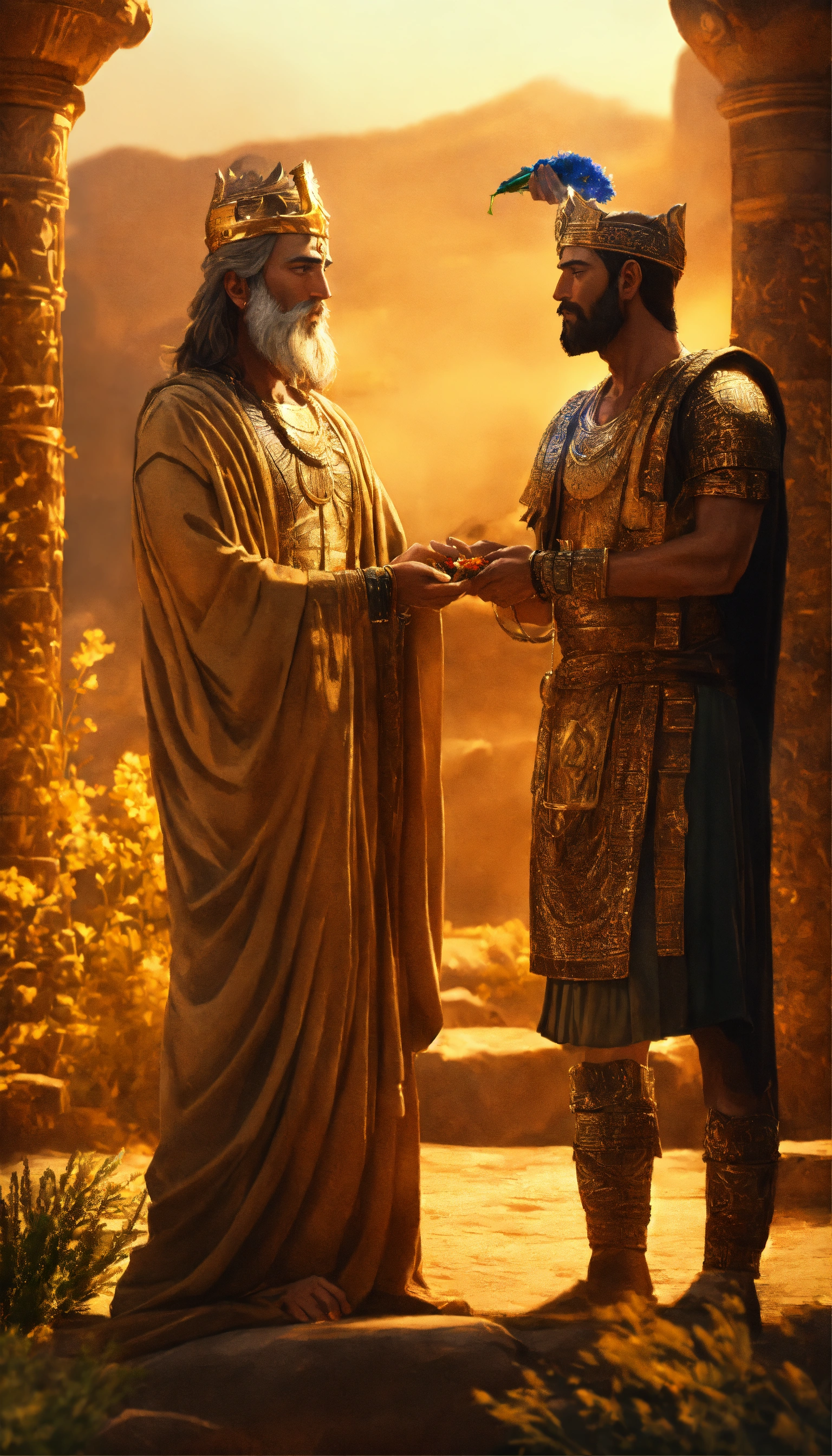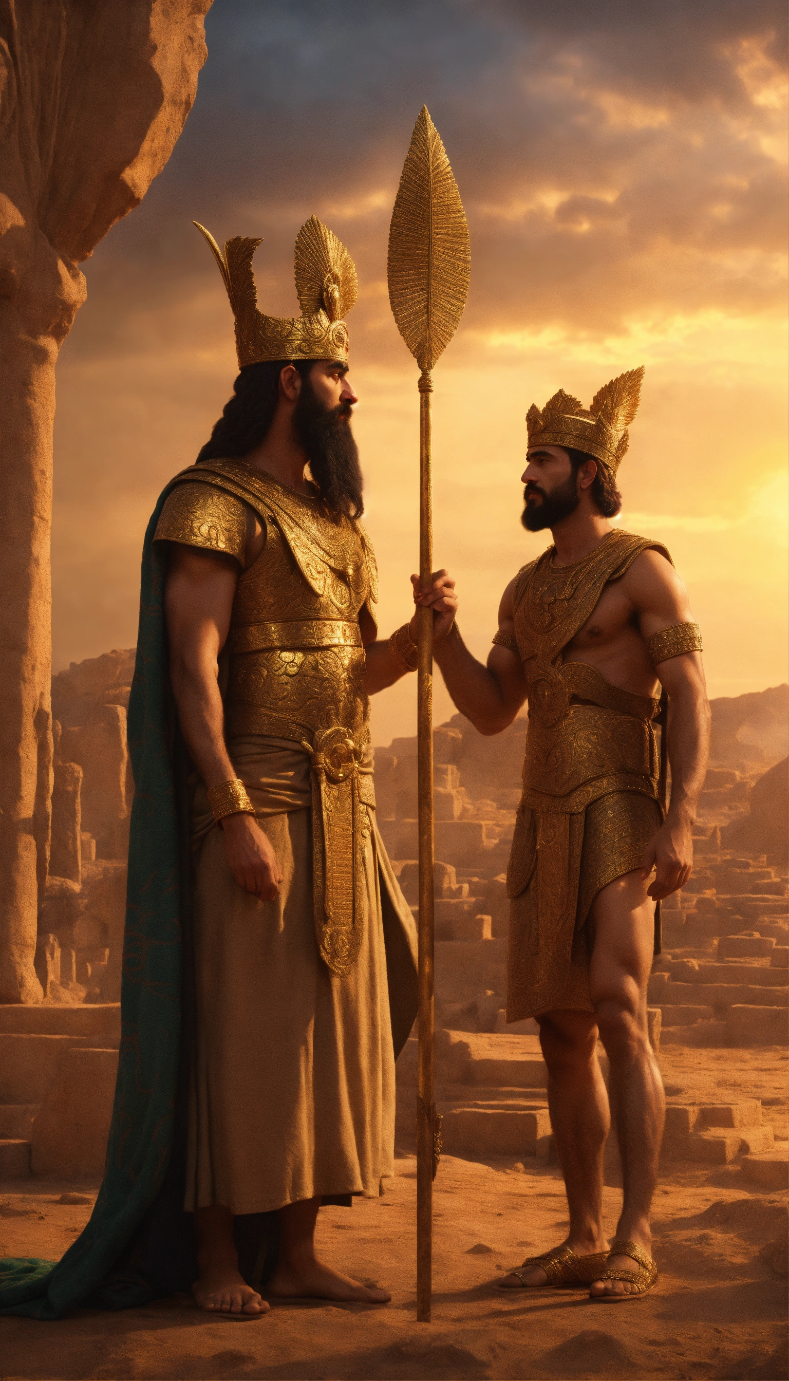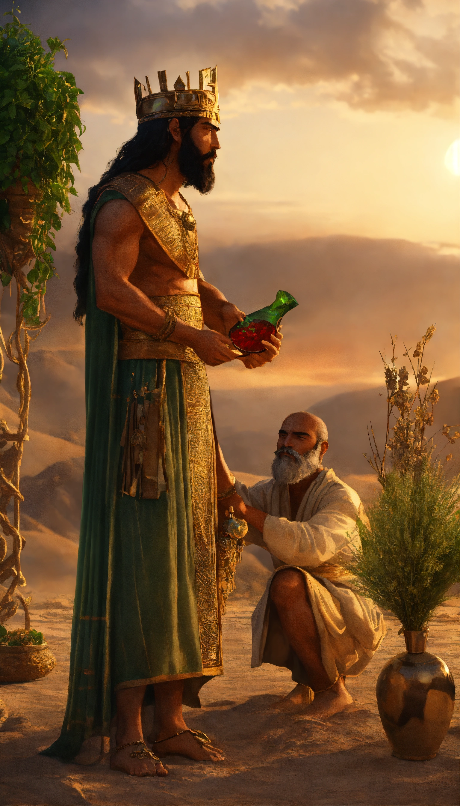 Sumerian king gilgamesh receives the herb of immortality from the prophet noah at dawn, cinematic, 8k