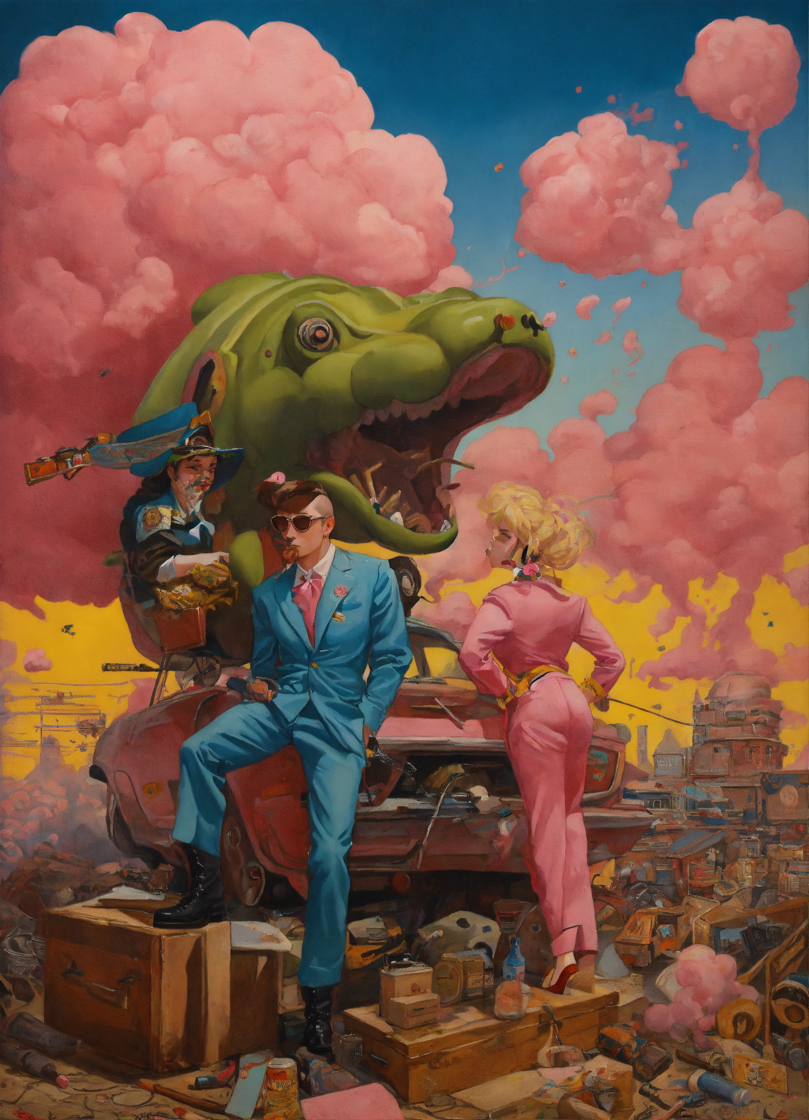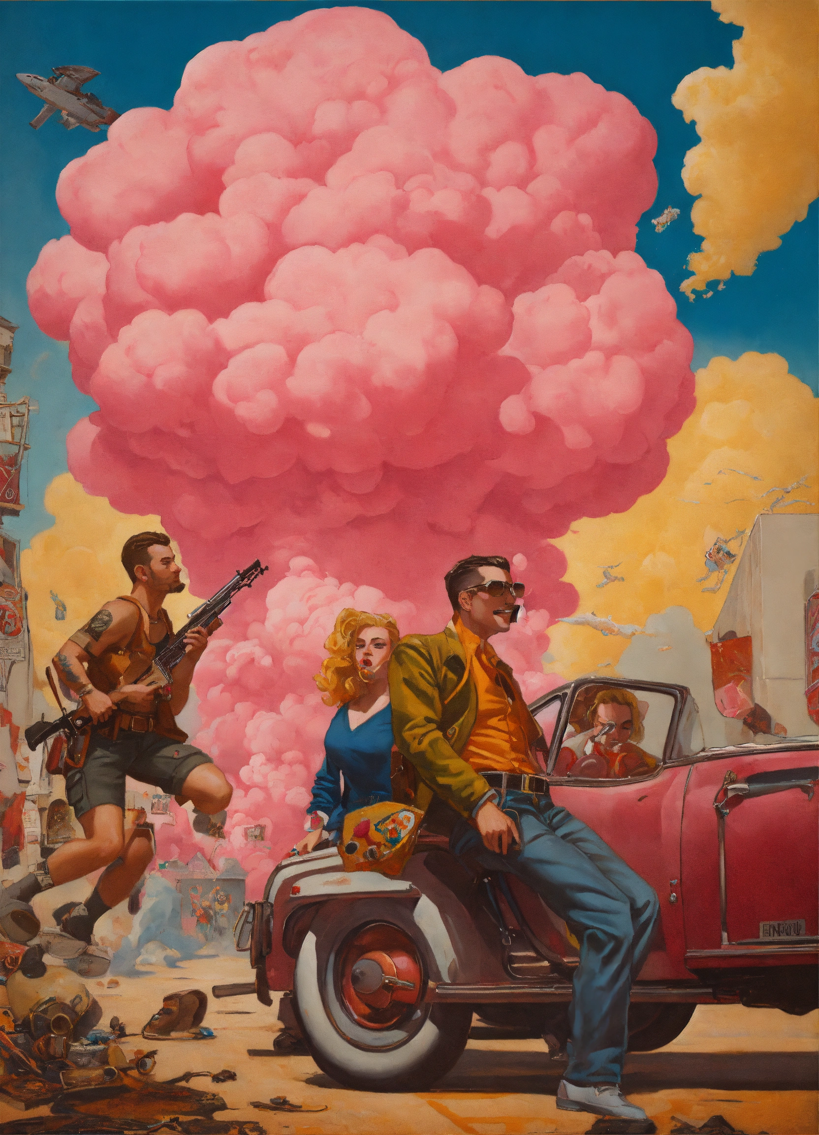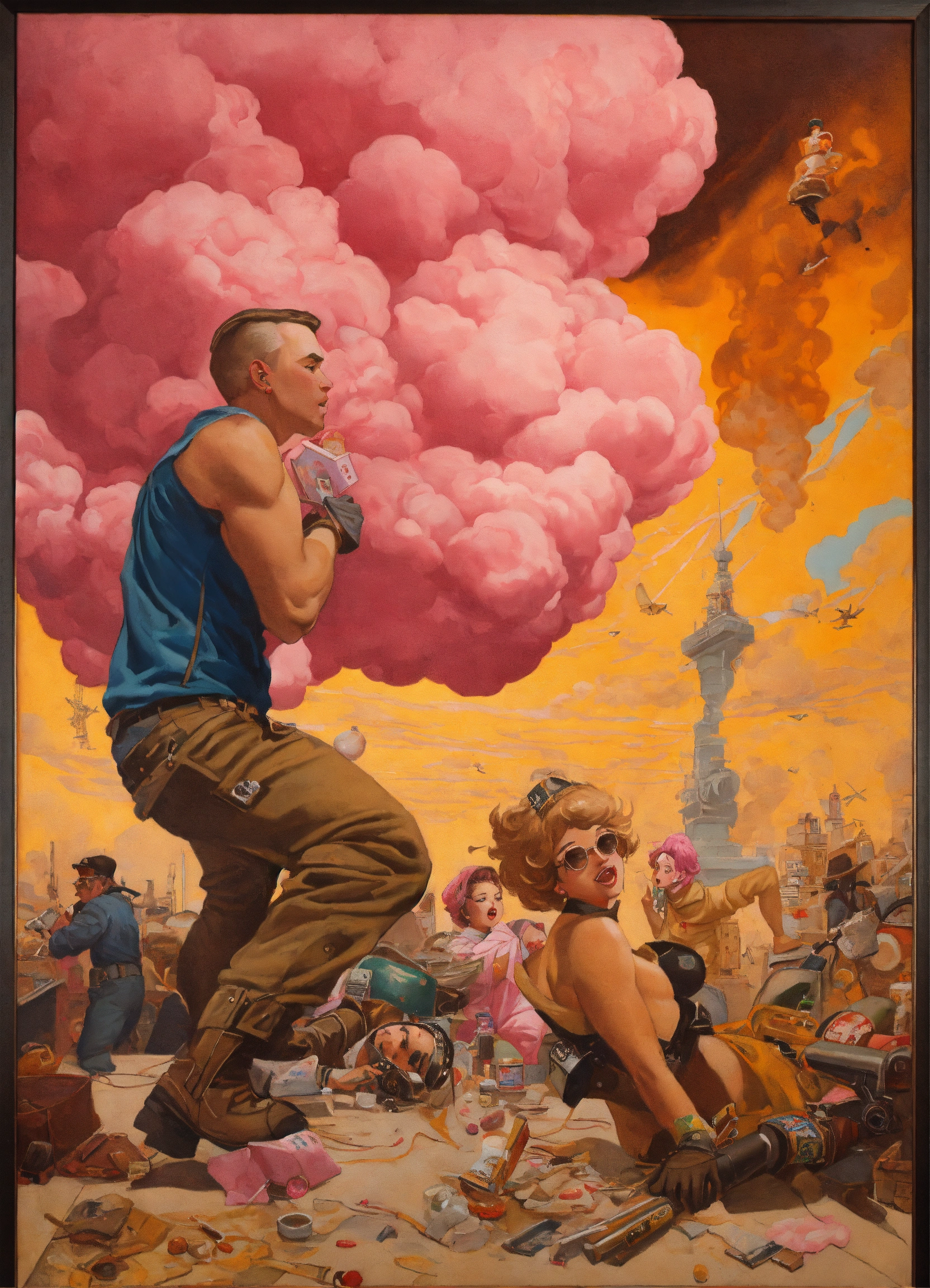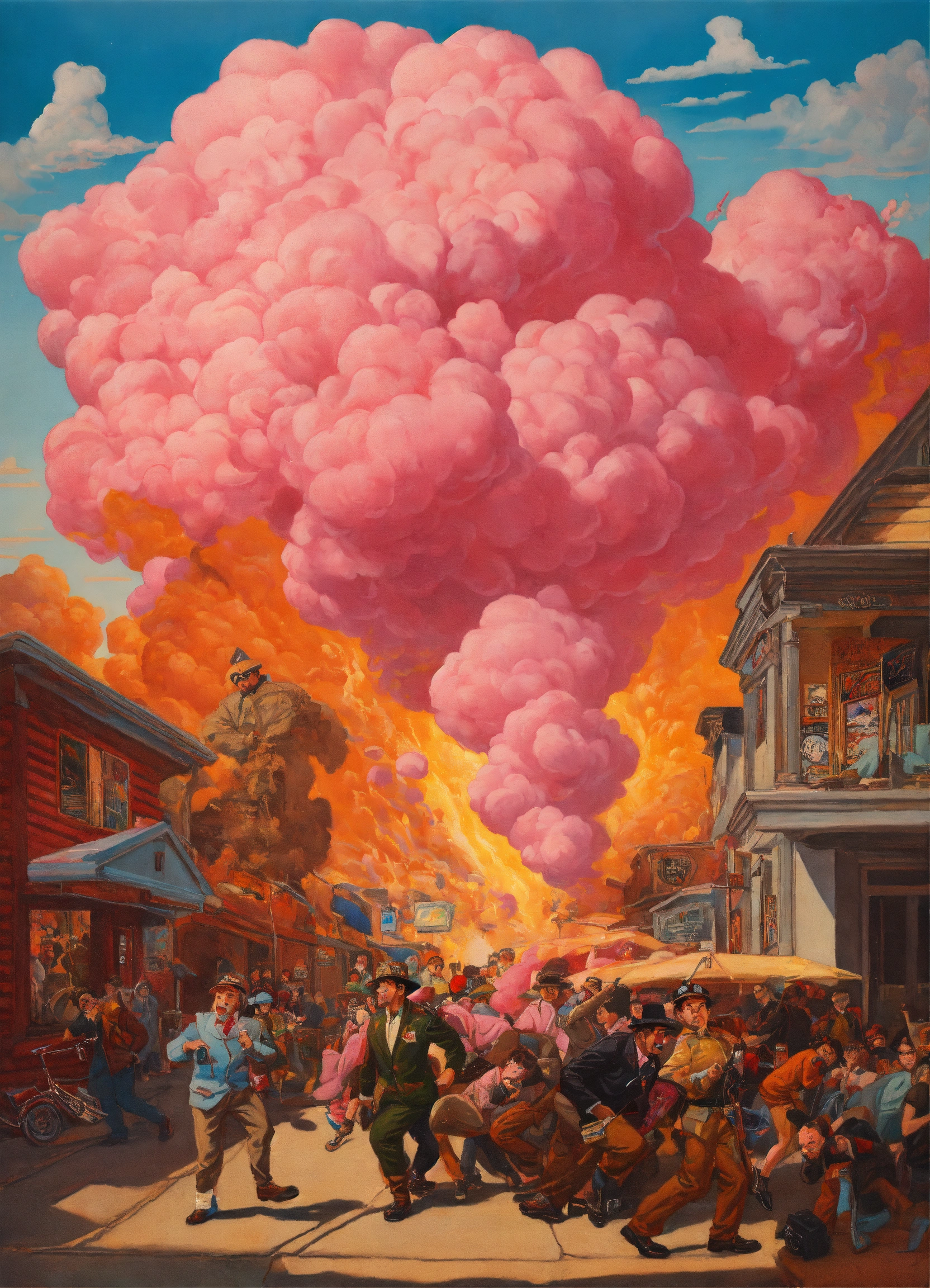 Two paintings, featuring several people and a pink cloud, in the style of todd schorr, explosive and chaotic, frank xavier leyendecker, stan berenstain, neo-concrete, illustration, ghoulpunk --s 50 --style raw --ar 56