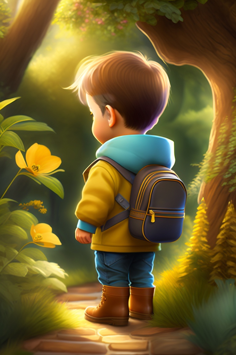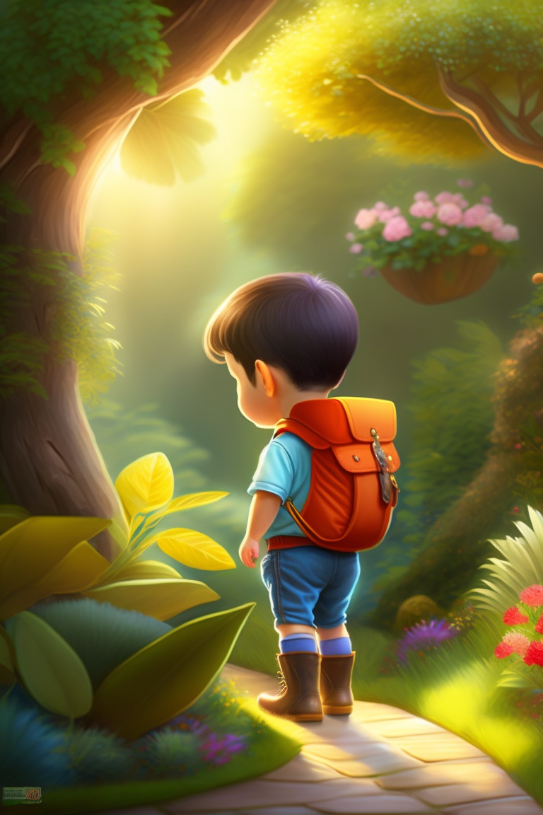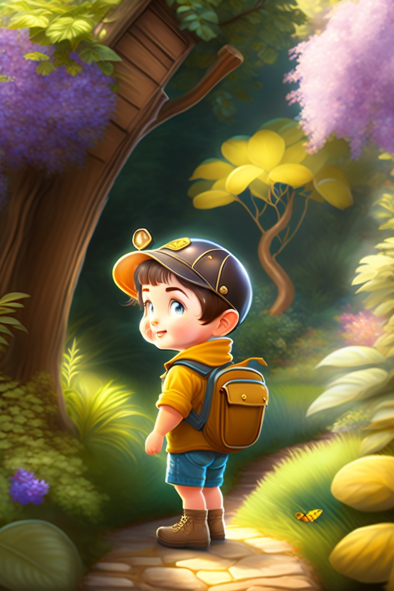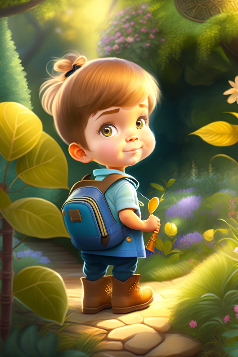 Adventurous kid exploring a garden, tree, children's storybook art, art drawn by pixar animators, golden colour, high quality, highly detailed, elegant, sharp focus, concept art, character concepts, digital painting, mystery, adventure, archaeology, adventure, nature, mistery.