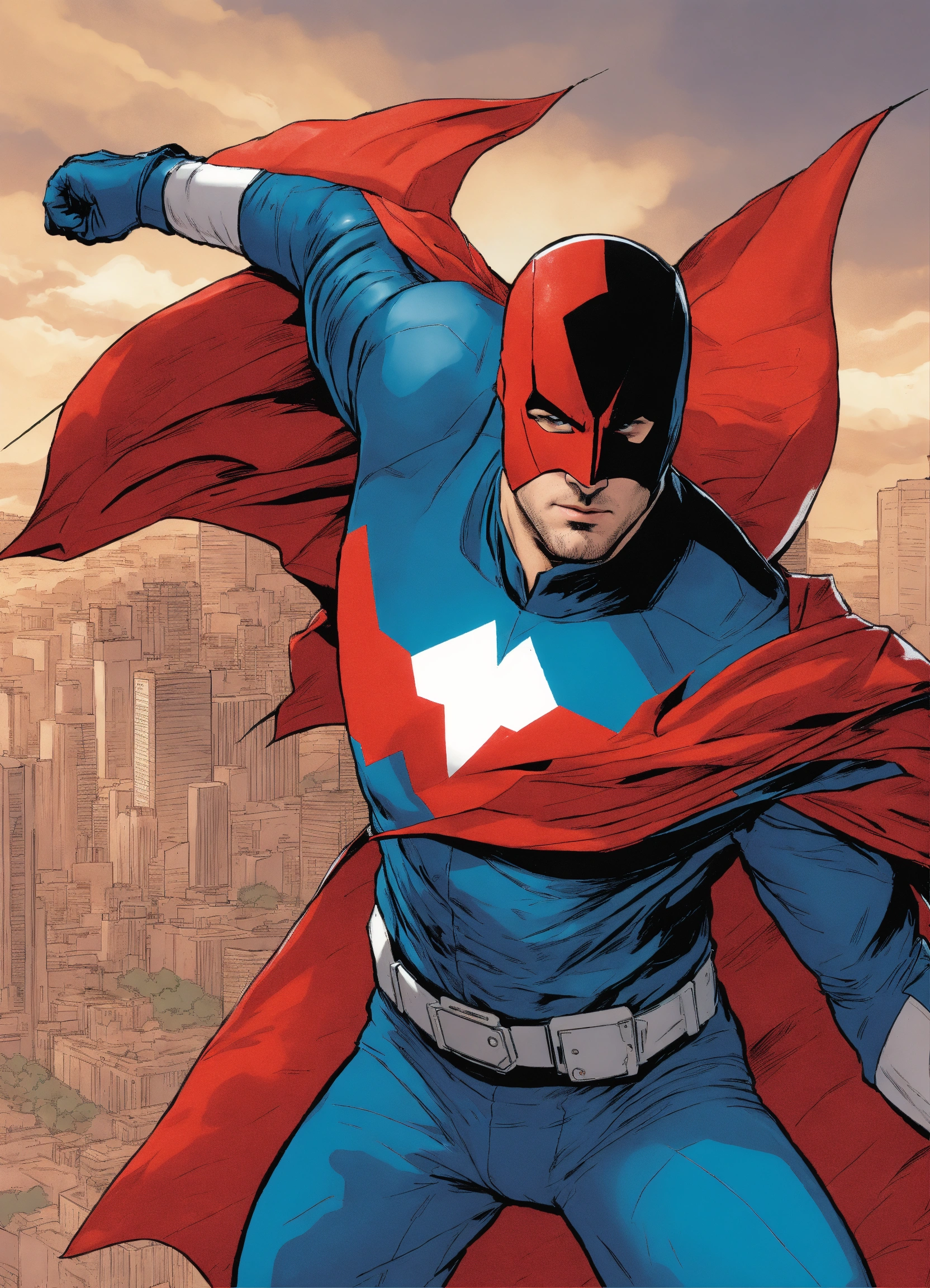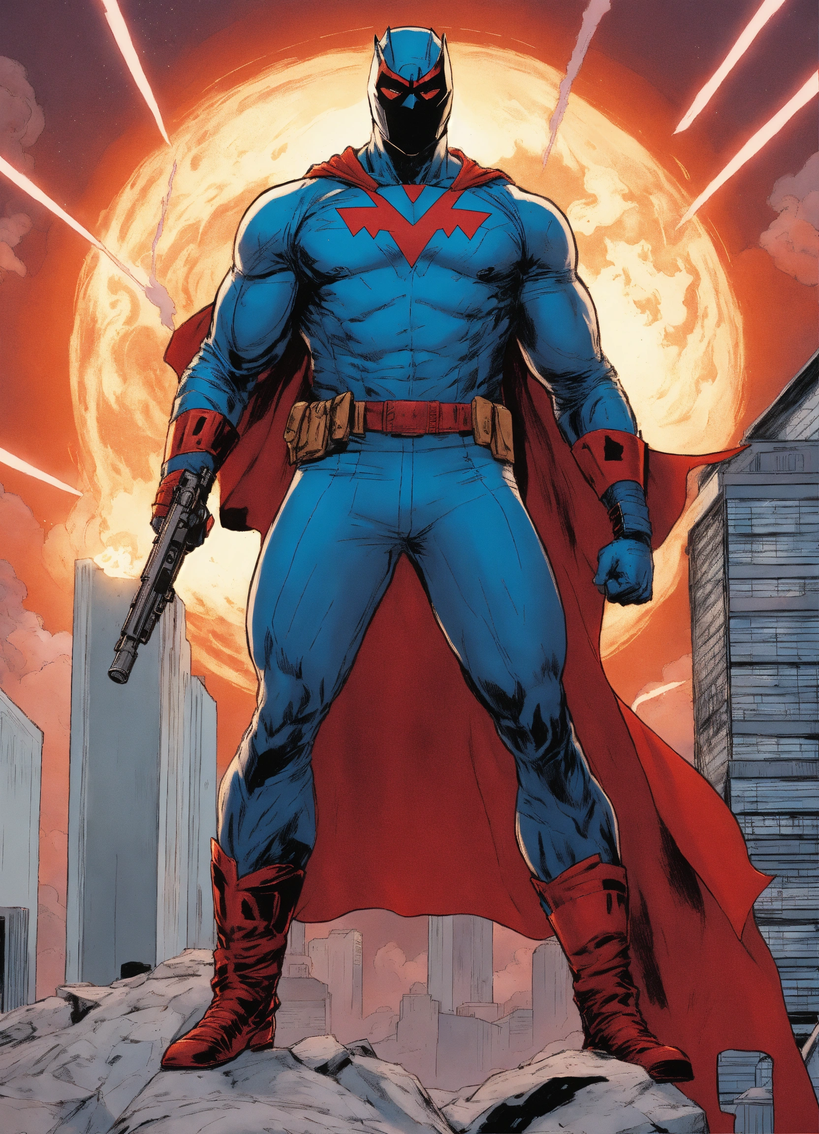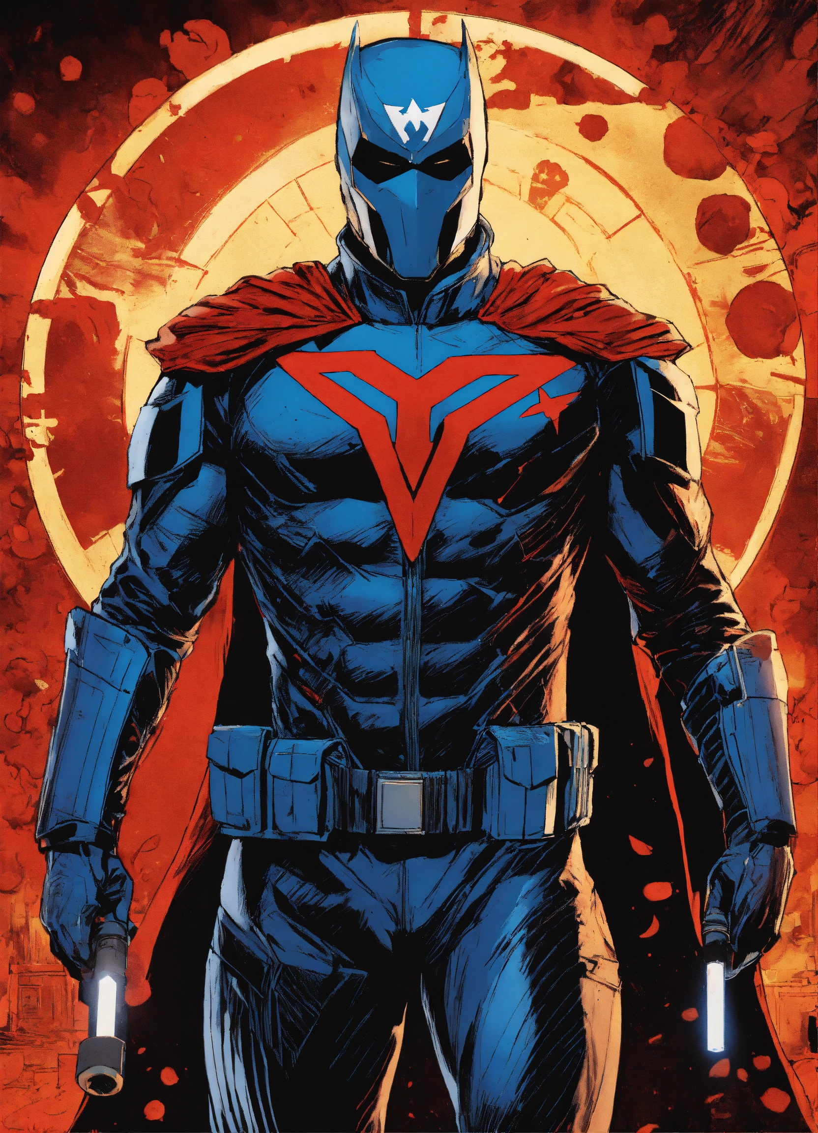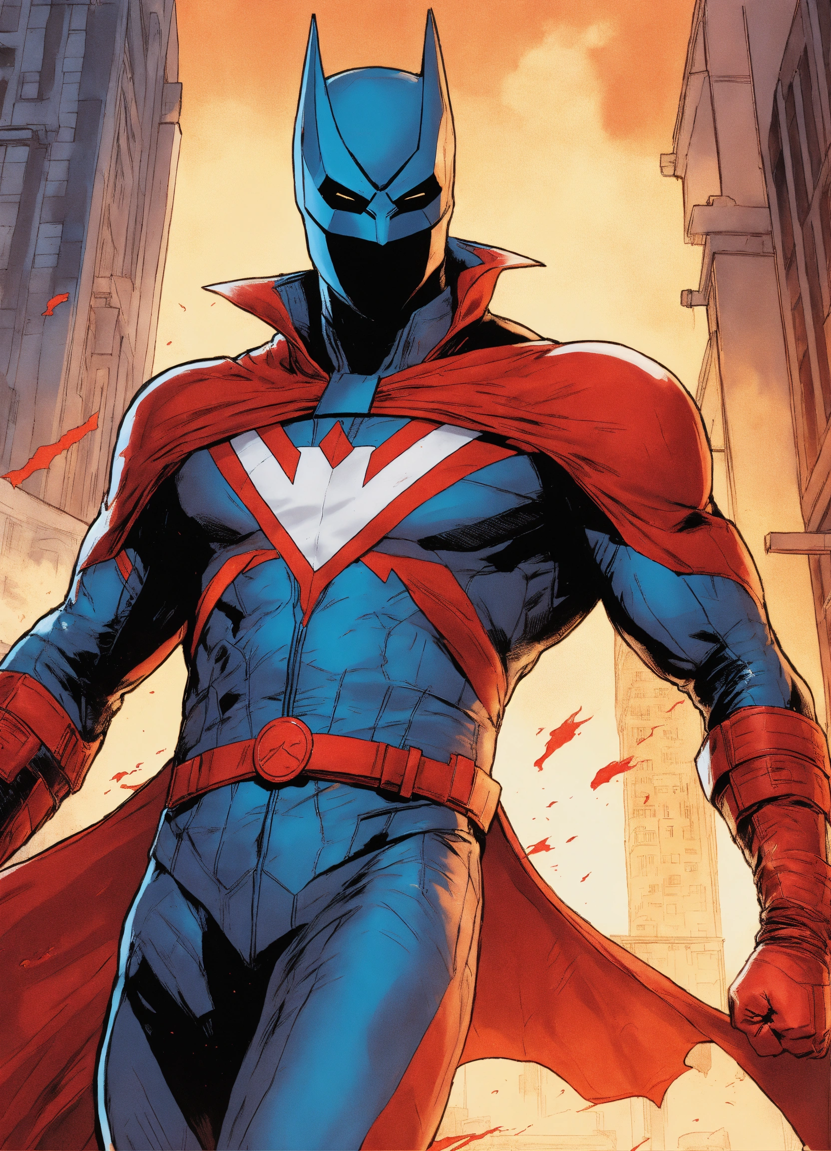 Comic book illustration, ink, valiant vigilante's costume is a modern and functional ensemble that exudes a sense of justice and strength. he wears a electric blue colored suit with white and fiery red accents, accompanied by a distinctive red v emblem on his chest. his costume includes a full-face mask, concealing his identity and maintaining an air of mystery about him. --ar 916 --v.2