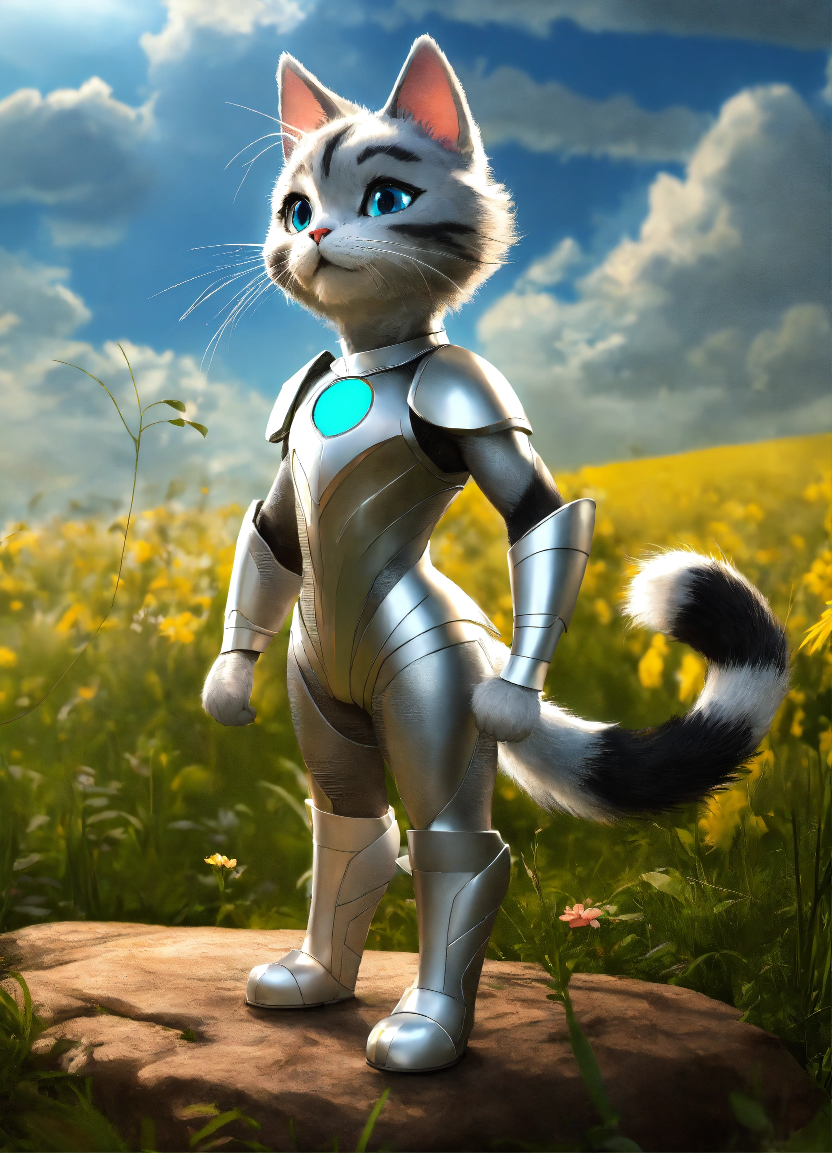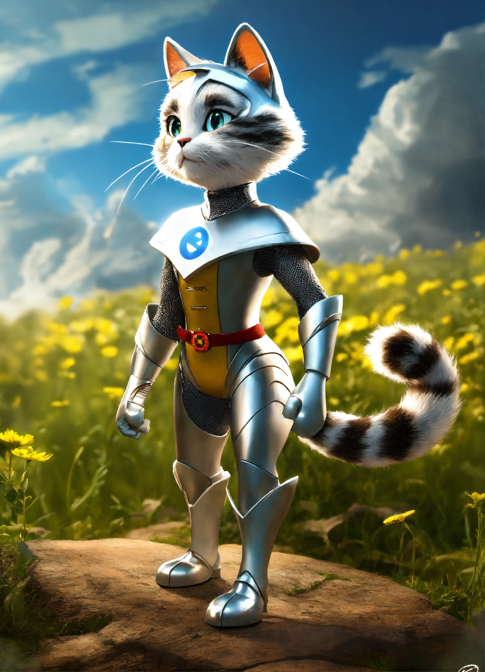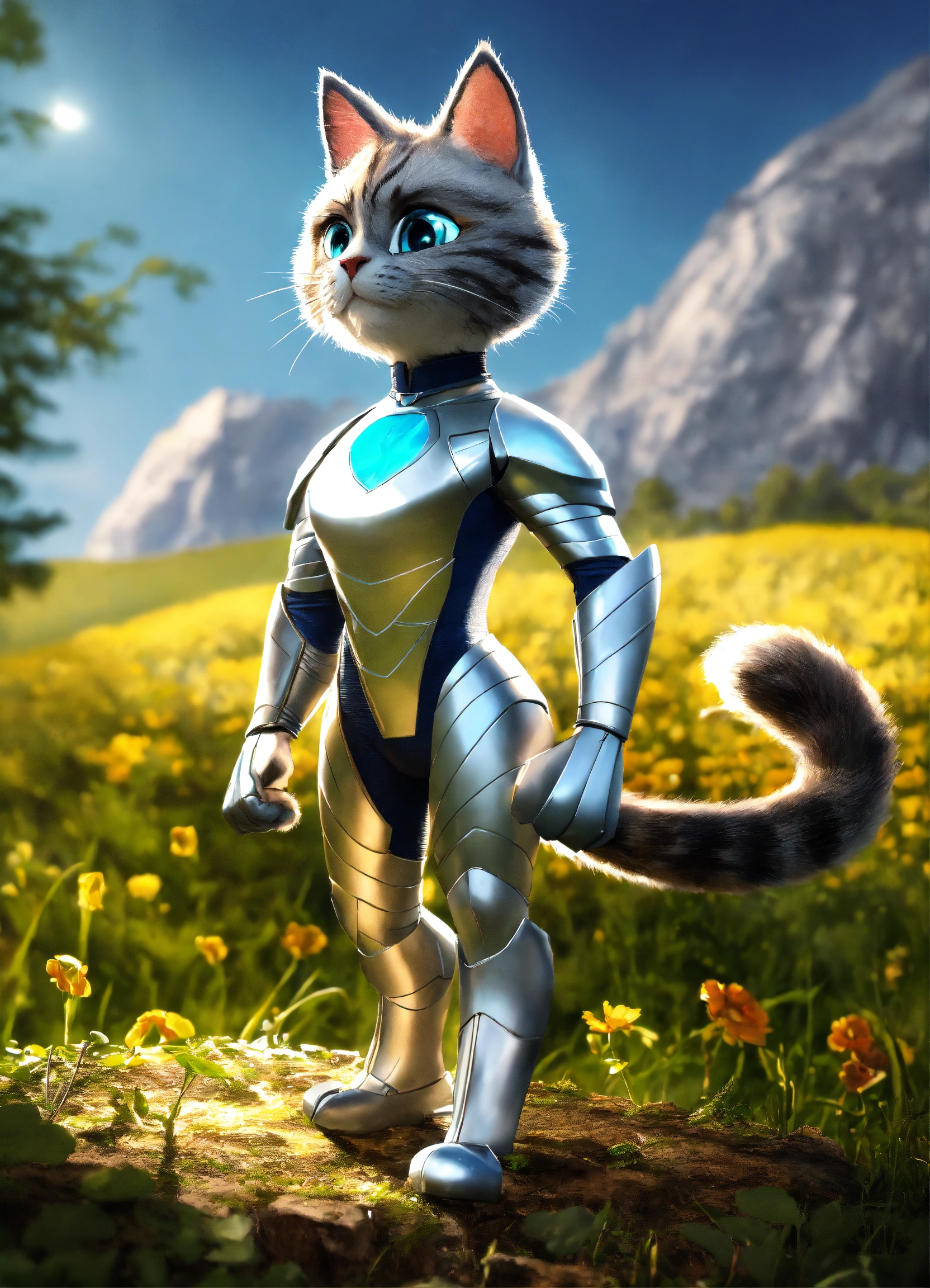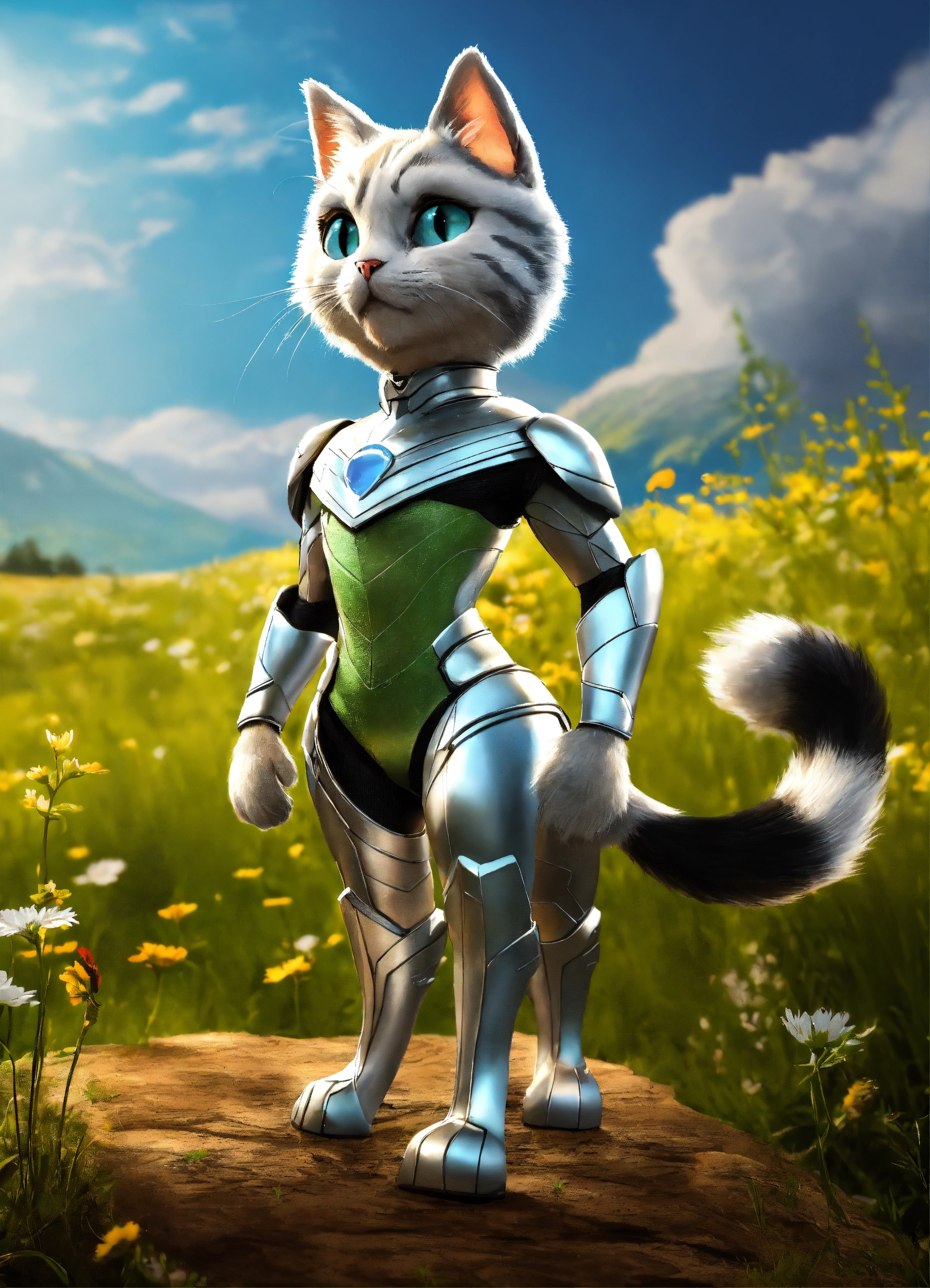 Cat adjectives agile, mysterious, heroic verbs silver moves gracefully through the meadow, exuding the agility and charm superhero. his animated movements are captivating, evoking the style of animation pixar. silver has a sleek, superhero-like costume with a hint of mystique that adds to his aura of intrigue and adventure. with his enigmatic yet heroic appearance, silver complements the scene in the meadow, making the trio of characters even more compelling and visually captivating.