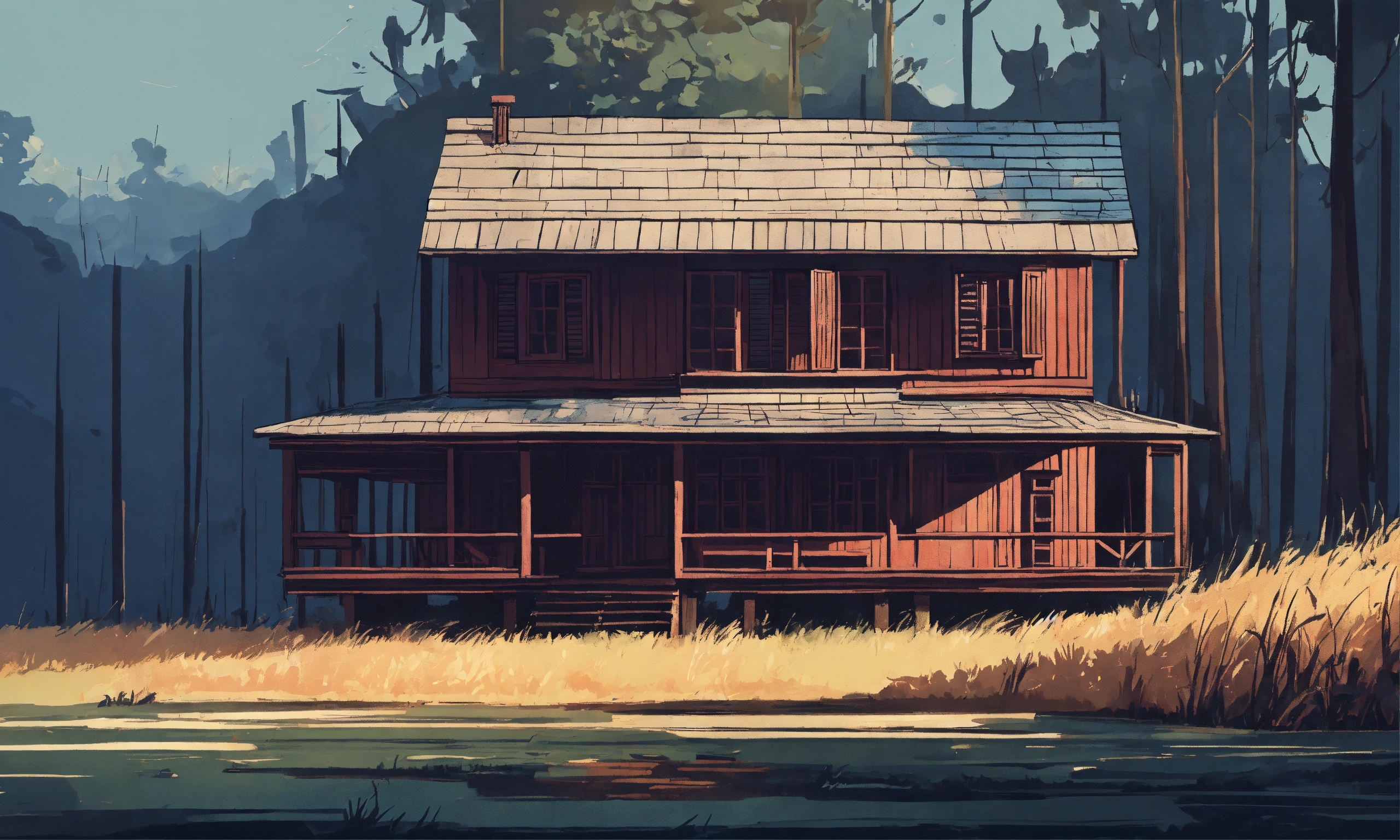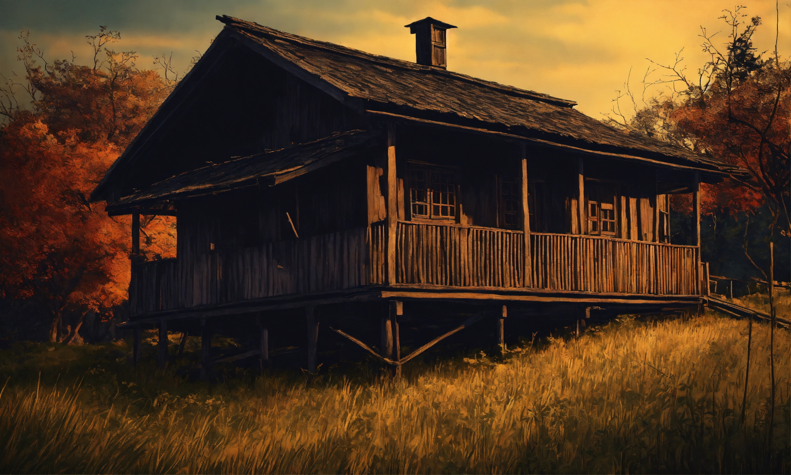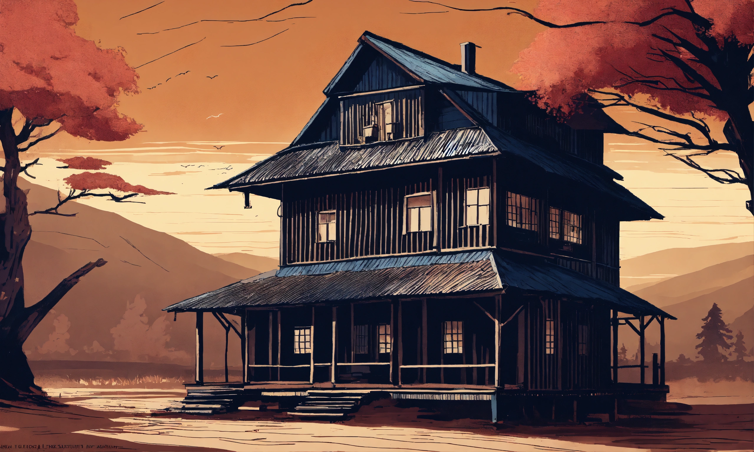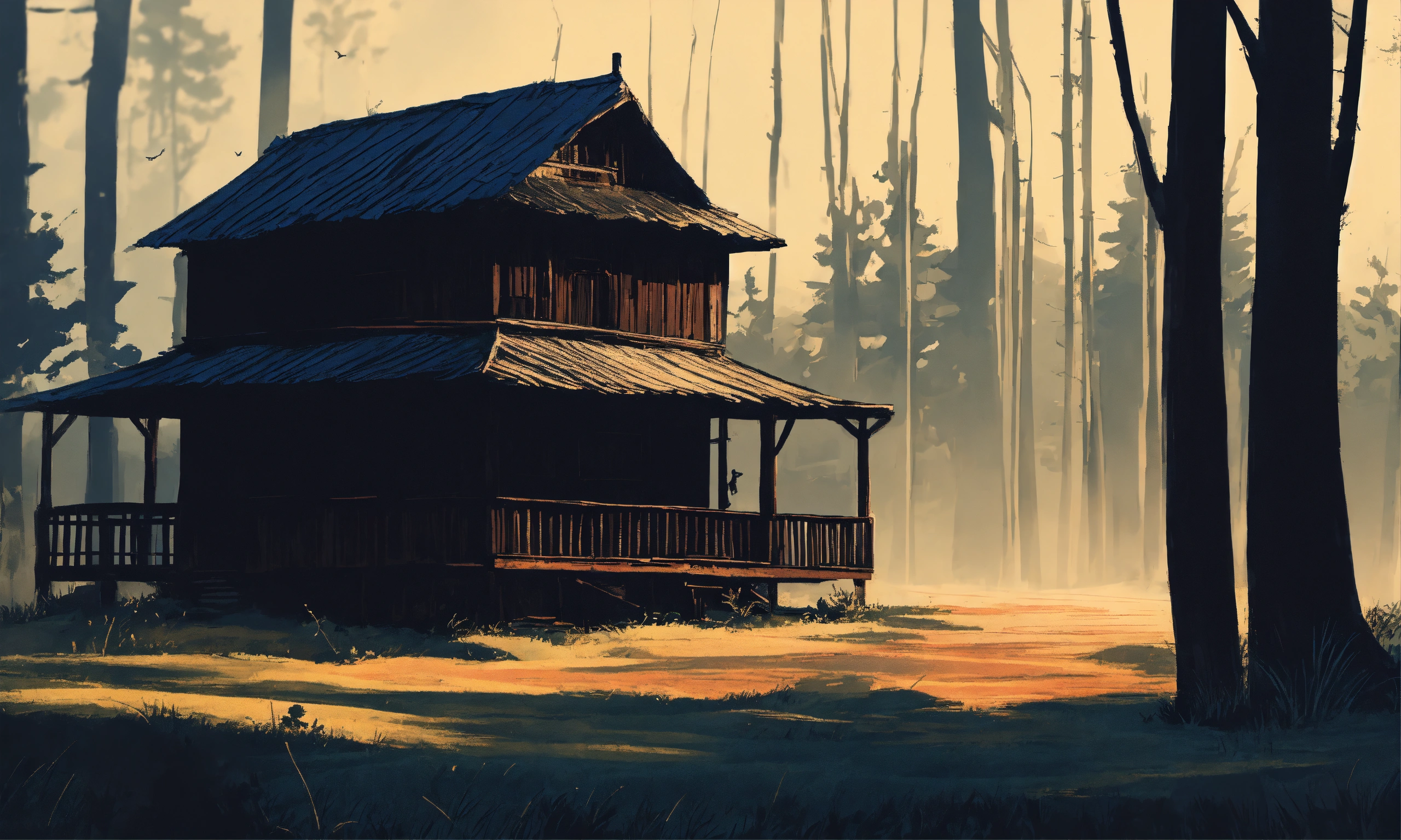 Create a woodblock art print book cover that captures the following idea - the old wooden house creaked and groaned with each gust of wind as if whispering secrets from the past. focus on creating a dark atmosphere that conveys the sense of impending doom. use deep, rich colours like black, navy blue, and dark purple to create a foreboding tone. incorporate the image of an old wooden house swaying in the wind. explore the contrast between light and shadow to emphasize the blurred boundaries between reality and imagination. use sharp lines and stark contrasts to create a sense of unease and uncertainty. pay attention to the details of the woodblock art technique, aiming for a textured and layered appearance that adds depth to the image. the goal is to create a captivating and chilling book cover that visually represents the themes and atmosphere of the story.