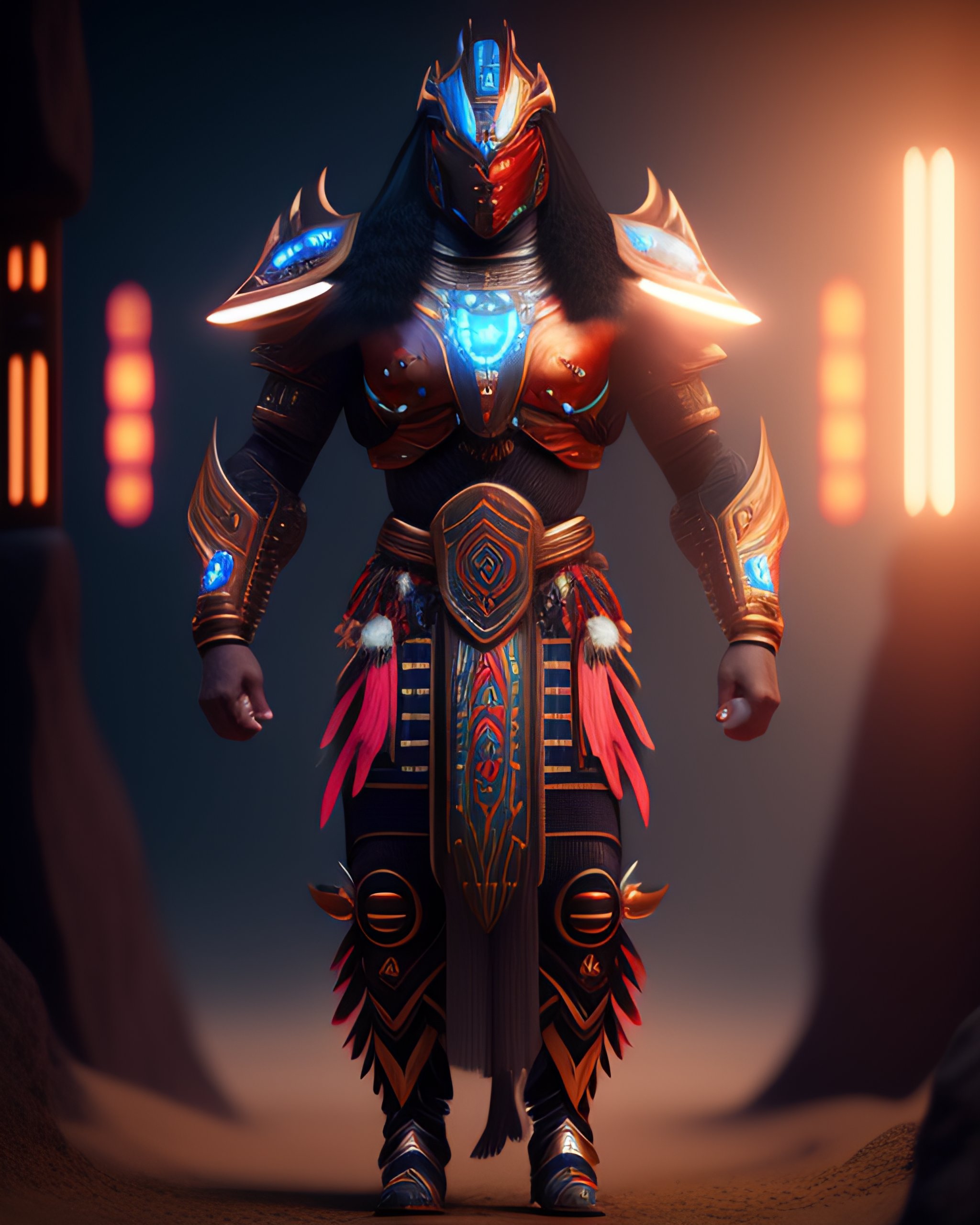 Azec warrior, octane render, full body, cinematic lighting, intricate, photorealistic, native american, mayan, athletic, cybernetic, cyborg, robot