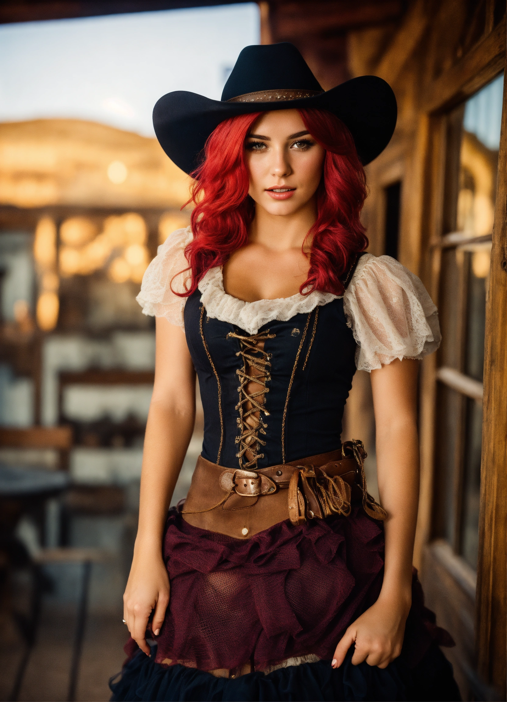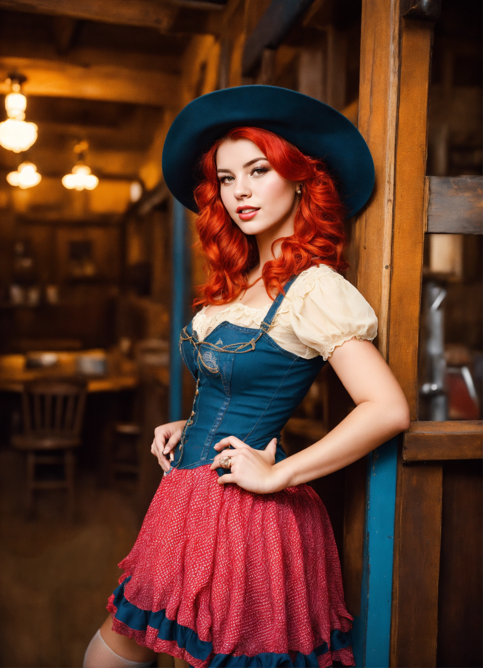 A real photo of a hot 25 year old cowgirl with bright hair. she is wearing a cancan-fishnet-dress. she looks very in love, she stand inside of an old saloon in an old western town. she holding an old western rifle.