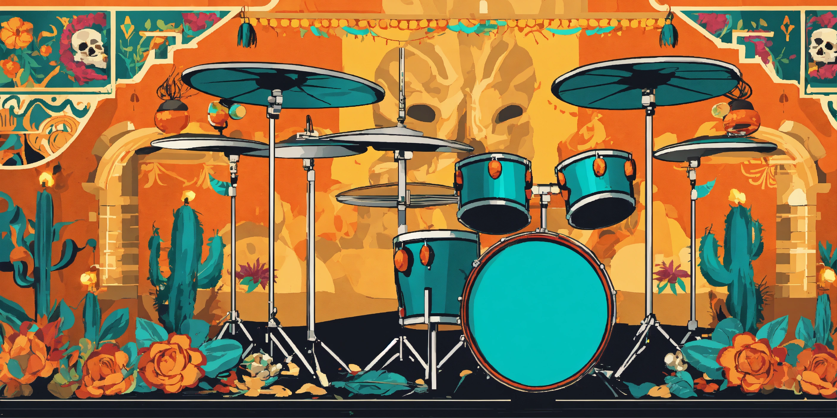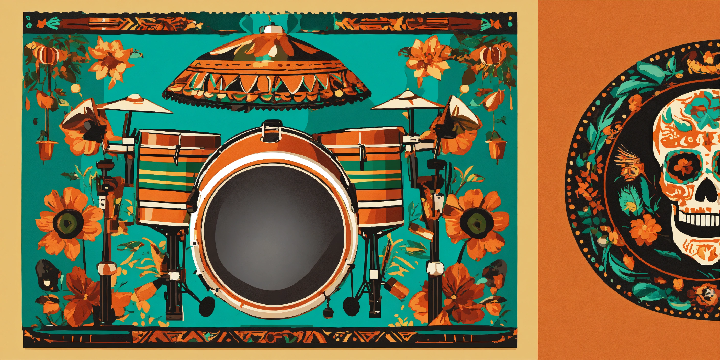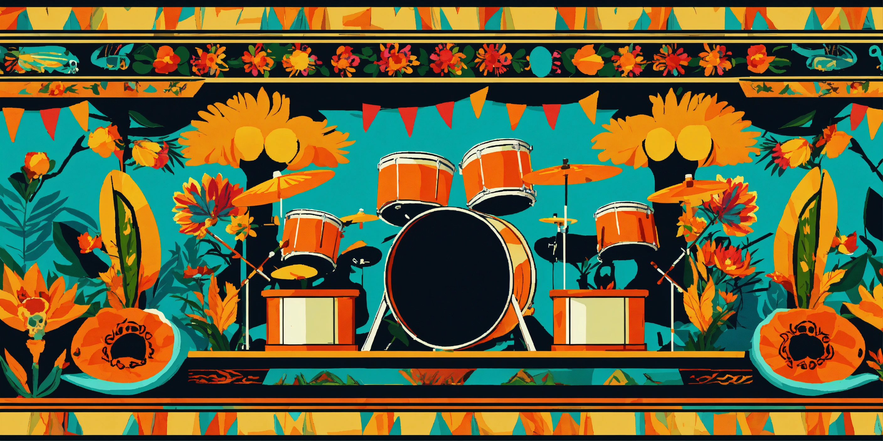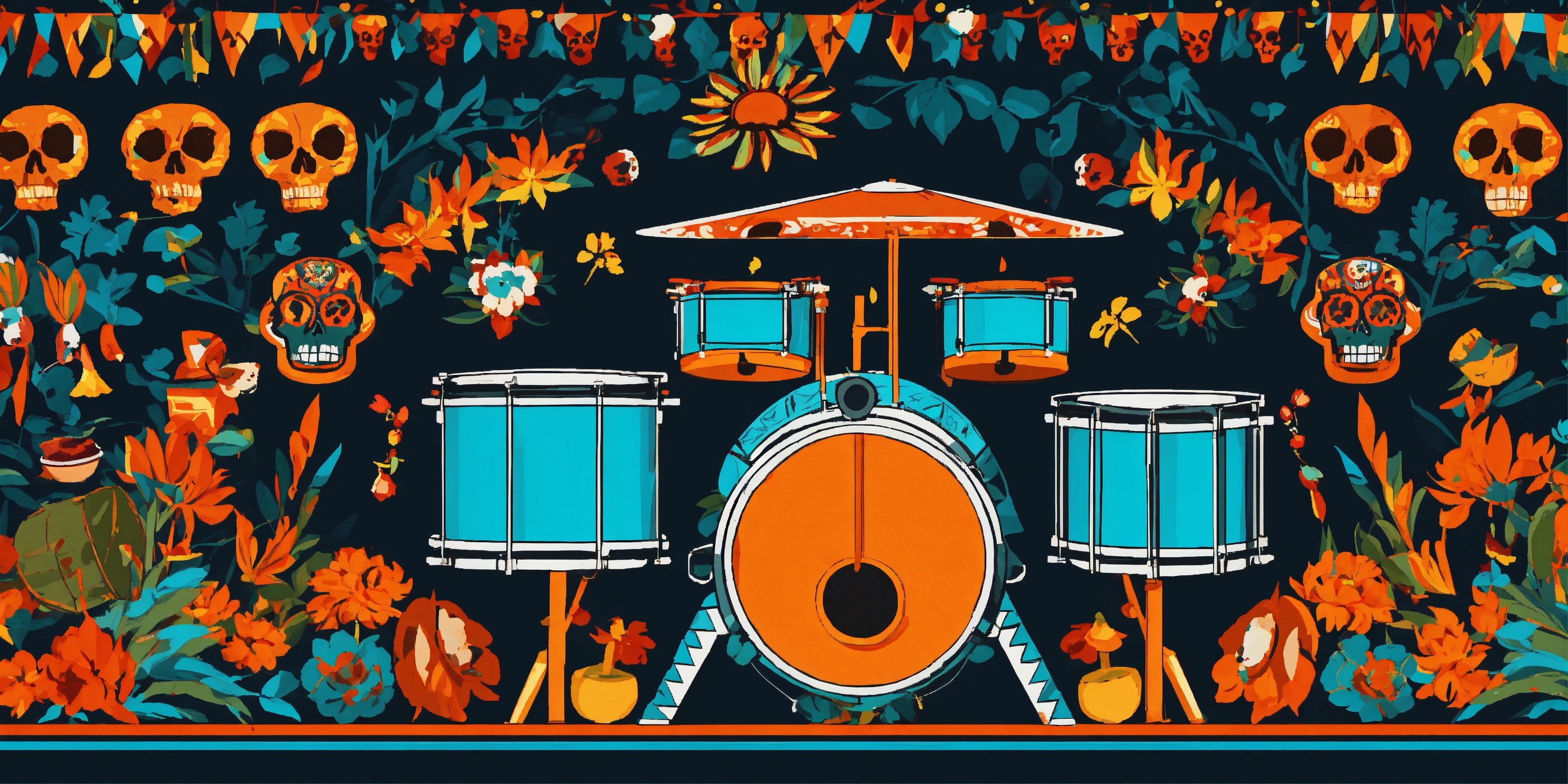 Vector flat flyer, flyer flat vector 2d image of a drum set surrounded by mexican ornamental elements such as mates, skulls, garlands of lights and native plants, colors orange, turquoise and black