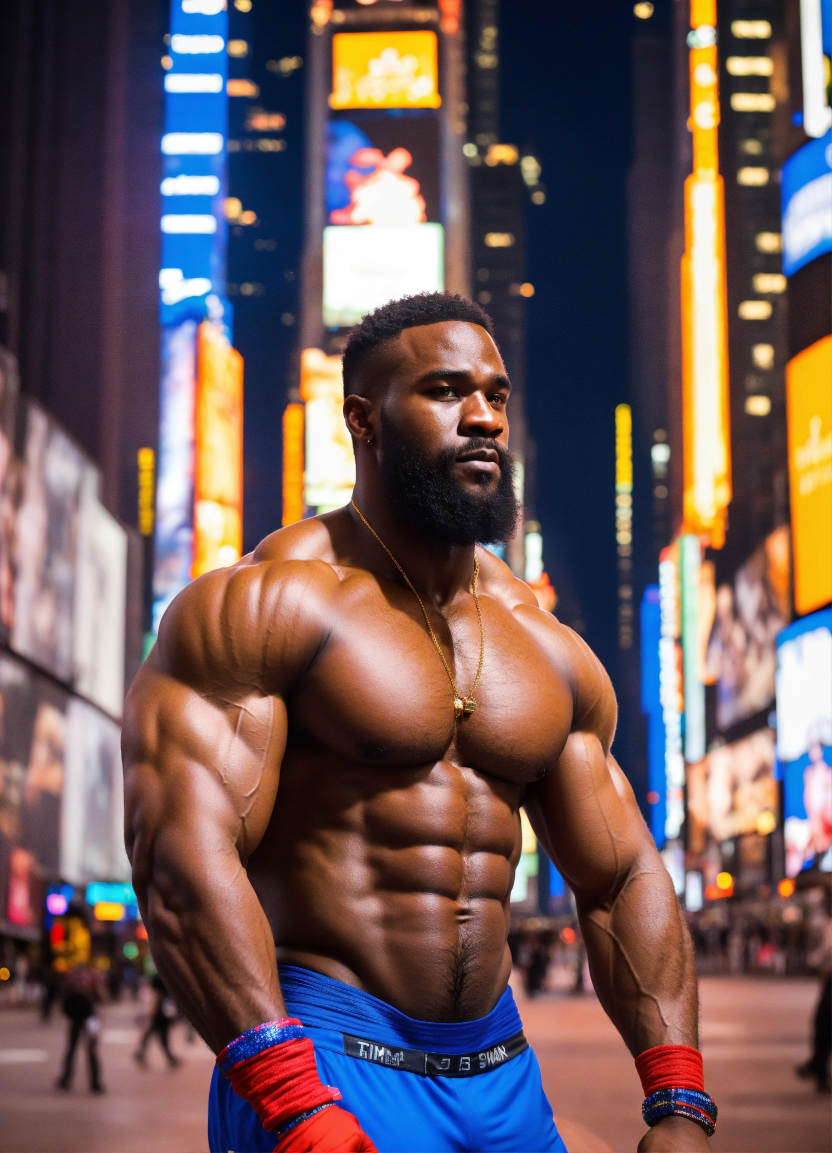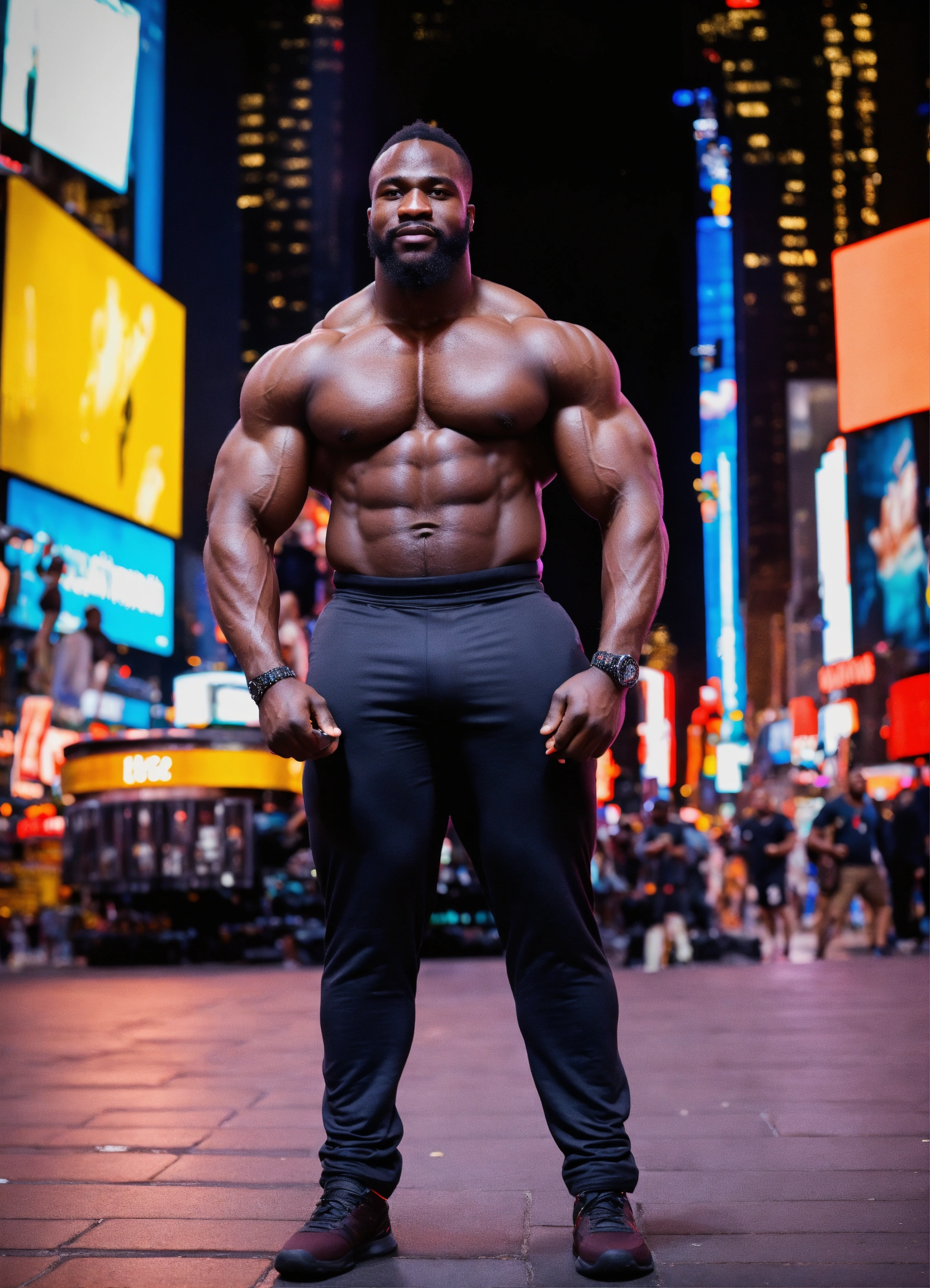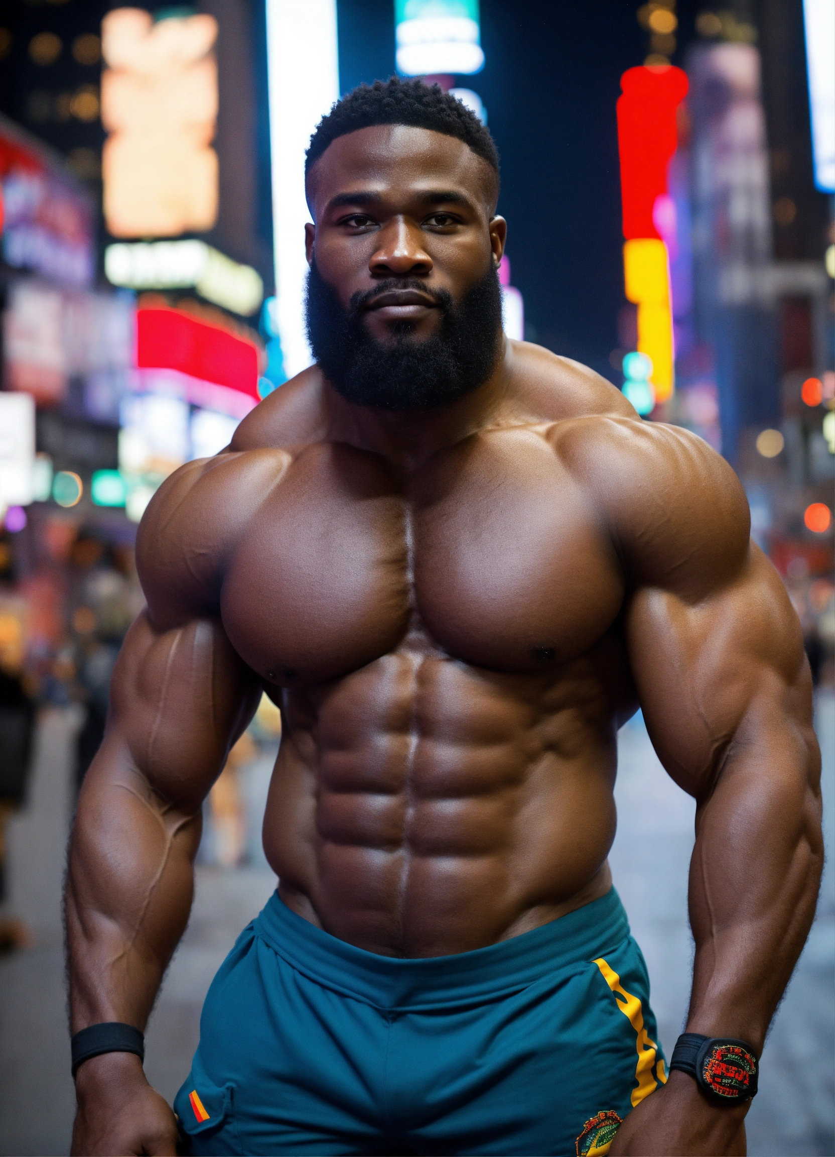 30-year-old hairy nigerian man with big muscles, big bodybuilder, body like a wrestler, in times square at night