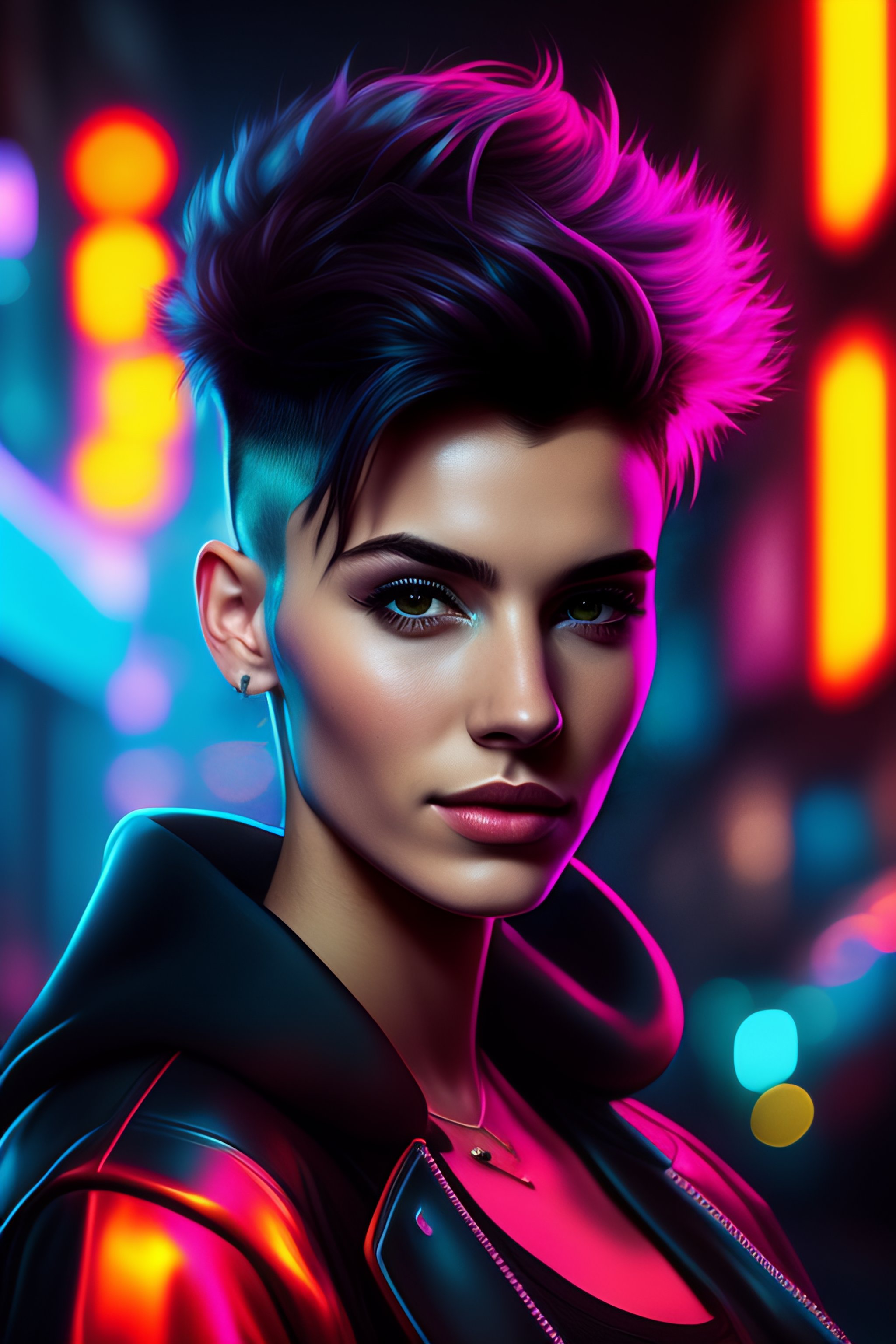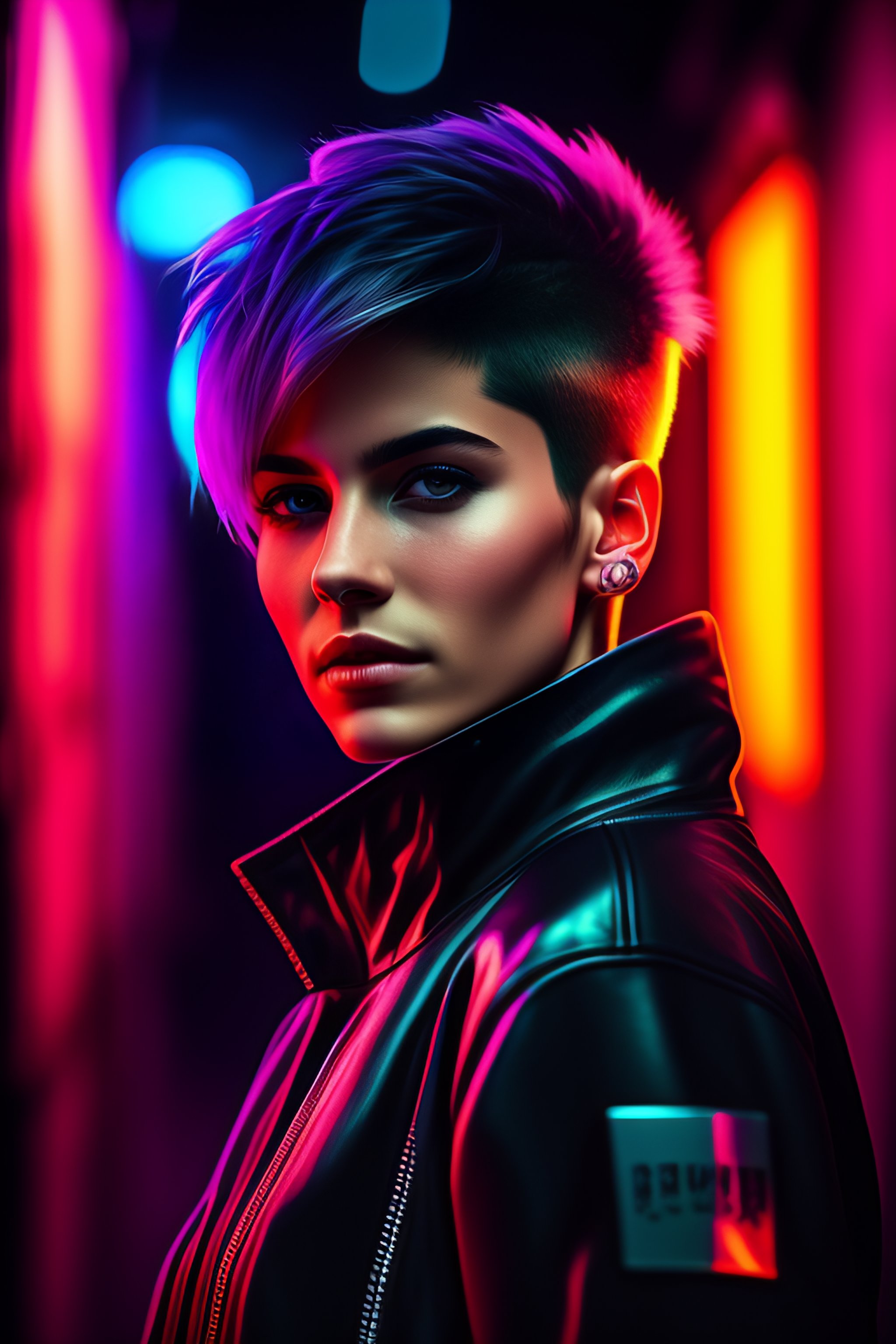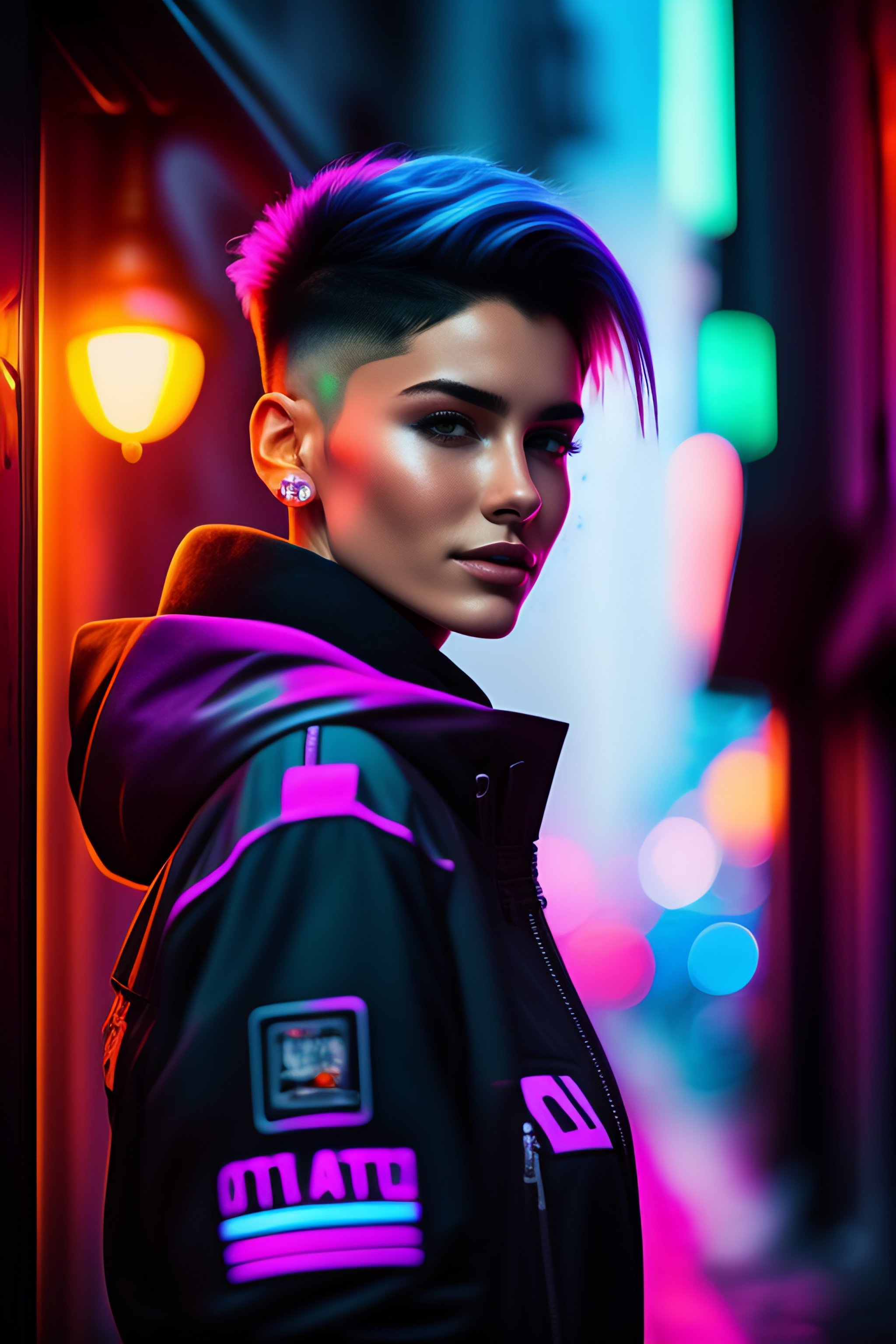 19yo french short haired tomboy in dirty neon lit side alley cyberpunk atmosphere