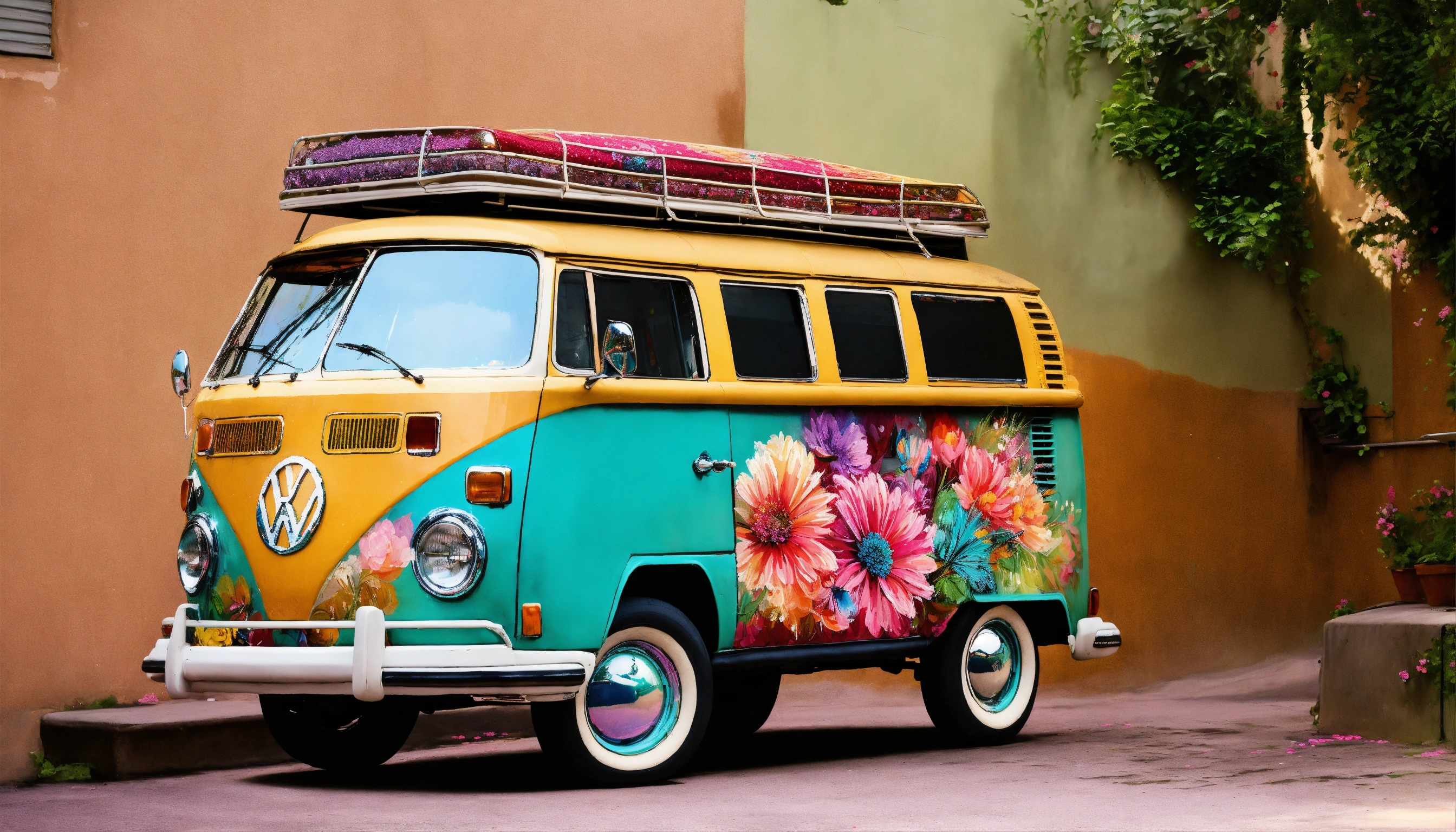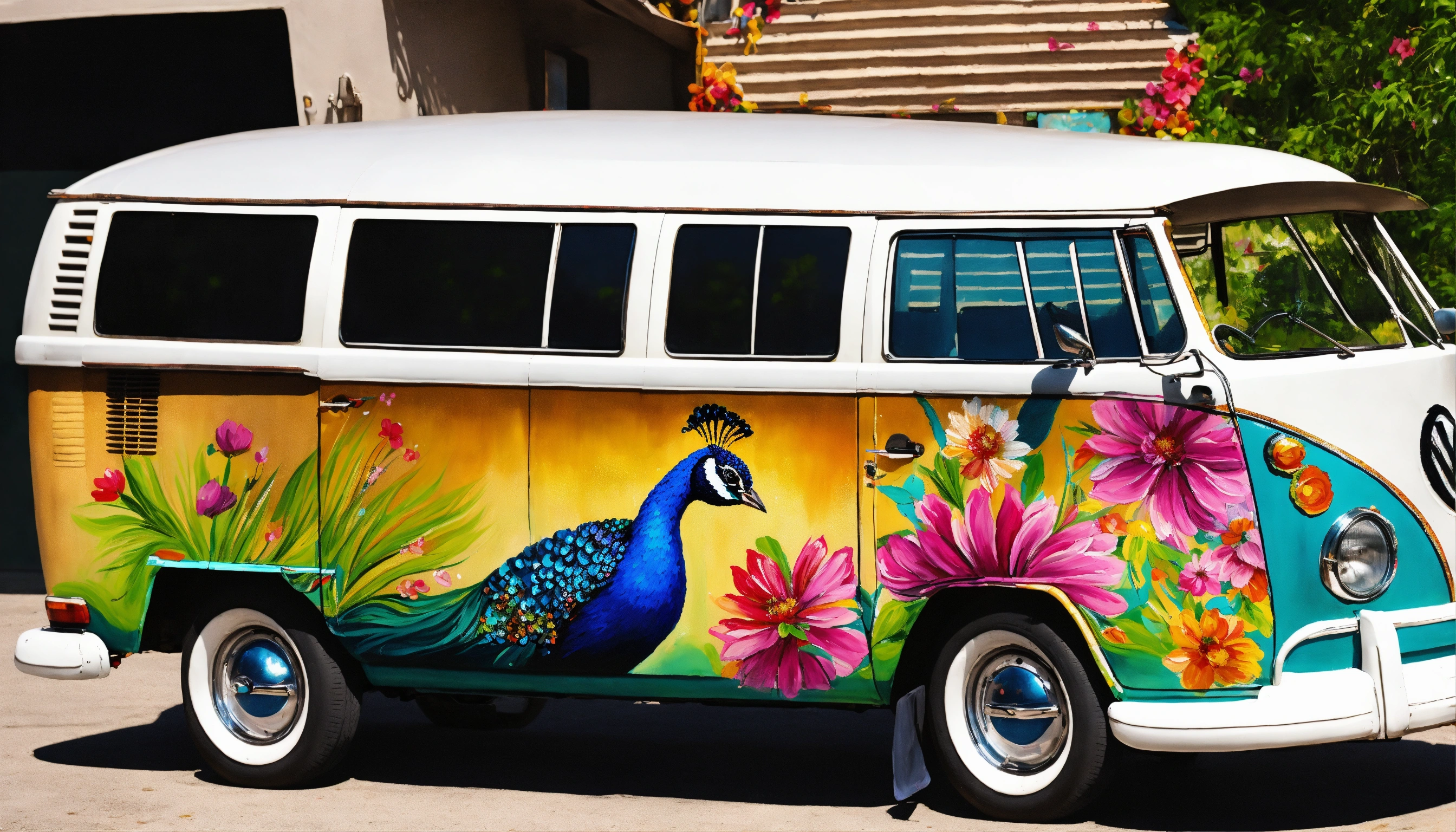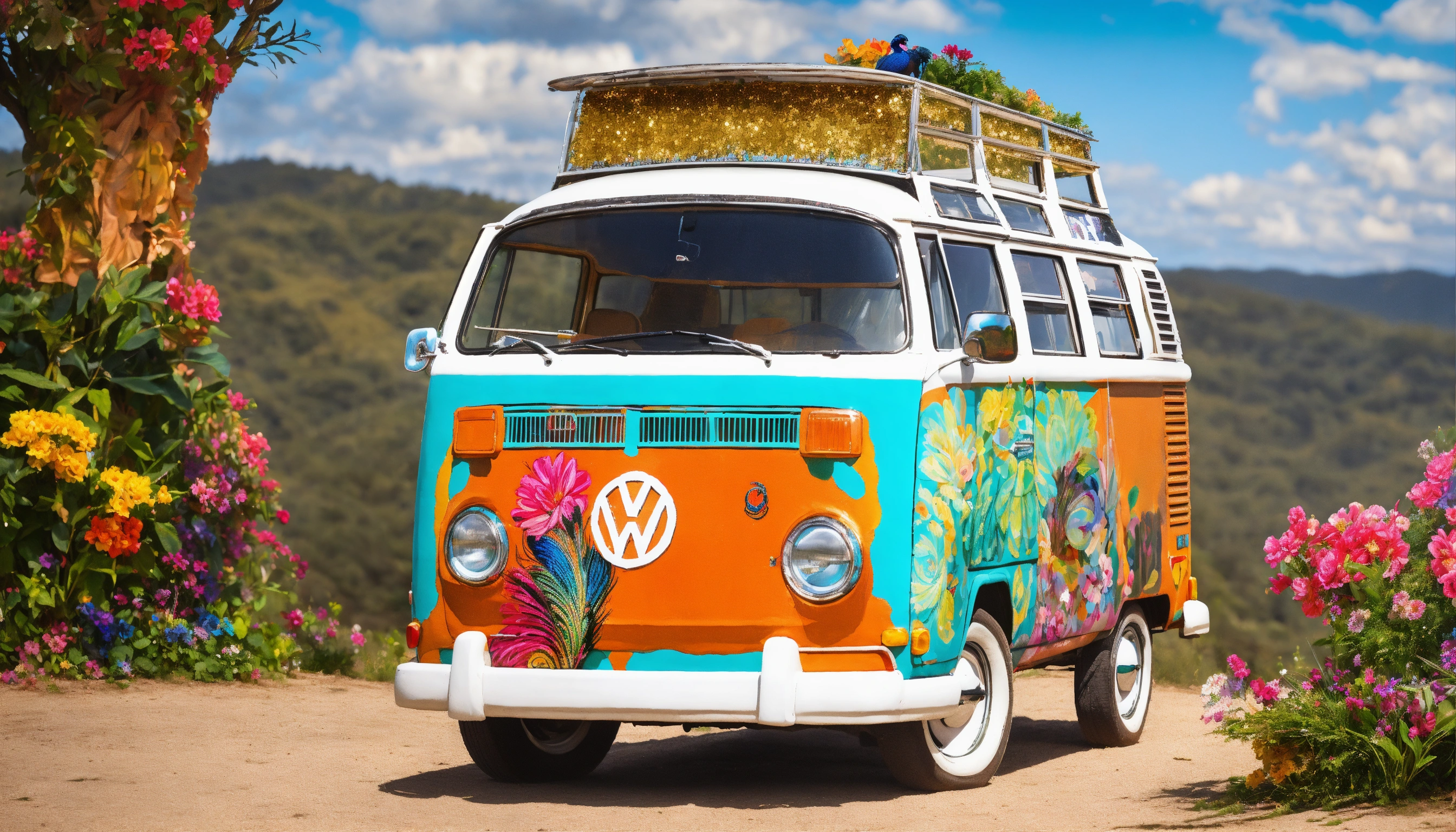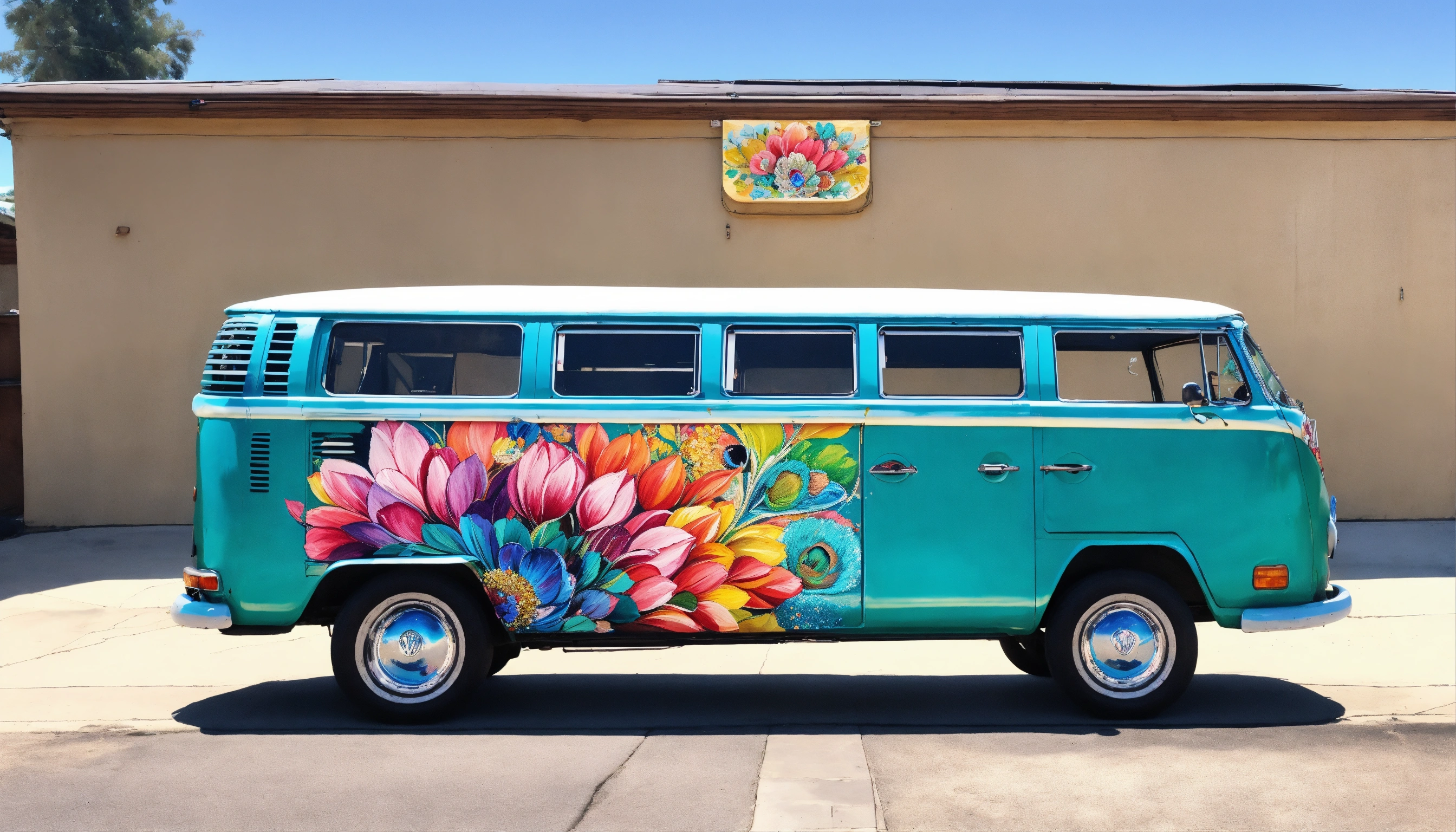 Concept art of hyper realistic volkswagen bus, paint on side of bus, personalized, girly, feminine, handpainted, artsy, boho, hyper realistic, realistic, hyper realism, painted, beautiful, unique, floral, vintage, hippie, view from side, colorful, realistic, hyper realistic image, beautiful painted flowers on the side of the car, bohemian, decorated, perfect, painted peacock, sequins, glitter, glitter paint, beautiful embroidered curtains on windows, turquoise, glitter peacock painted on side with elaborate tail, detailed, intricate, butterflies painted, designs painted all over the van, sparkle, mandala, artsy paint, personalized van